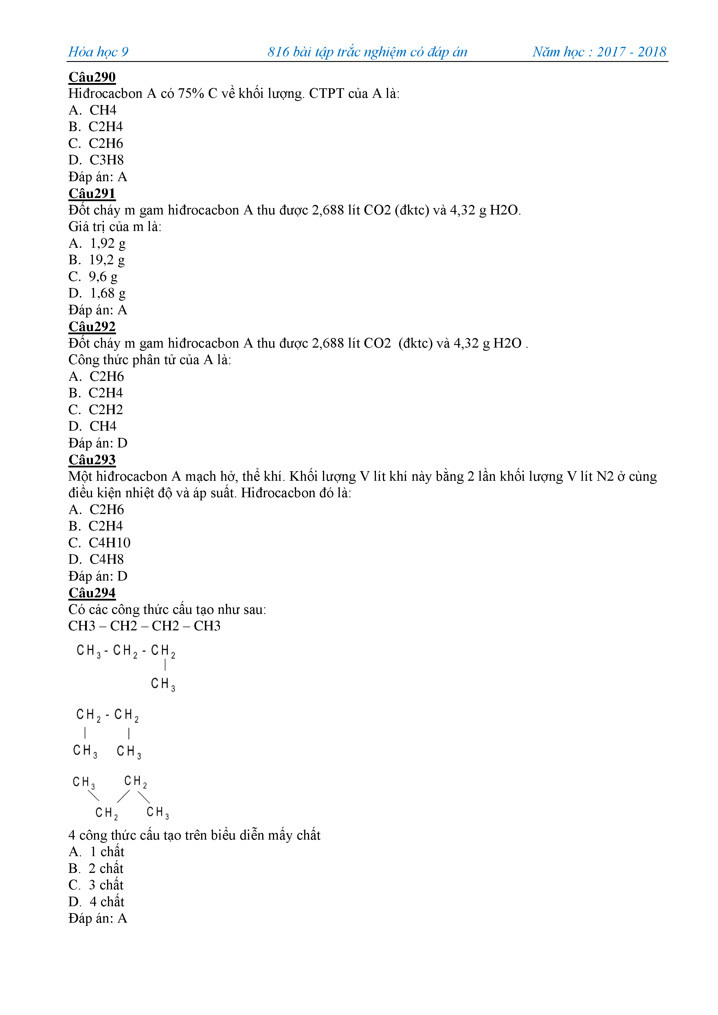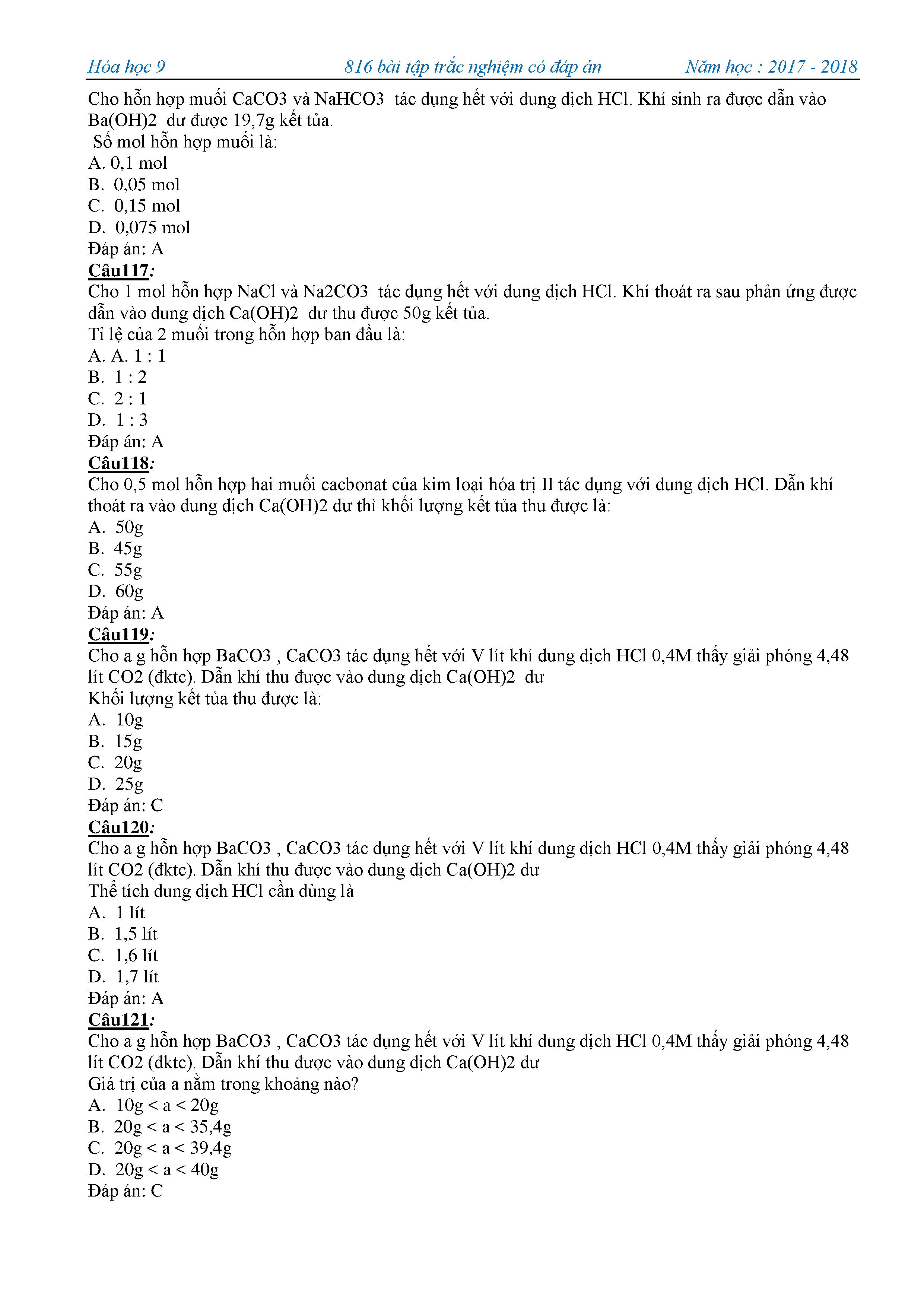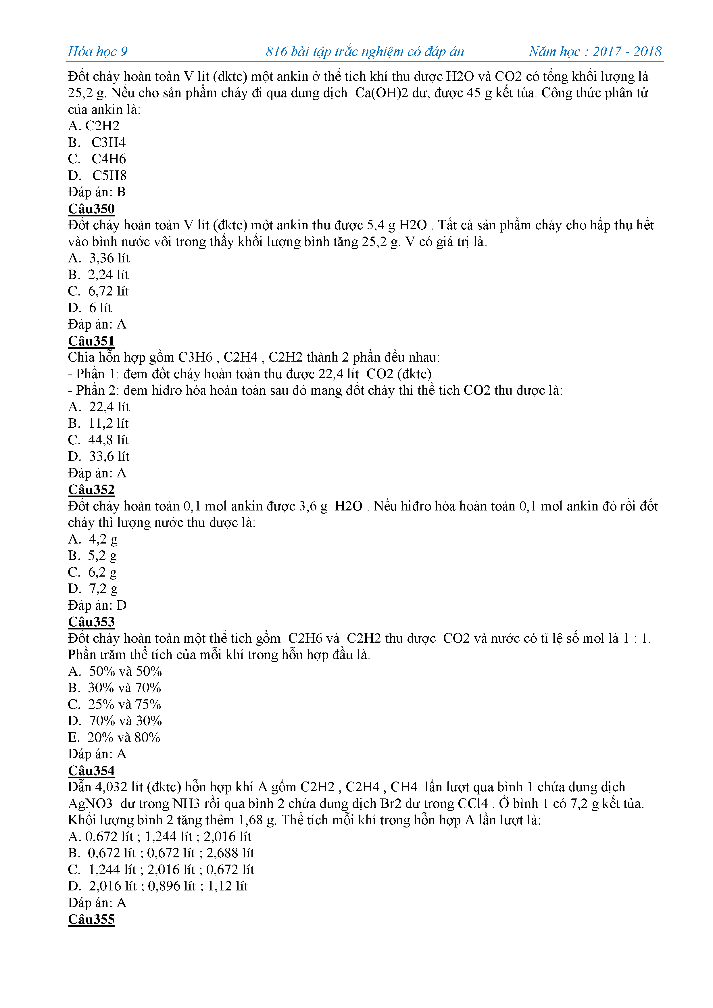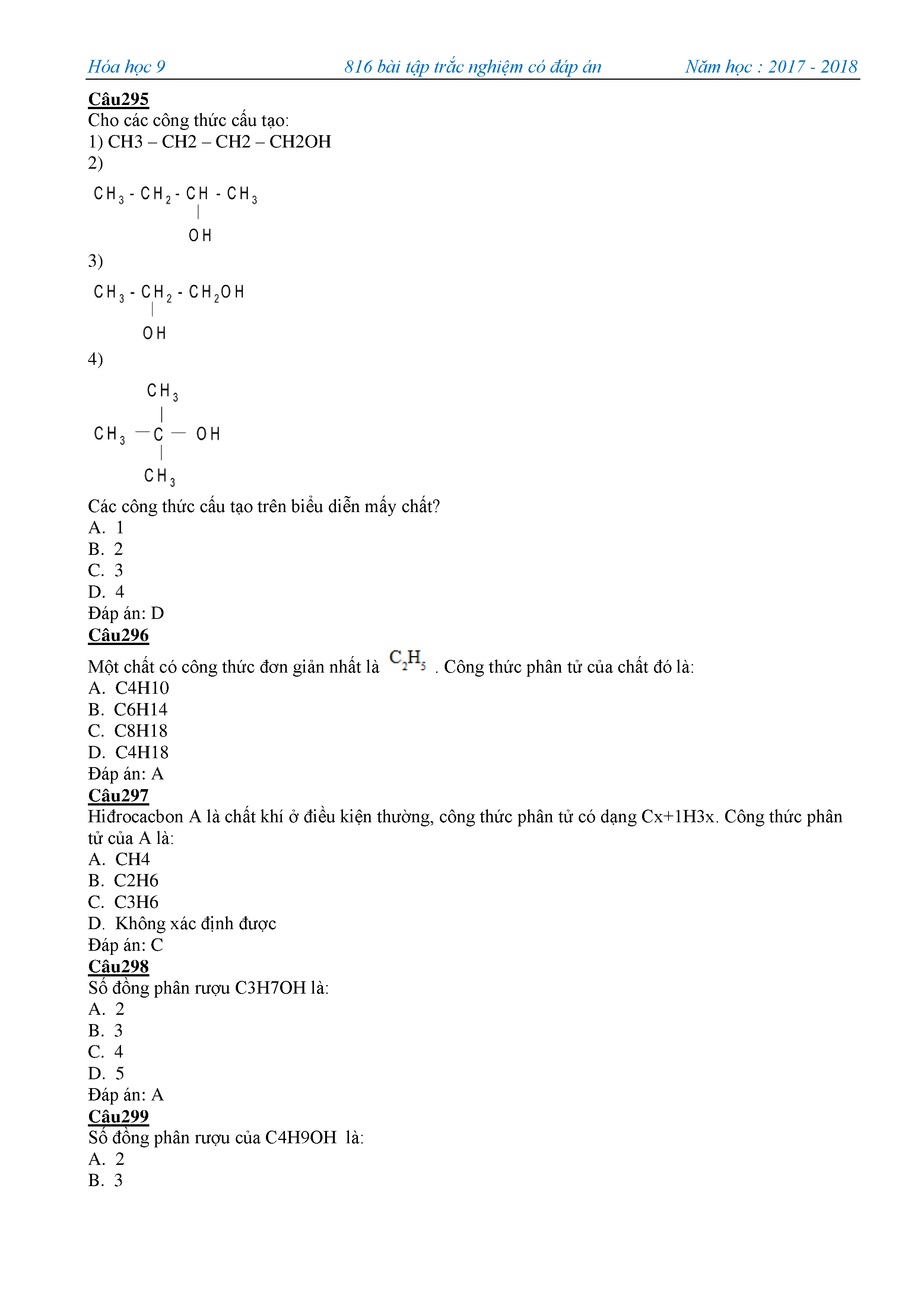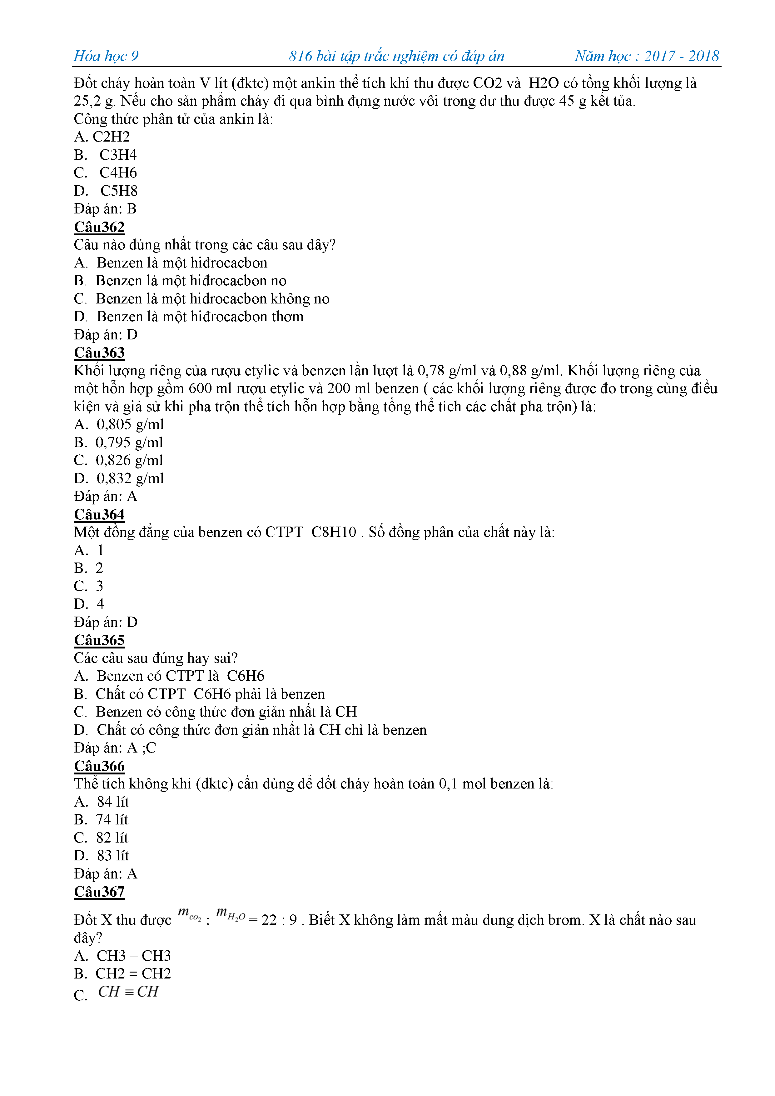 816 CÂU TRẮC NGHIỆM HÓA HỌC 9 (CÓ ĐÁP ÁN)