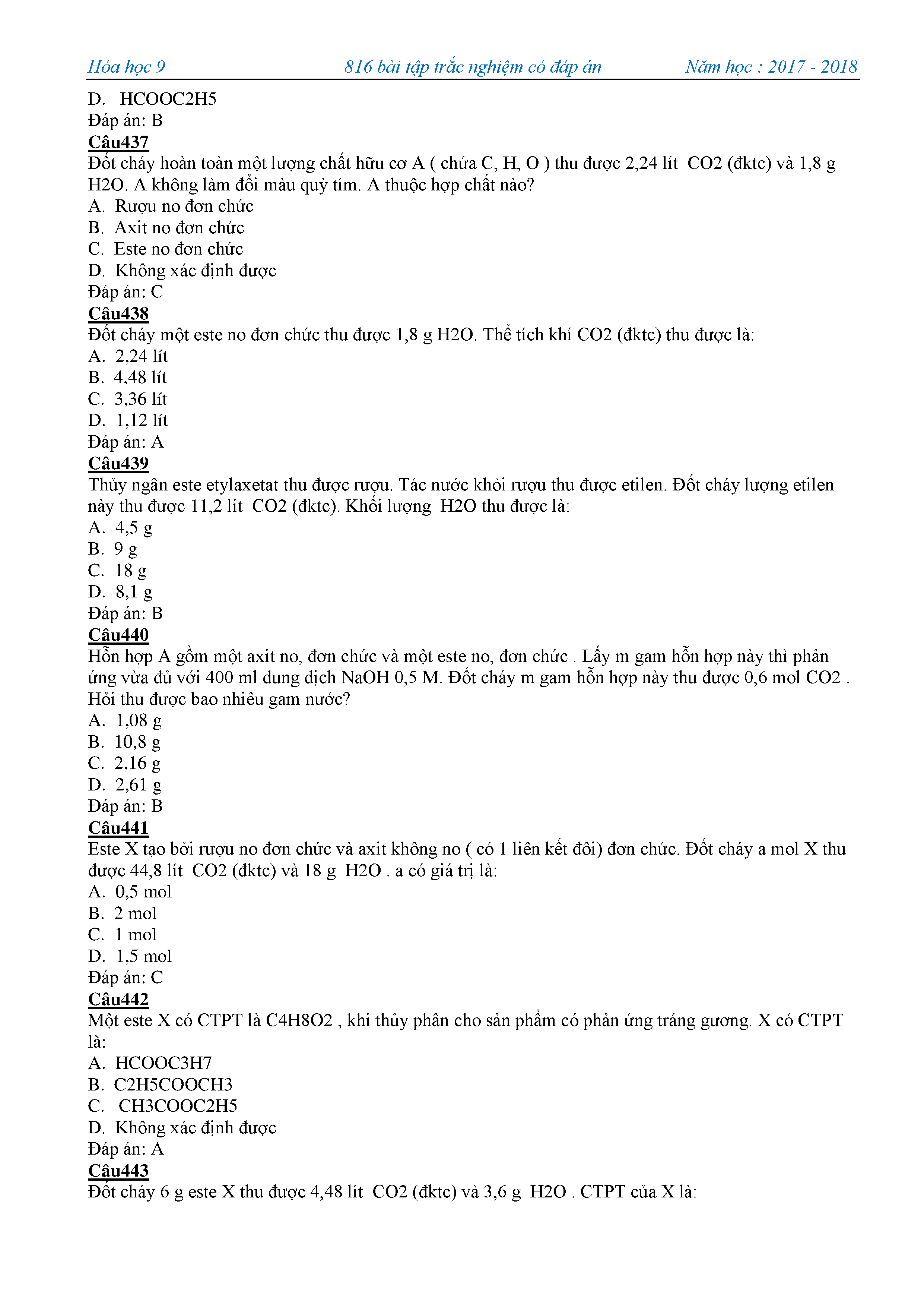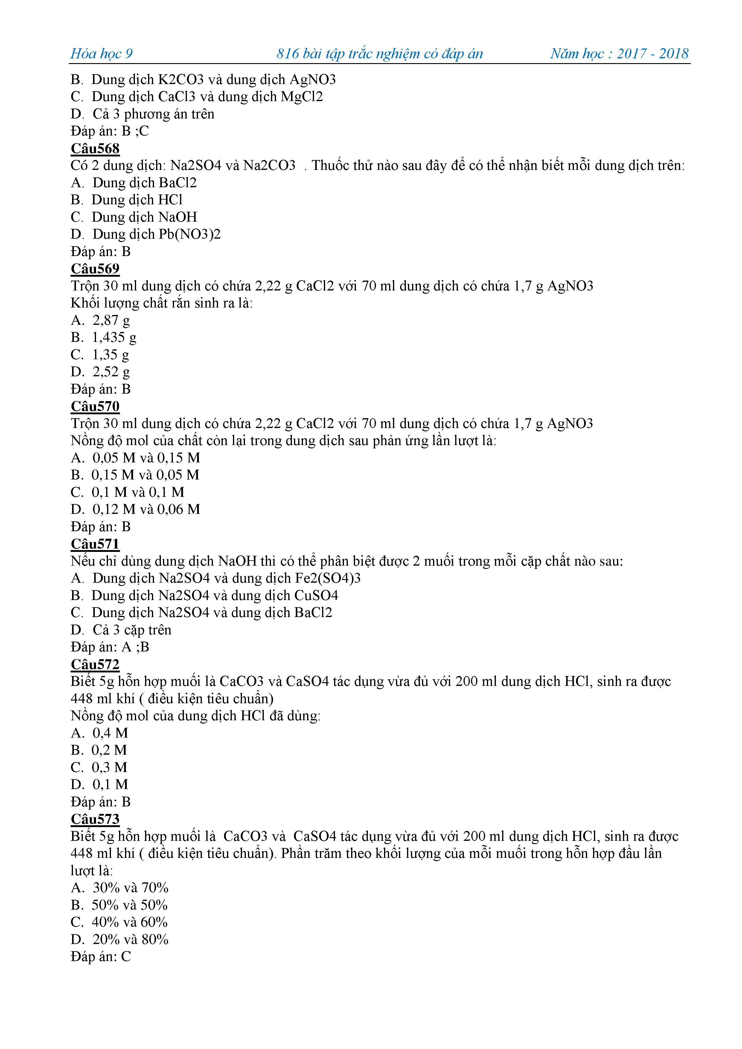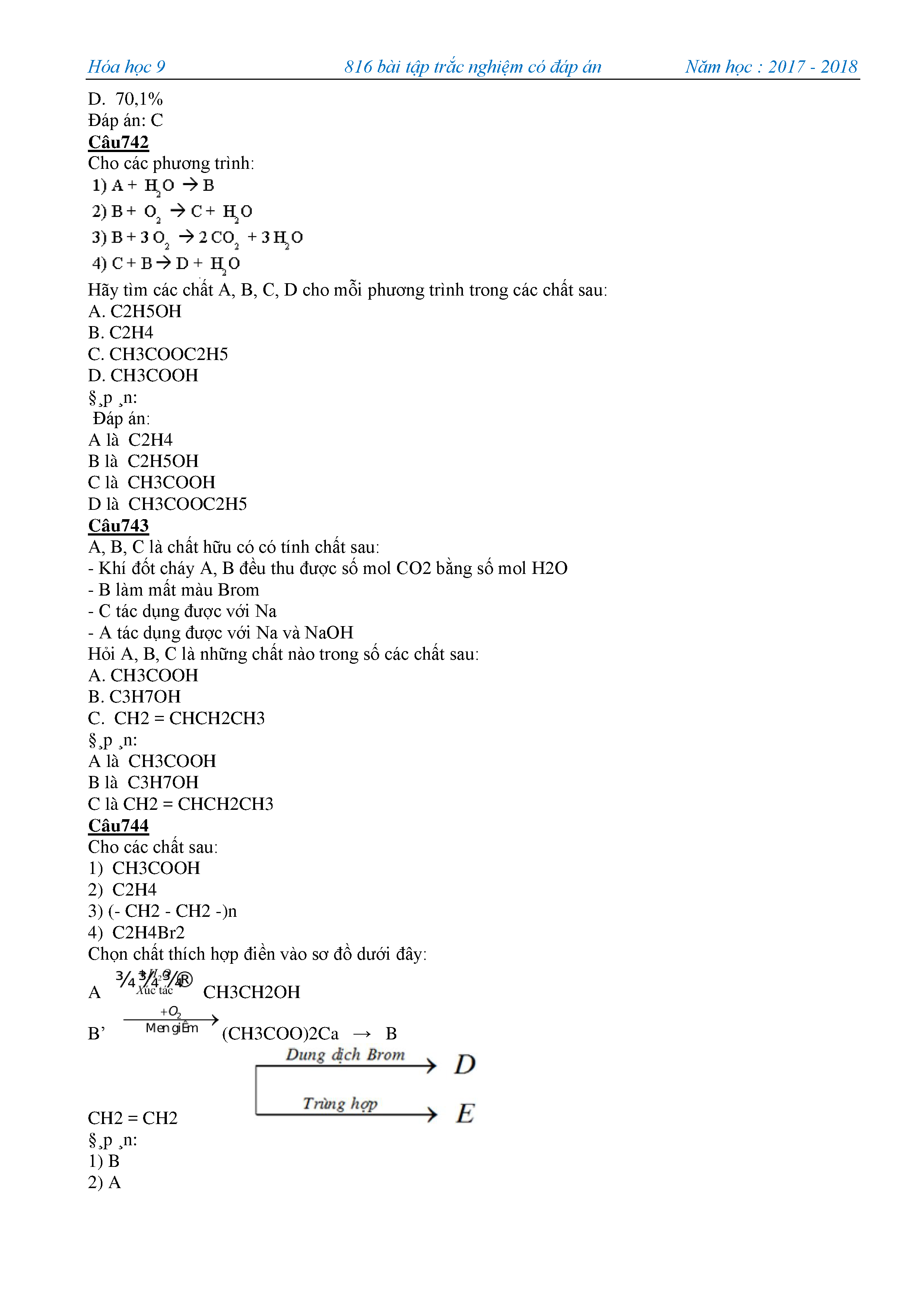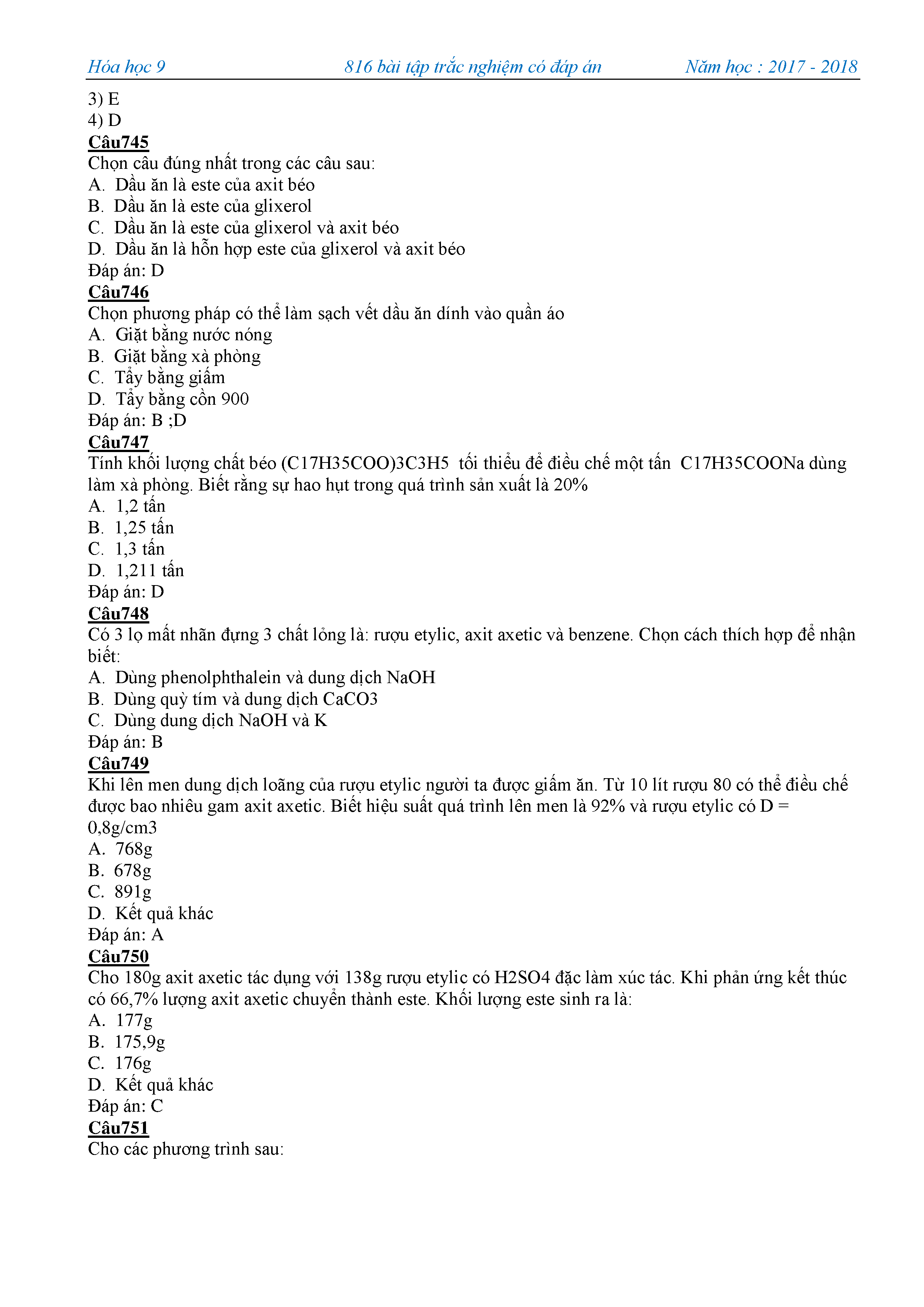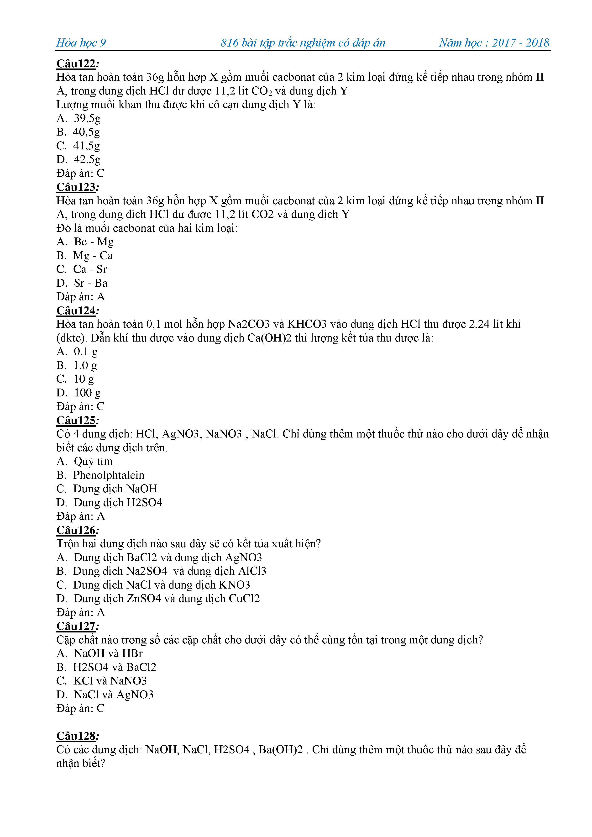 816 CÂU TRẮC NGHIỆM HÓA HỌC 9 (CÓ ĐÁP ÁN)