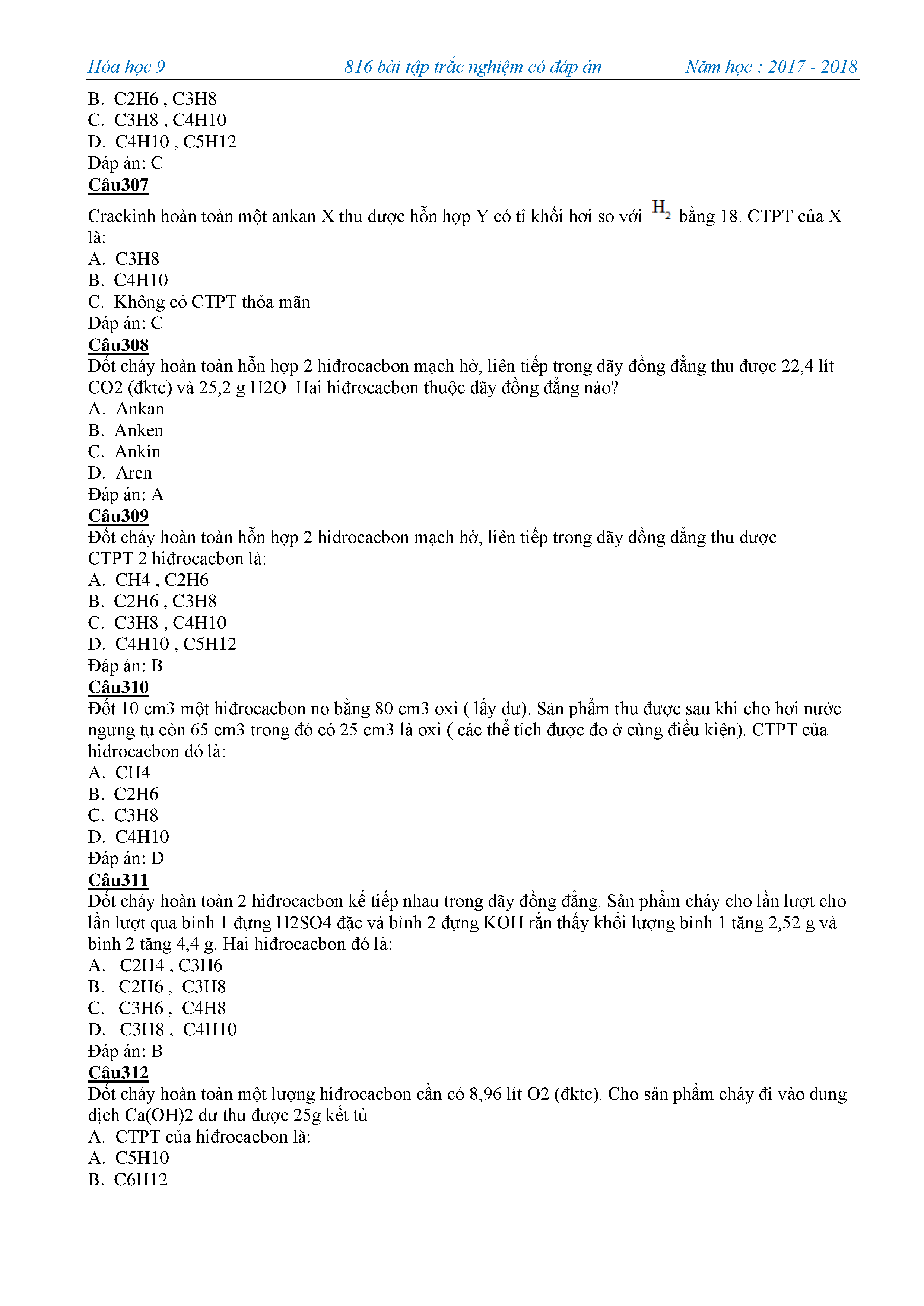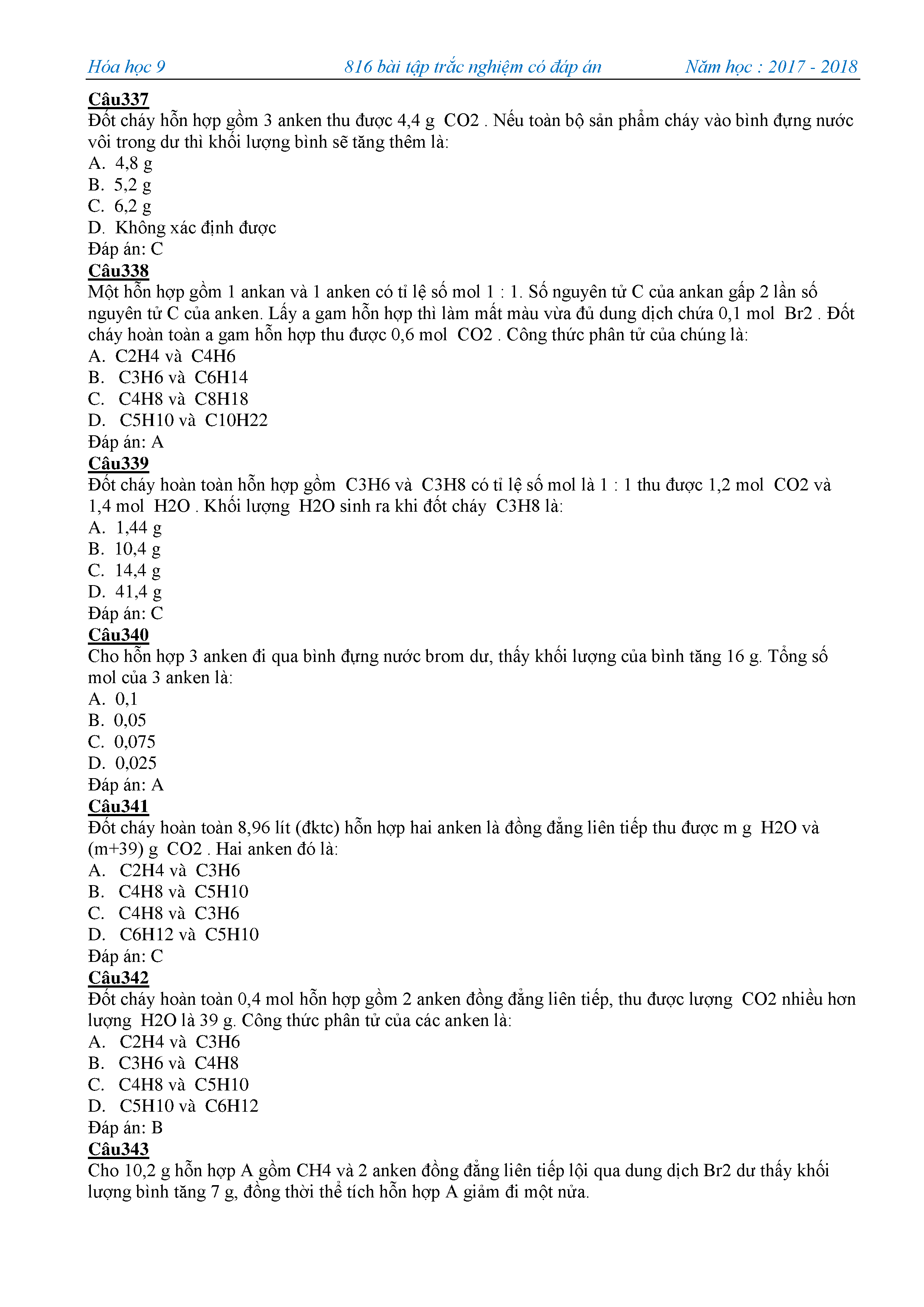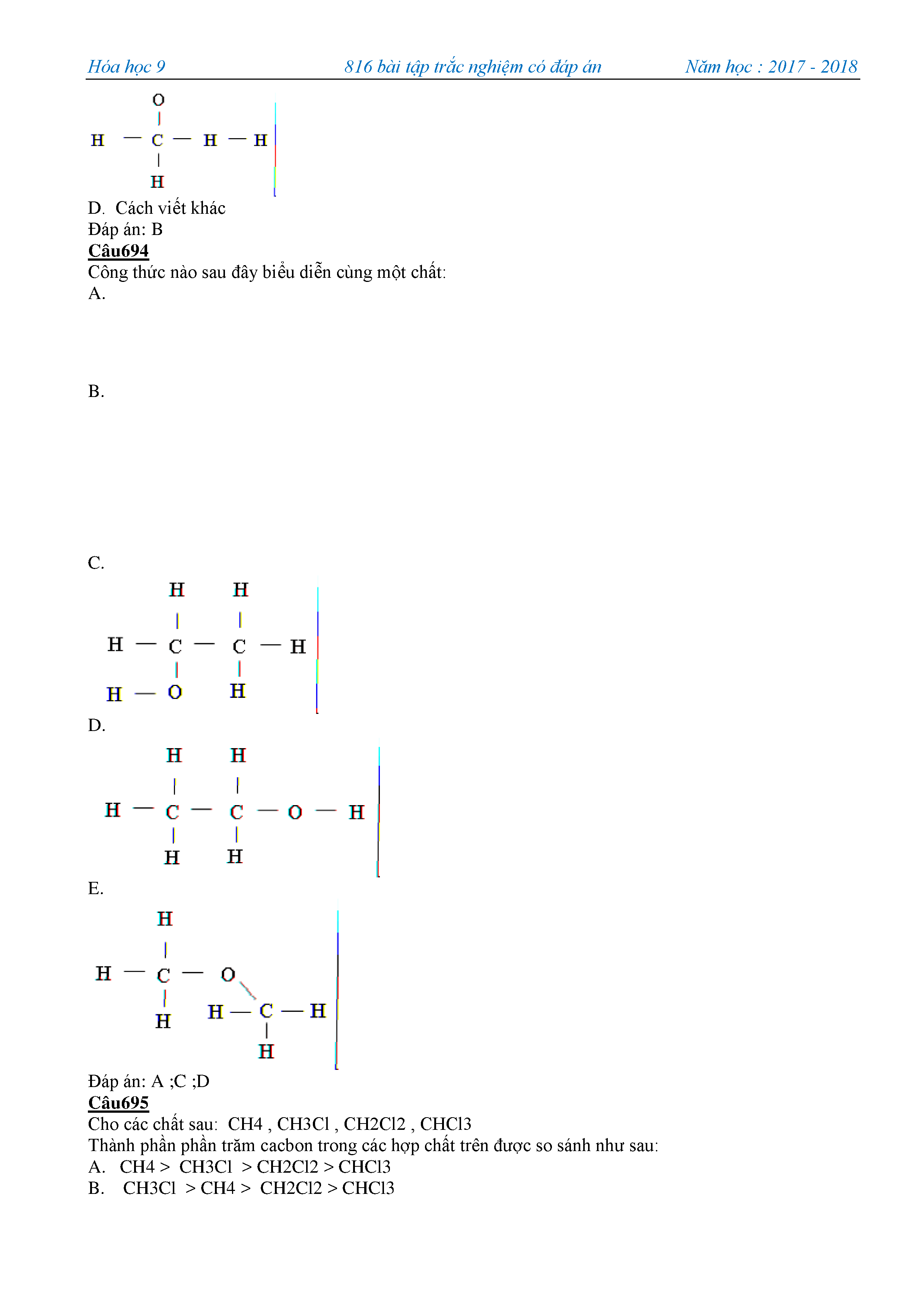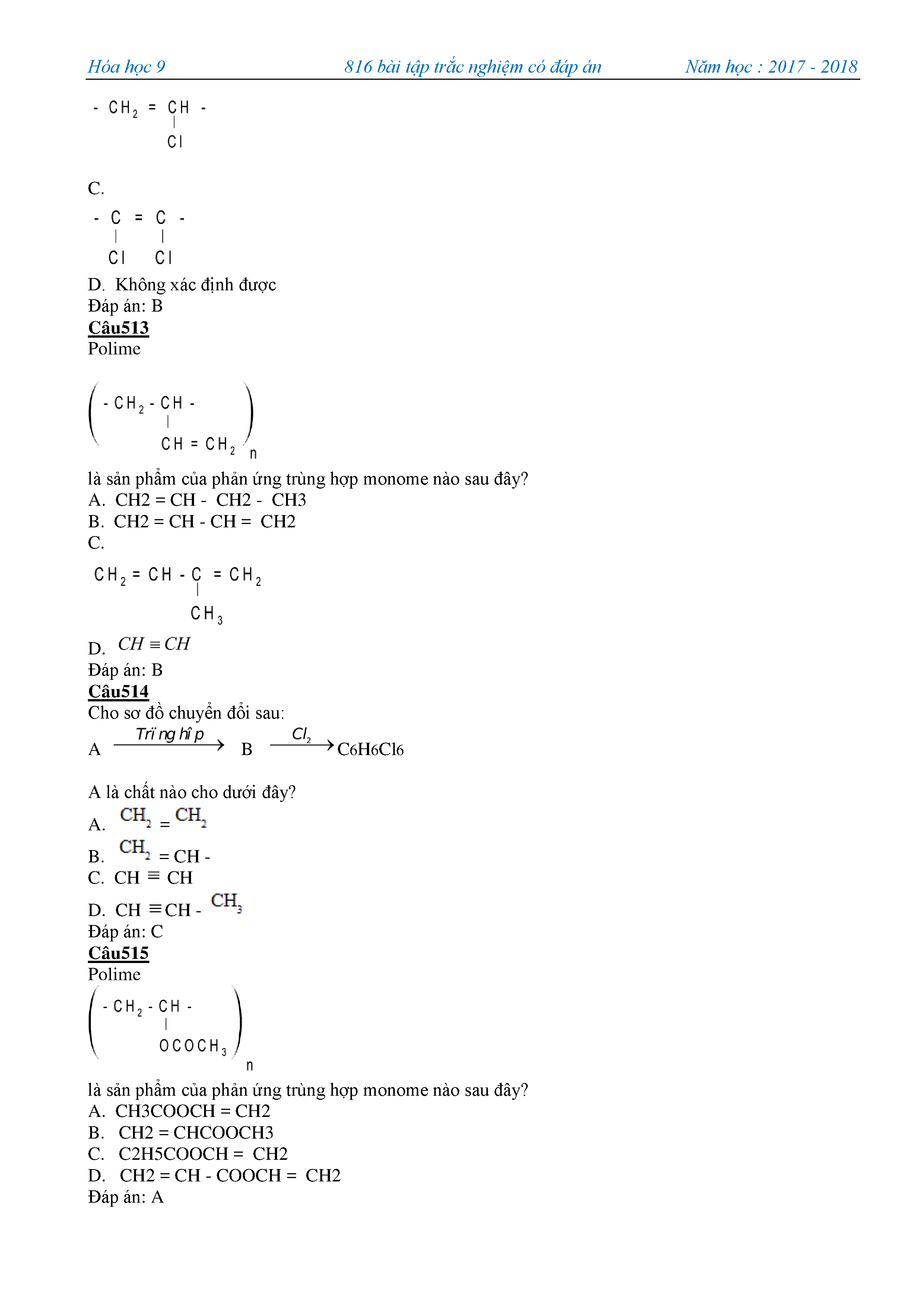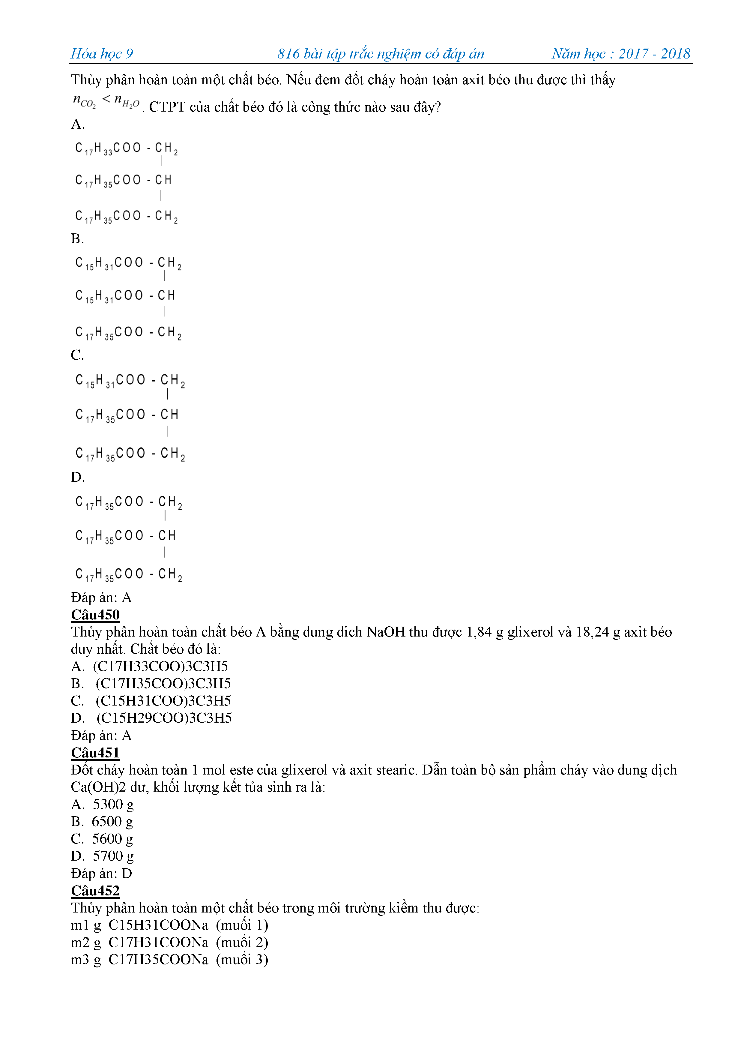816 CÂU TRẮC NGHIỆM HÓA HỌC 9 (CÓ ĐÁP ÁN)