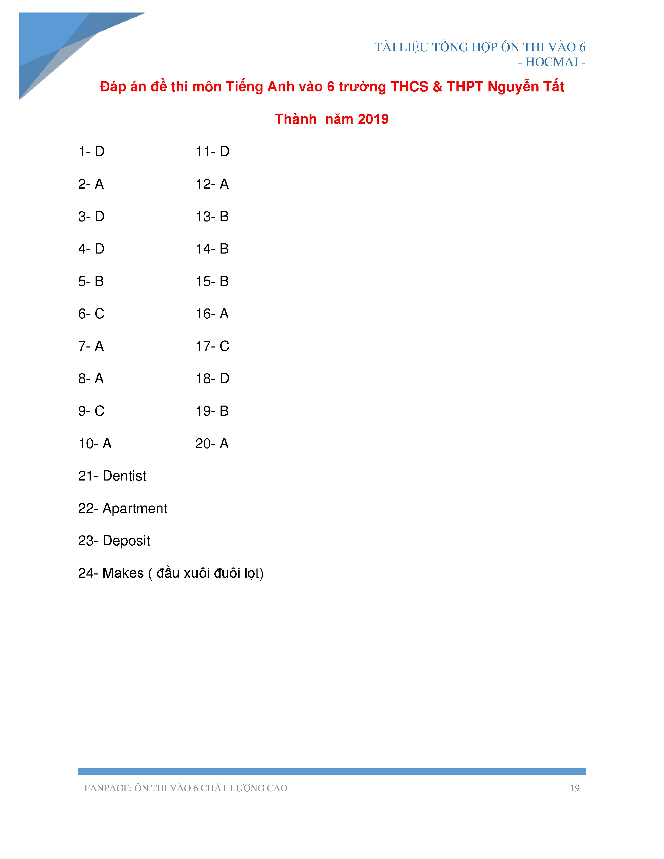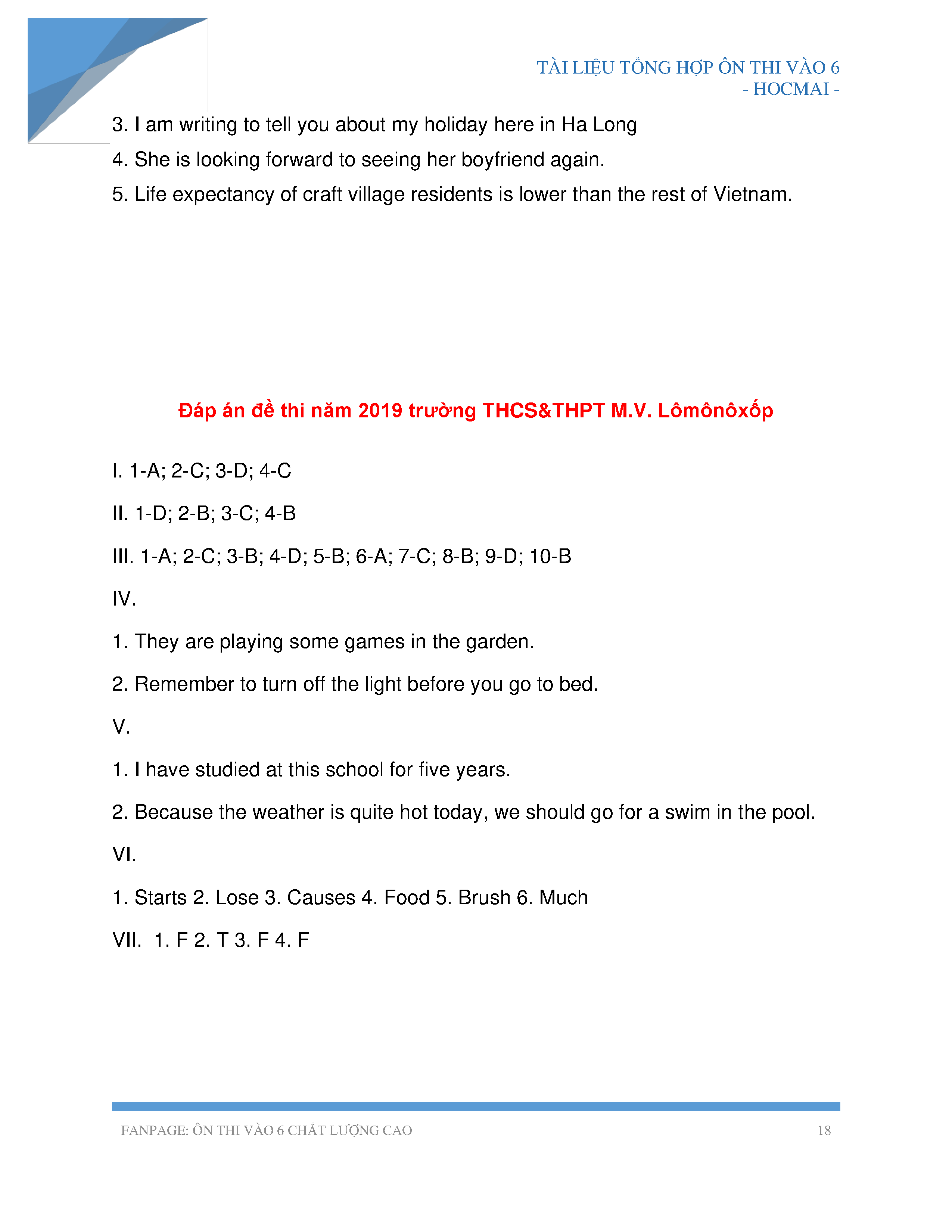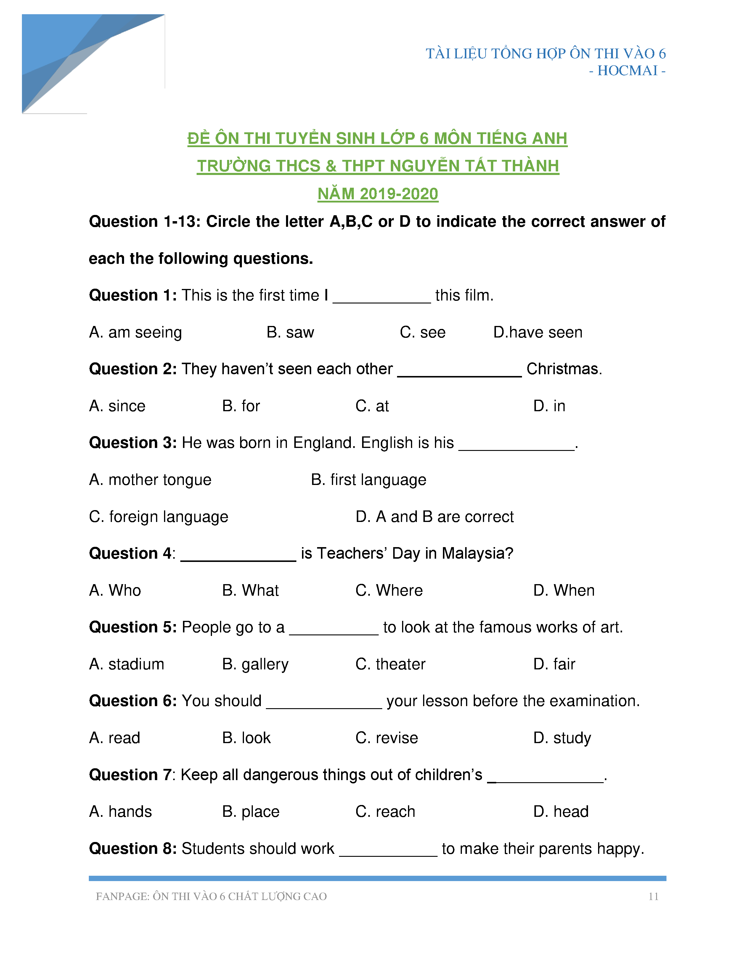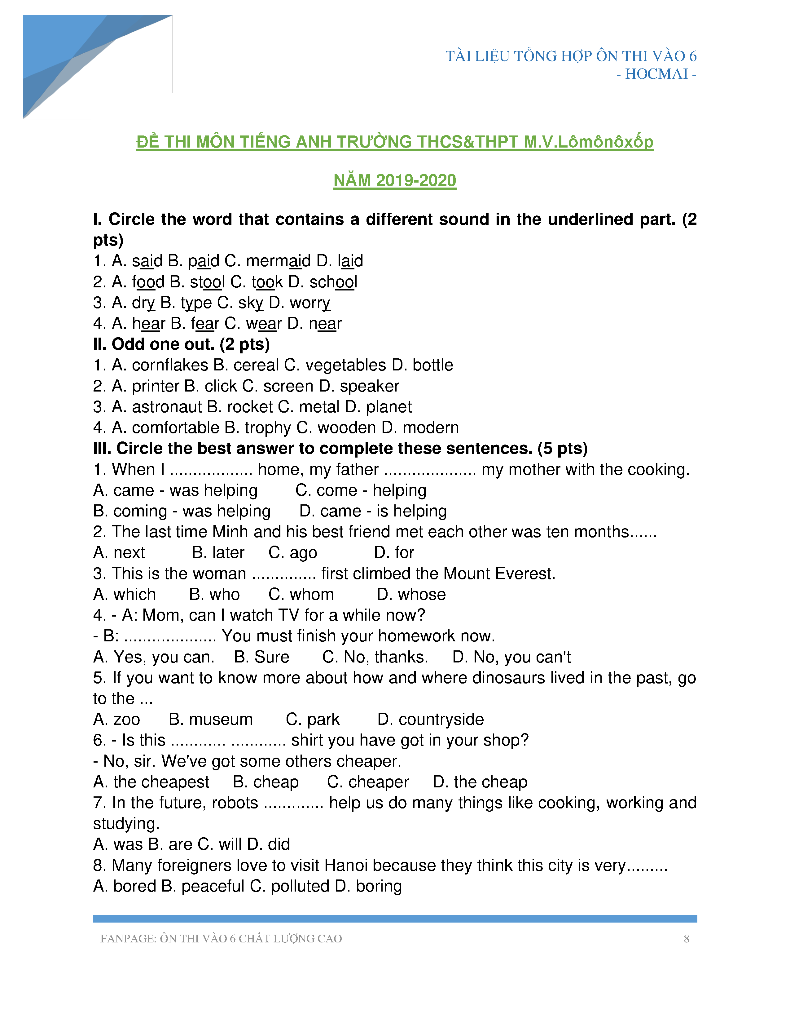 BỘ ĐỀ THI VÀO 6 CÁC TRƯỜNG NĂM 2019-2020 (3 ĐỀ) MÔN TIẾNG ANH