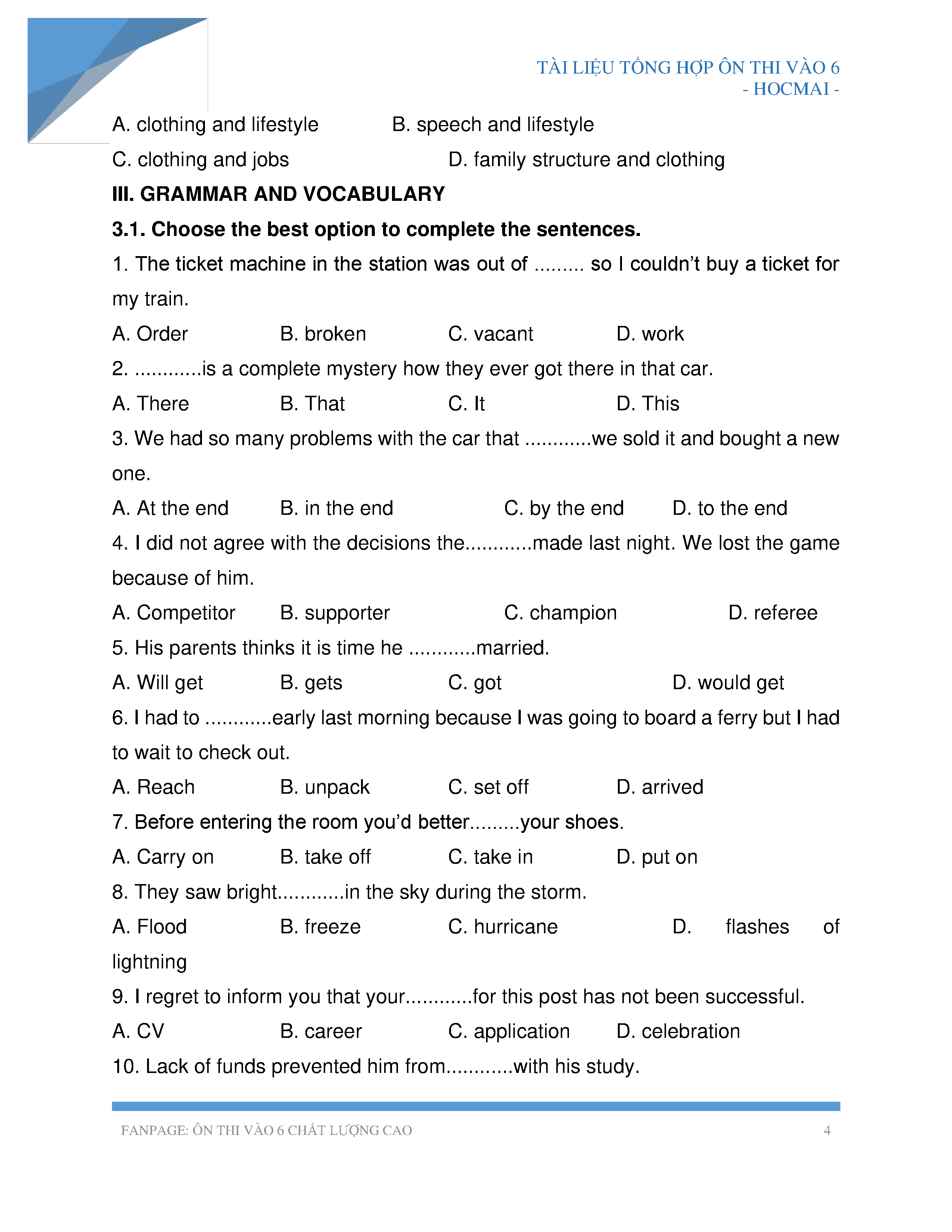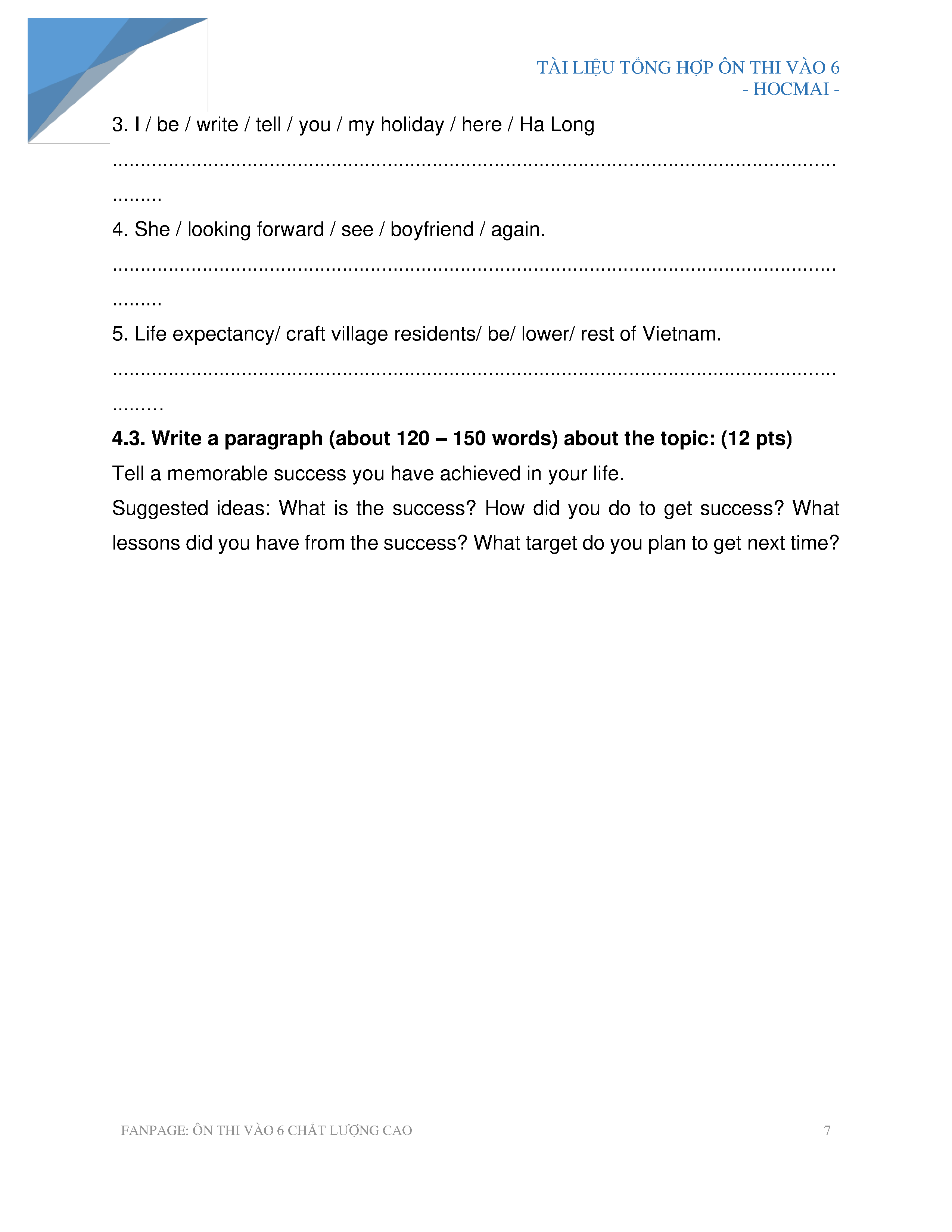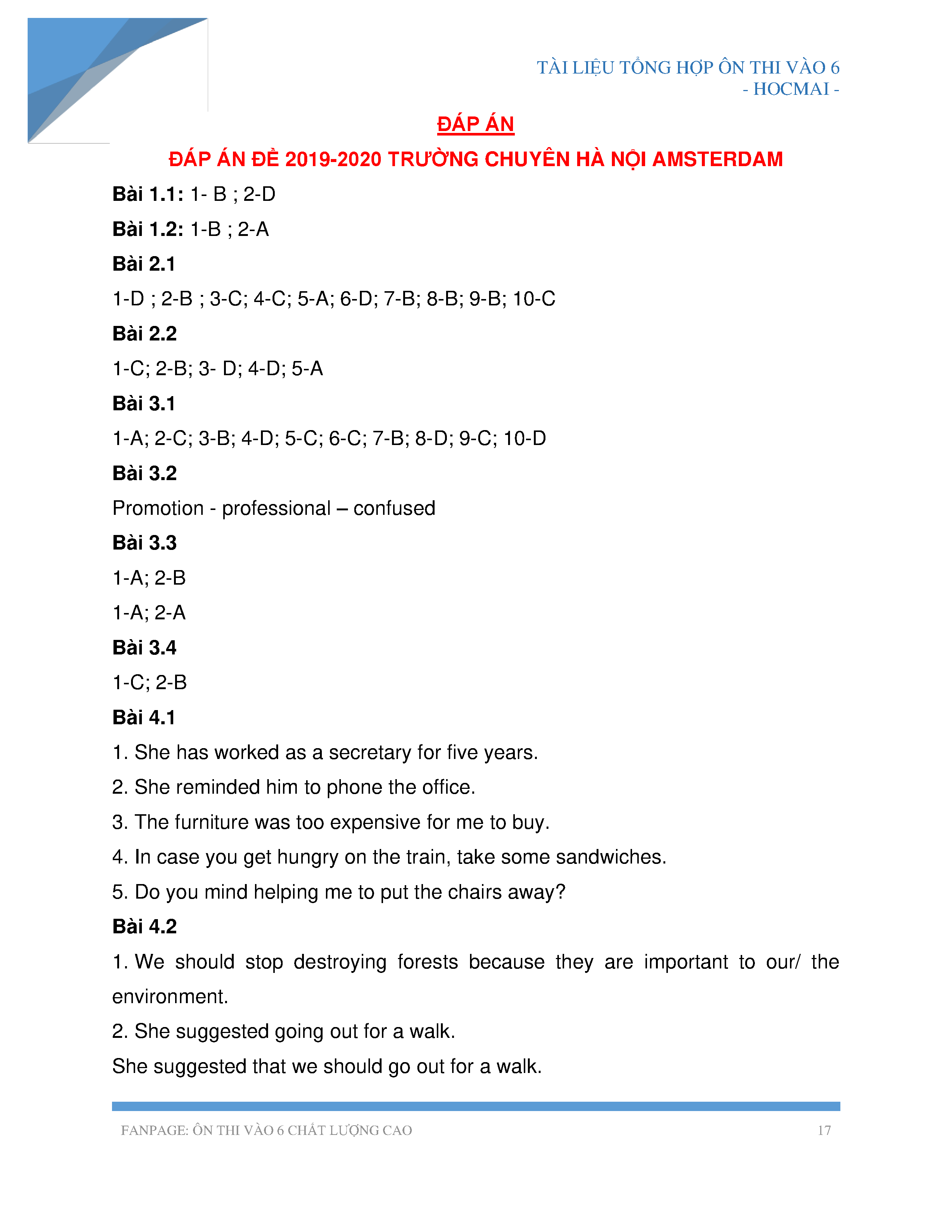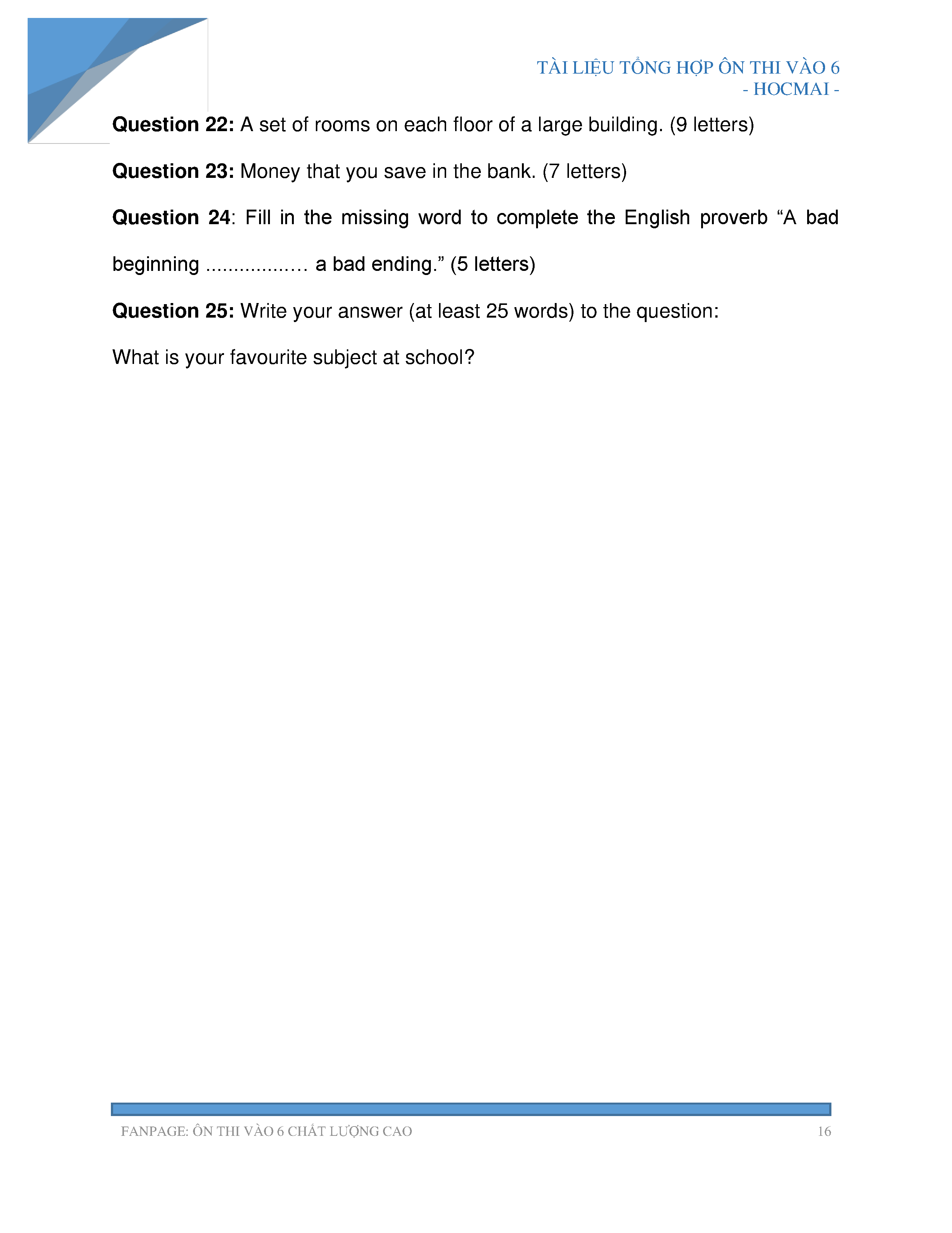 BỘ ĐỀ THI VÀO 6 CÁC TRƯỜNG NĂM 2019-2020 (3 ĐỀ) MÔN TIẾNG ANH