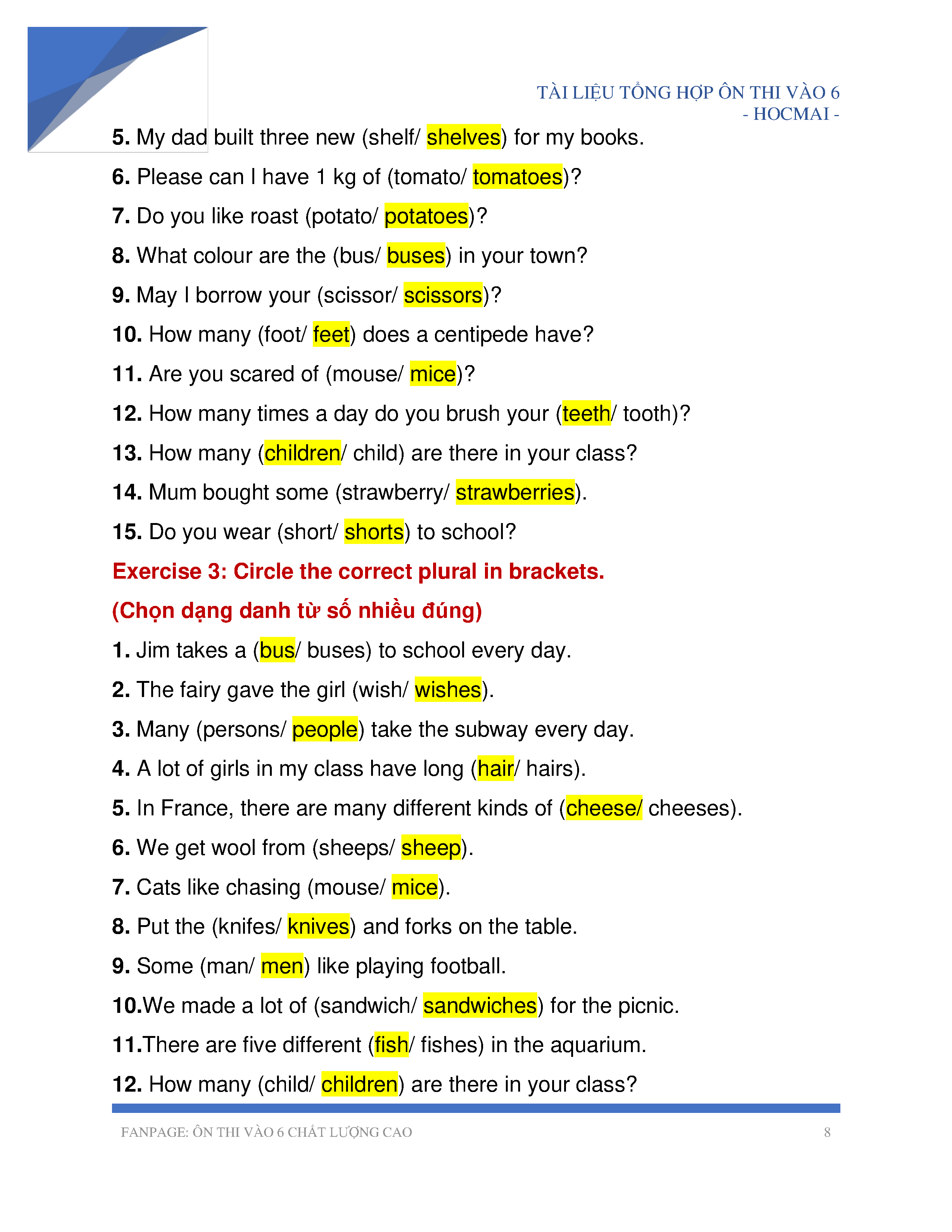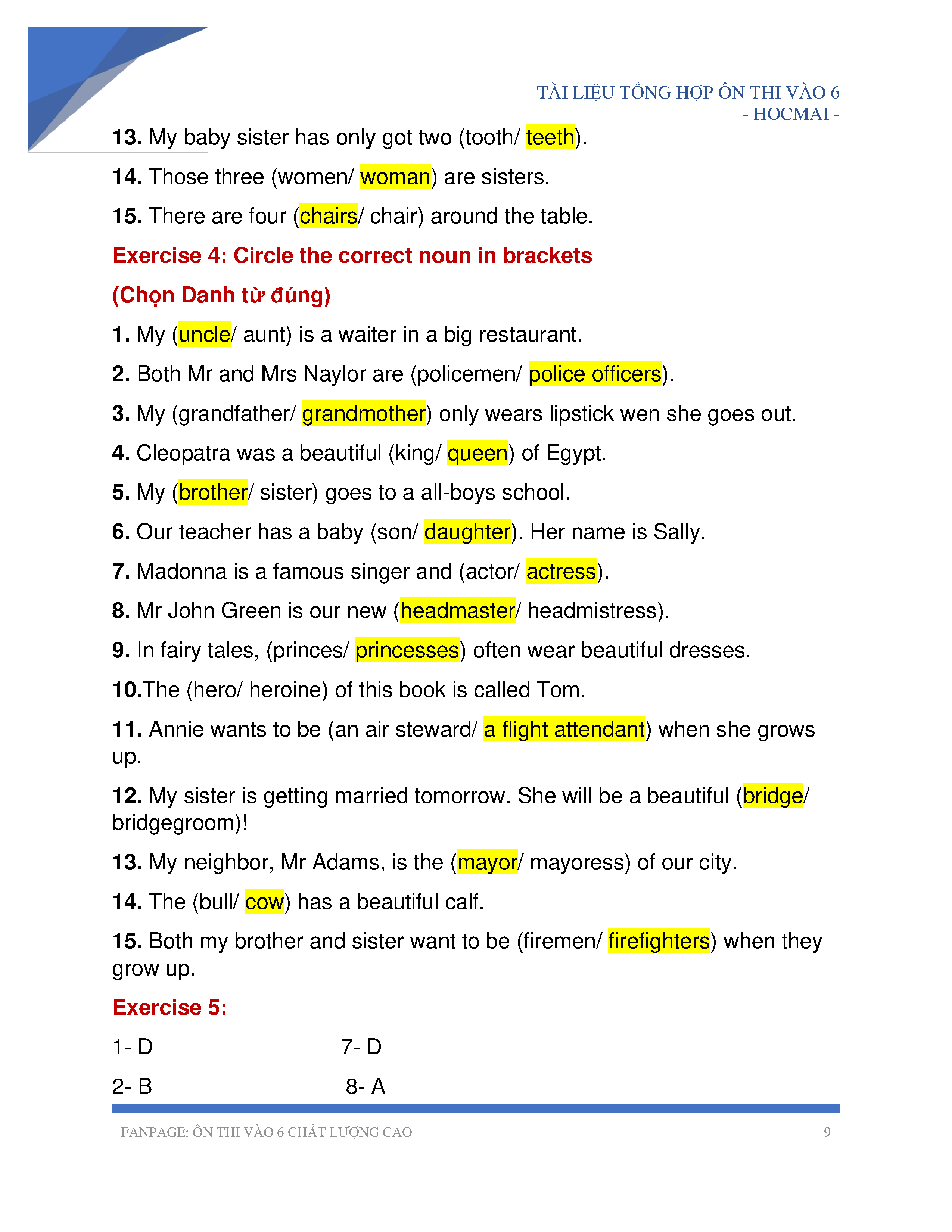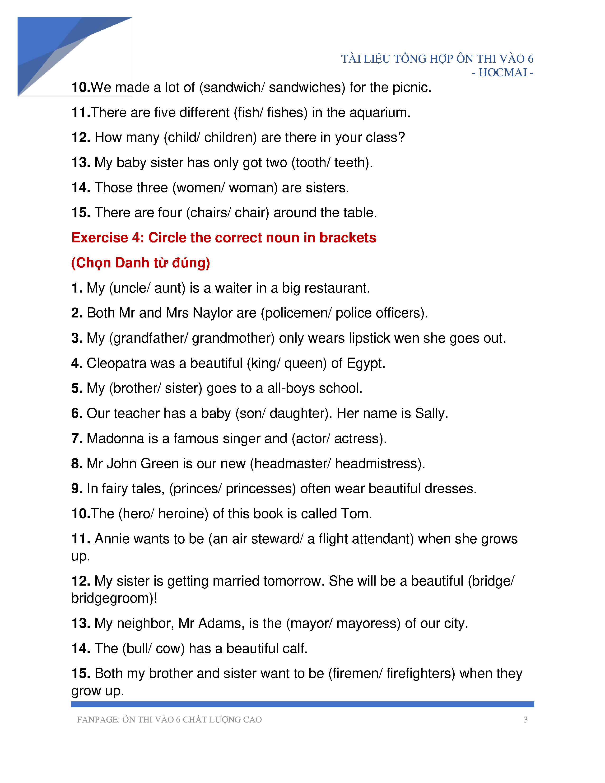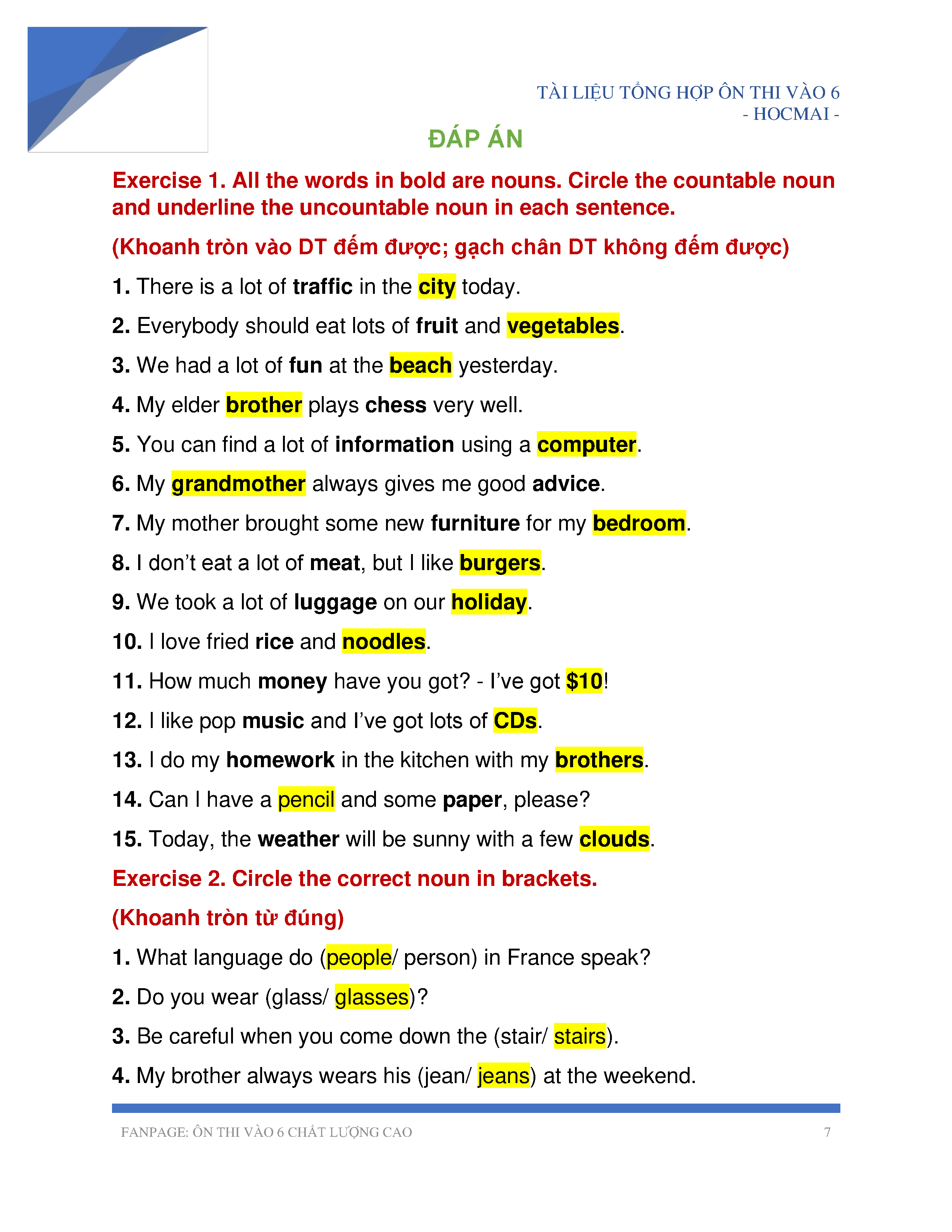 6 BÀI TẬP ÔN LUYỆN TIẾNG ANH VỀ NOUNS (DANH TỪ) CÓ ĐÁP ÁN CHI TIẾT
