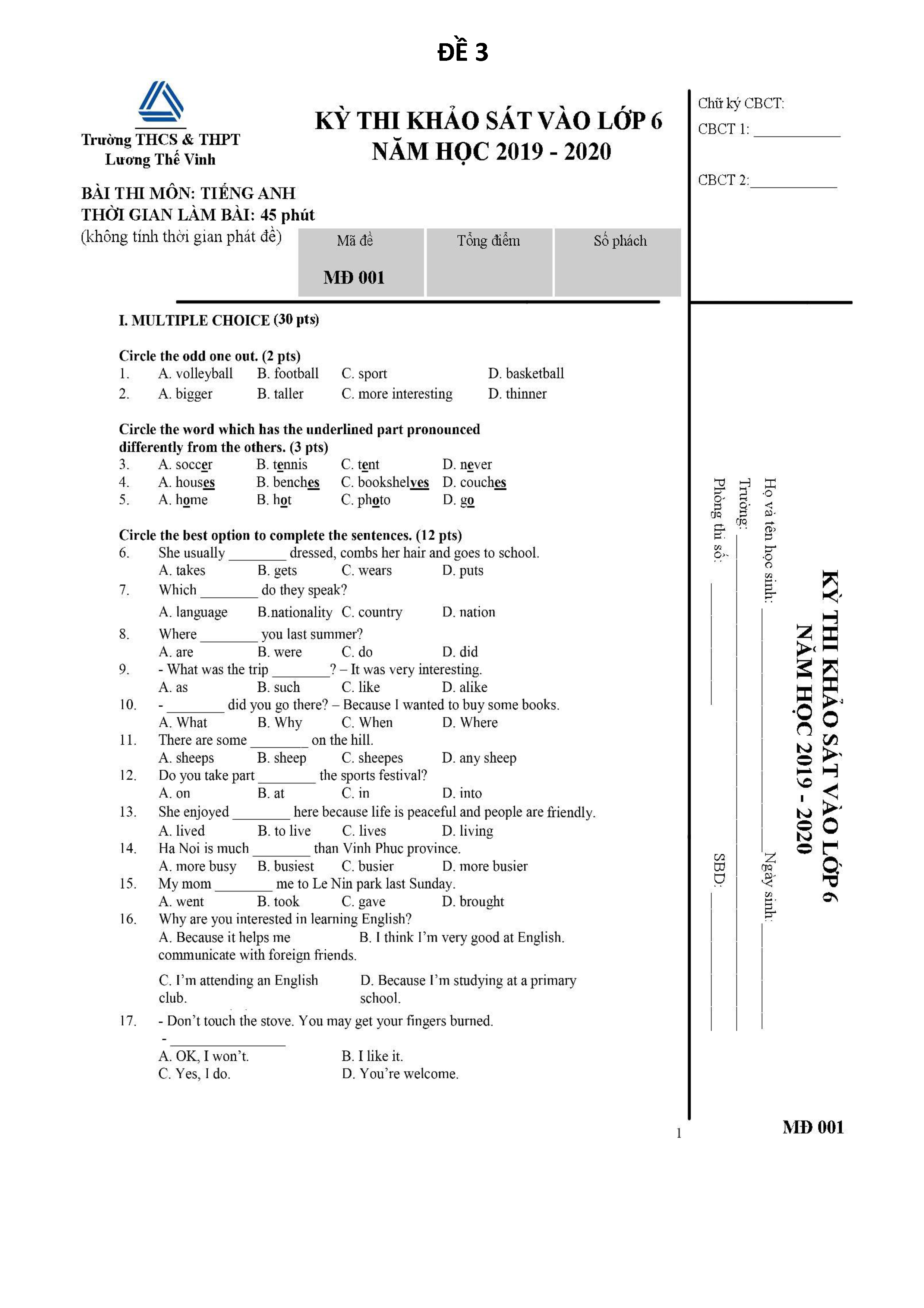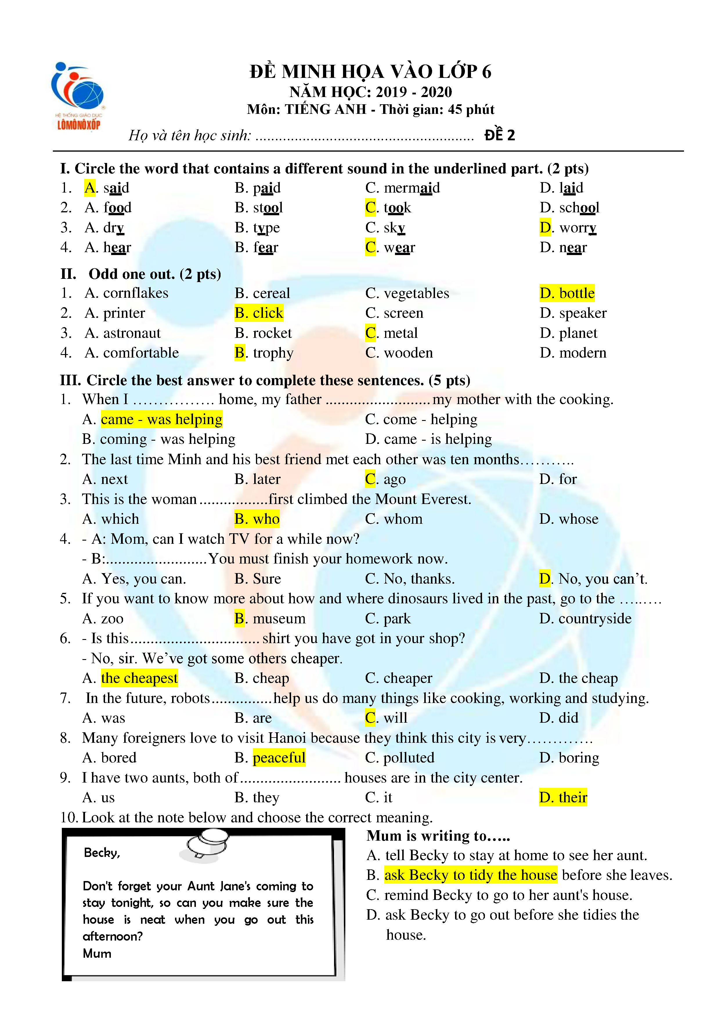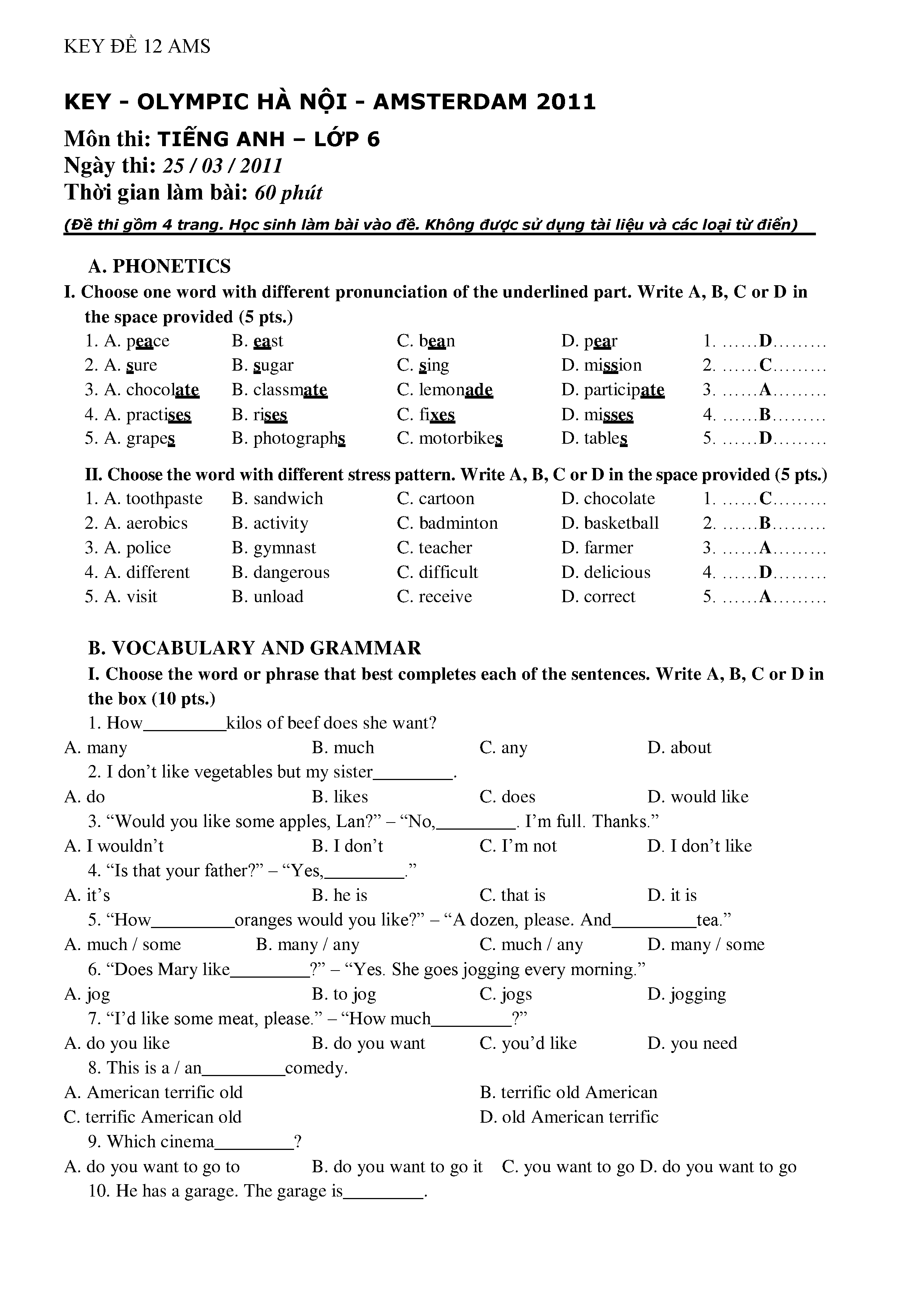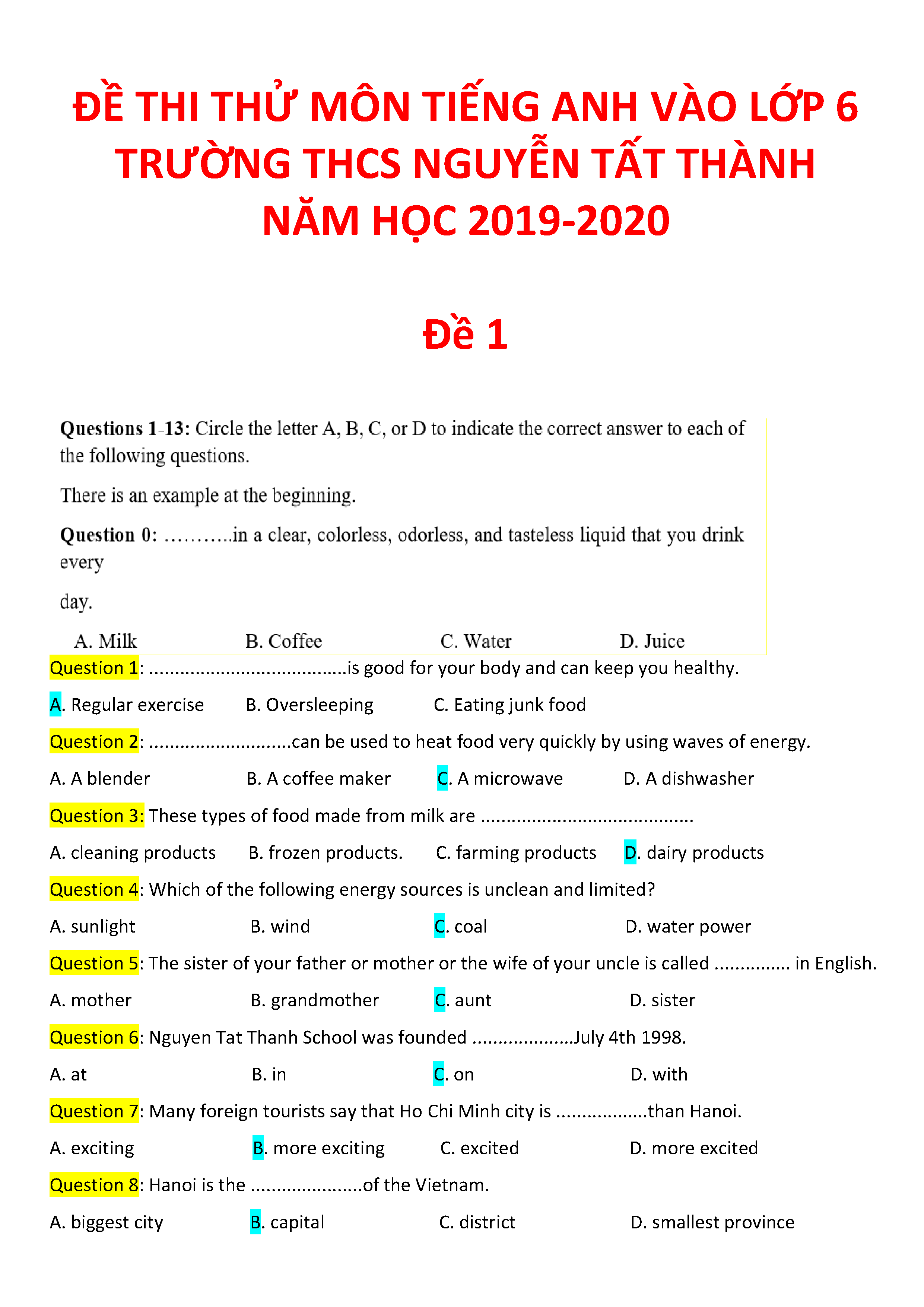 TỔNG HỢP ĐỀ THI TIẾNG ANH VÀO 6 CÁC TRƯỜNG CLC HÀ NỘI