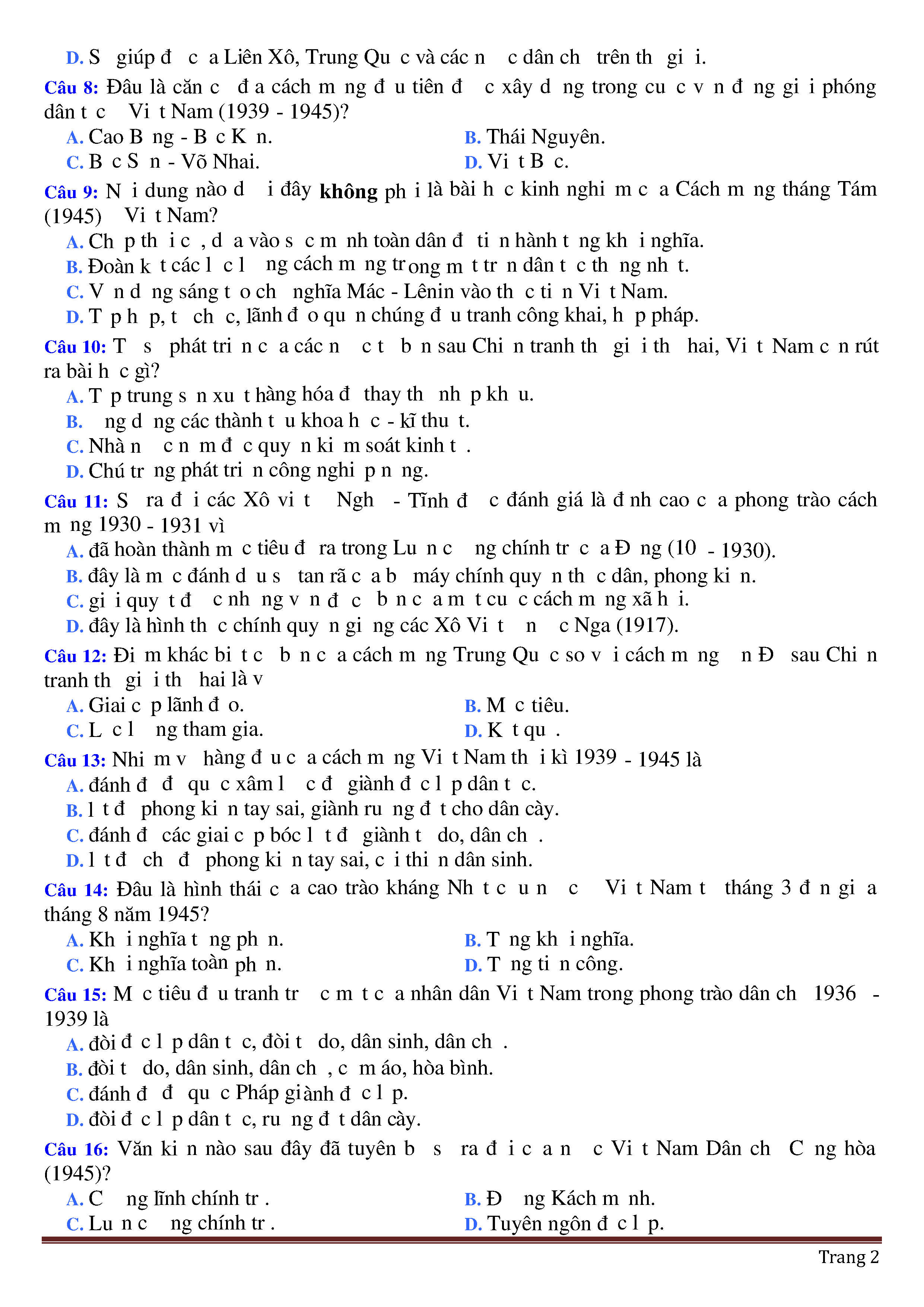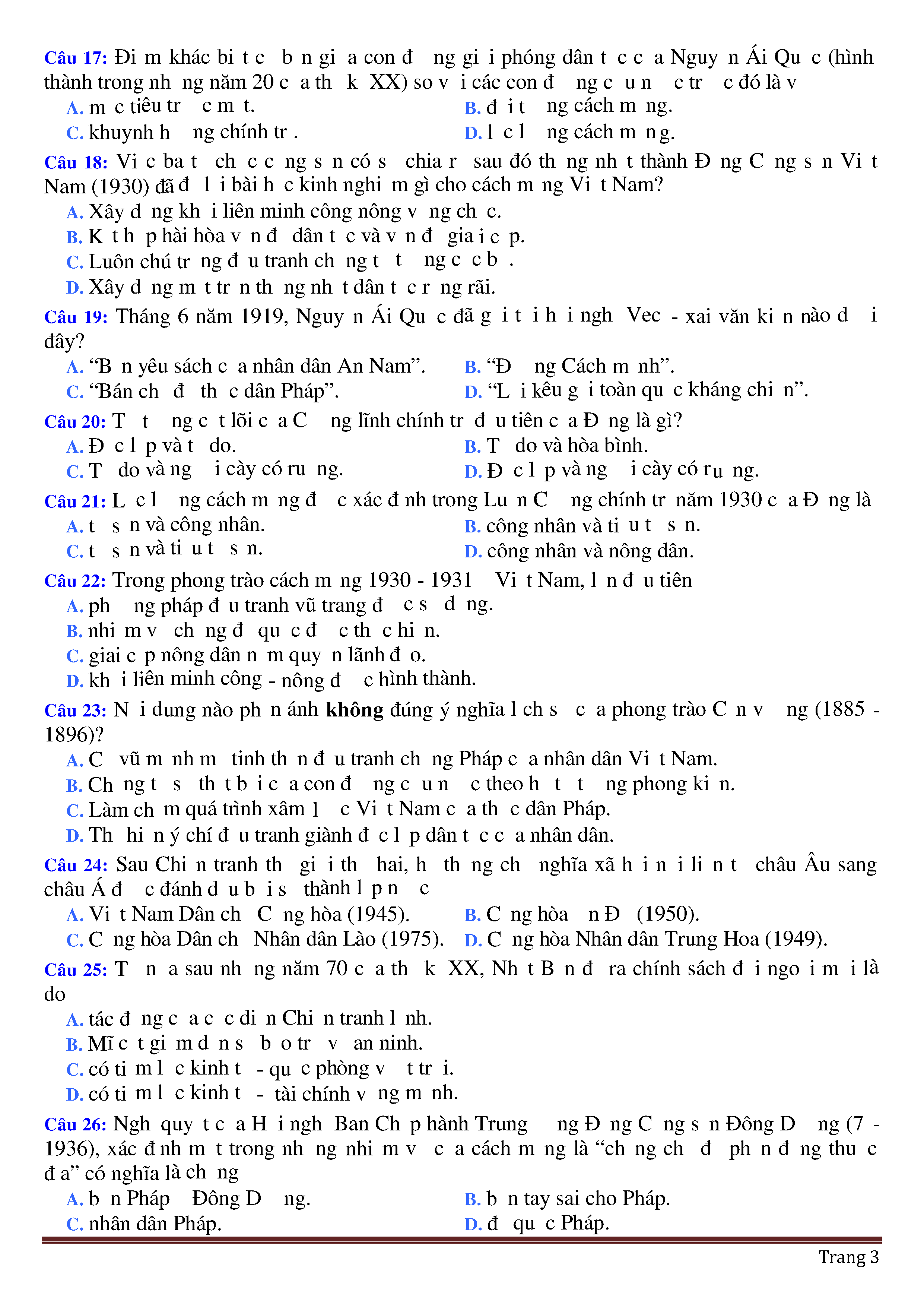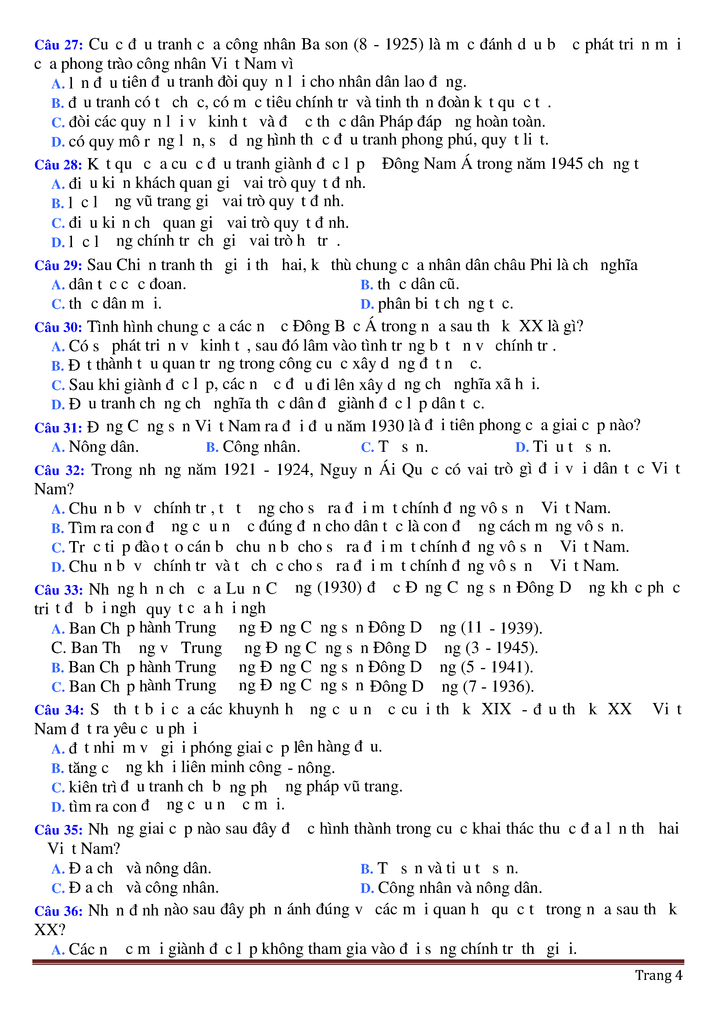 Đề thi thử THPT năm 2020 môn Lịch sử - Trường THPT Nguyễn Viết Xuân - Vĩnh Phúc - lần 2