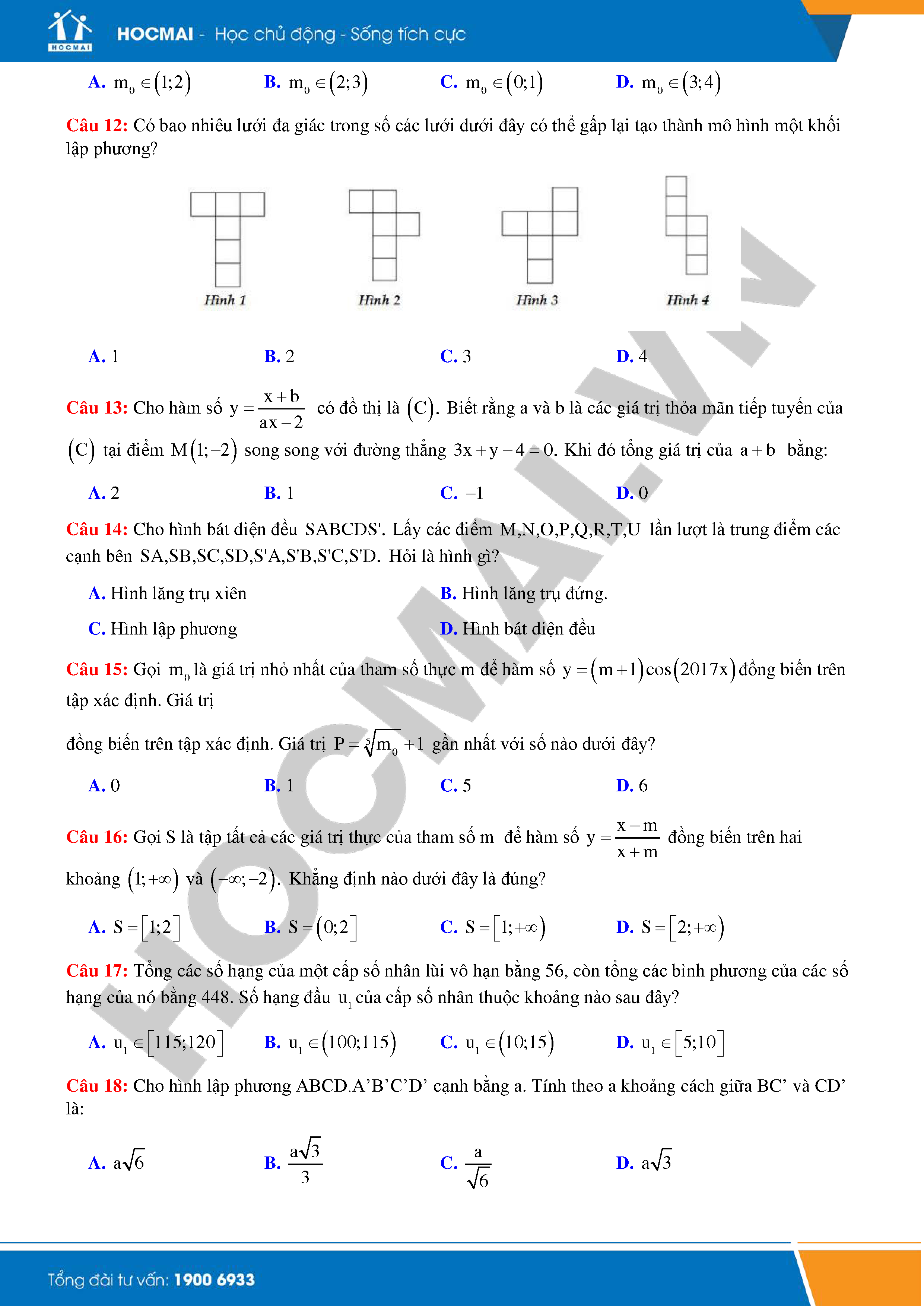 Đề kiếm tra môn Toán định kỳ (Lần 2) năm học 2017-2018 do HOCMAI sưu tầm bao gồm 4 trang với 20 câu hỏi trắc nghiệm. Nội dung kiến thức xoay quanh chương trình lớp 12. Chúc các bạn ôn luyện vui vẻ!