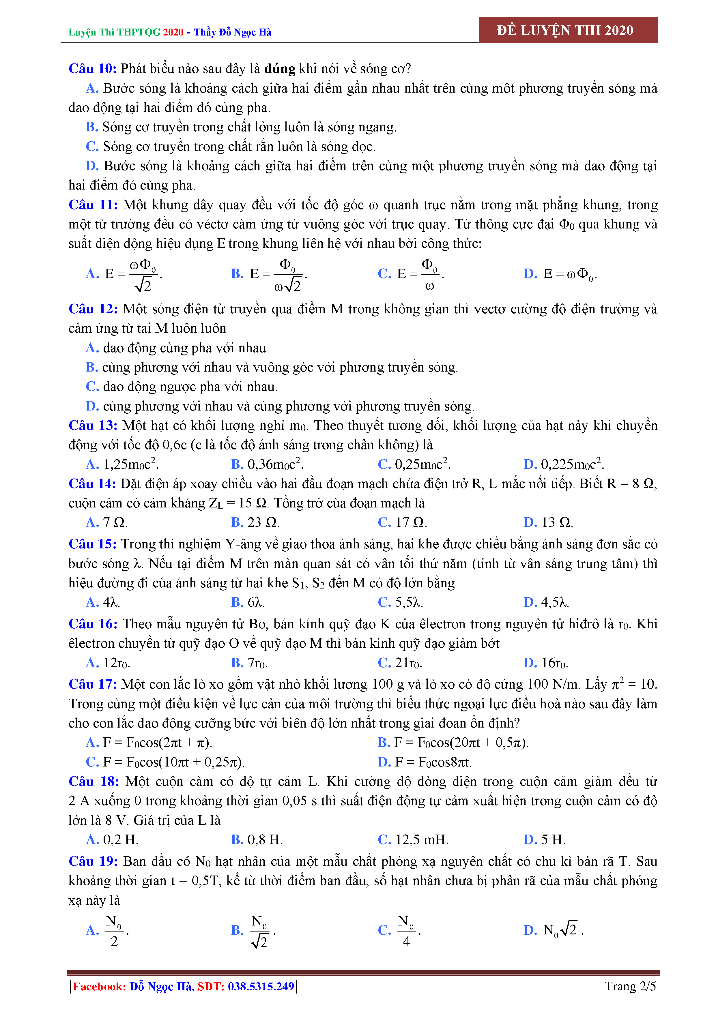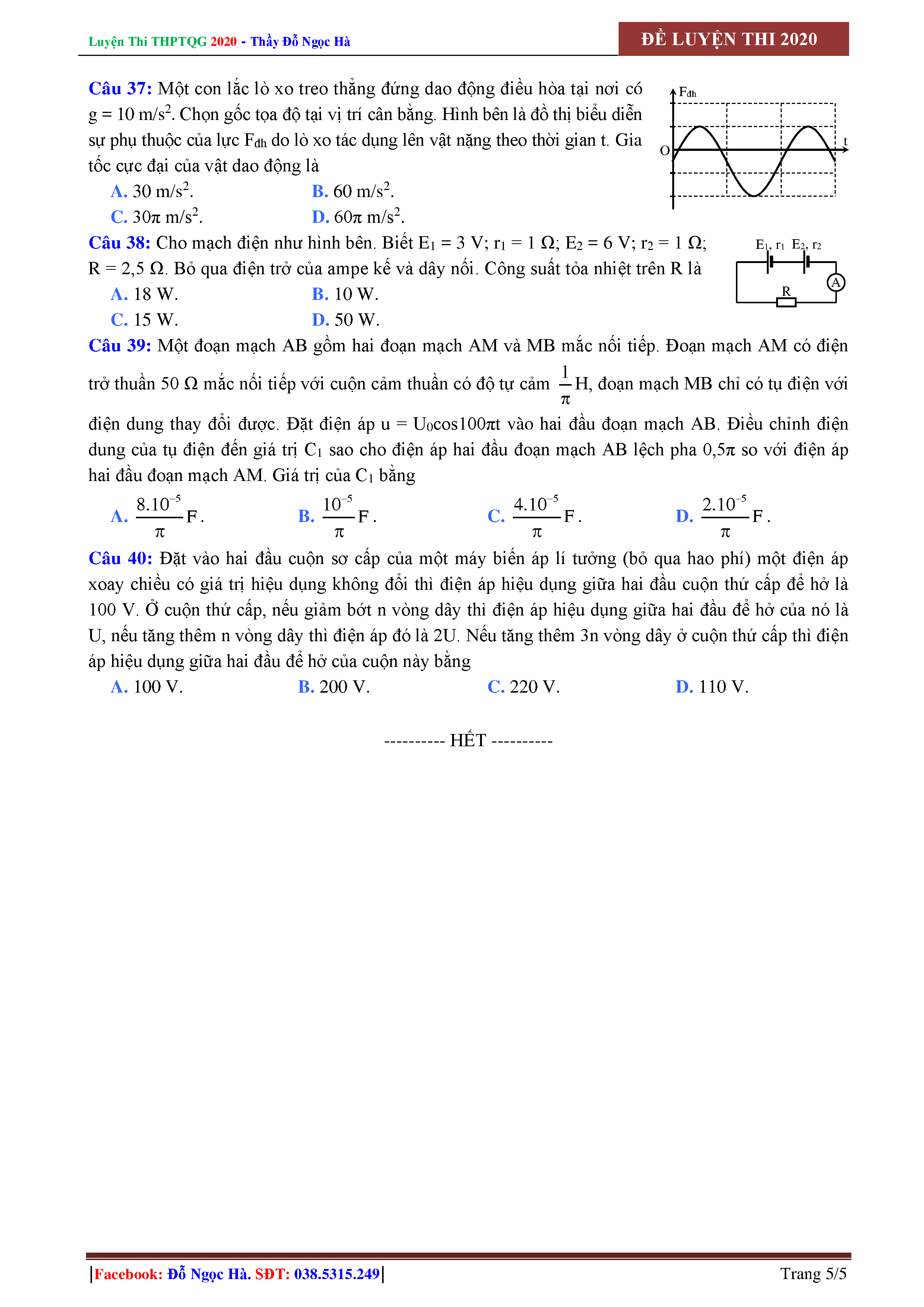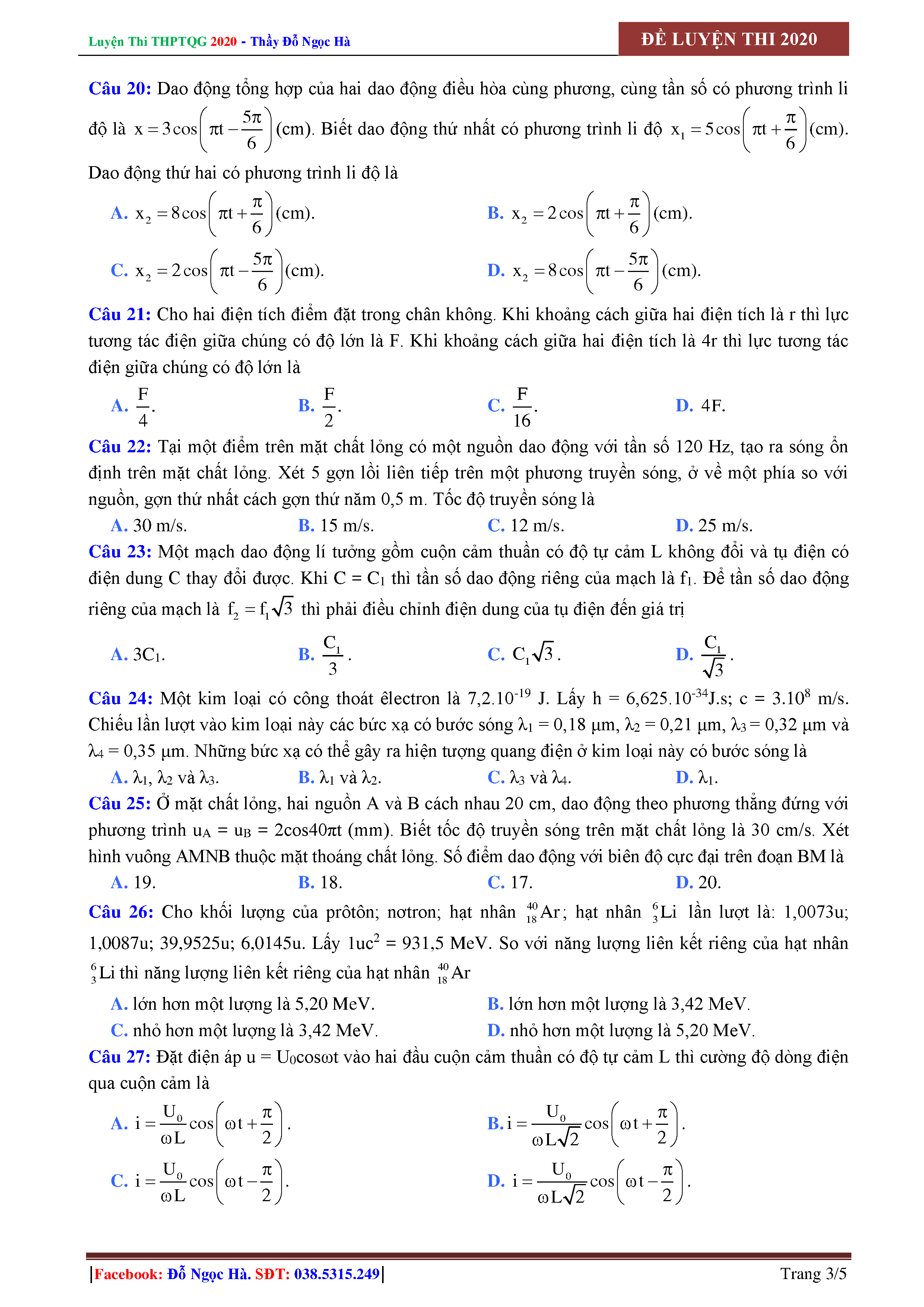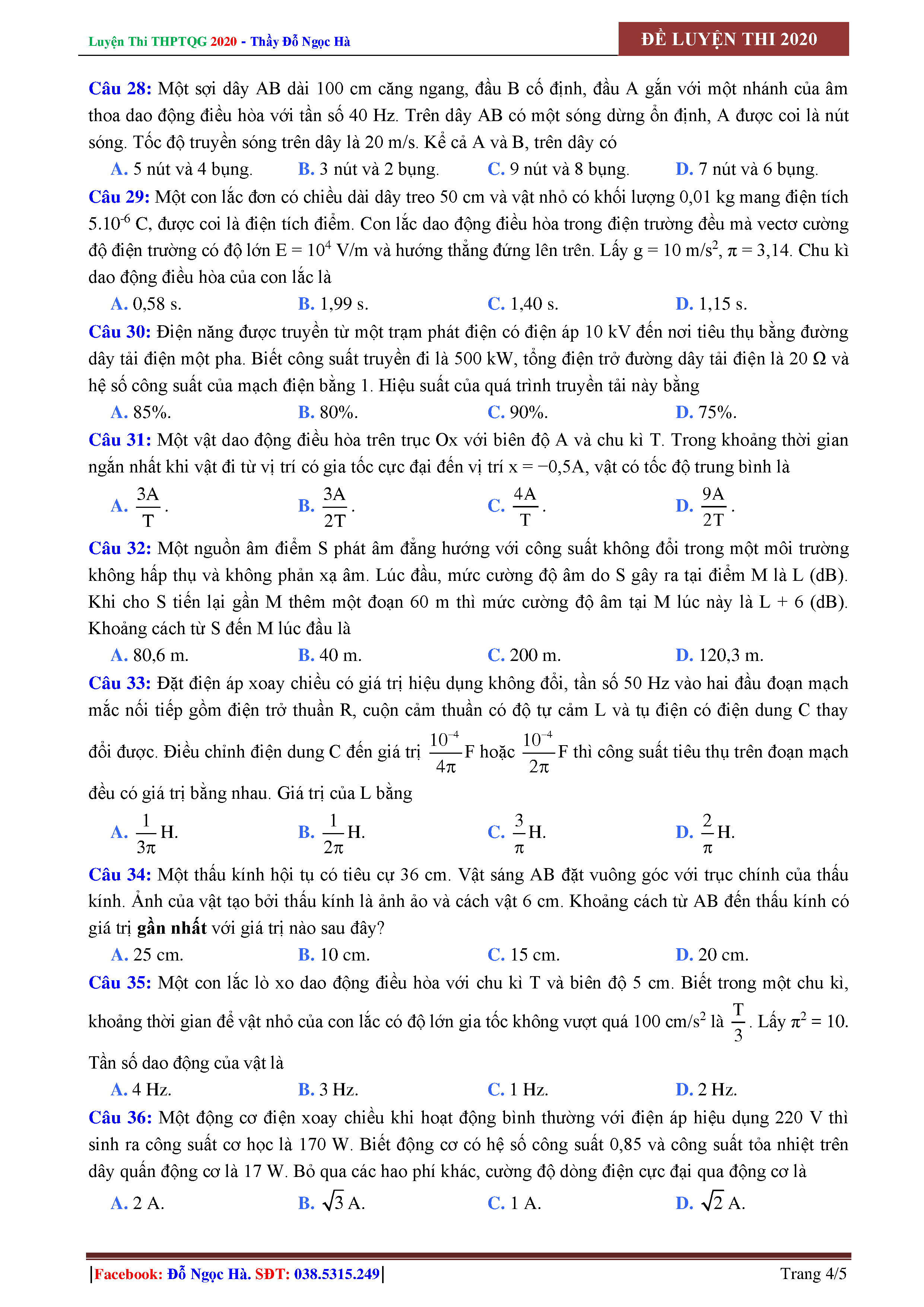 Đề nắm chắc 8 điểm môn Vật Lí - Thầy Đỗ Ngọc Hà - Năm 2020 - đề số 01