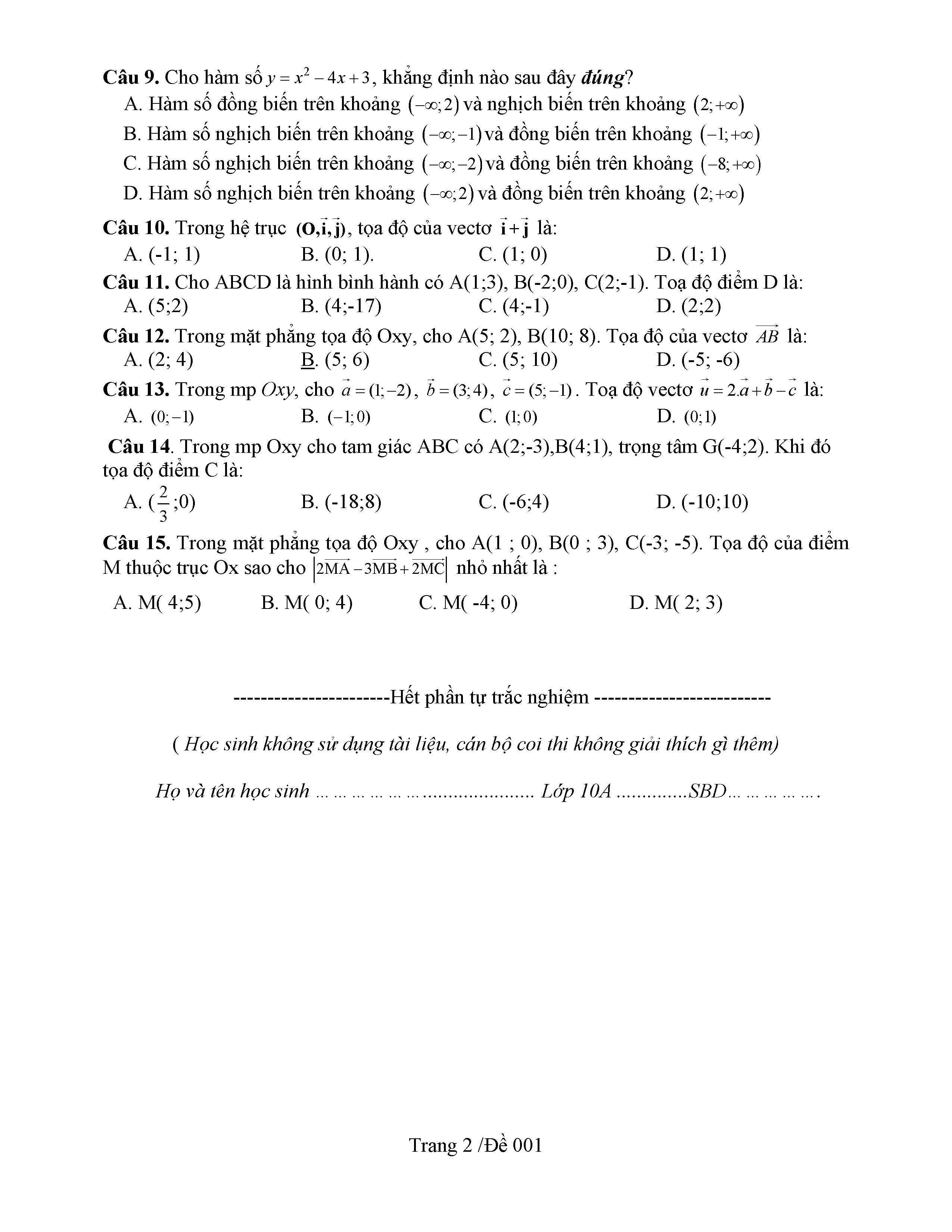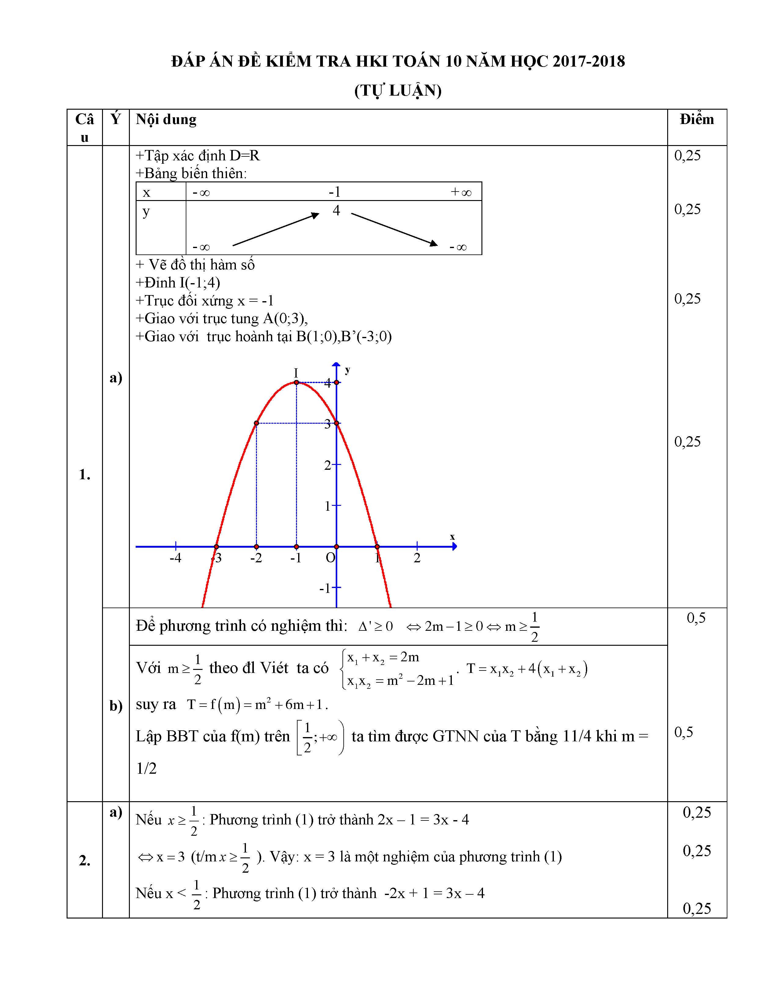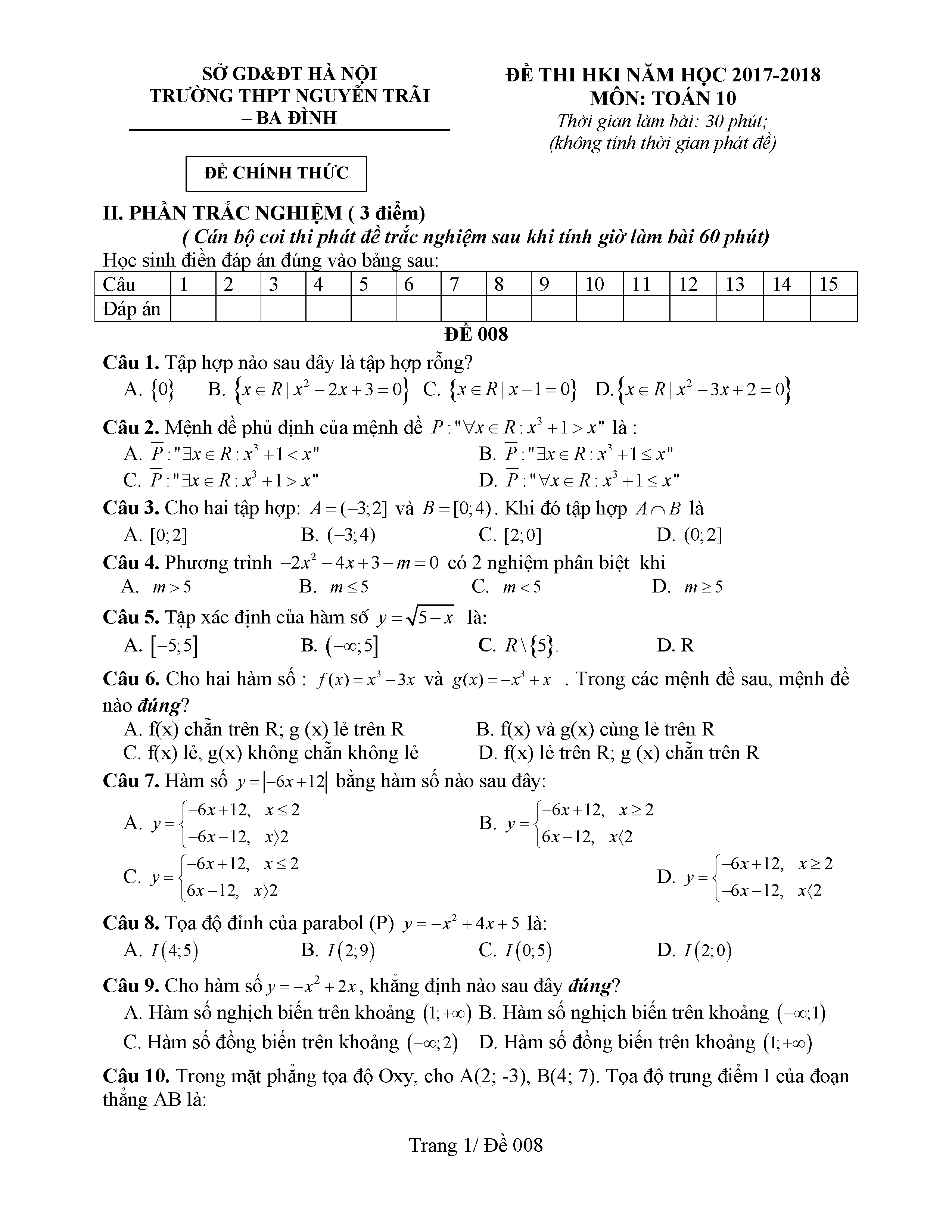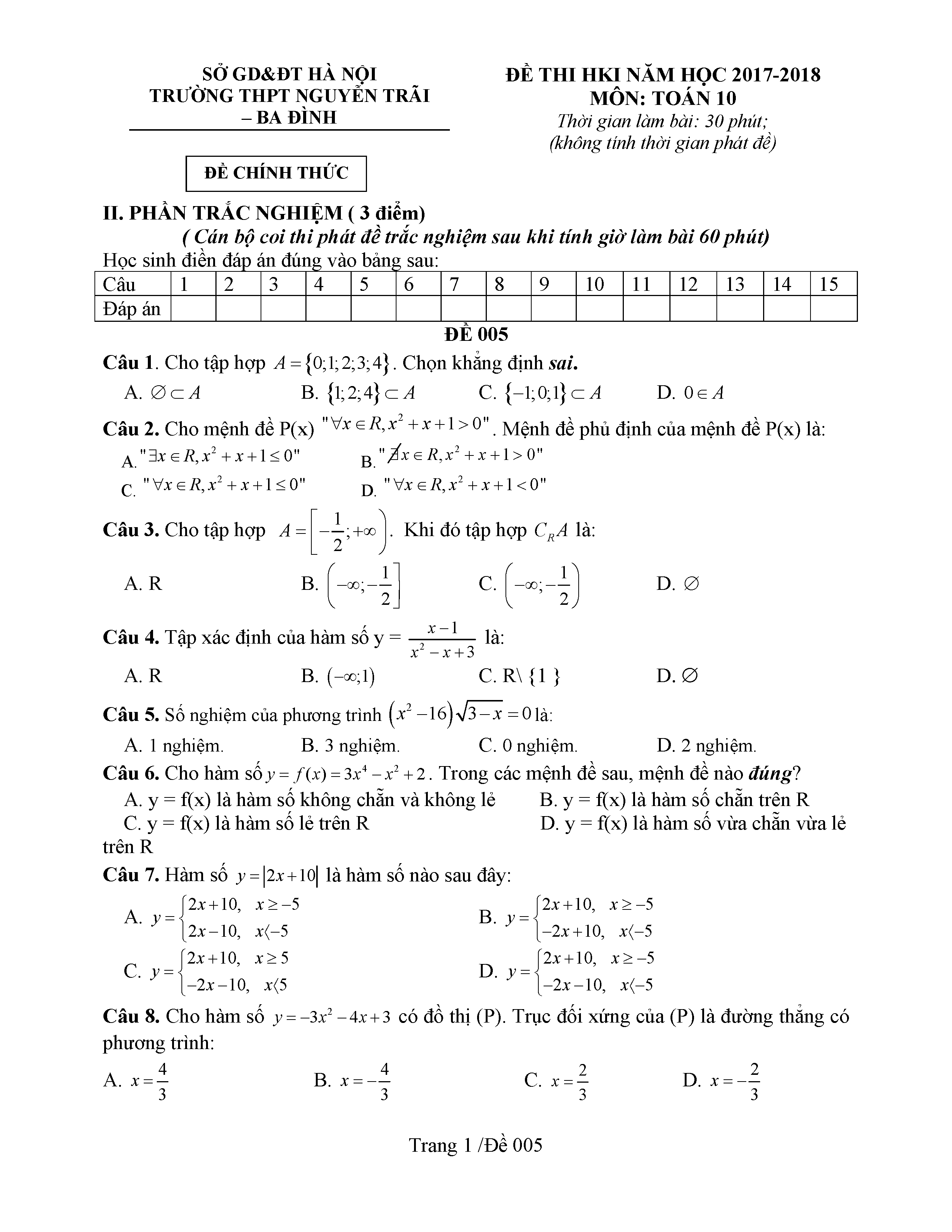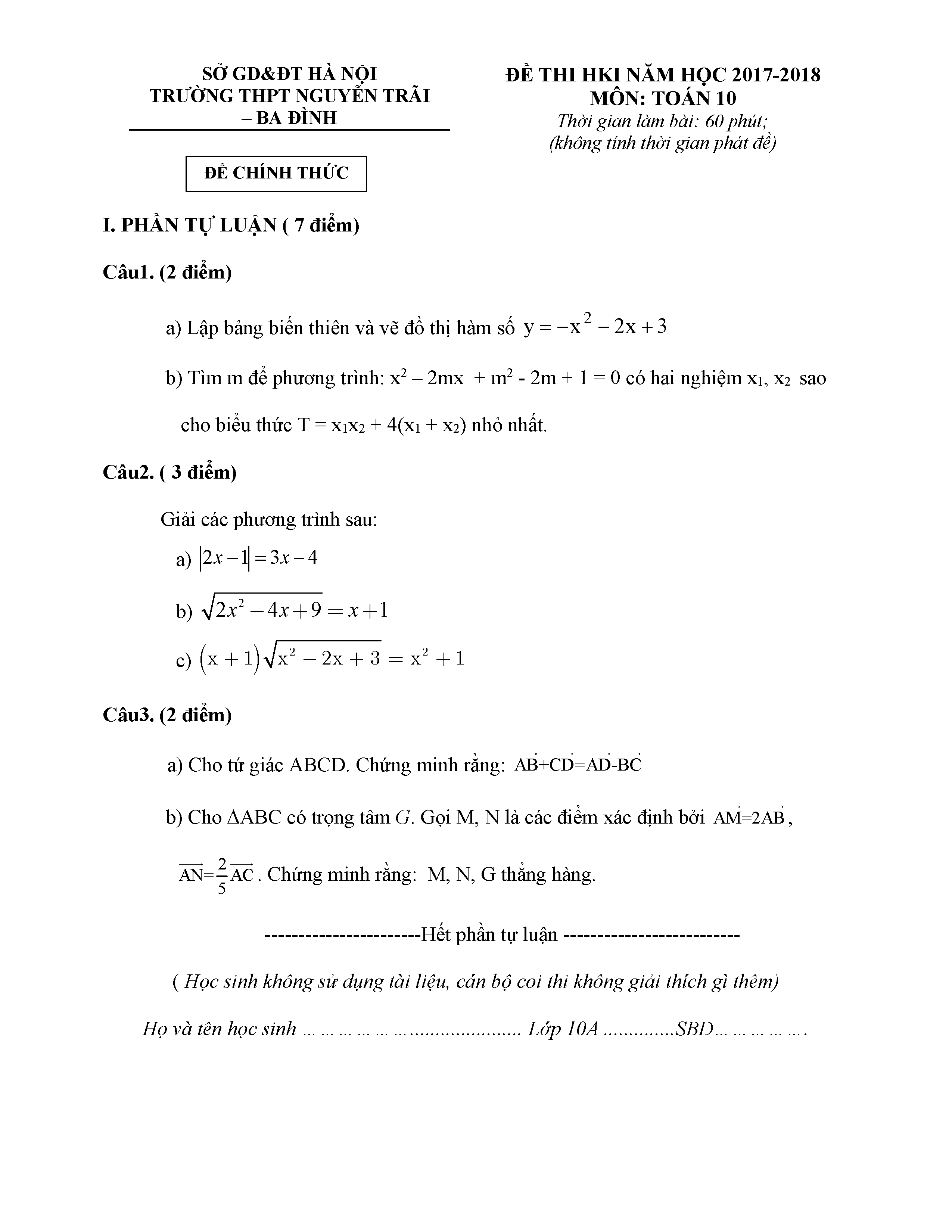 ĐỀ THI HKI MÔN TOÁN NĂM 2017-2018 CỦA TRƯỜNG THPT NGUYỄN TRÃI - BA ĐÌNH LỚP 10