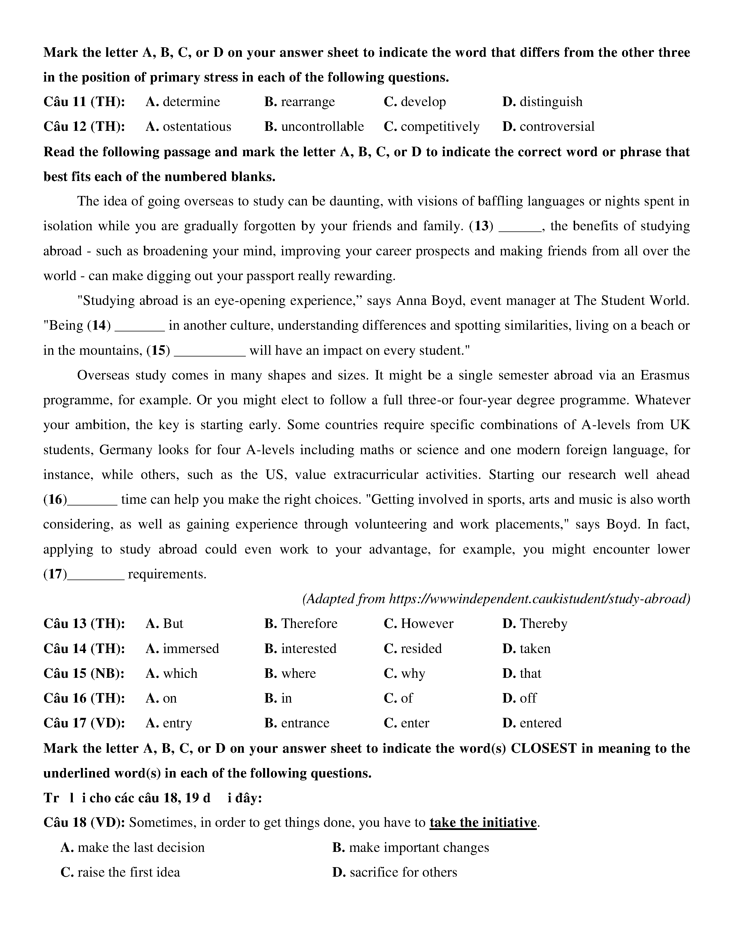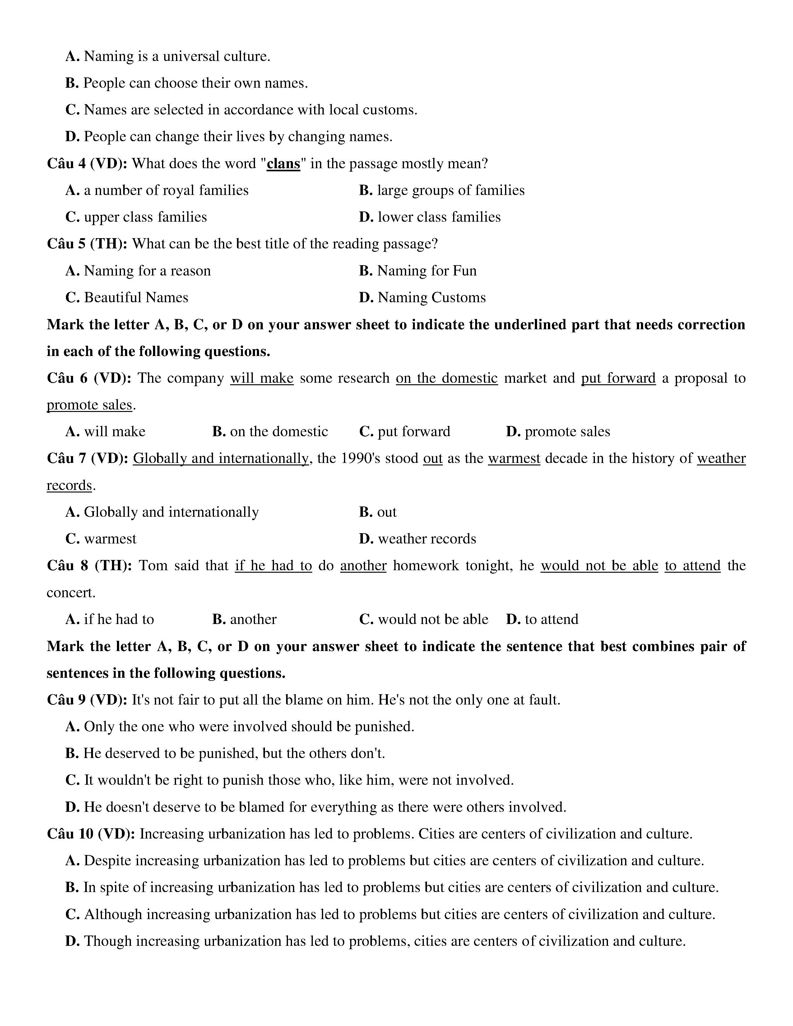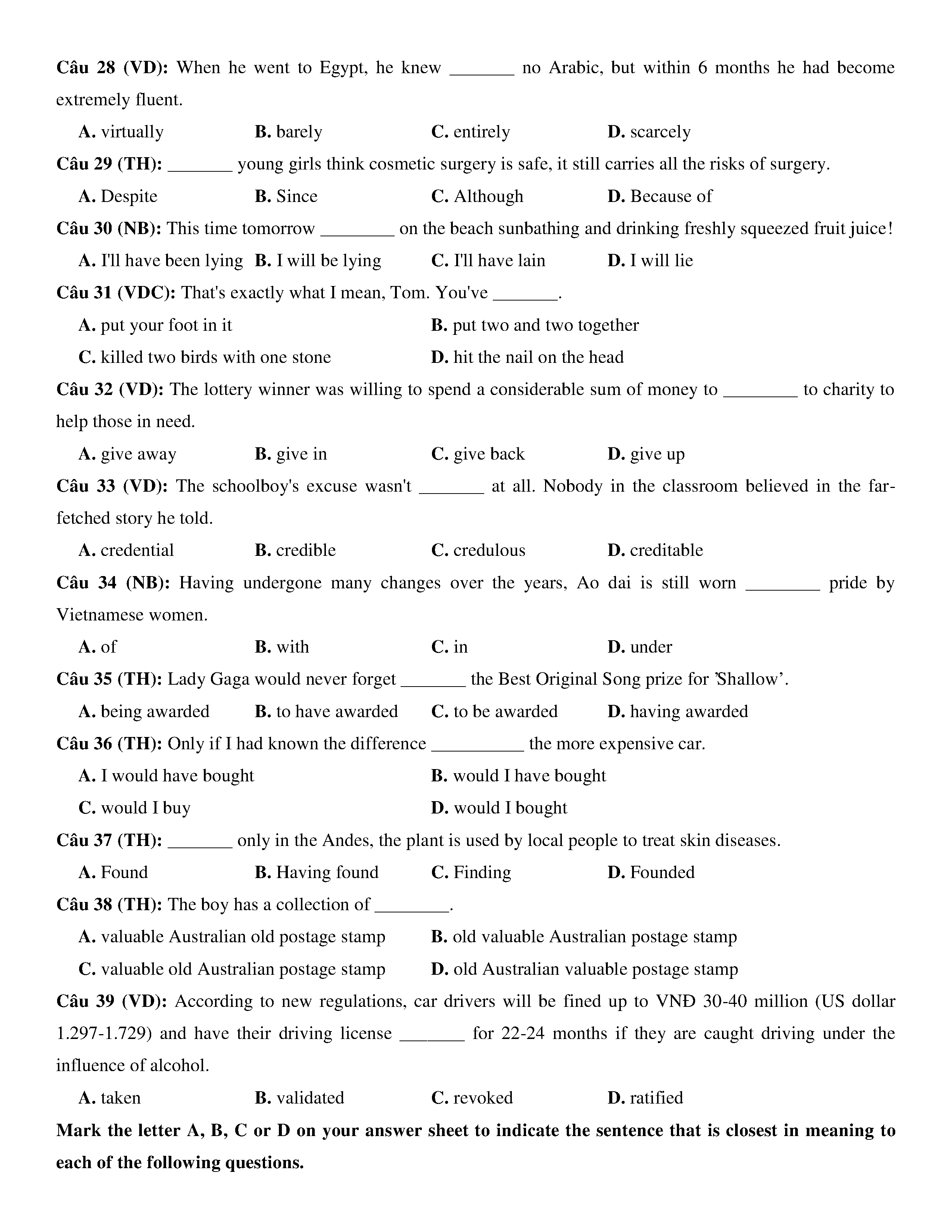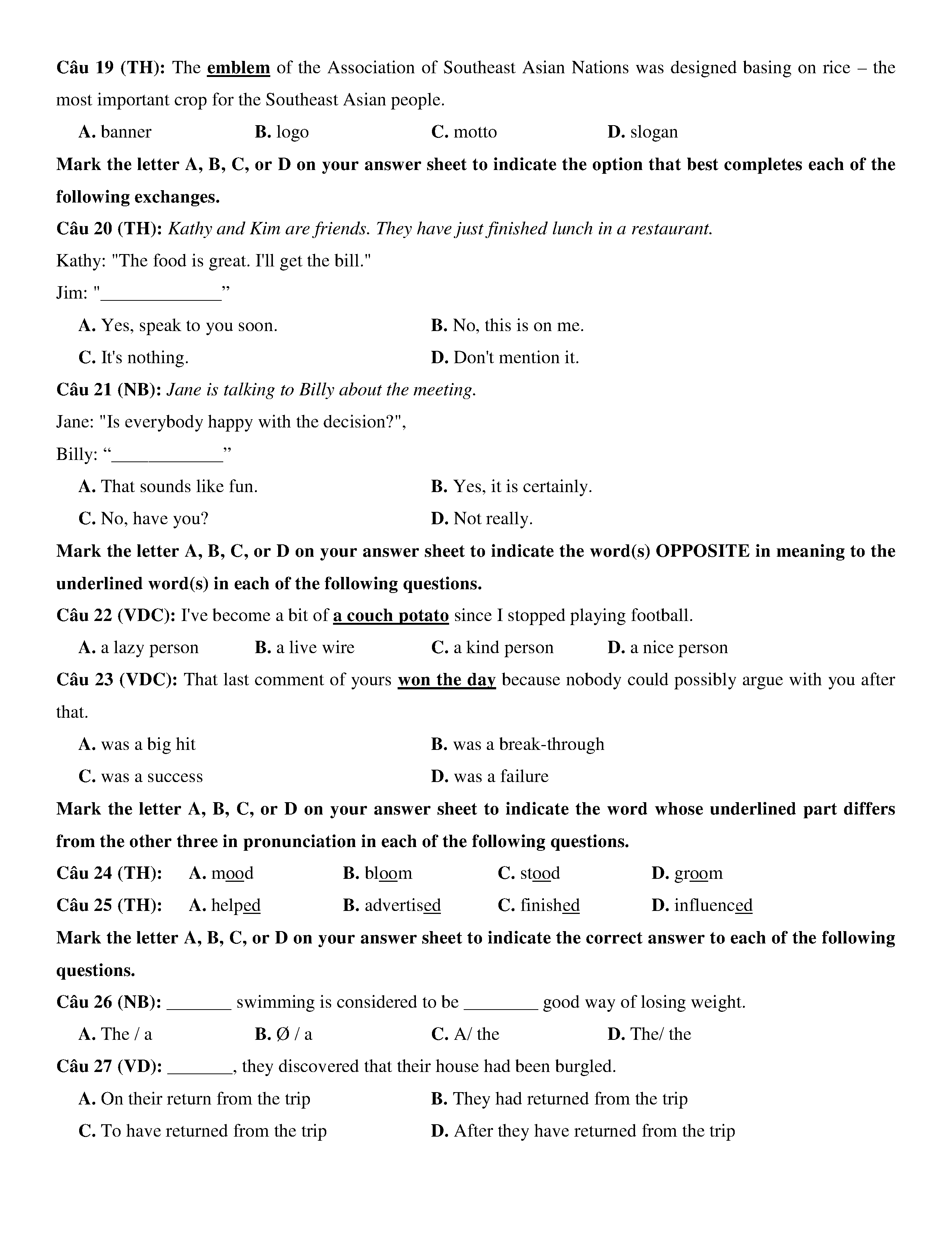 Đề KSCL lớp 12 môn Tiếng Anh năm 2020 Trường THPT Chuyên Phan Bội Châu- Nghệ An