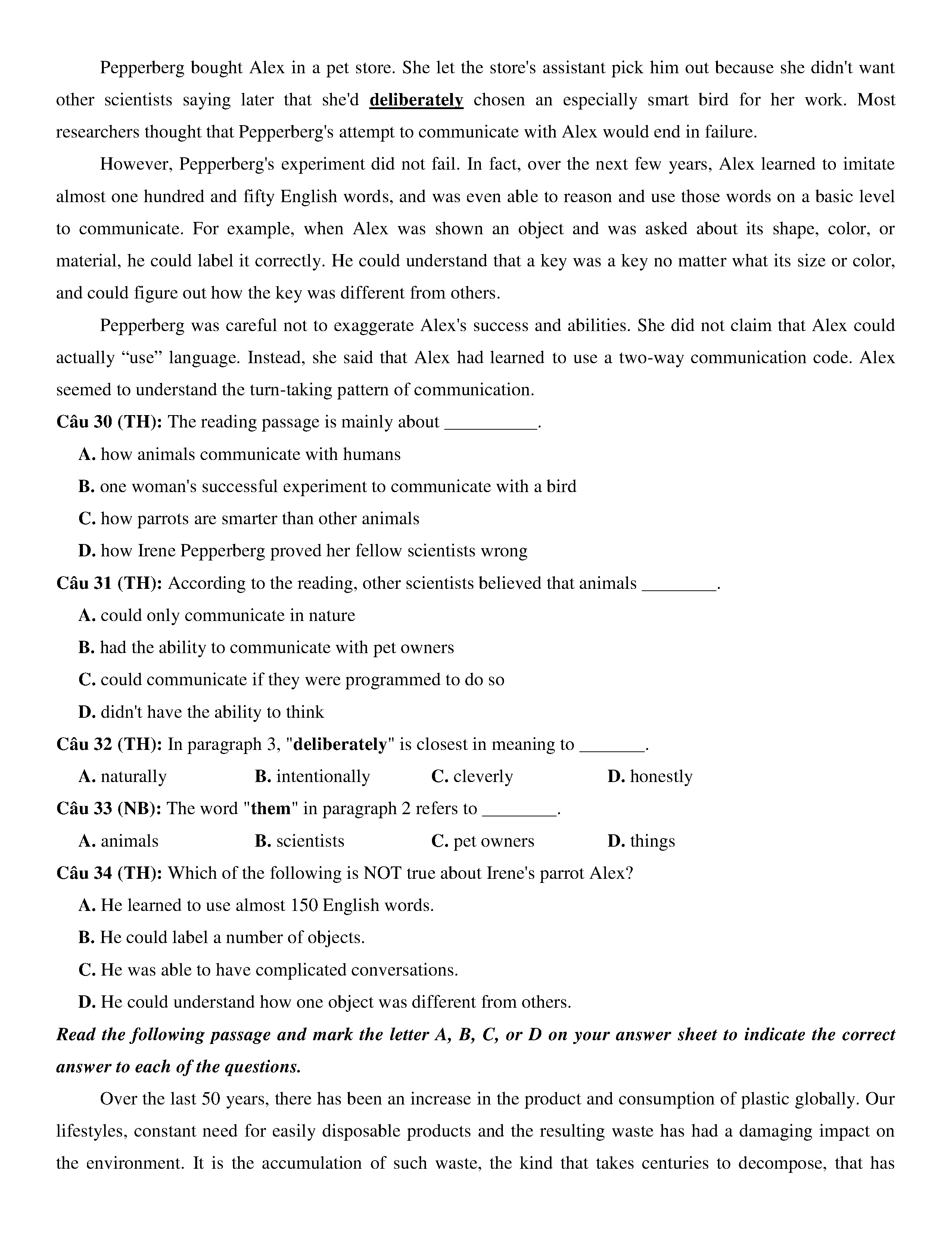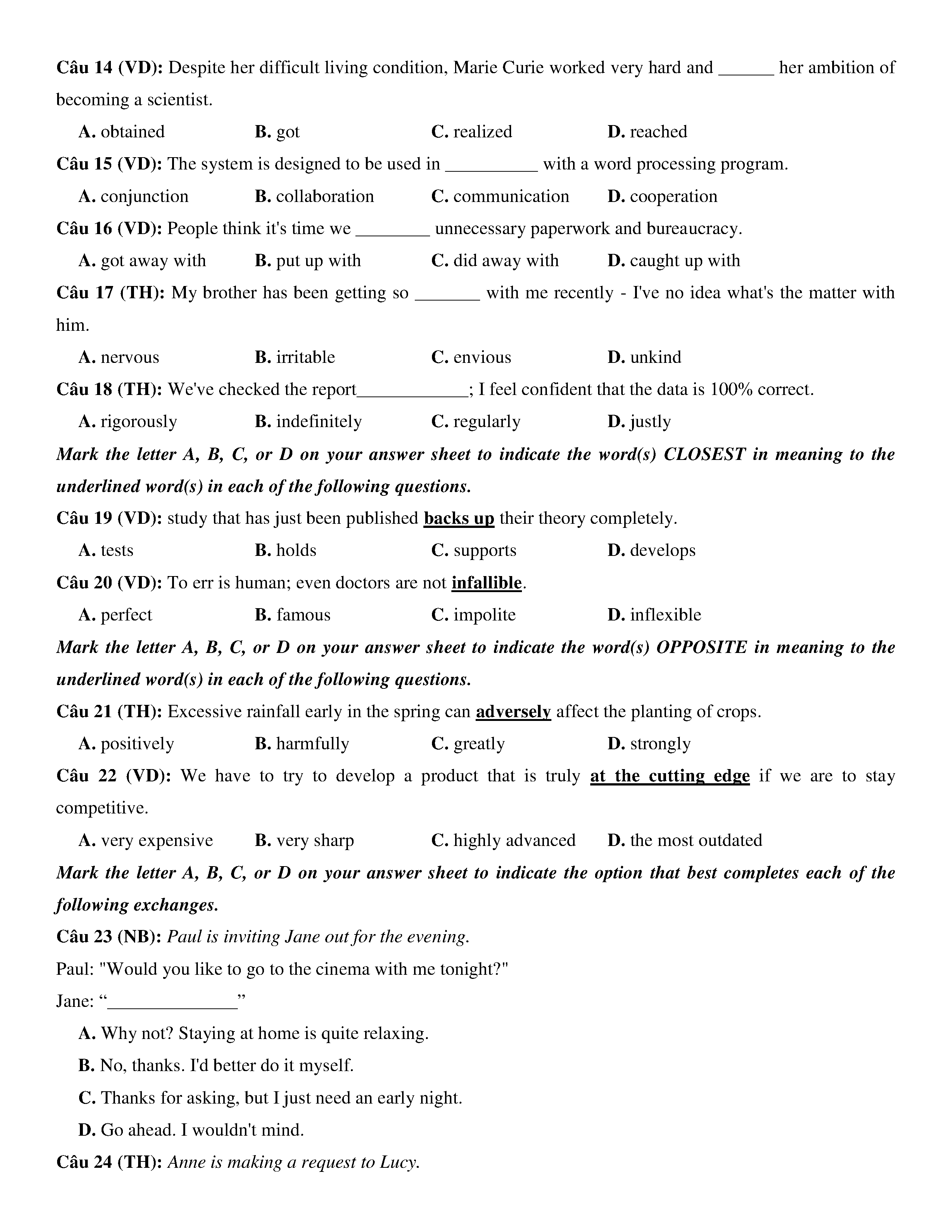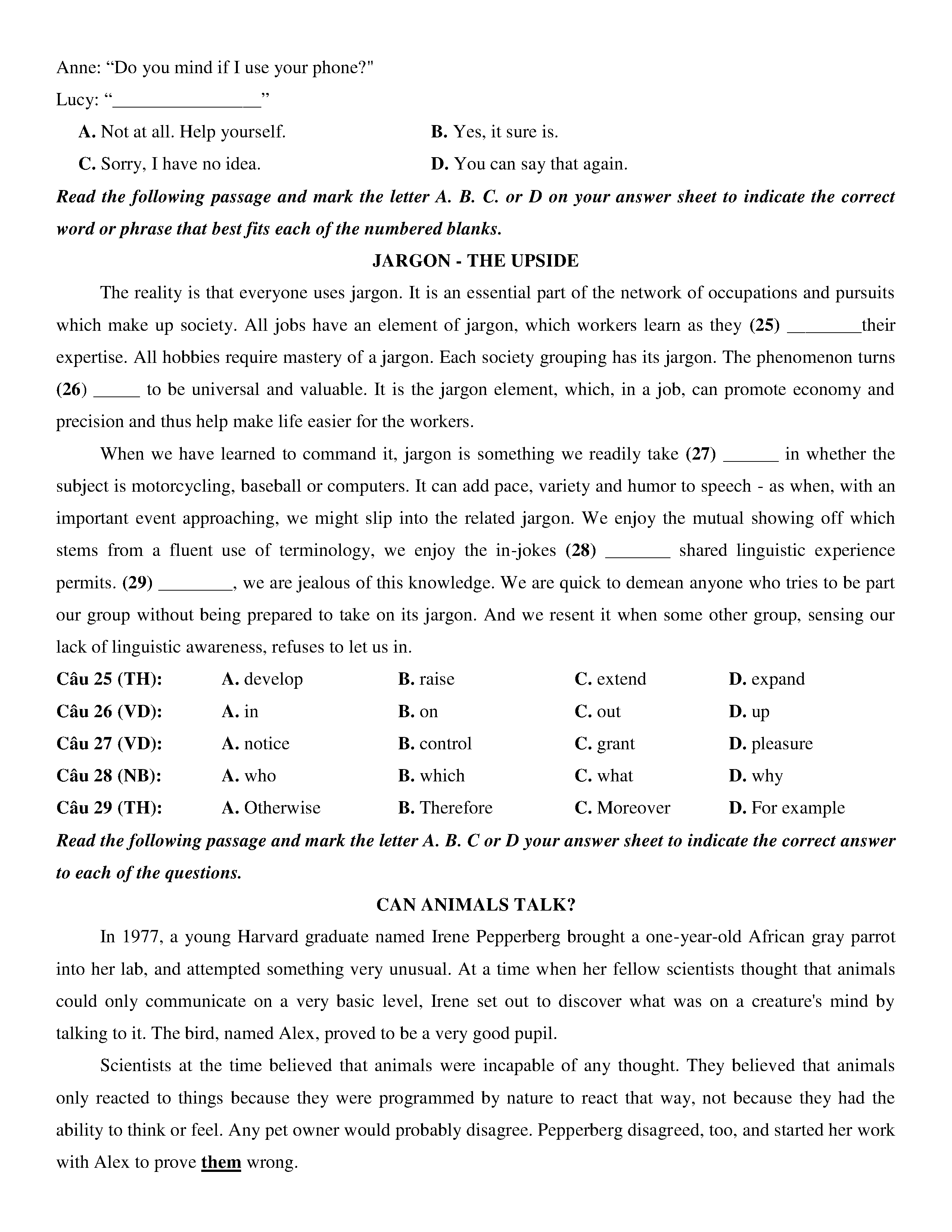 Đề KSCL lớp 12 môn Tiếng Anh năm 2020 Trường THPT Chuyên Quốc học Huế