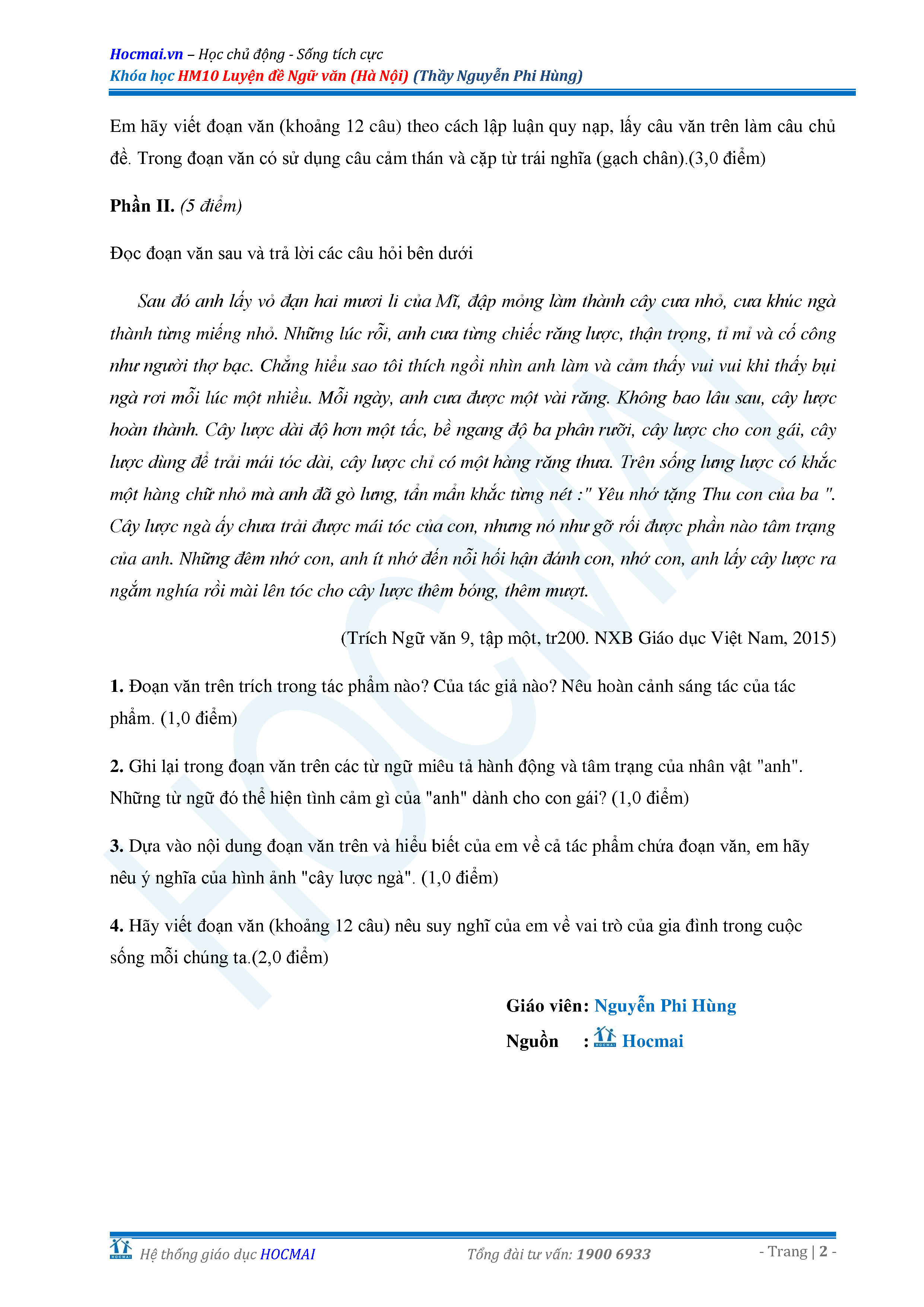 ĐỀ ÔN LUYỆN MÔN NGỮ VĂN VÀO 10 HÀ NỘI - ĐỀ SỐ 1
