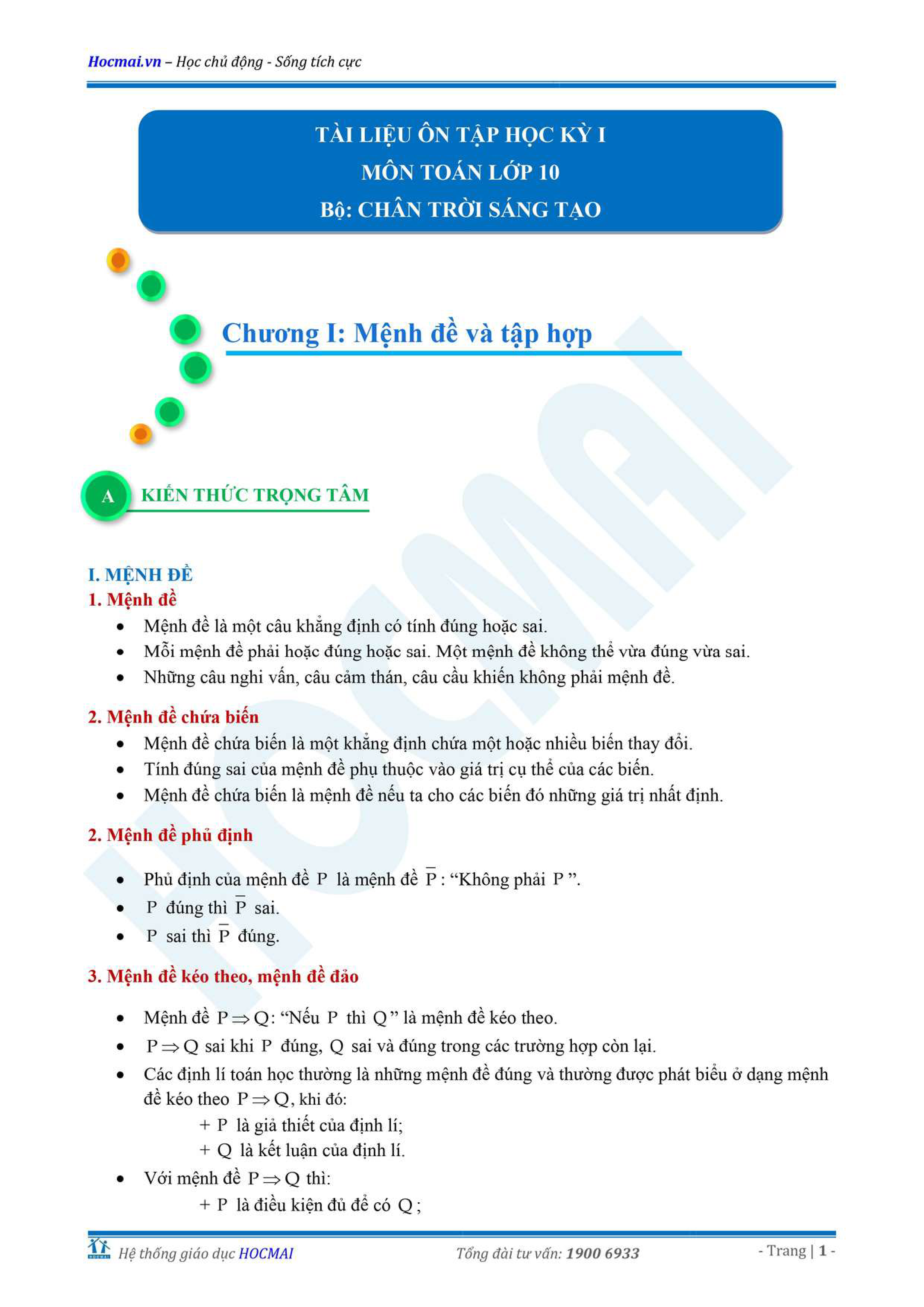 Tài liệu ôn thi Học kì I - Toán 10 CTST