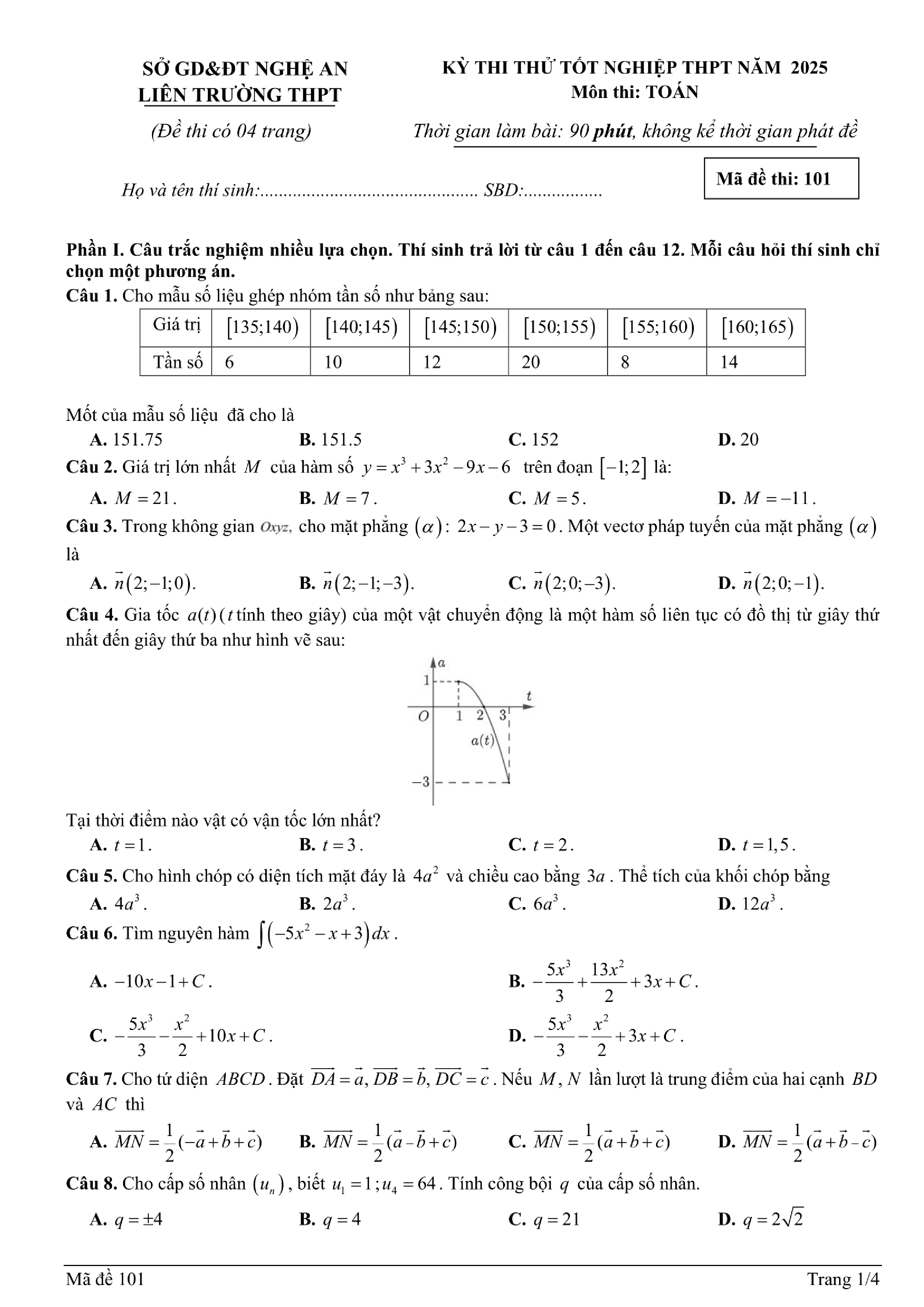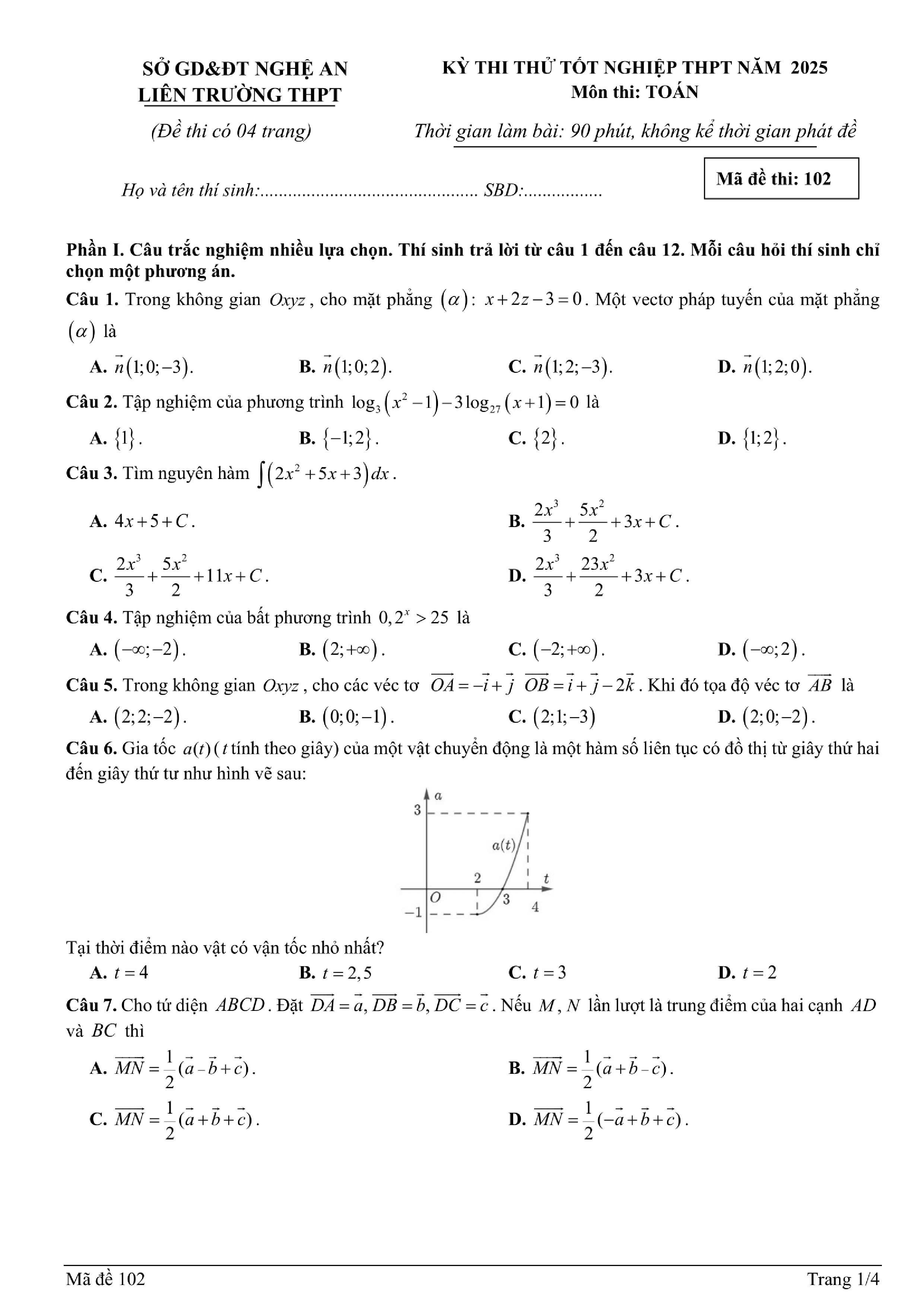 Đề thi thử tốt nghiệp THPT 2025 Môn Toán - liên trường Nghệ An