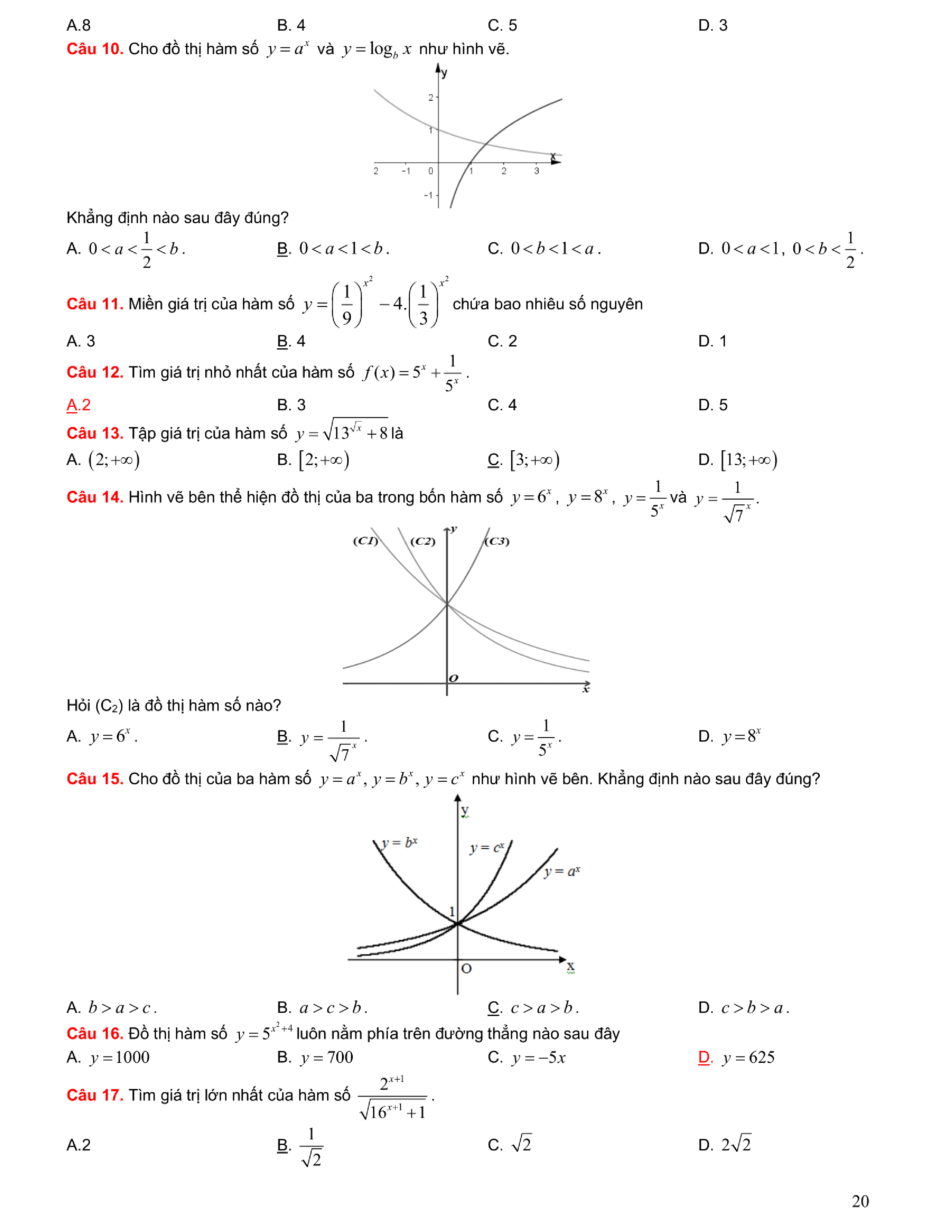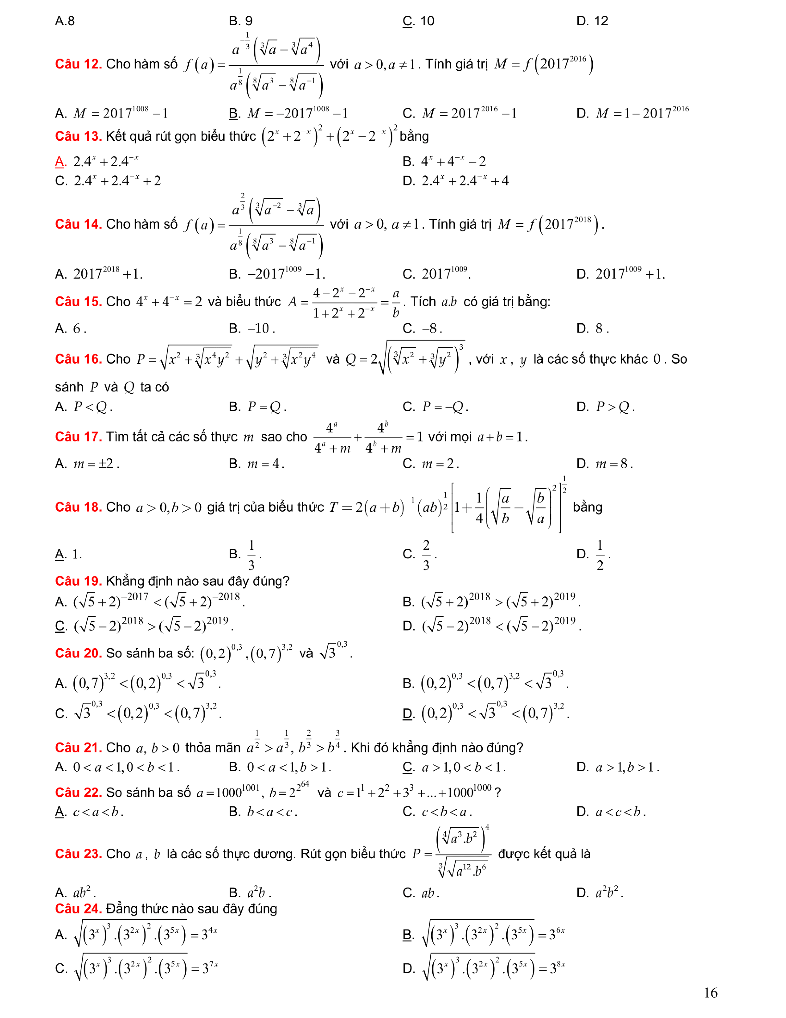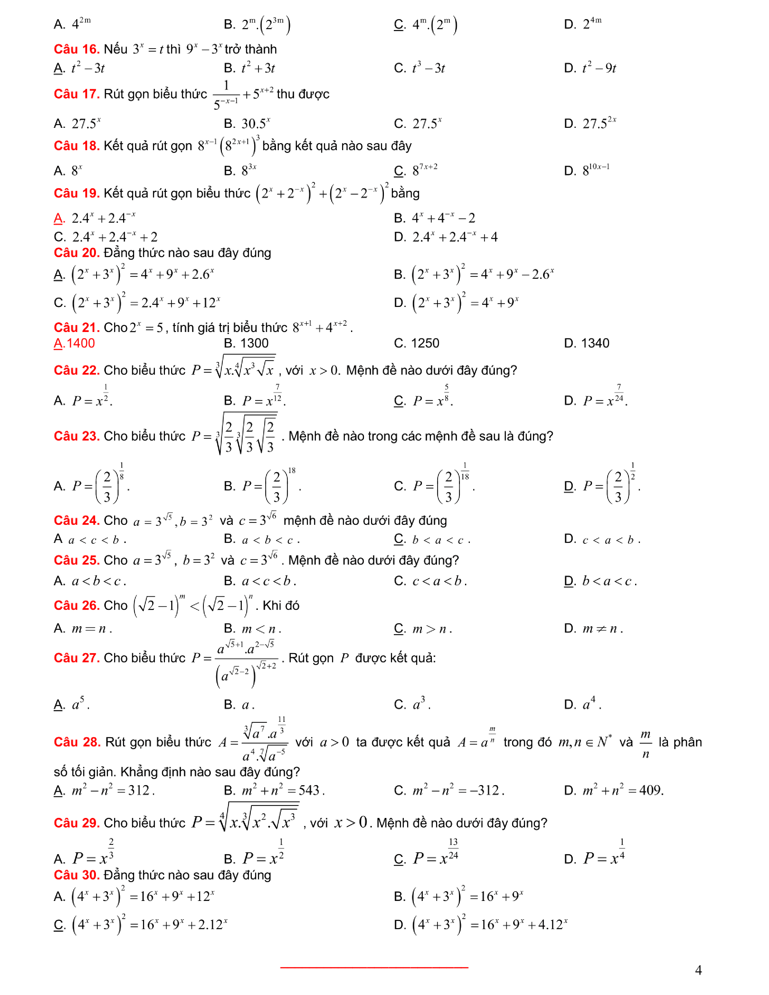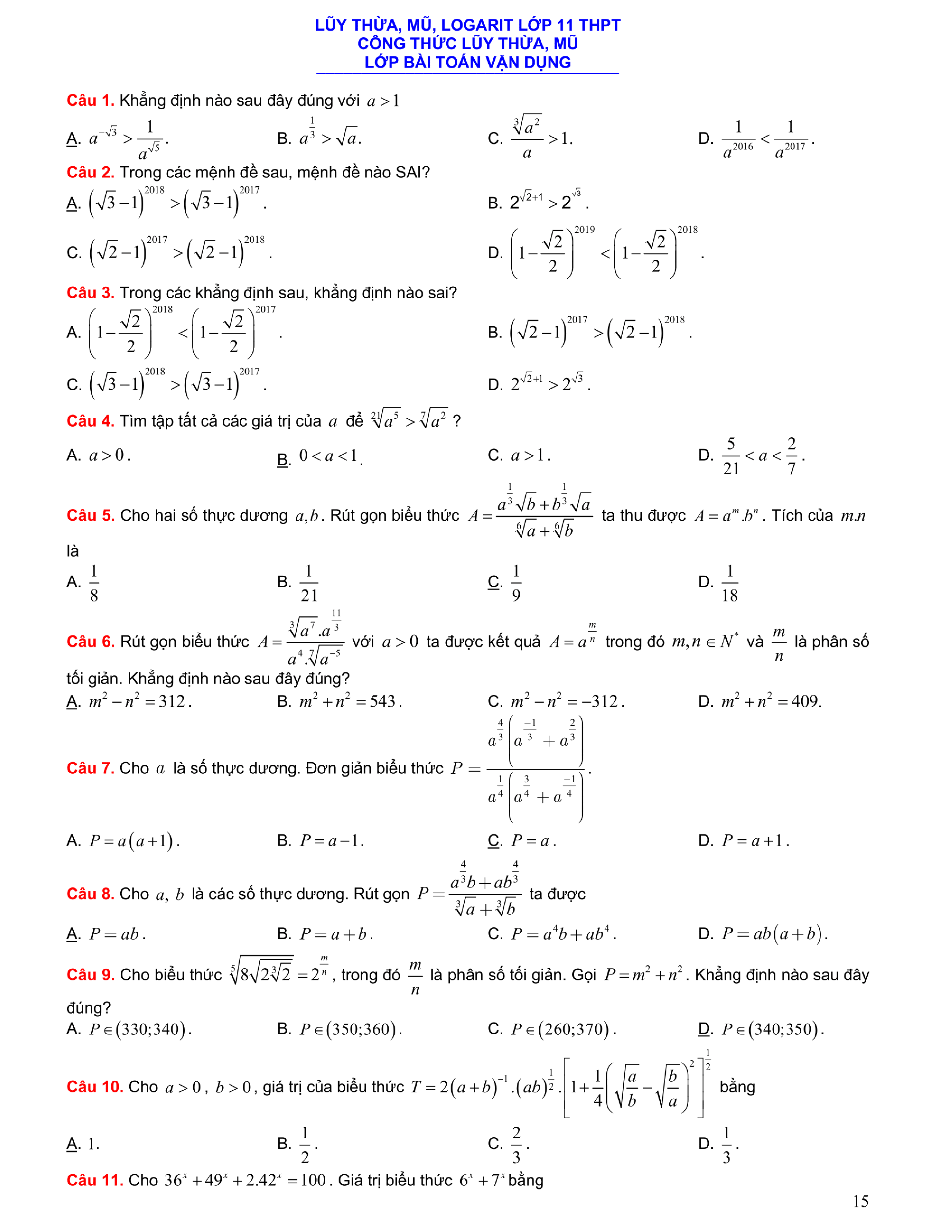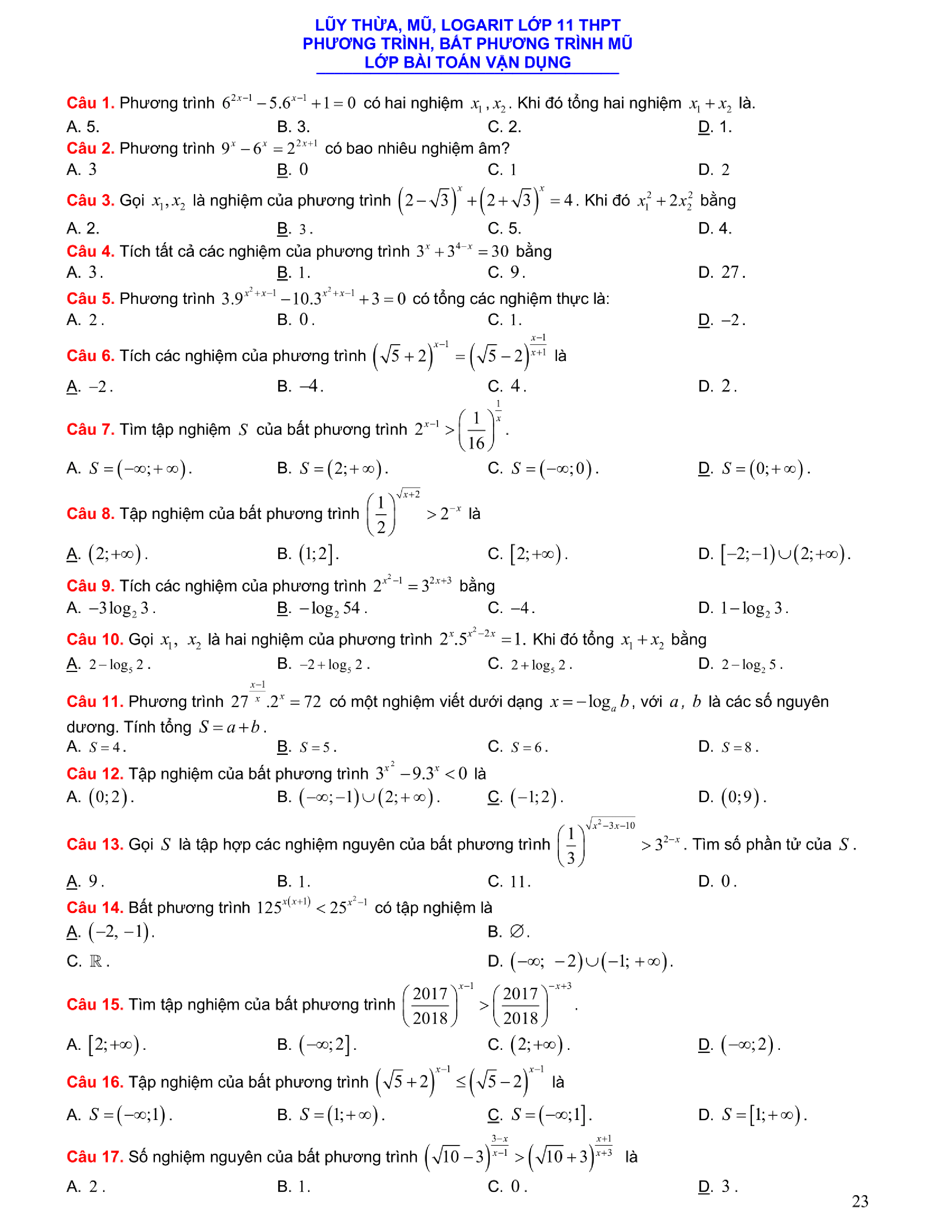 Tuyển chọn bài tập Lũy thừa, Mũ, Logarit