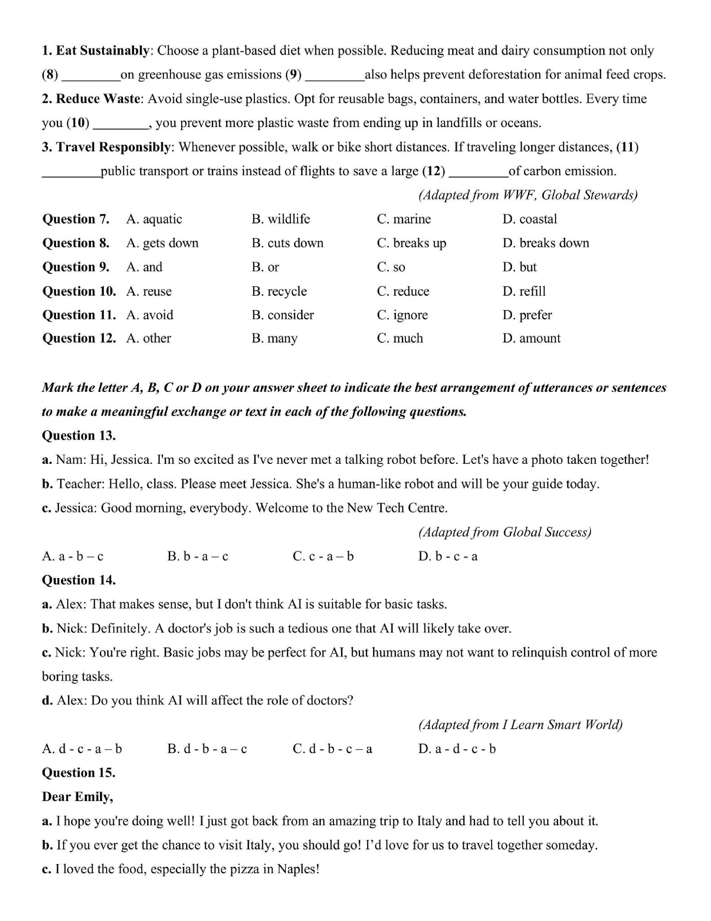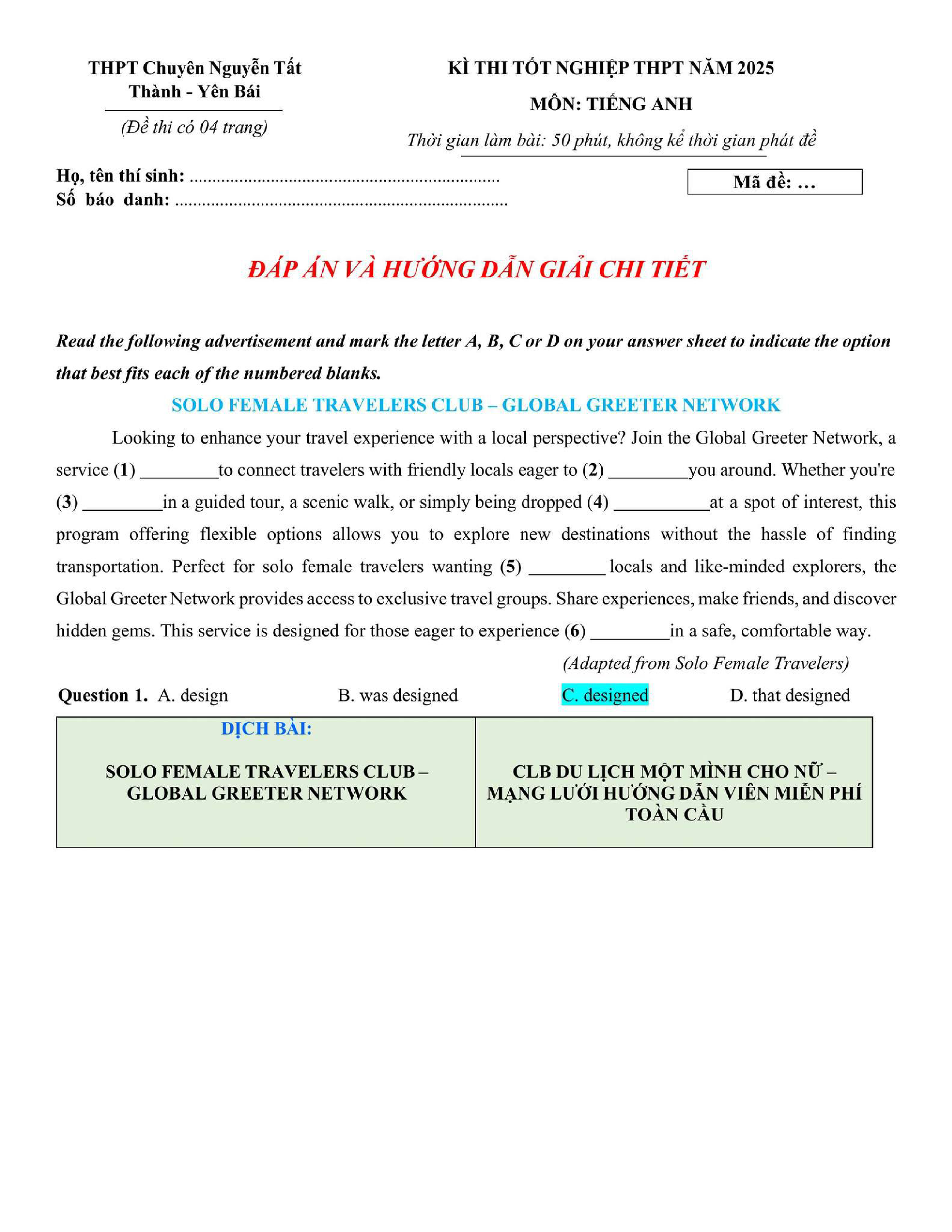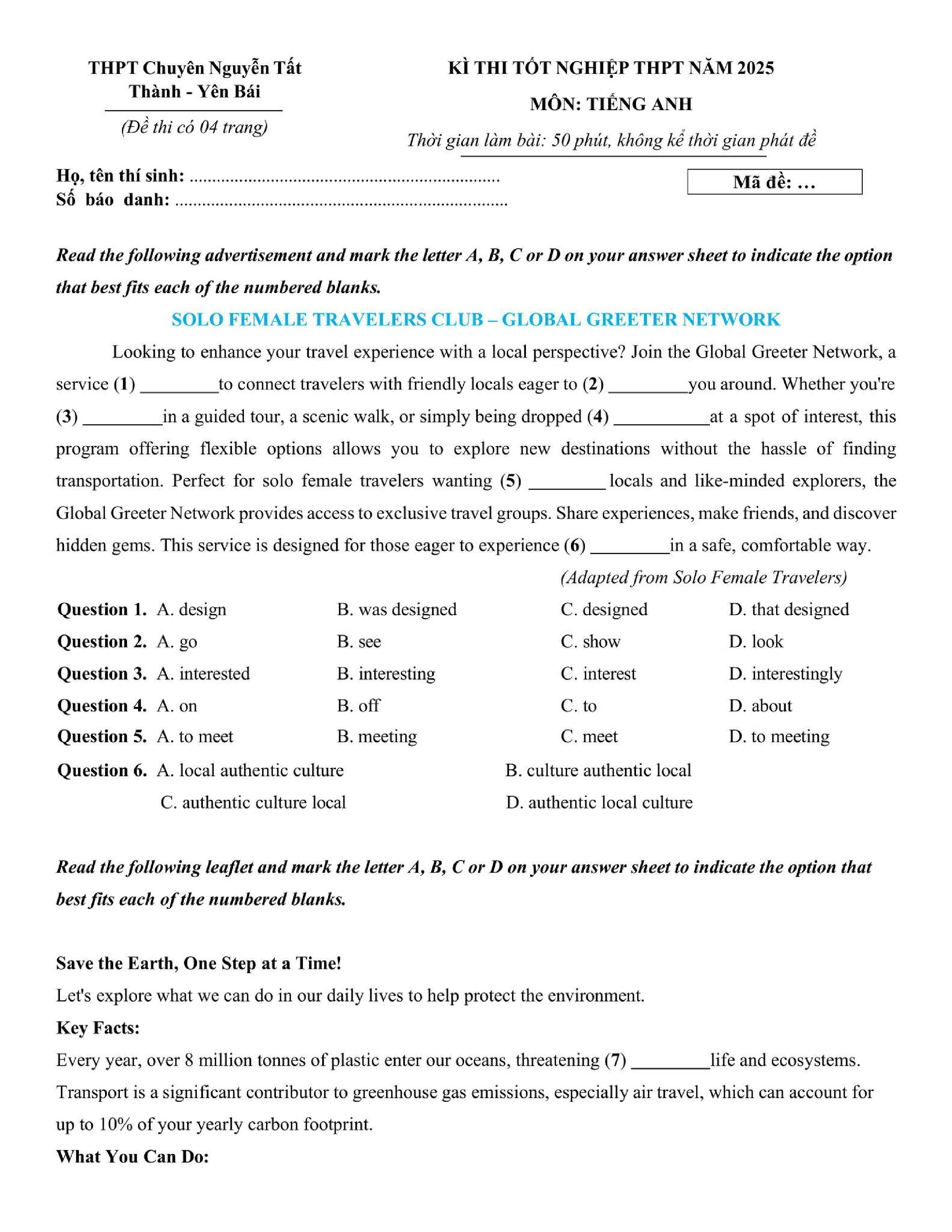 Đề thi thử TN THPT 2025 môn Tiếng Anh trường THPT Chuyên Nguyễn Tất Thành -Yên Bái