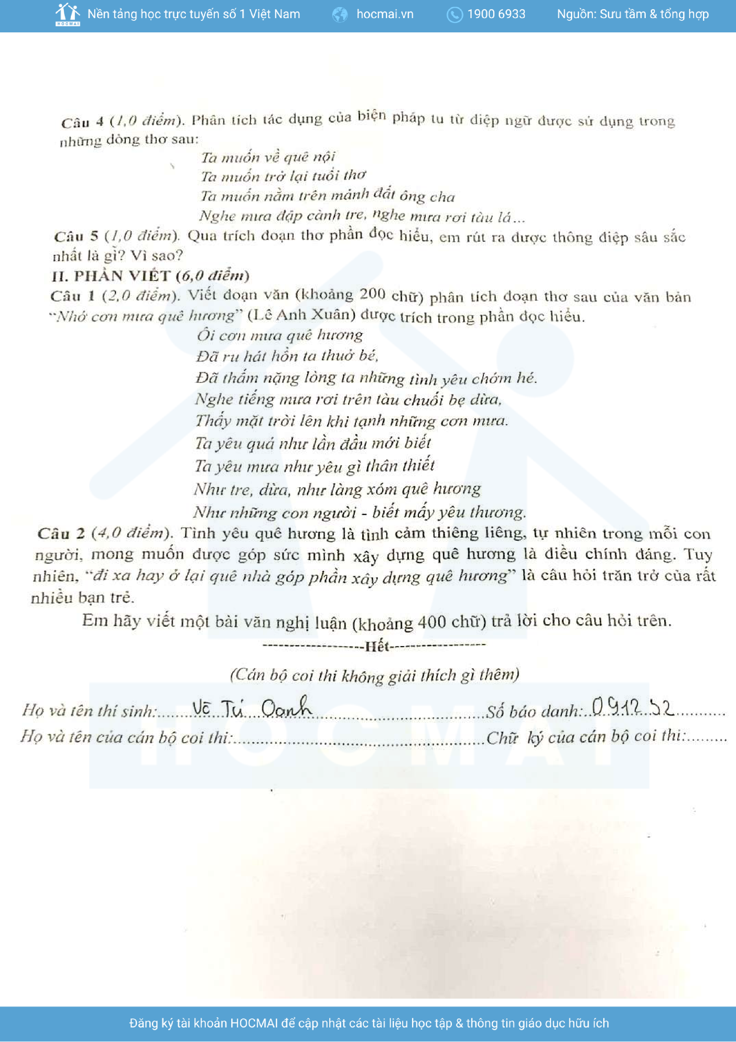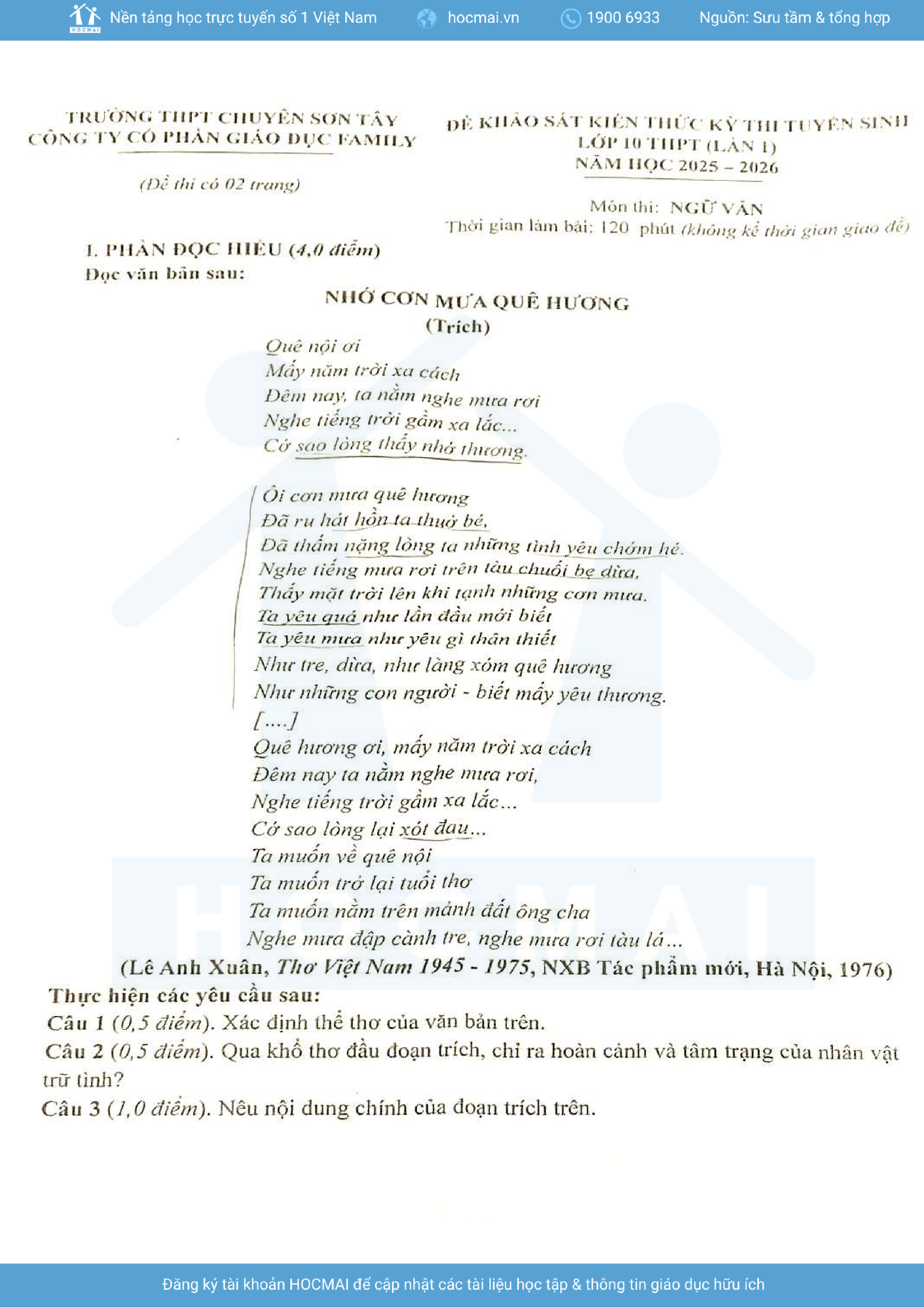 Đề khảo sát kiến thức thi vào lớp 10 môn Ngữ Văn Trường THPT Chuyên Sơn Tây