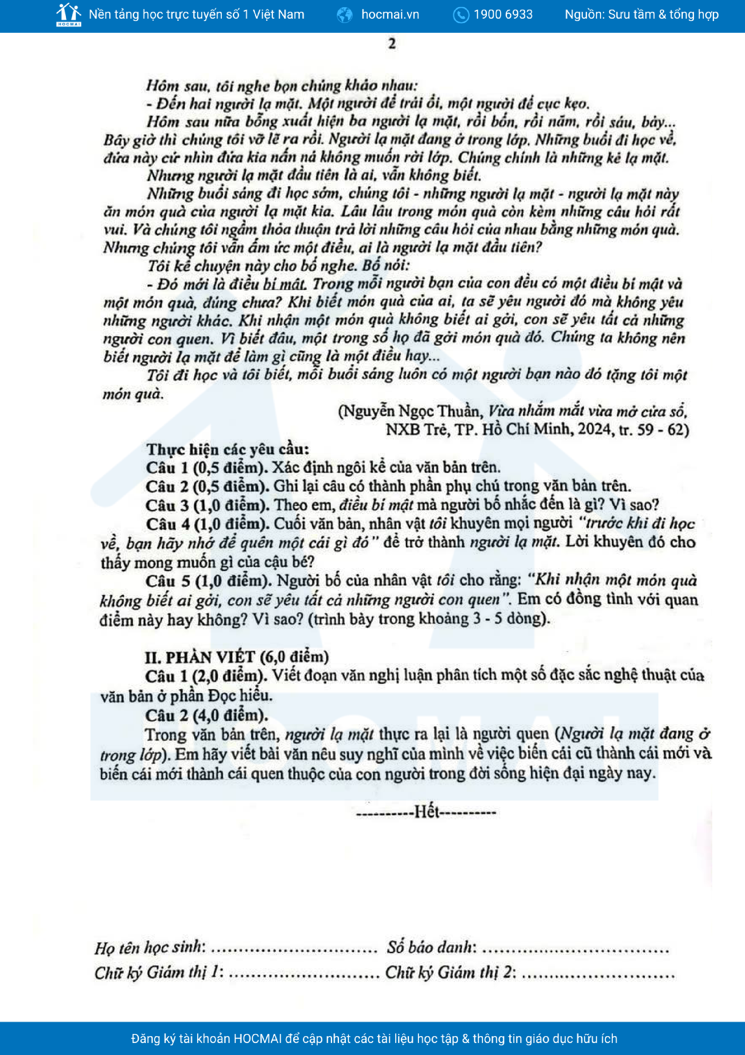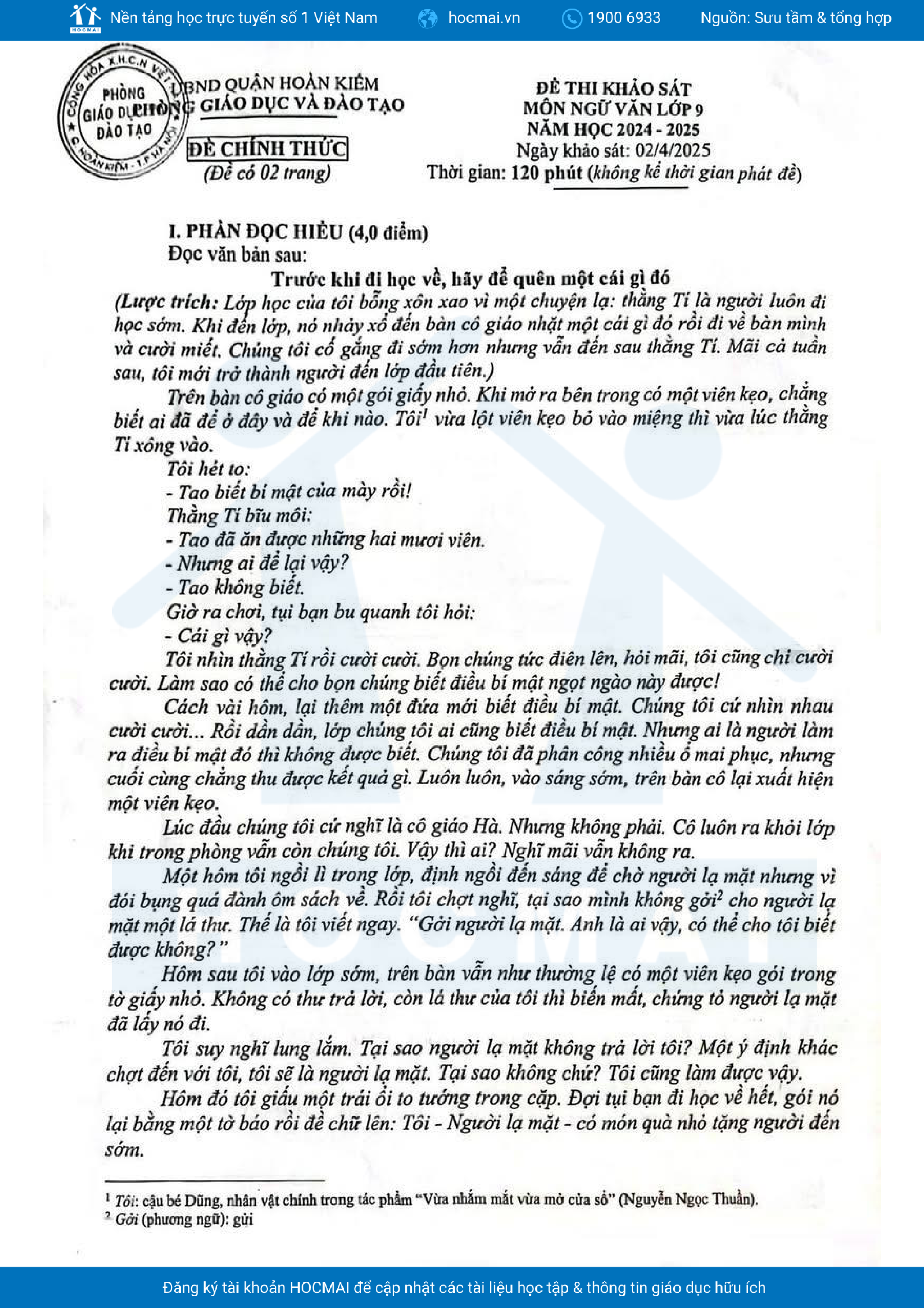 Đề khảo sát Ngữ văn 9 năm 2024 – 2025 phòng GD&ĐT Hoàn Kiếm – Hà Nội