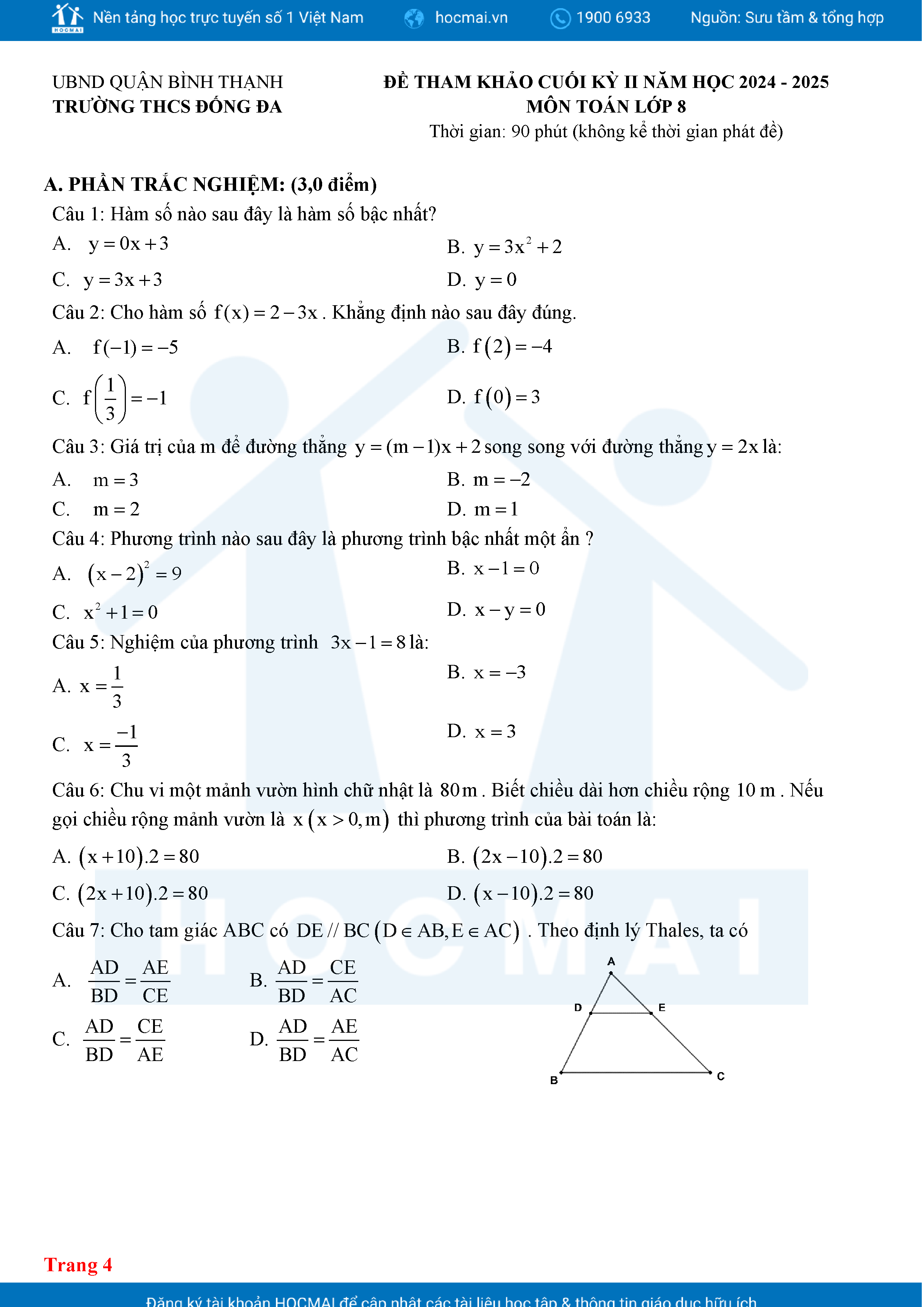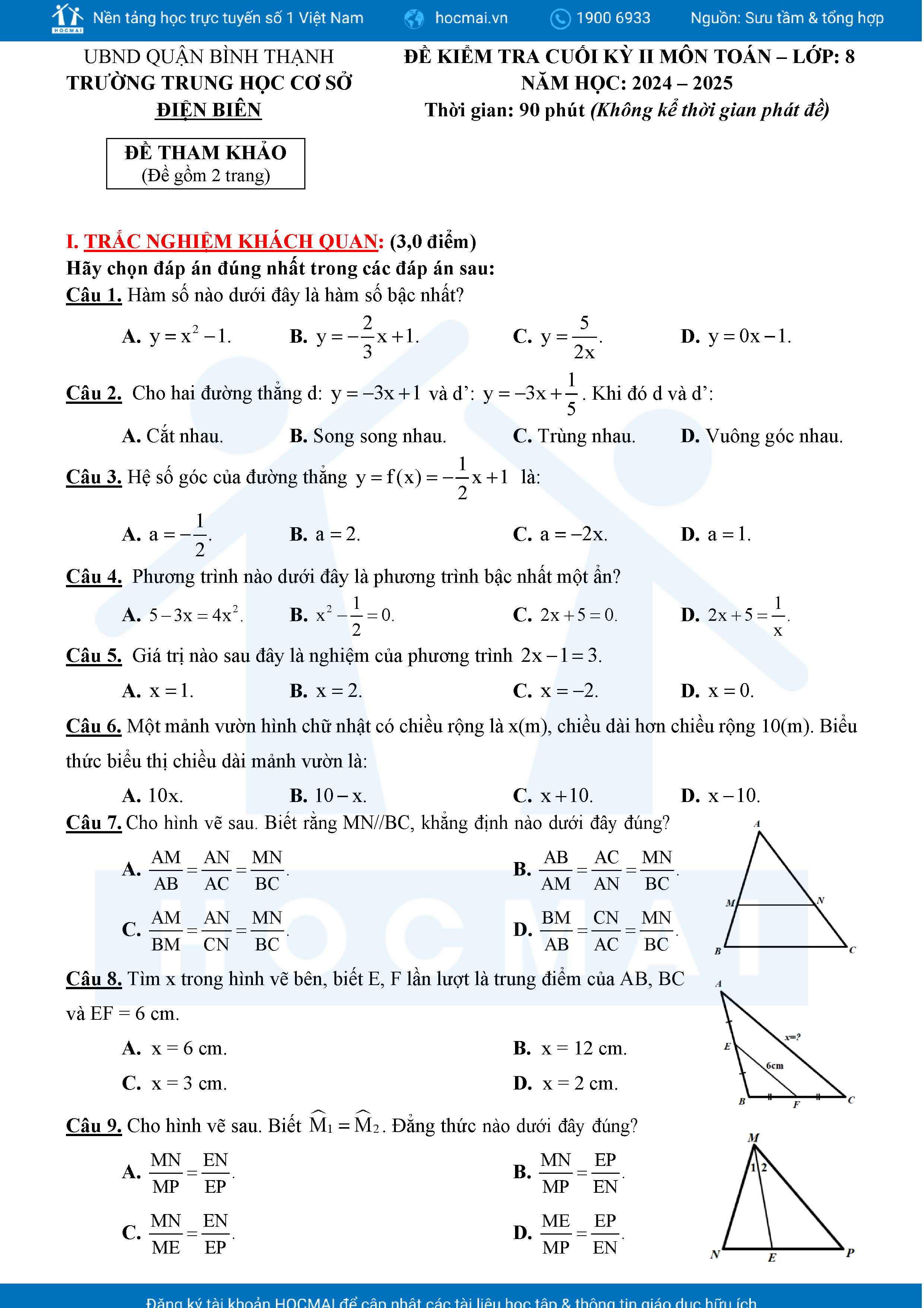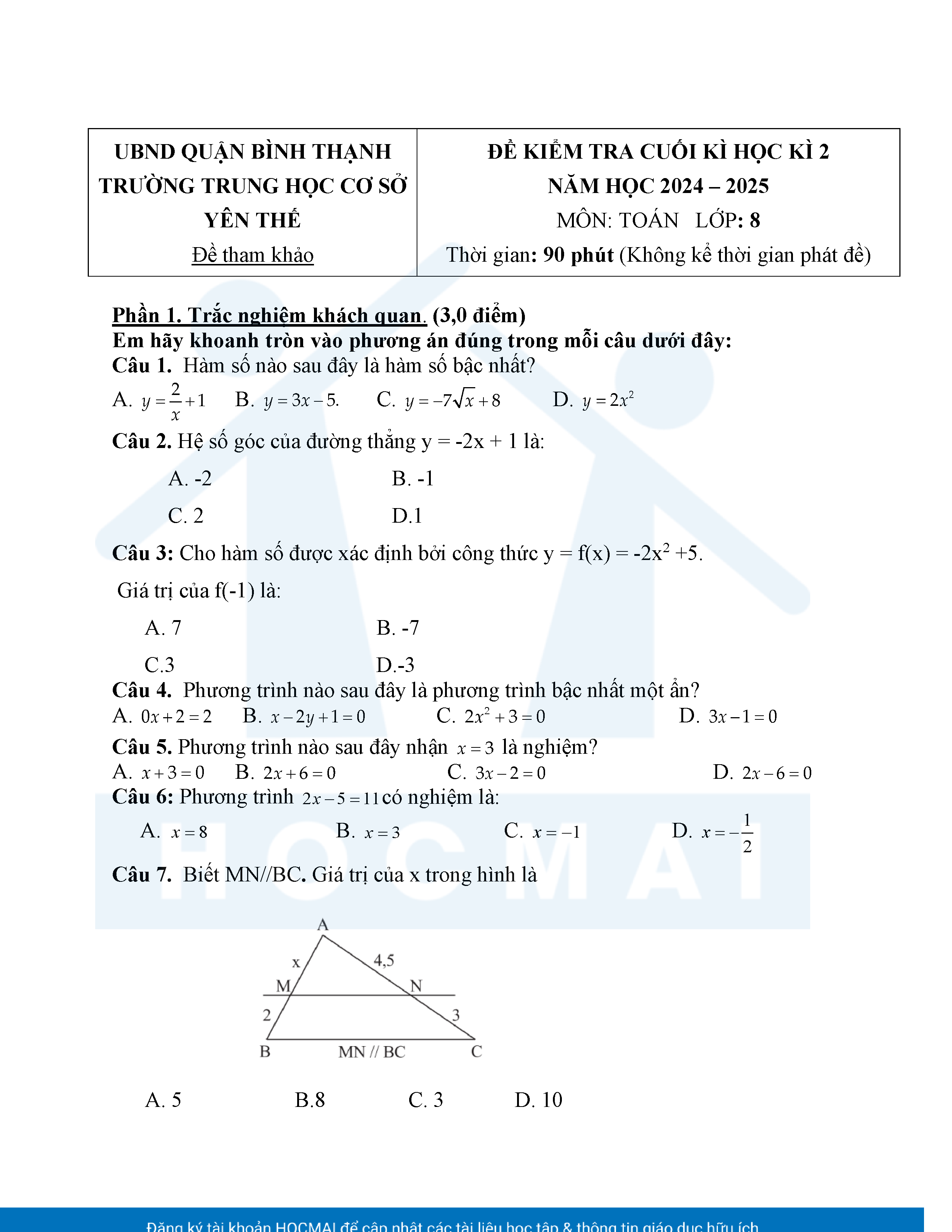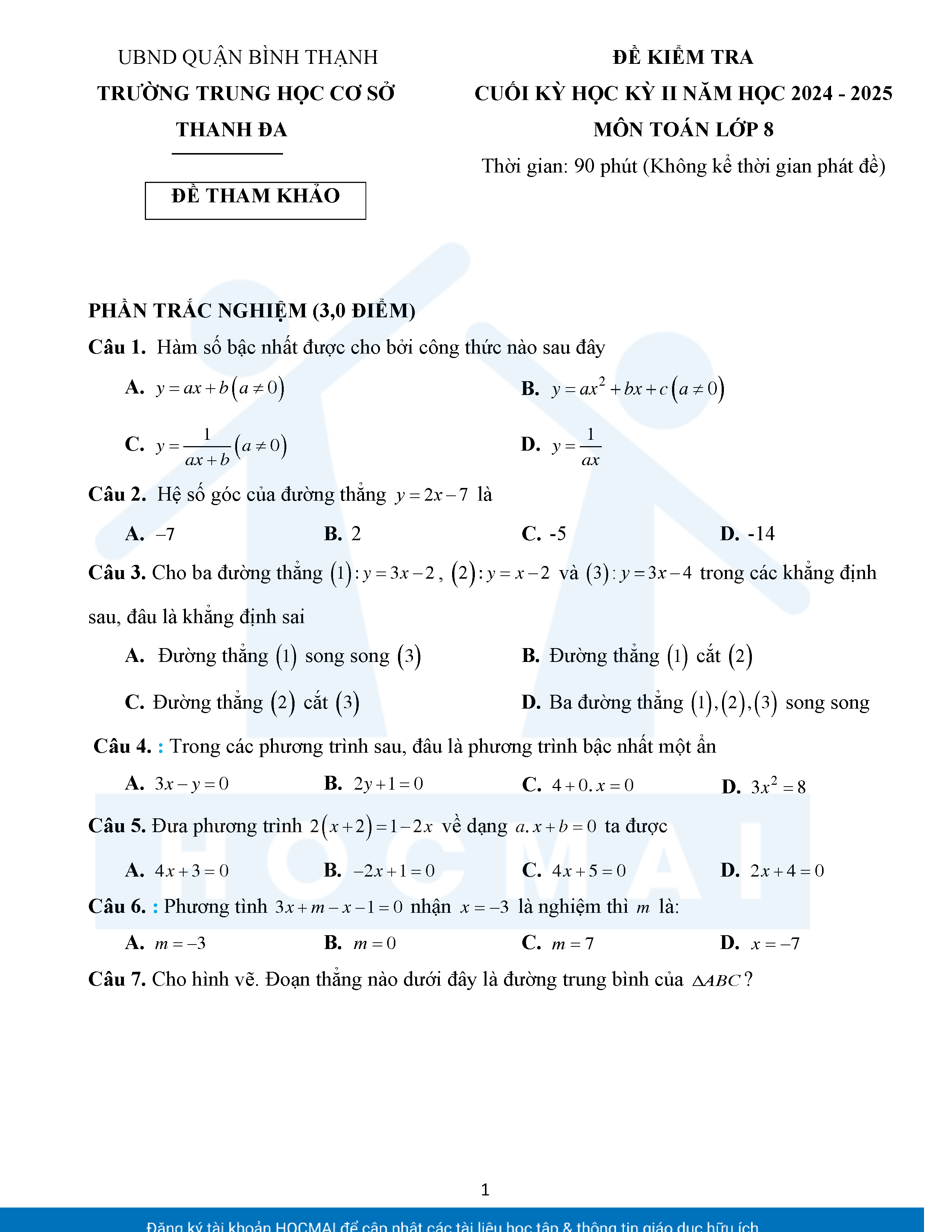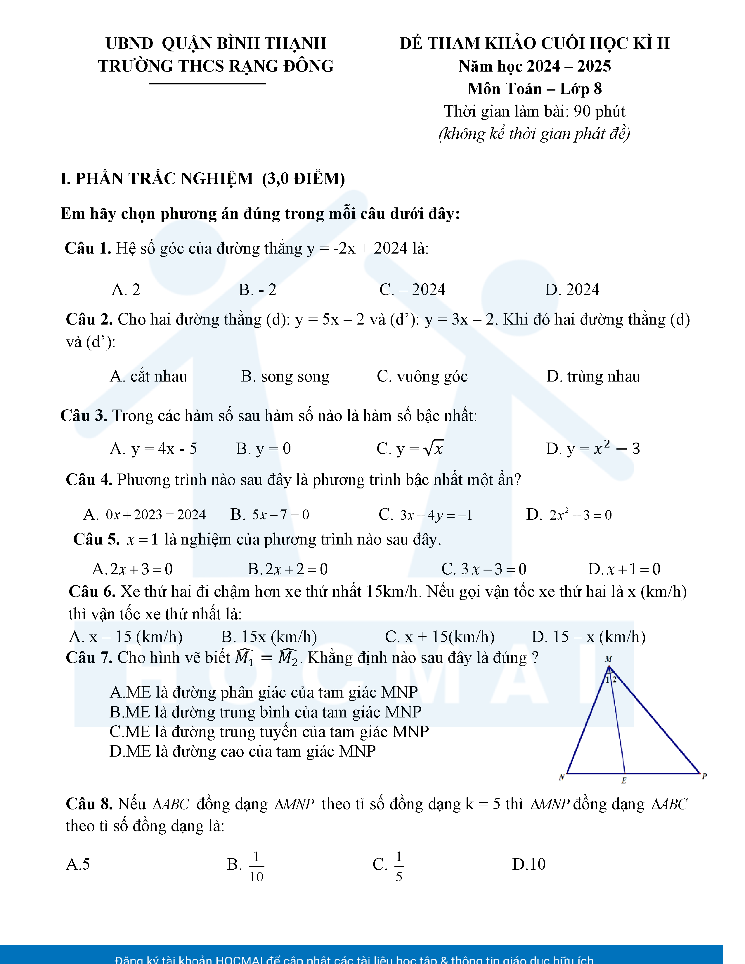 Đề tham khảo kiểm tra cuối học kì 2 môn Toán 8 năm học 2024 – 2025 phòng Giáo dục và Đào tạo UBND quận Bình Thạnh, thành phố Hồ Chí Minh