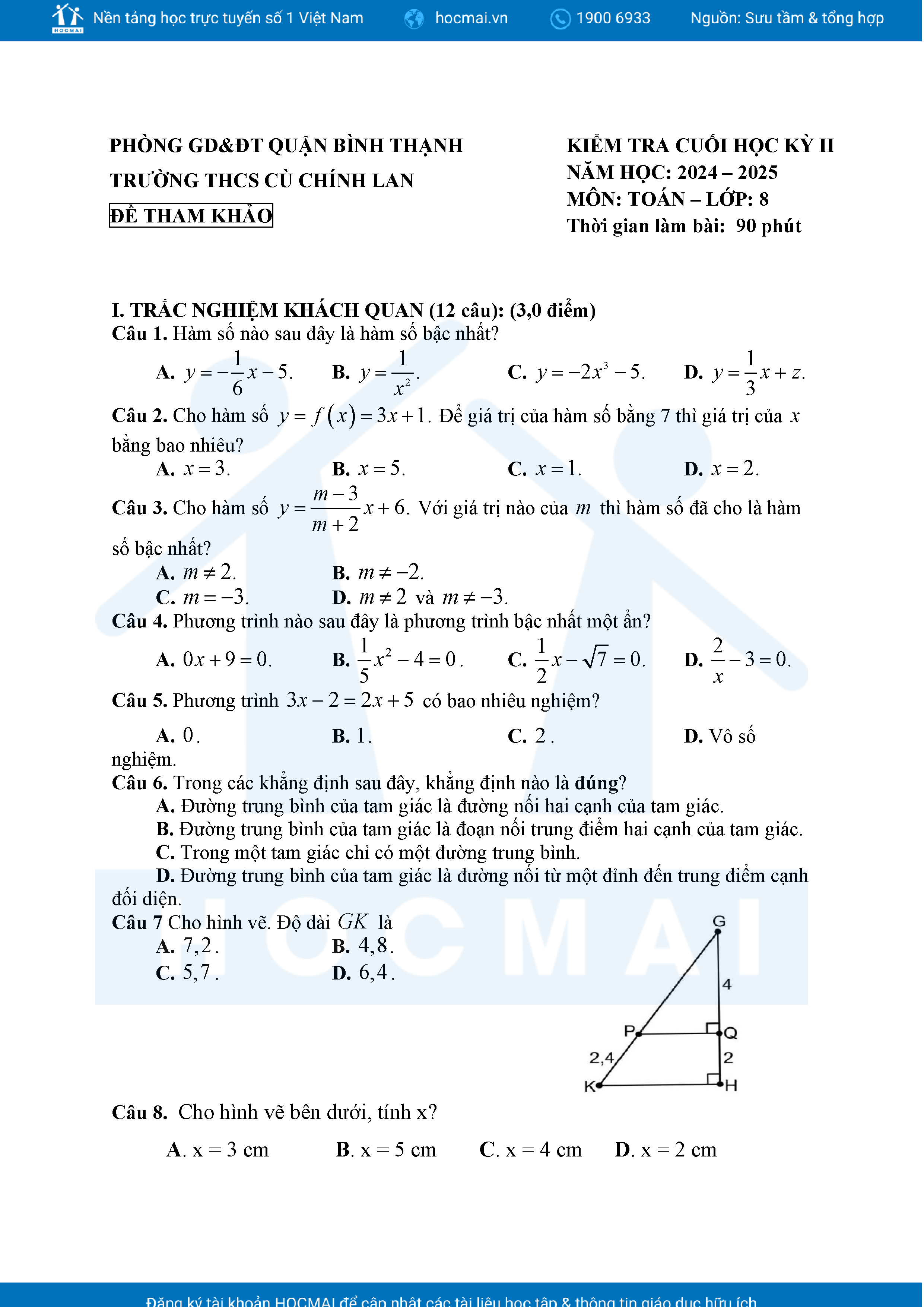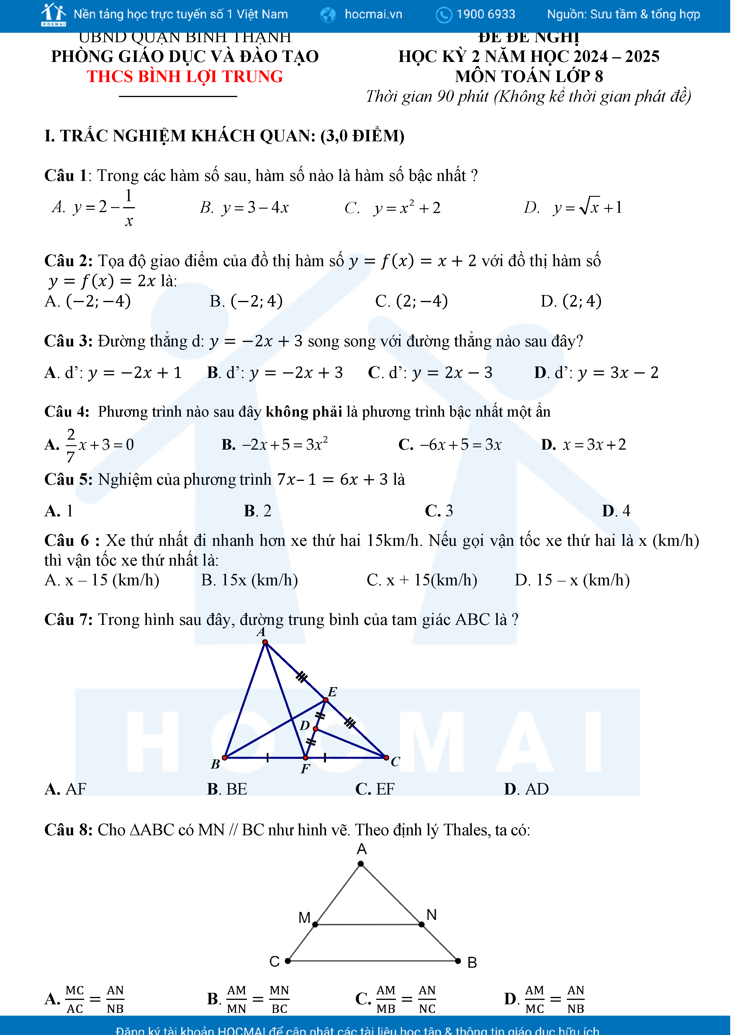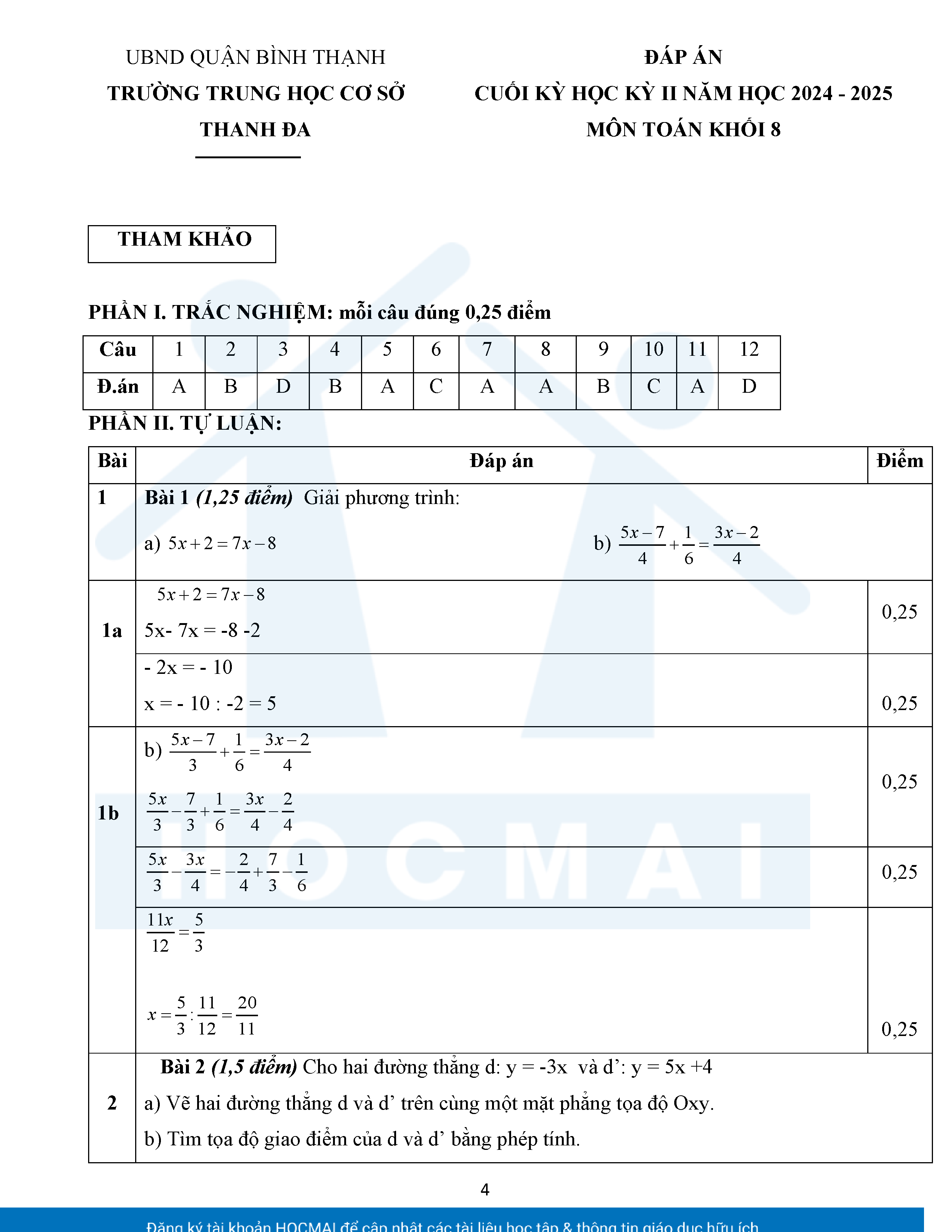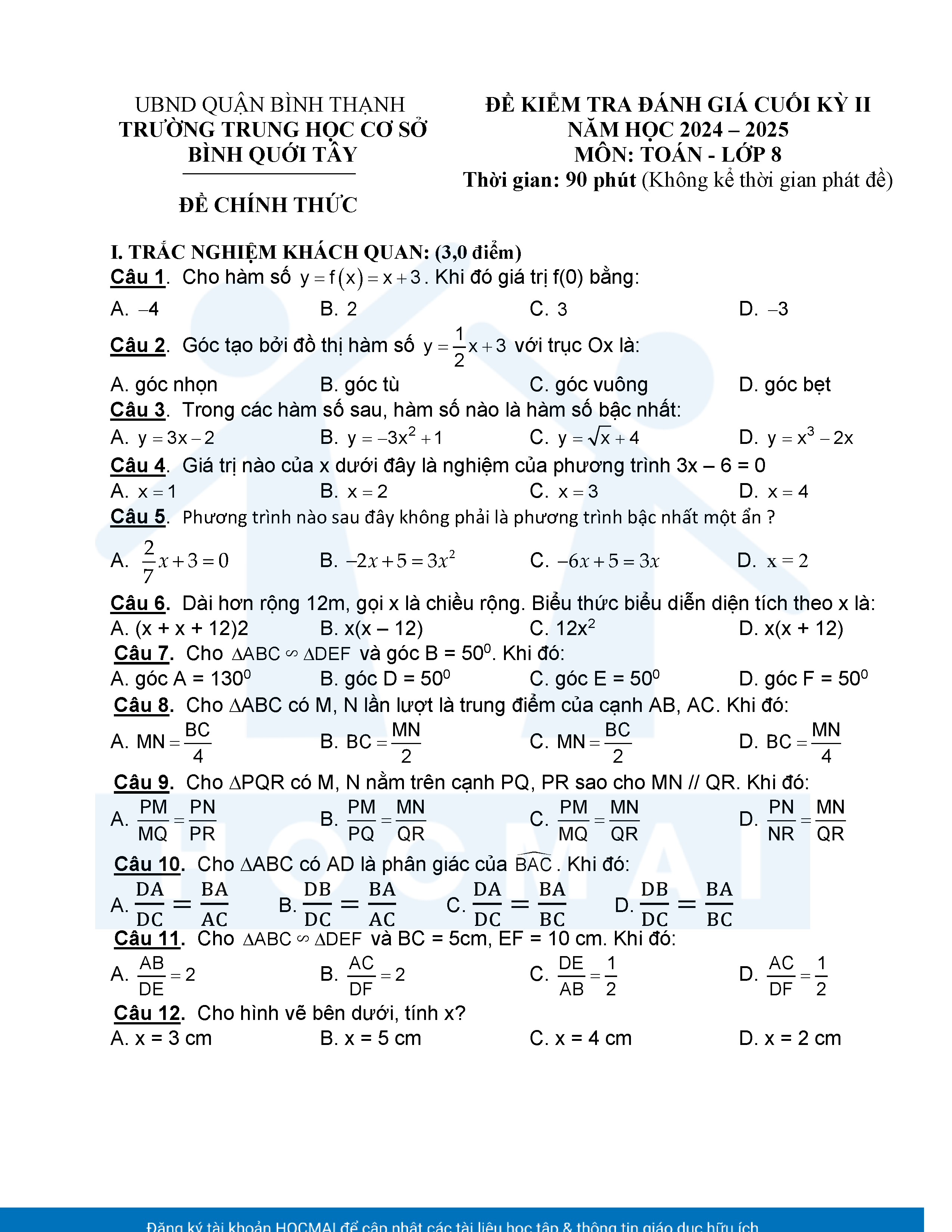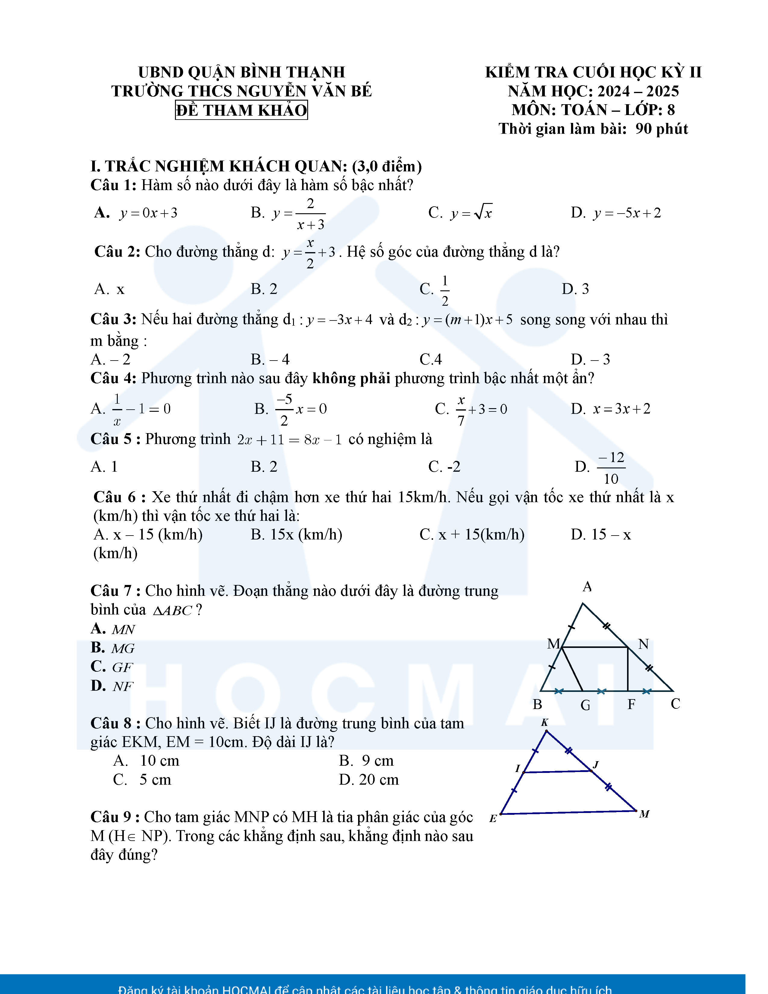 Đề tham khảo kiểm tra cuối học kì 2 môn Toán 8 năm học 2024 – 2025 phòng Giáo dục và Đào tạo UBND quận Bình Thạnh, thành phố Hồ Chí Minh