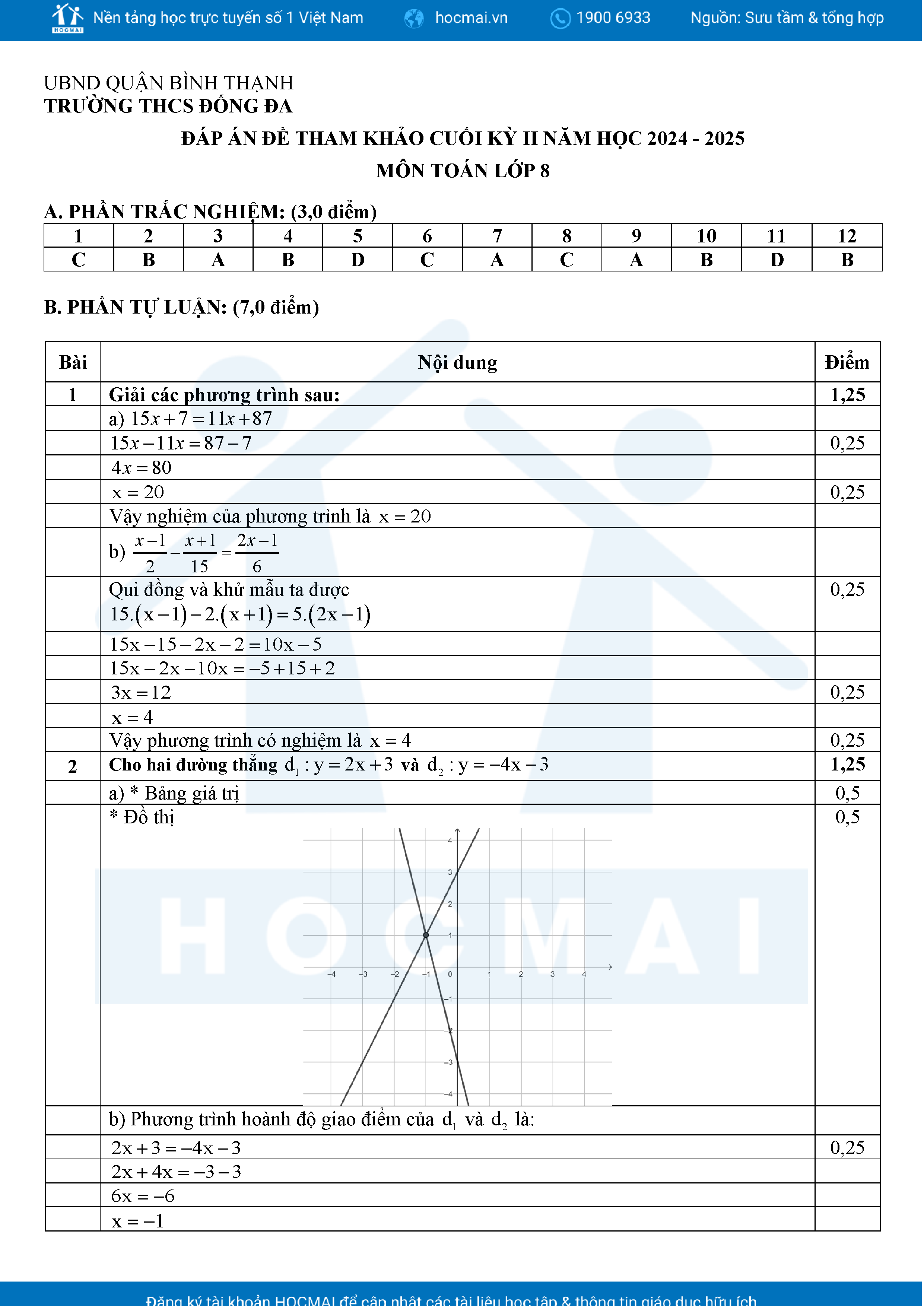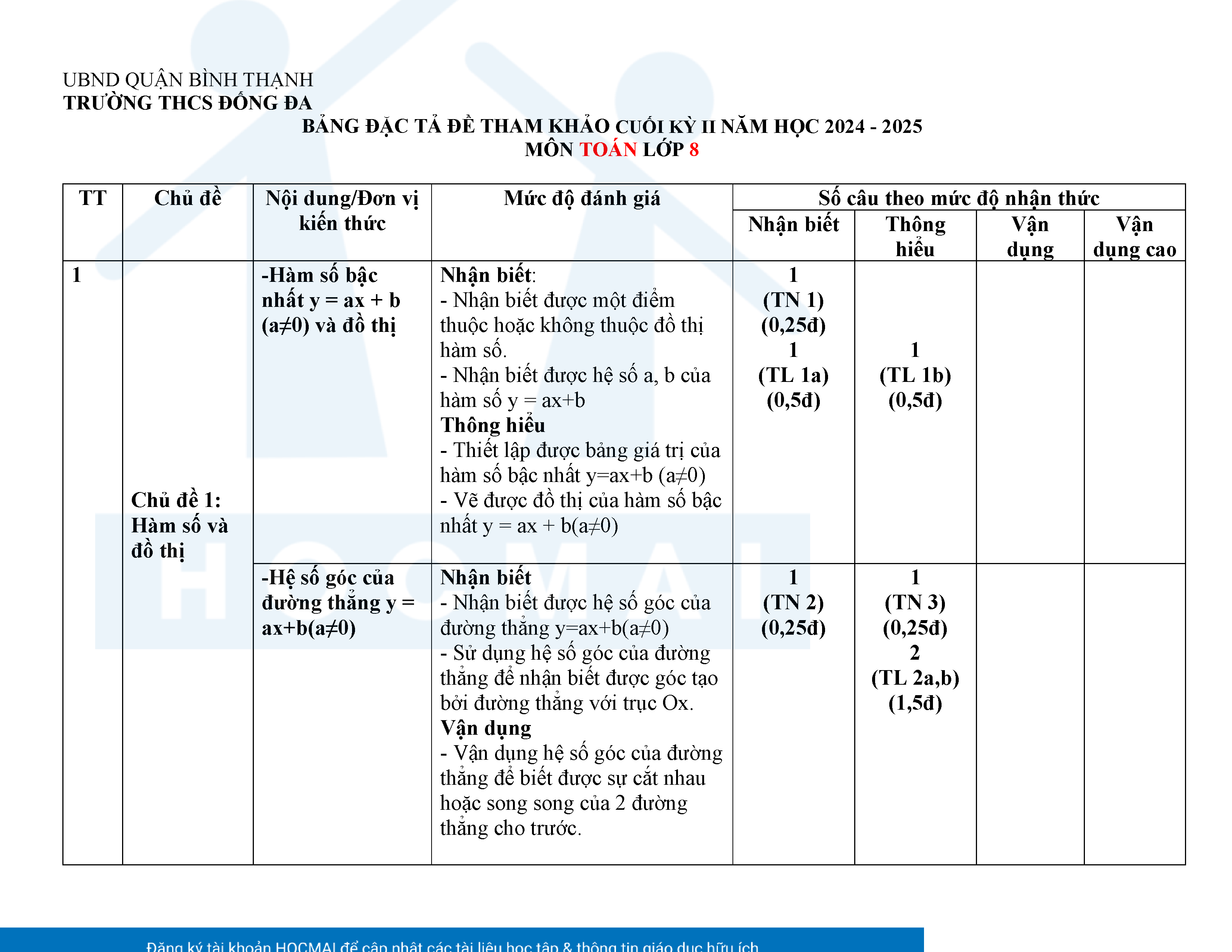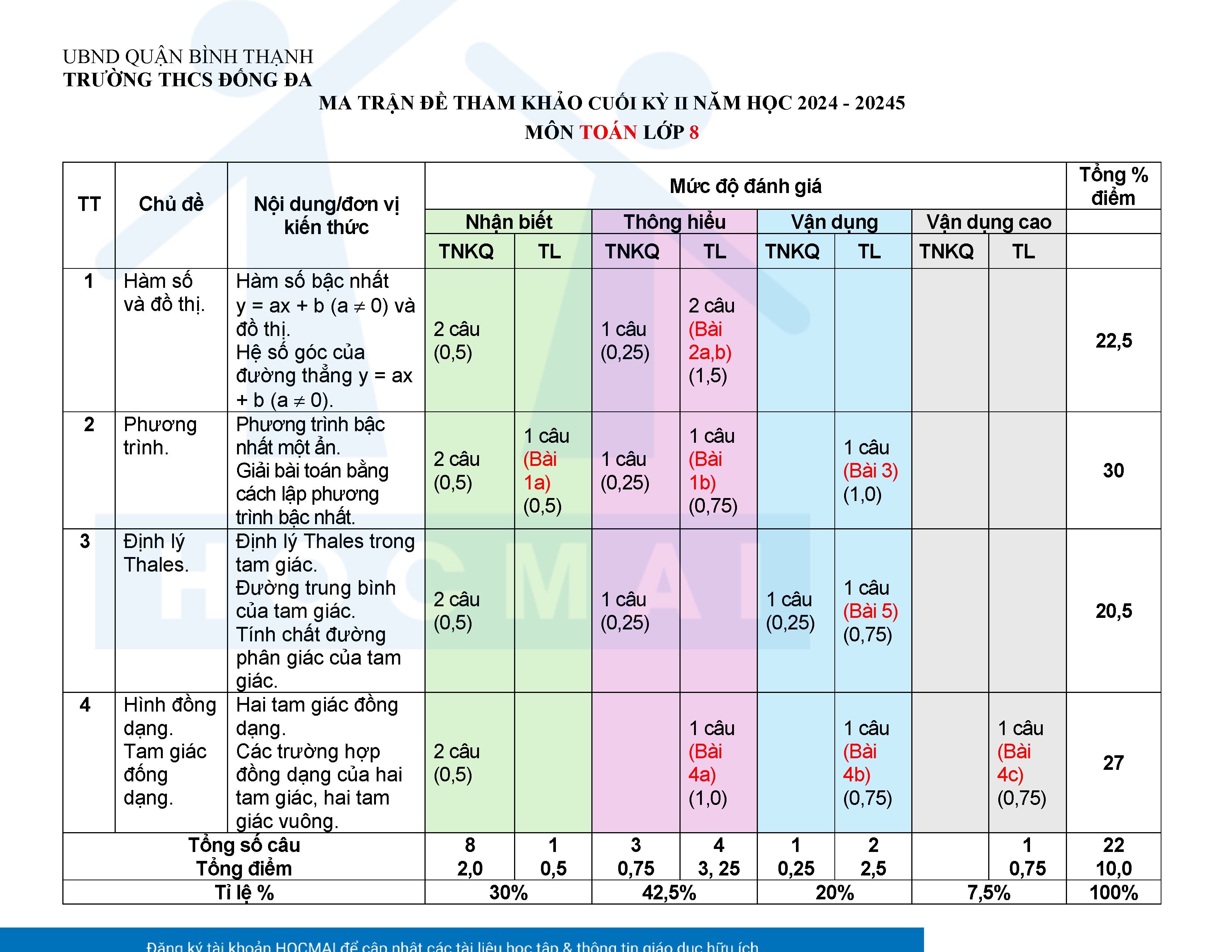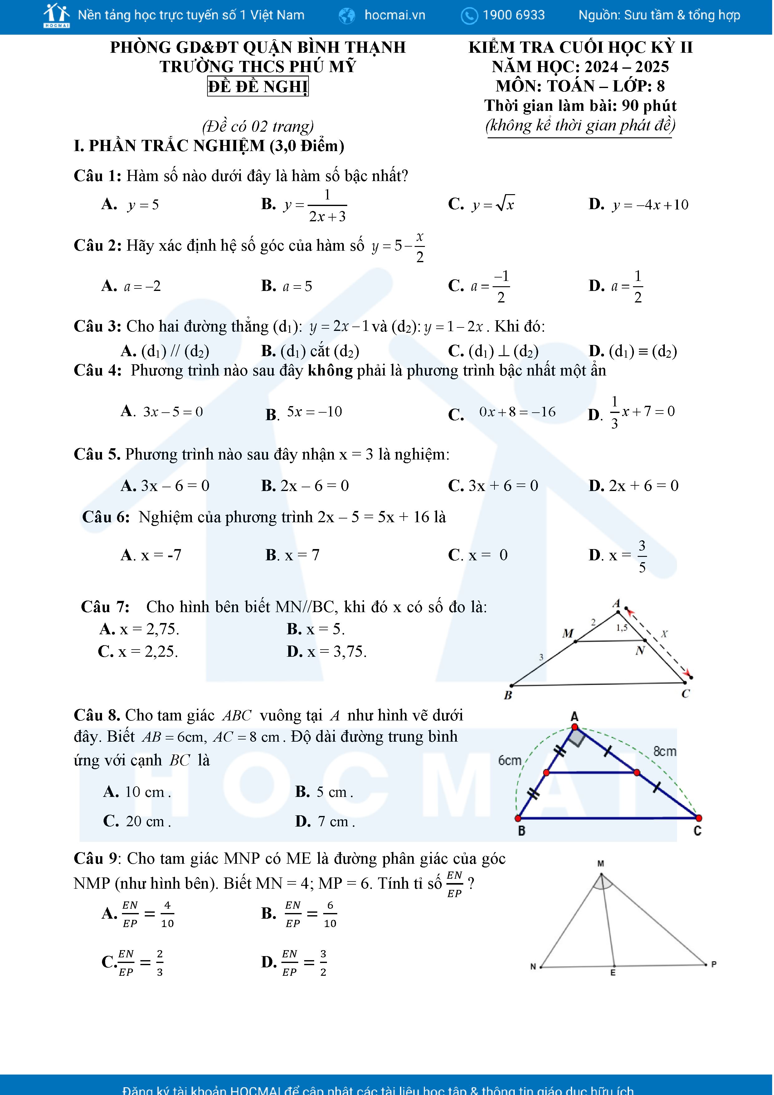 Đề tham khảo kiểm tra cuối học kì 2 môn Toán 8 năm học 2024 – 2025 phòng Giáo dục và Đào tạo UBND quận Bình Thạnh, thành phố Hồ Chí Minh