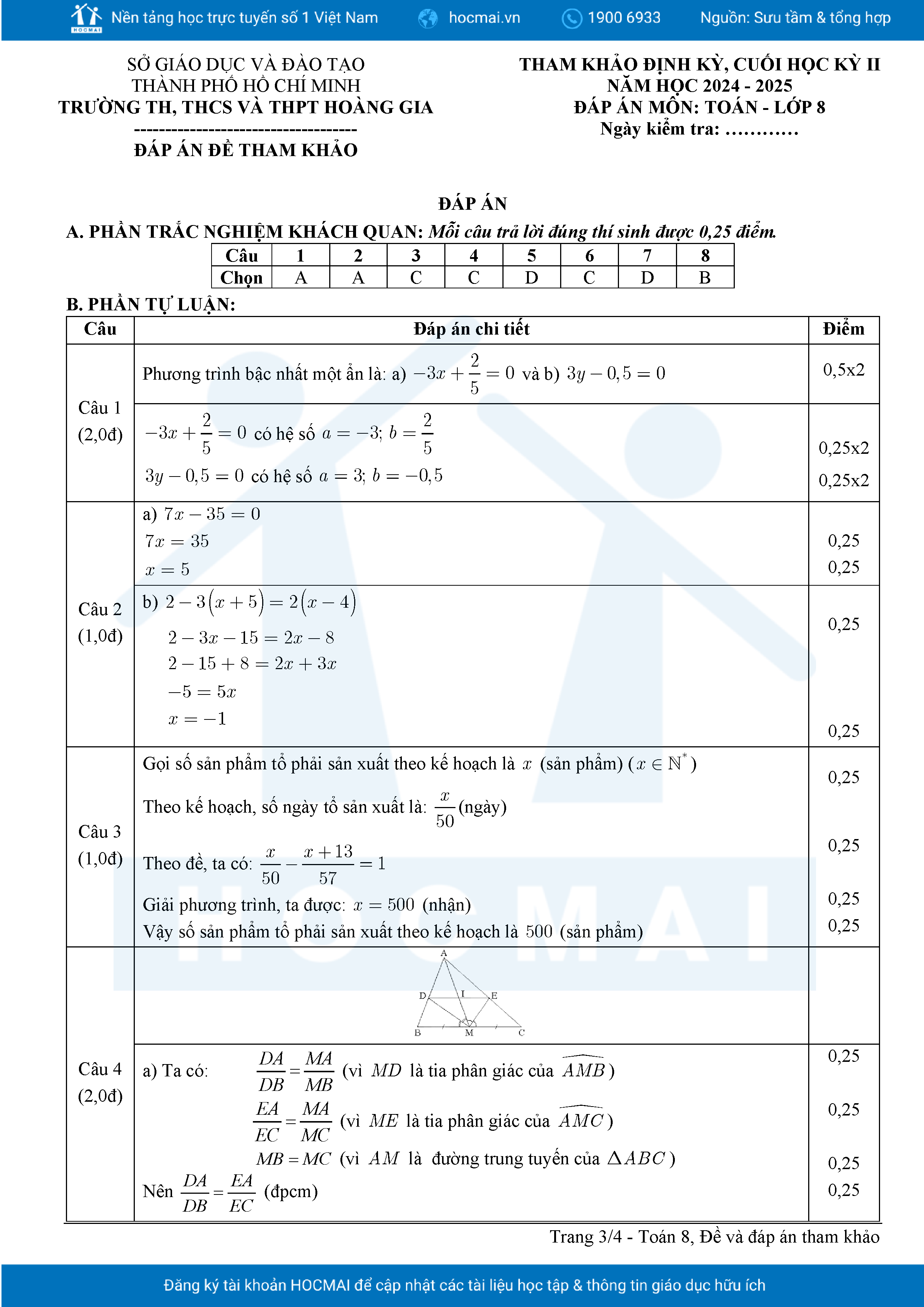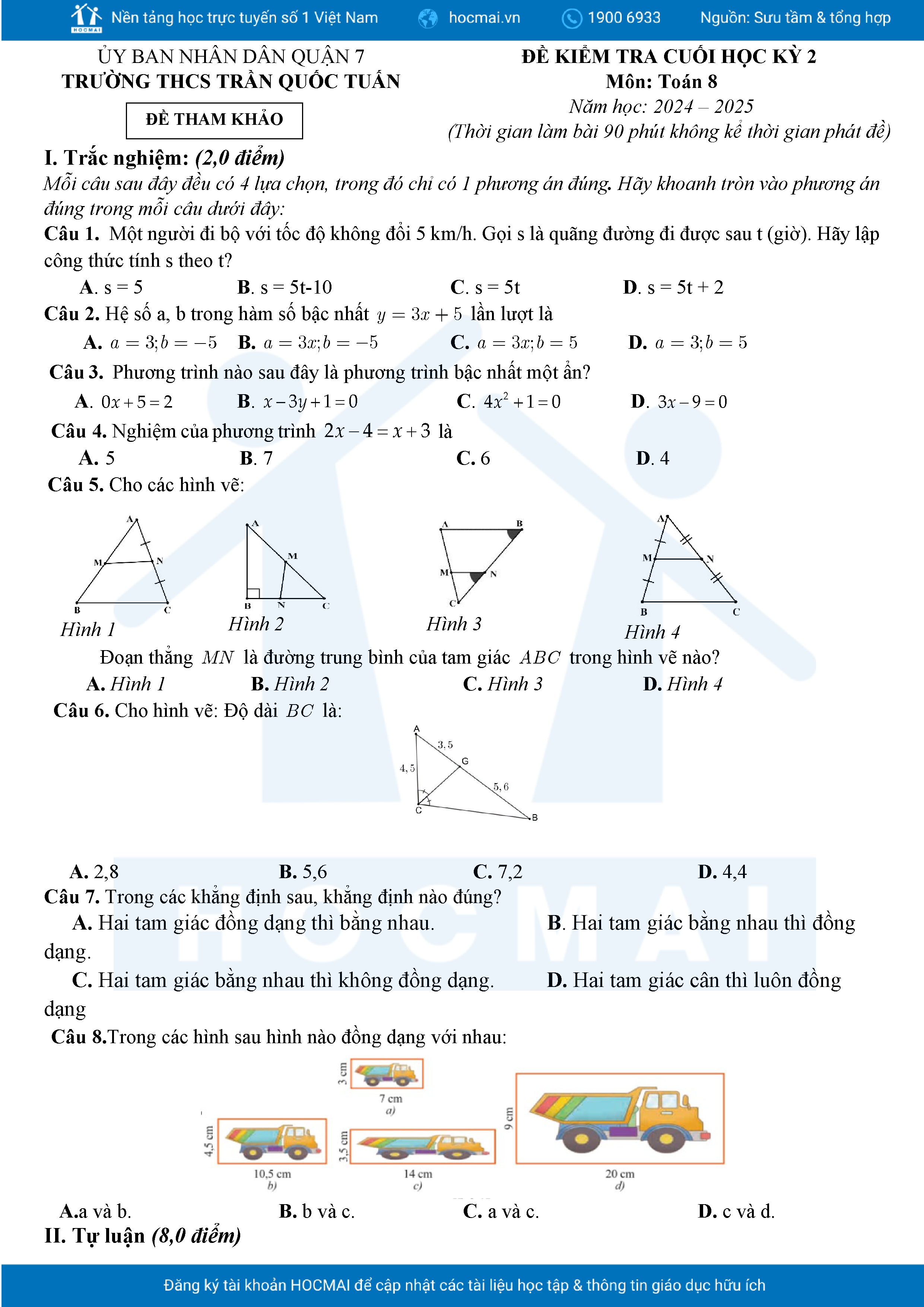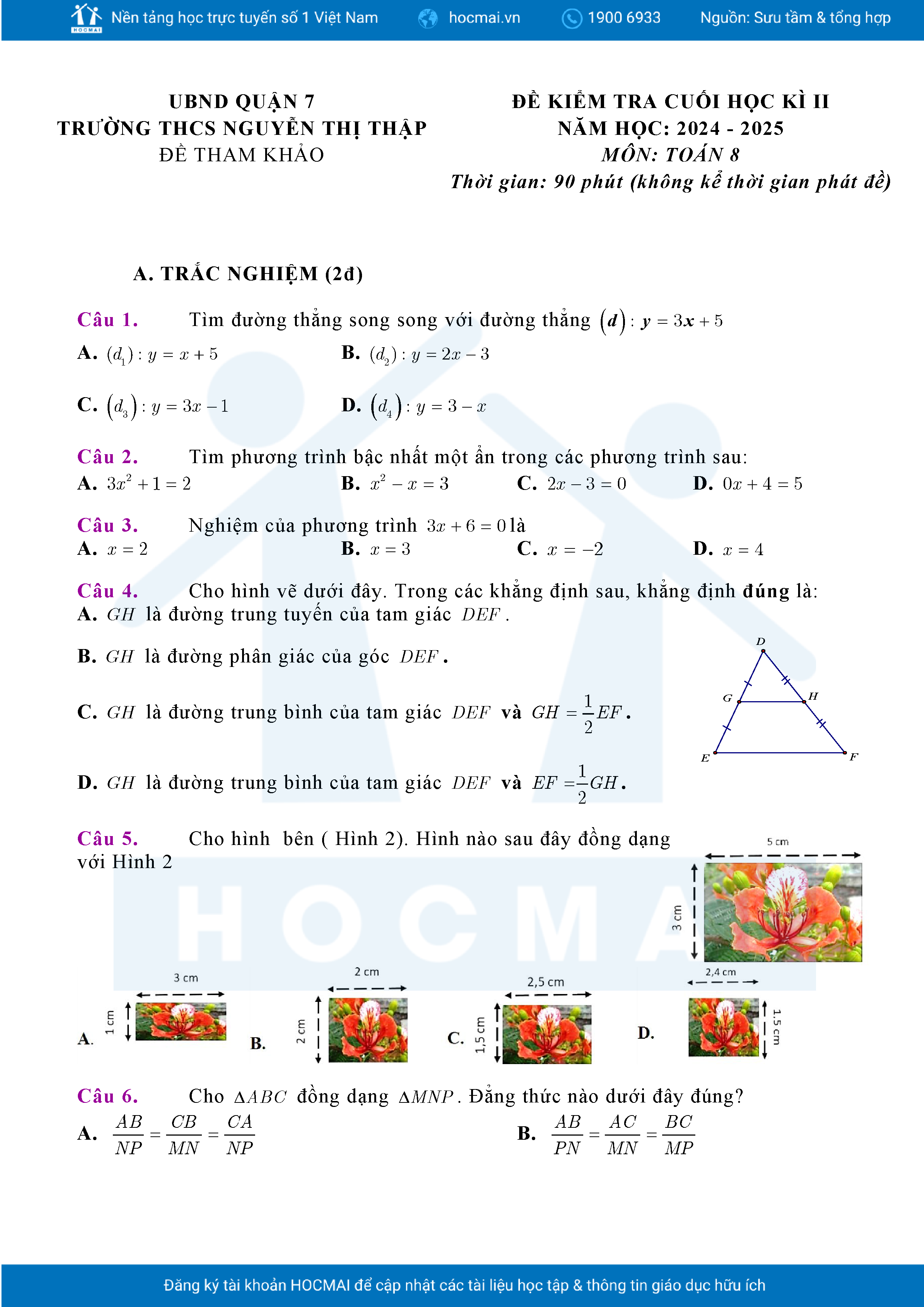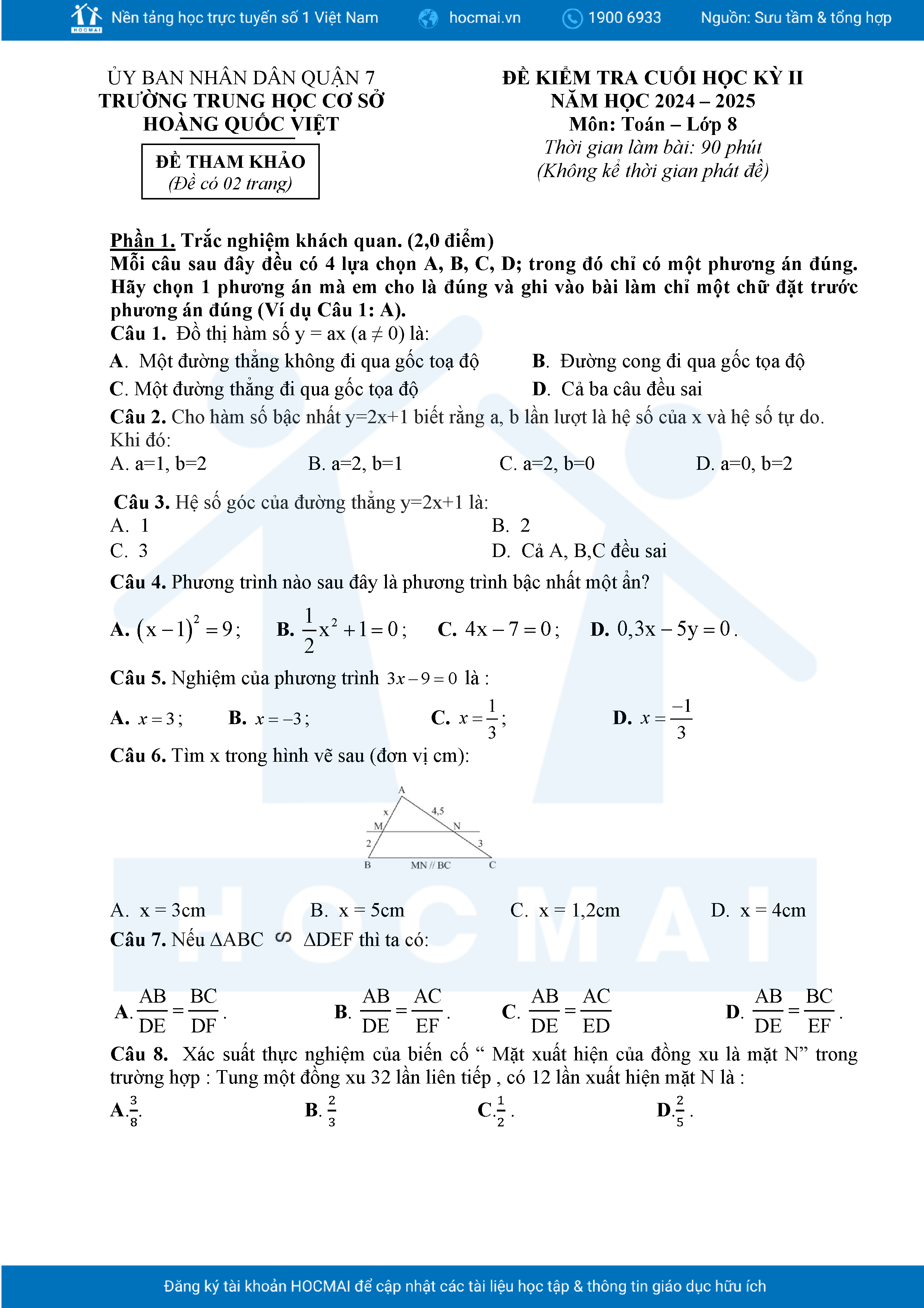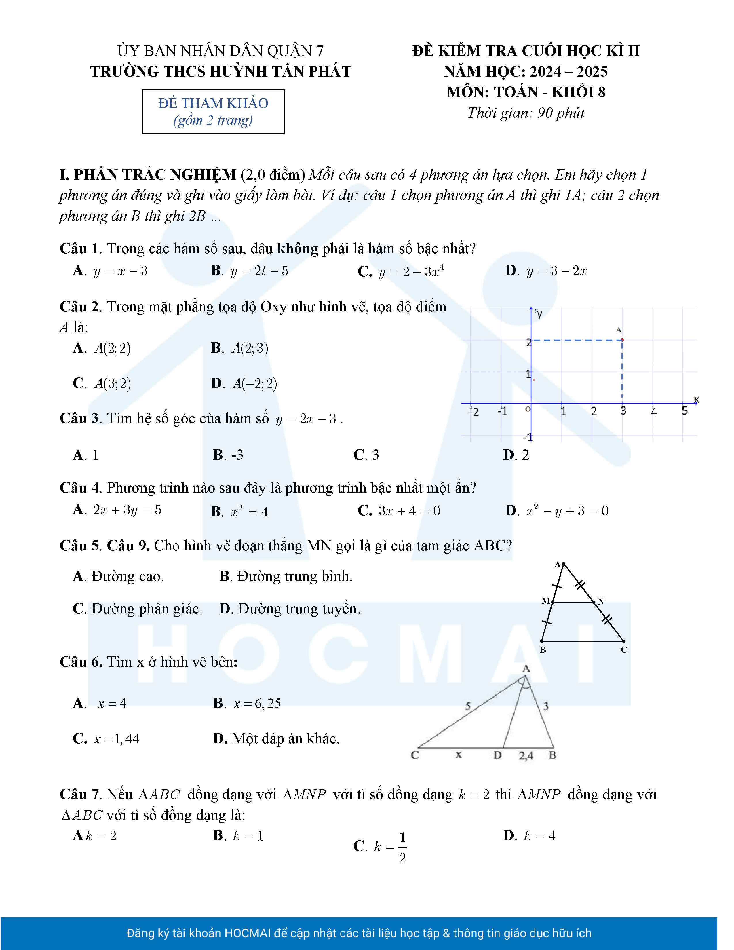 Đề tham khảo cuối kì 2 Toán 8 năm 2024 – 2025 phòng GD&ĐT Quận 7 – TP HCM