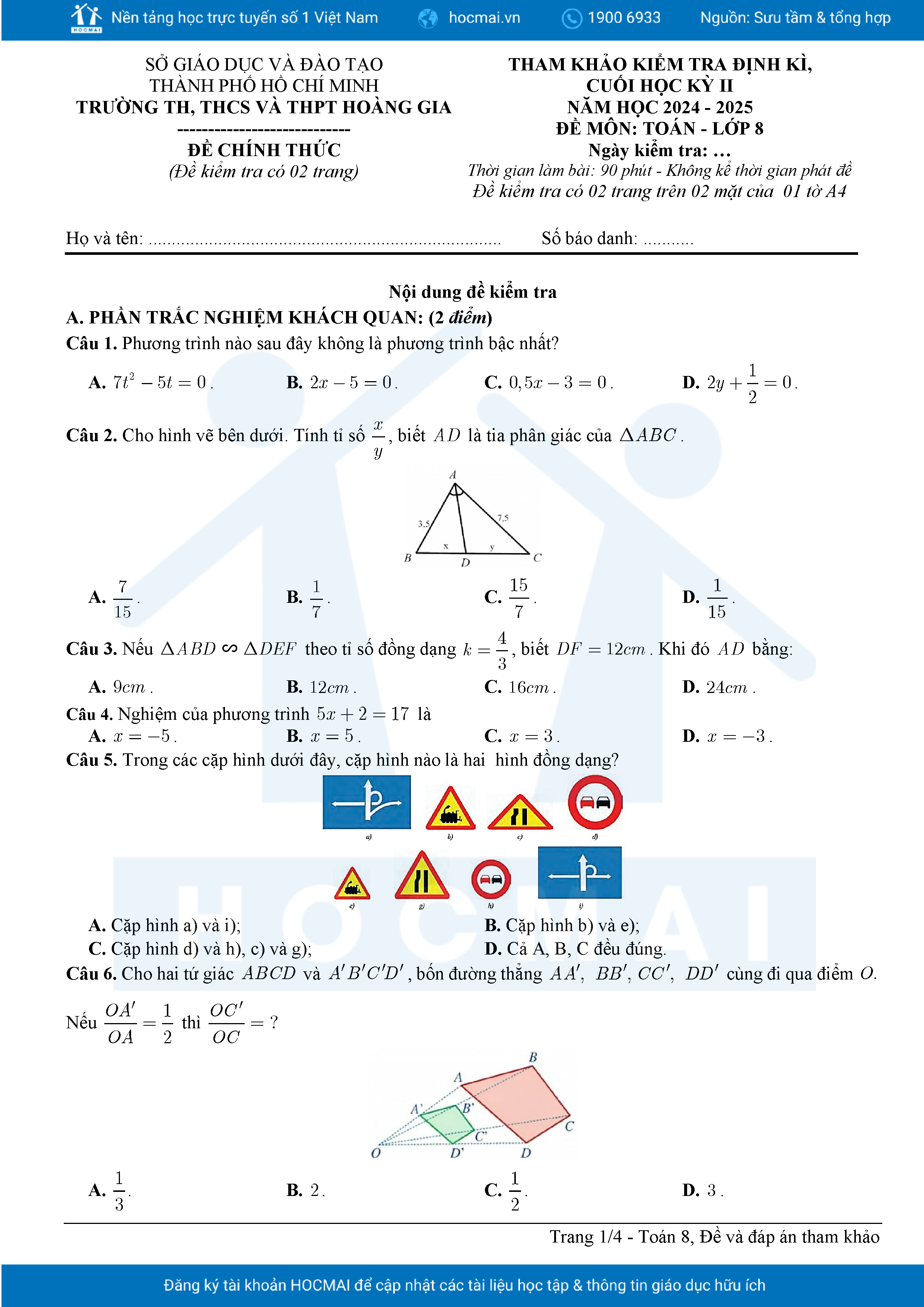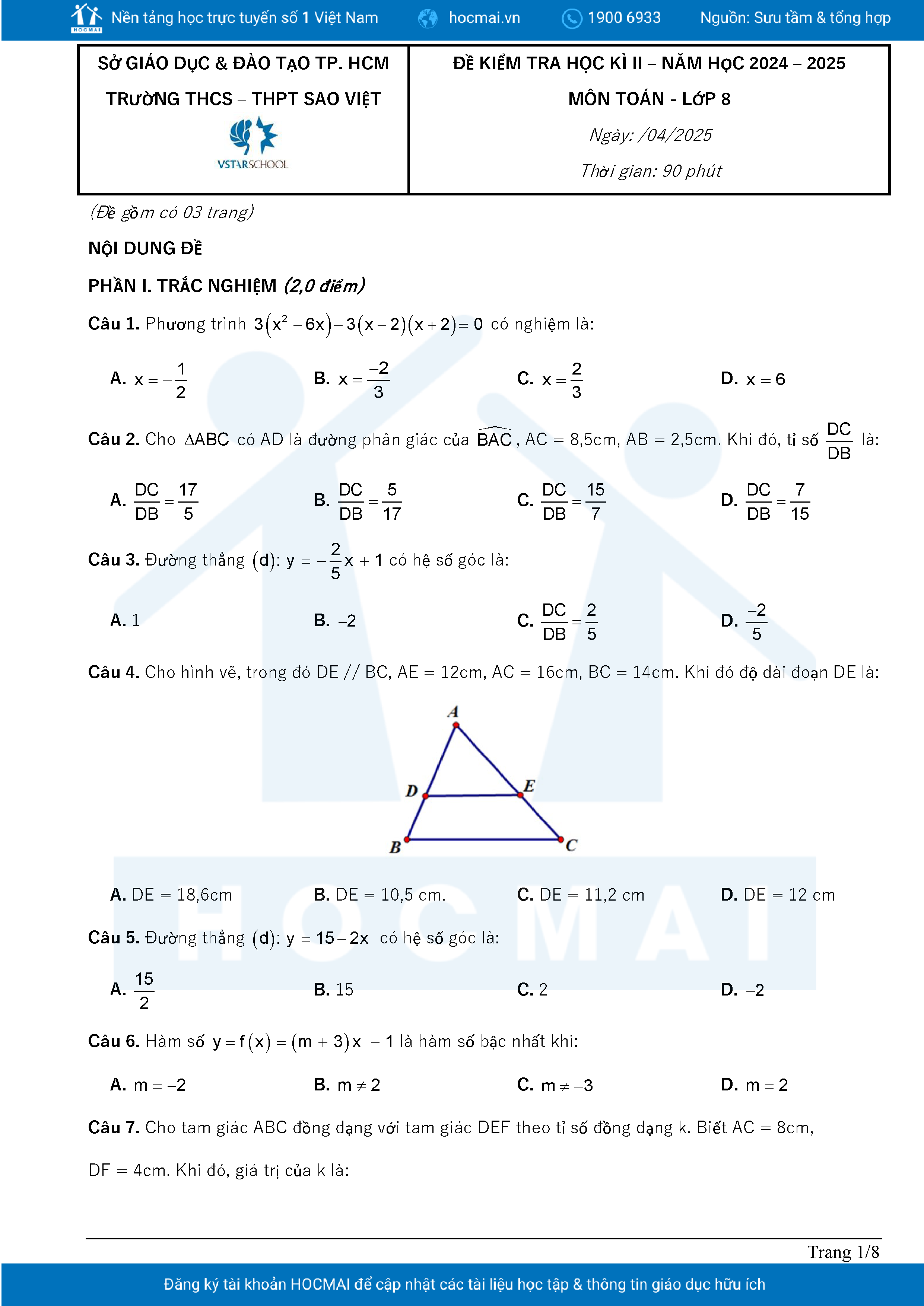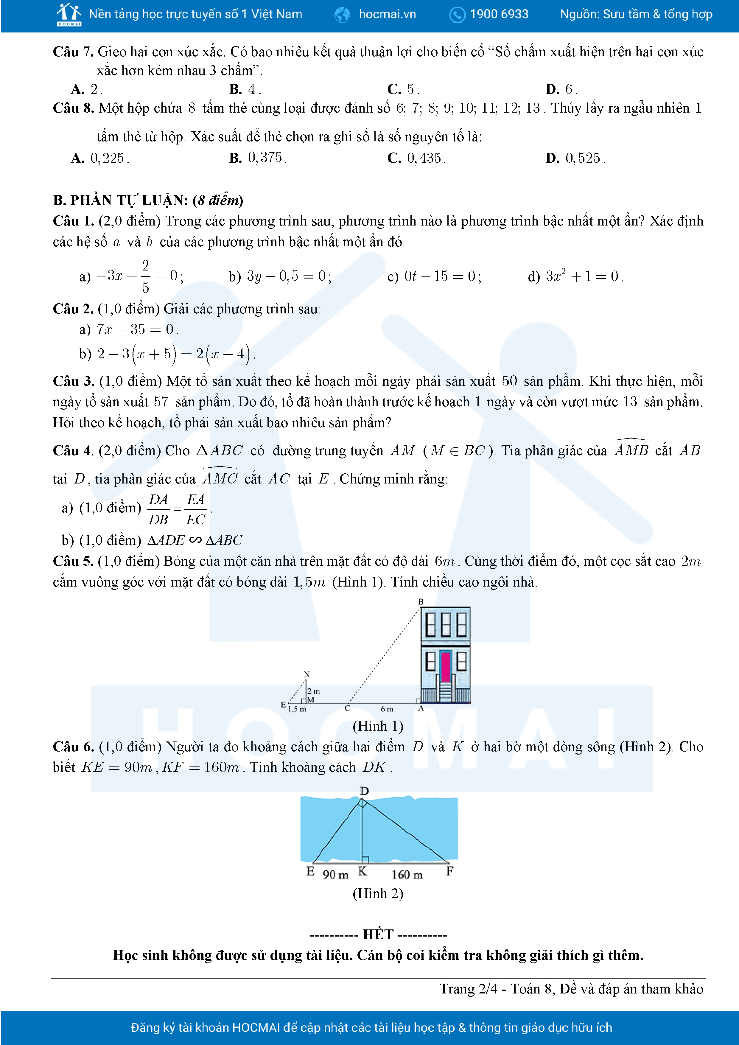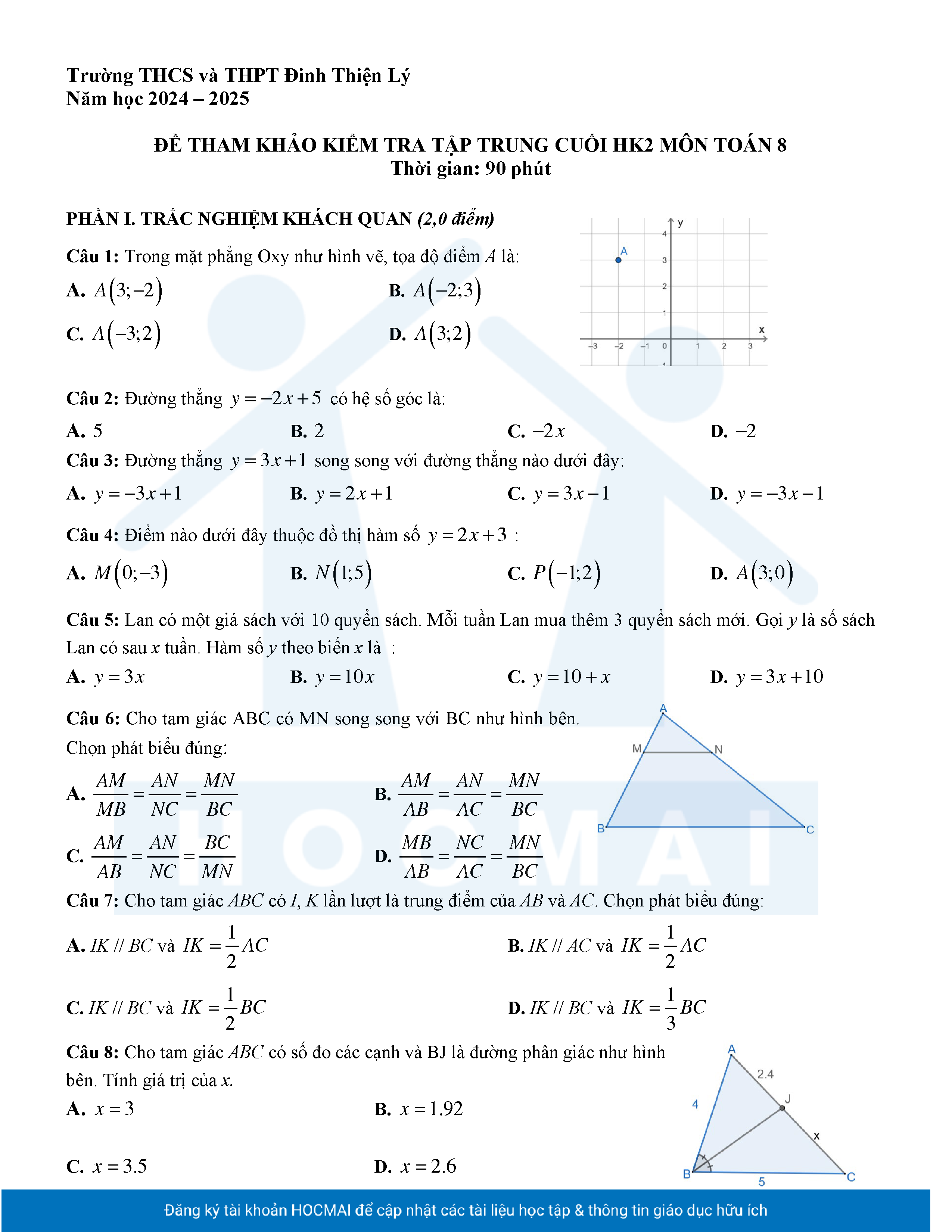 Đề tham khảo cuối kì 2 Toán 8 năm 2024 – 2025 phòng GD&ĐT Quận 7 – TP HCM