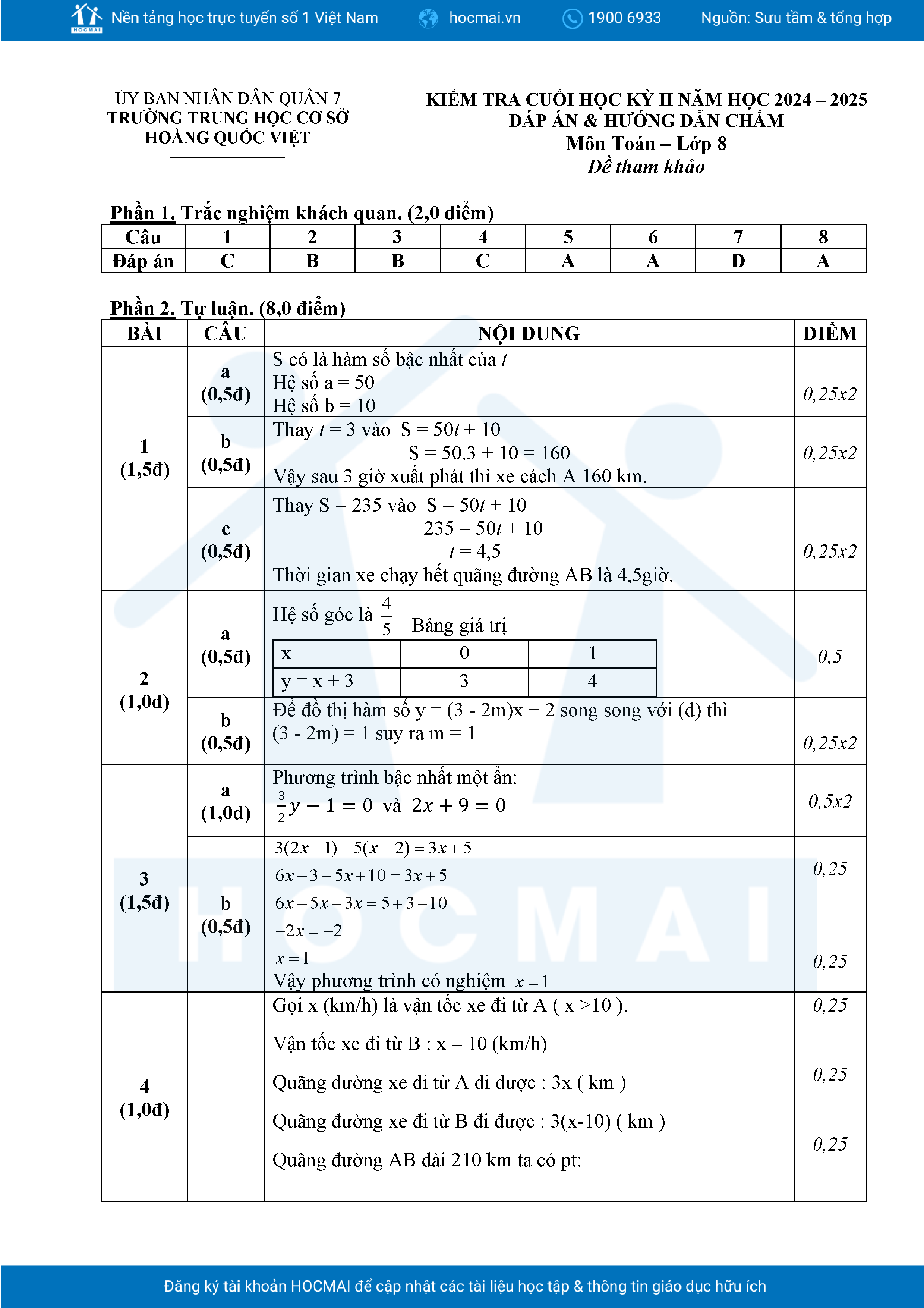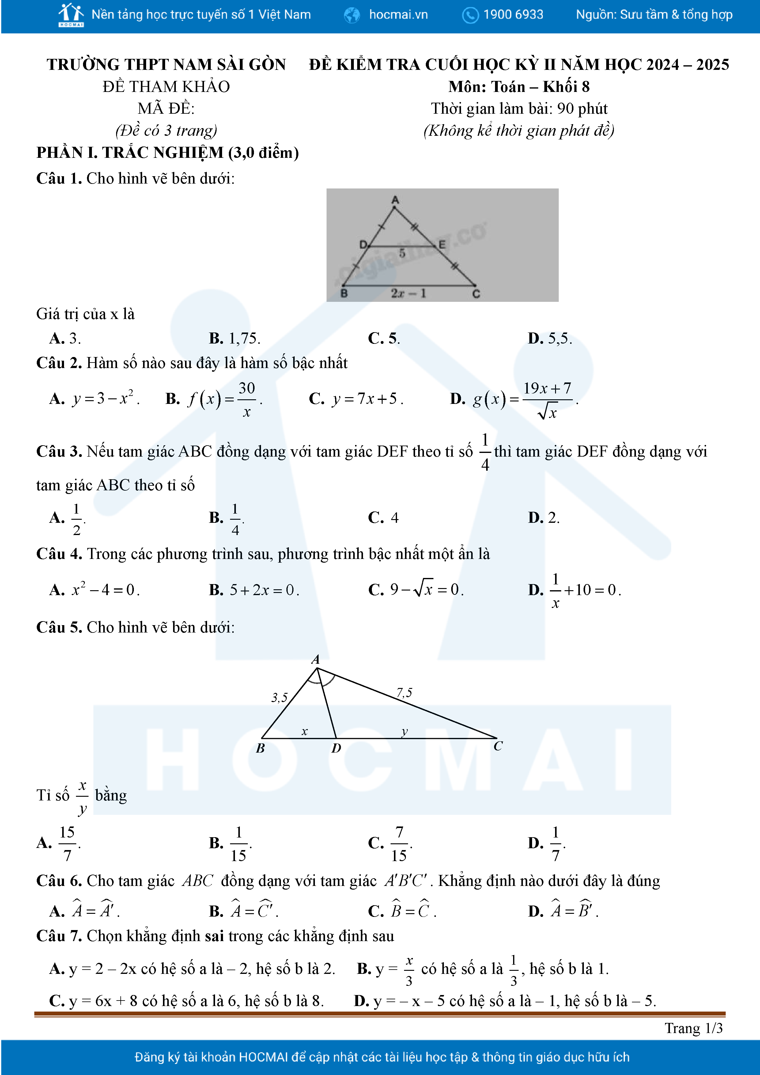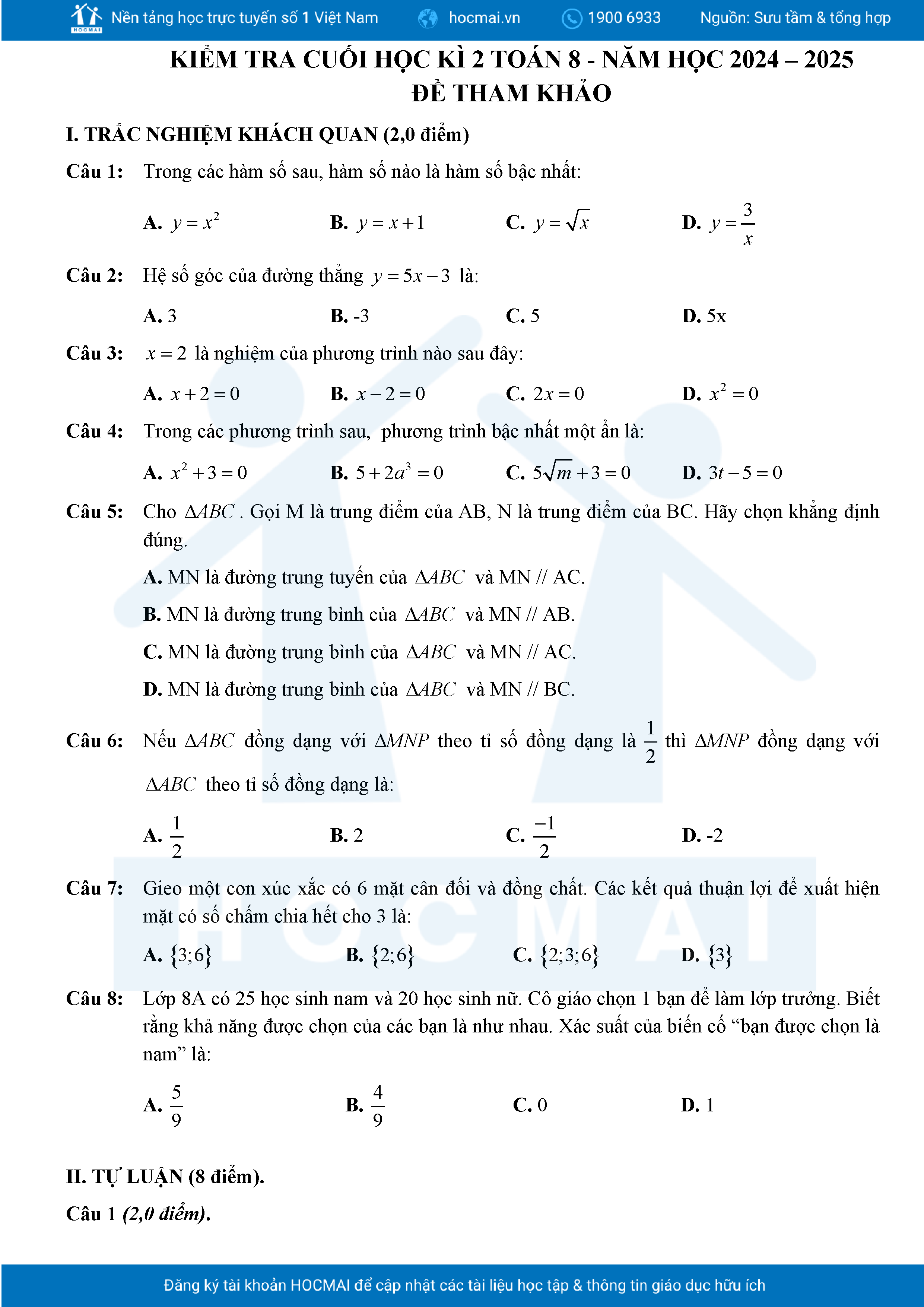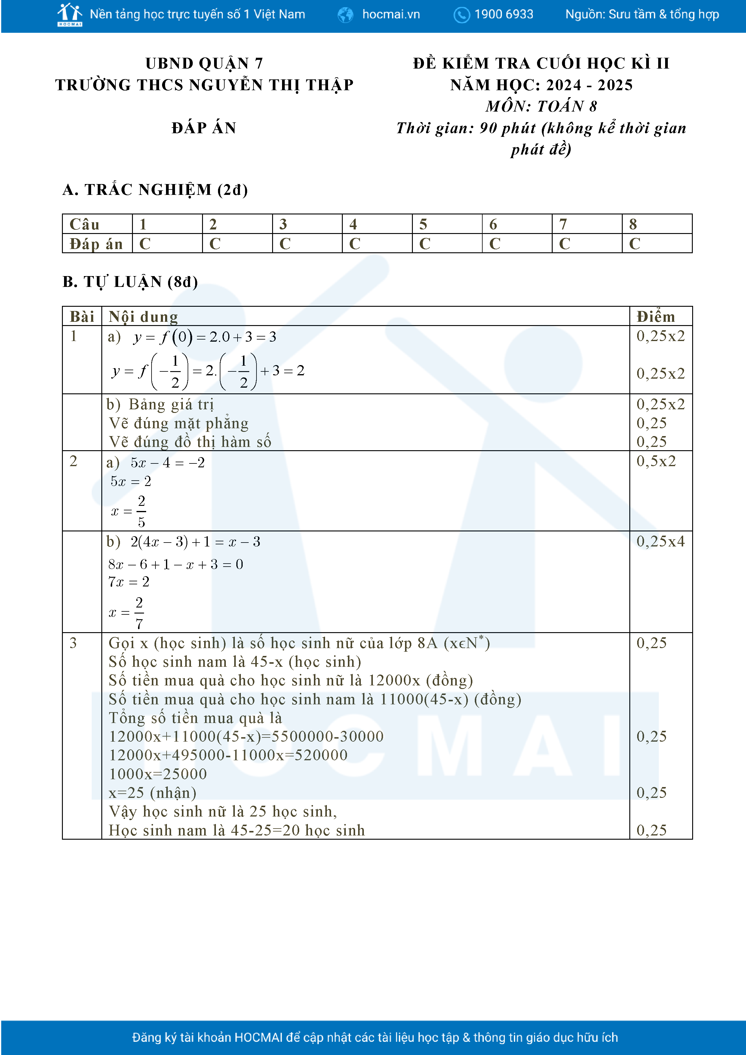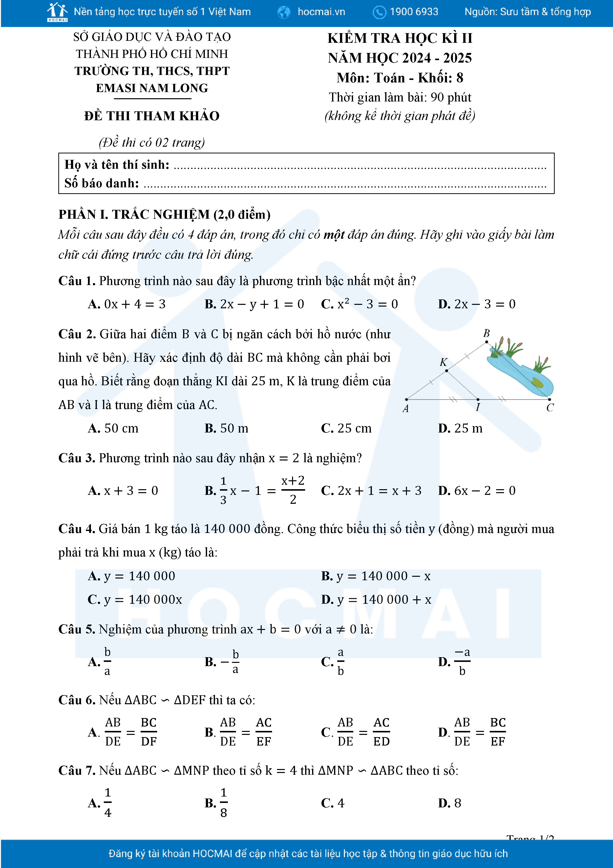 Đề tham khảo cuối kì 2 Toán 8 năm 2024 – 2025 phòng GD&ĐT Quận 7 – TP HCM