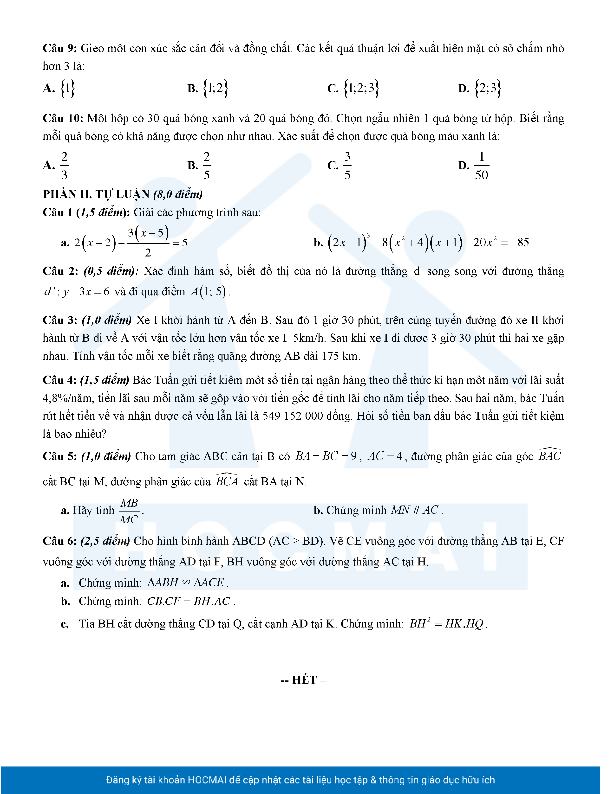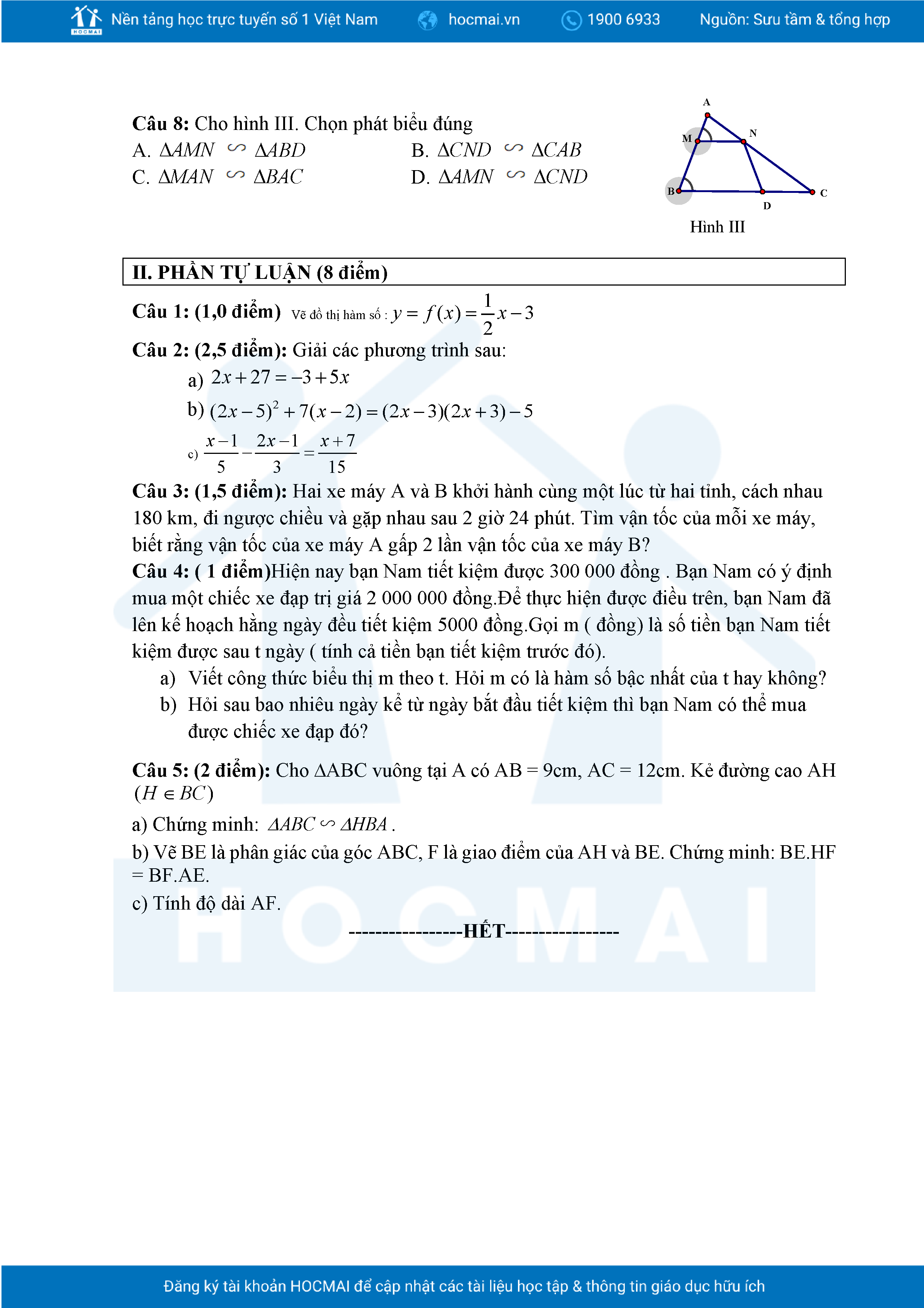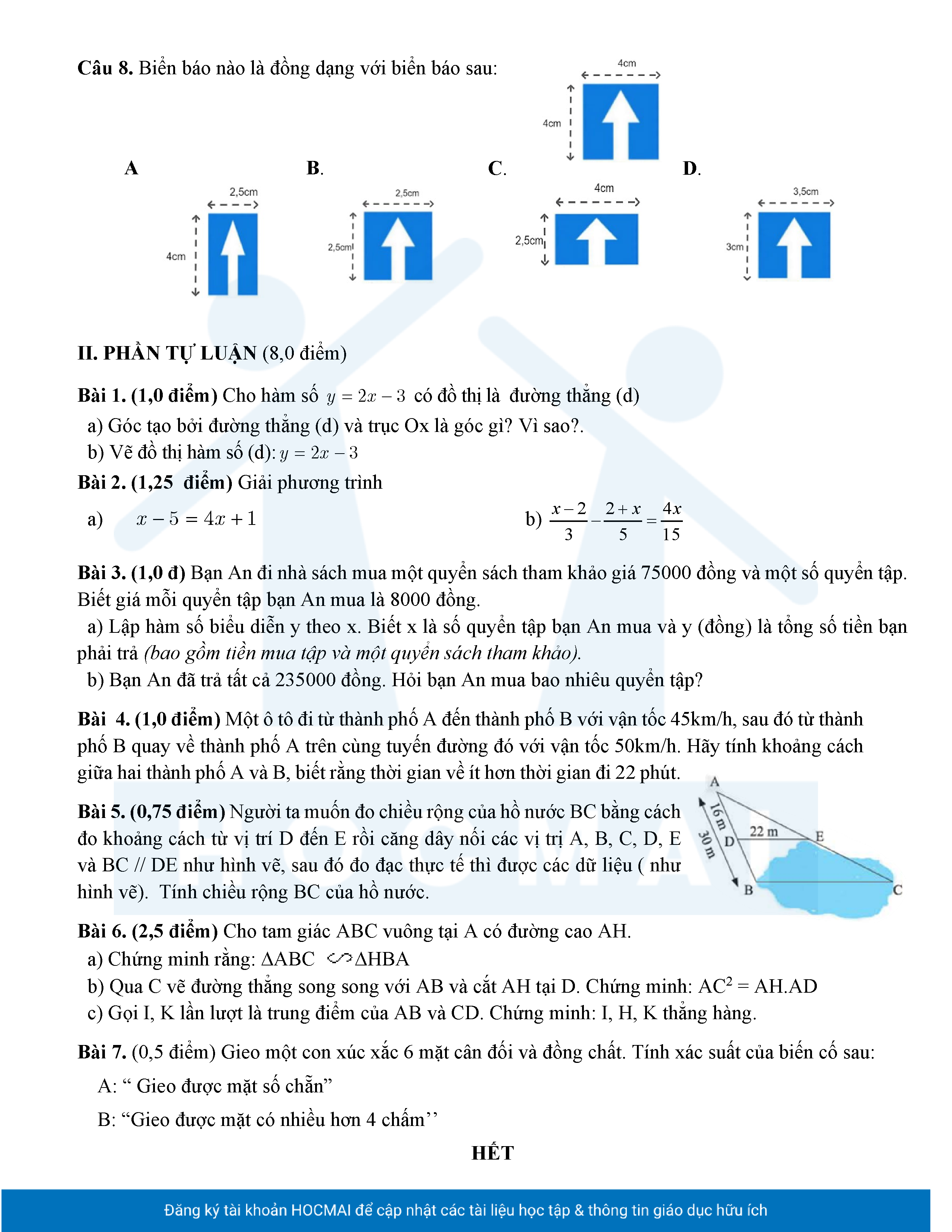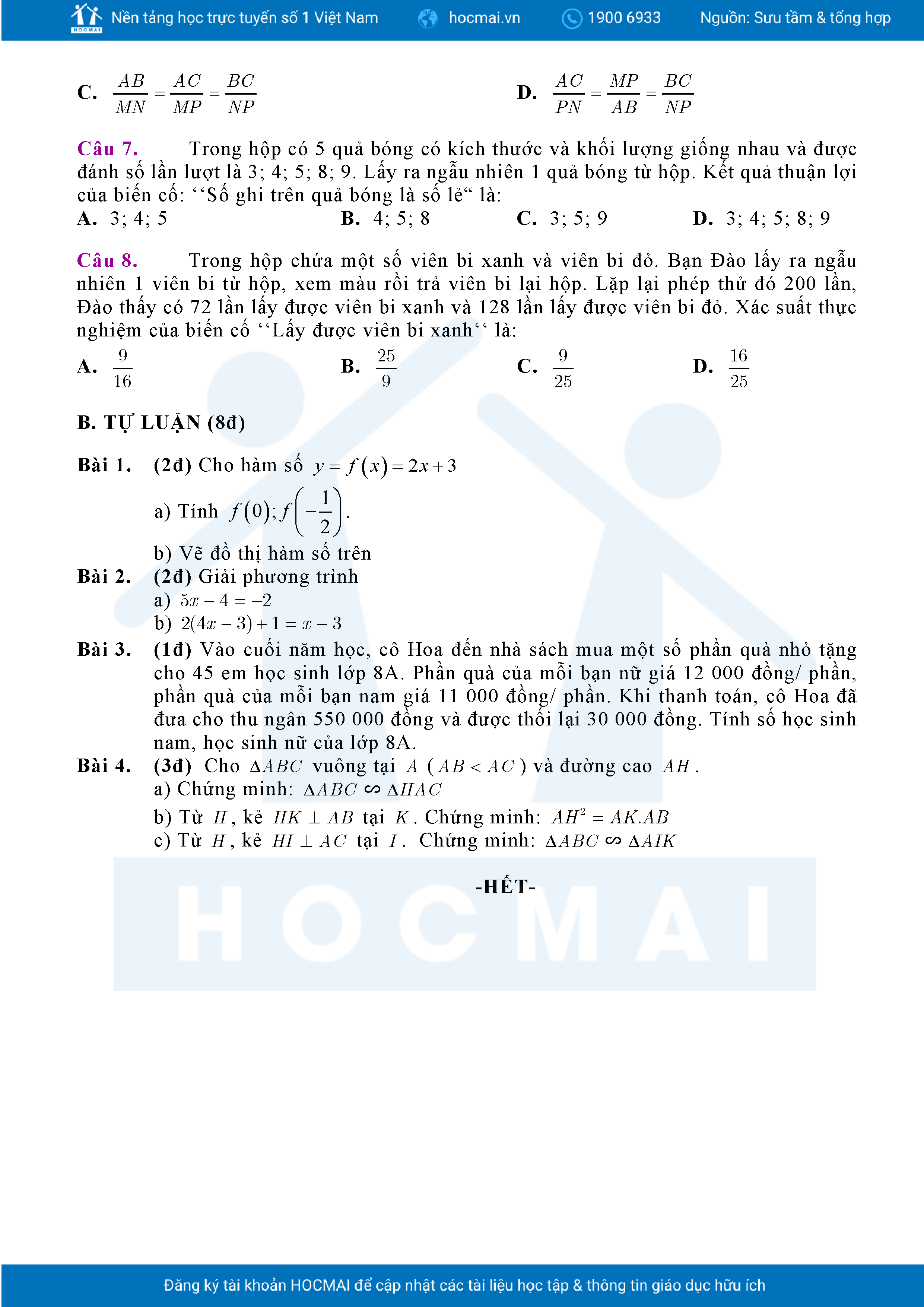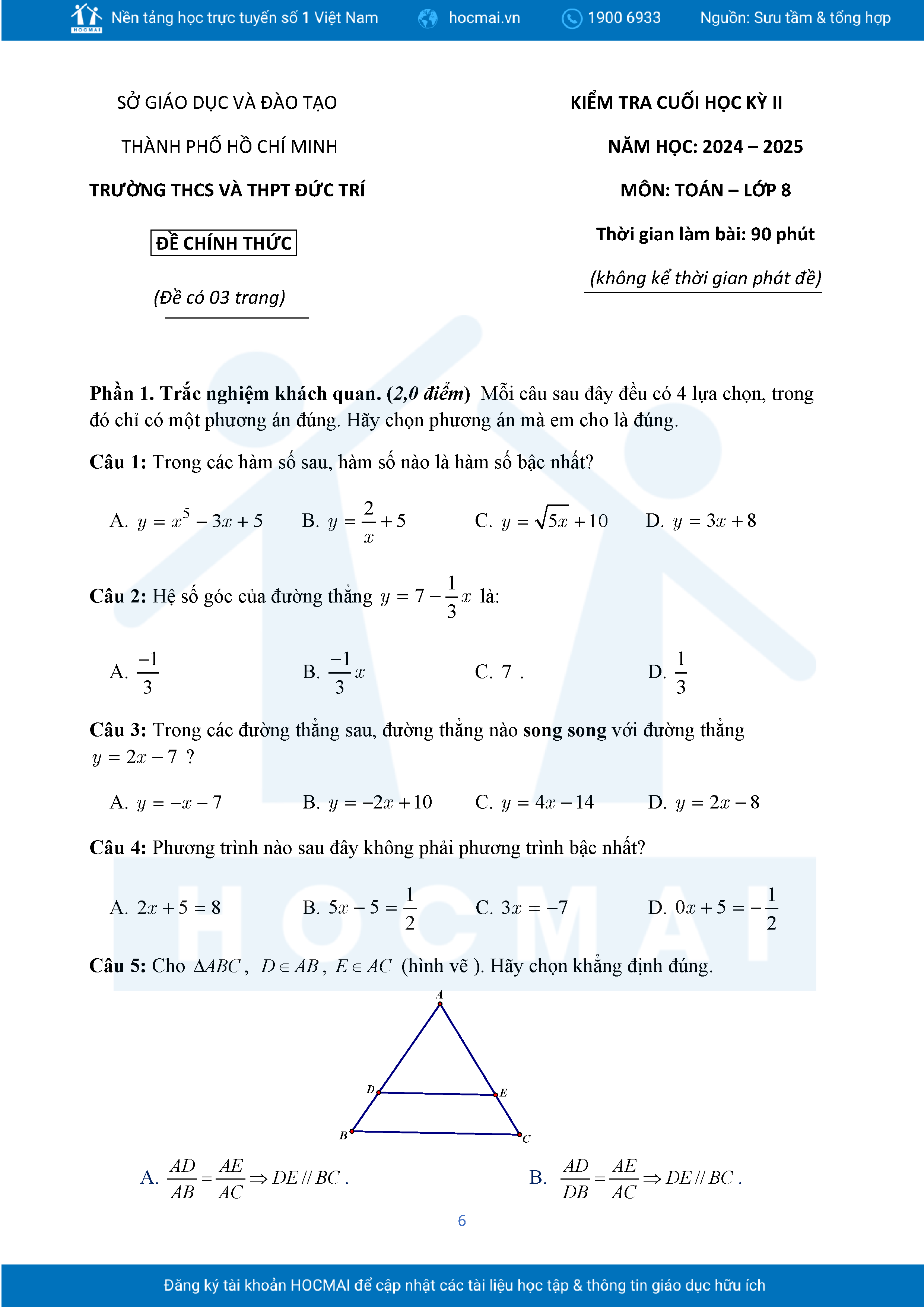 Đề tham khảo cuối kì 2 Toán 8 năm 2024 – 2025 phòng GD&ĐT Quận 7 – TP HCM