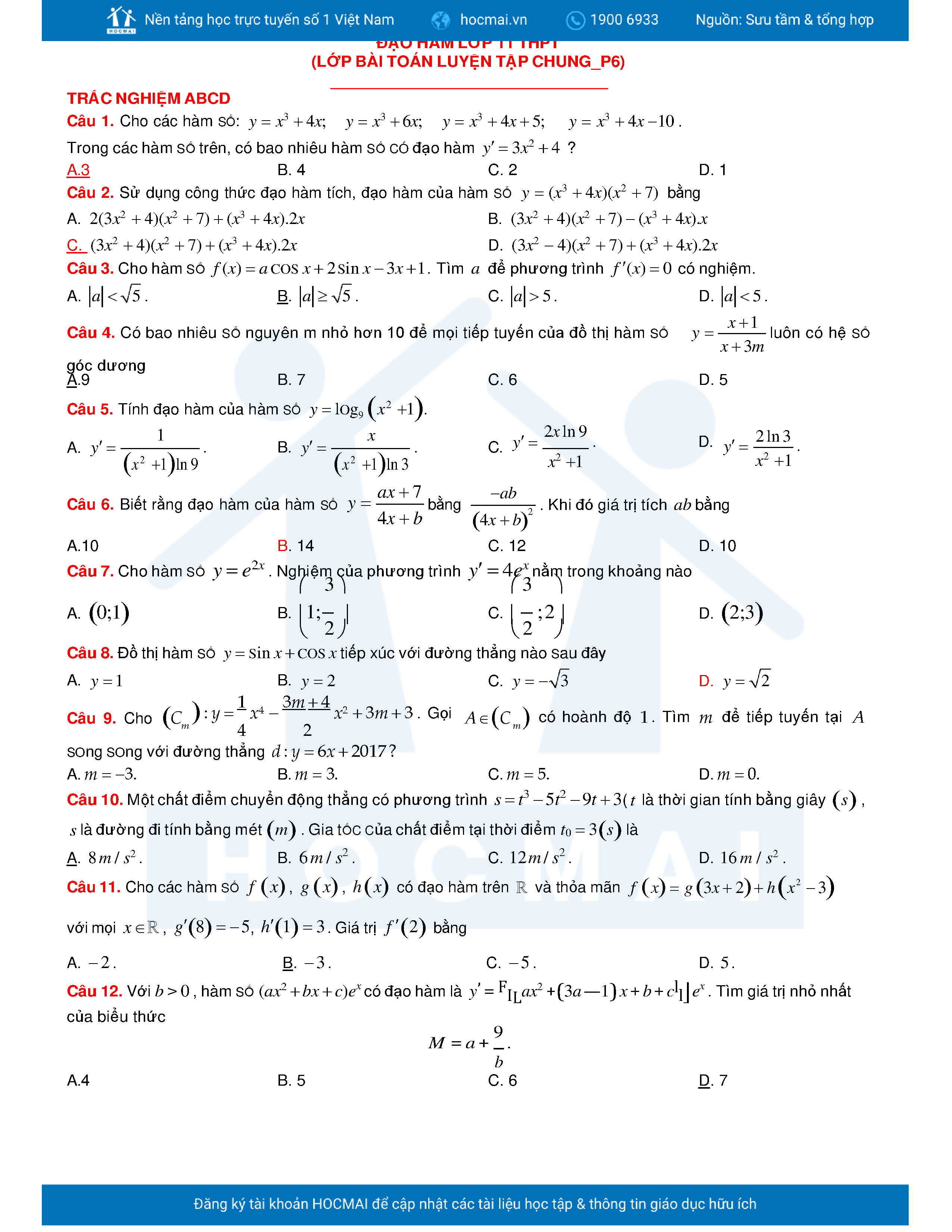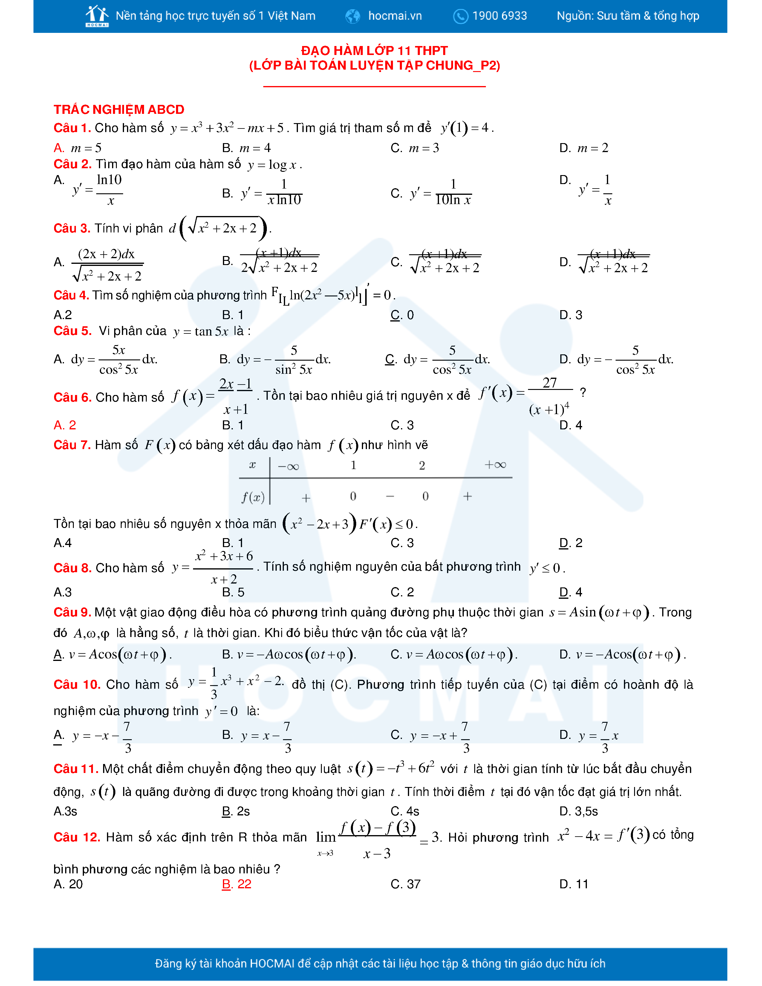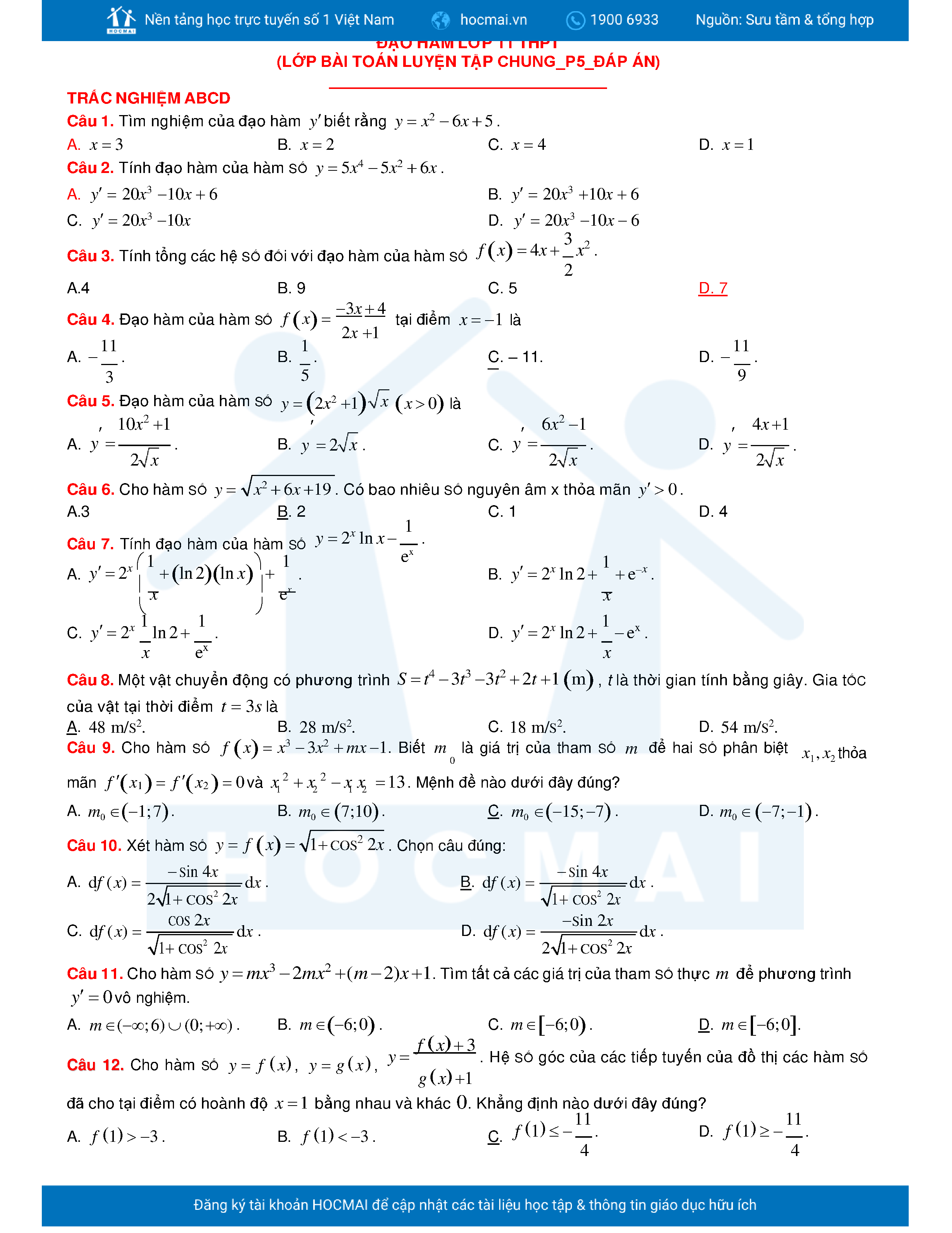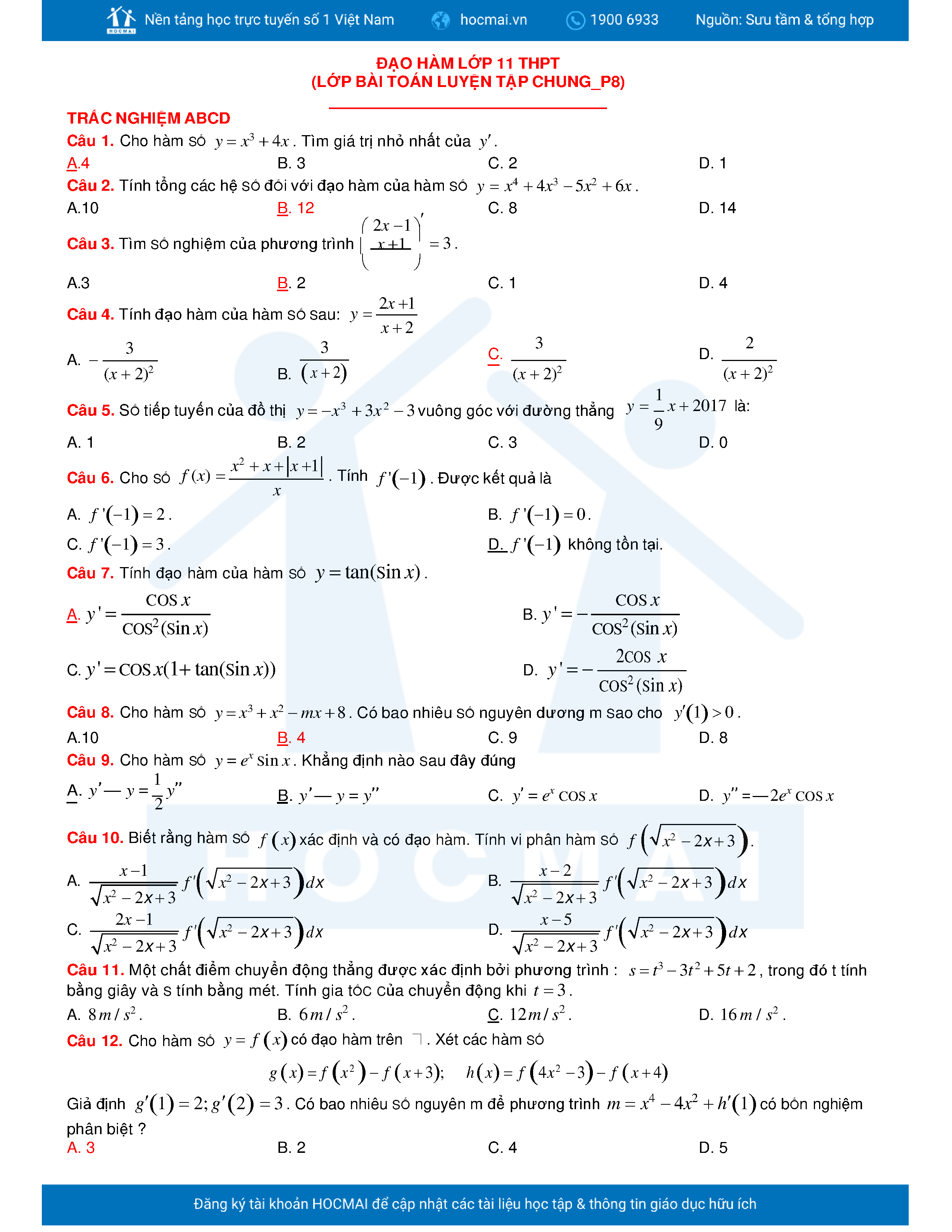 Luyện tập chung Toán 11 THPT đạo hàm và ứng dụng