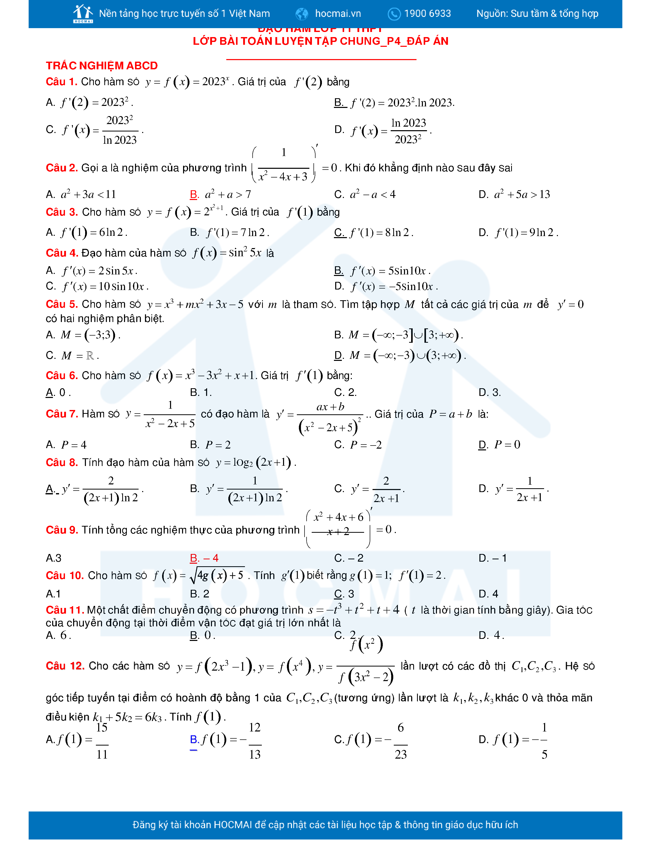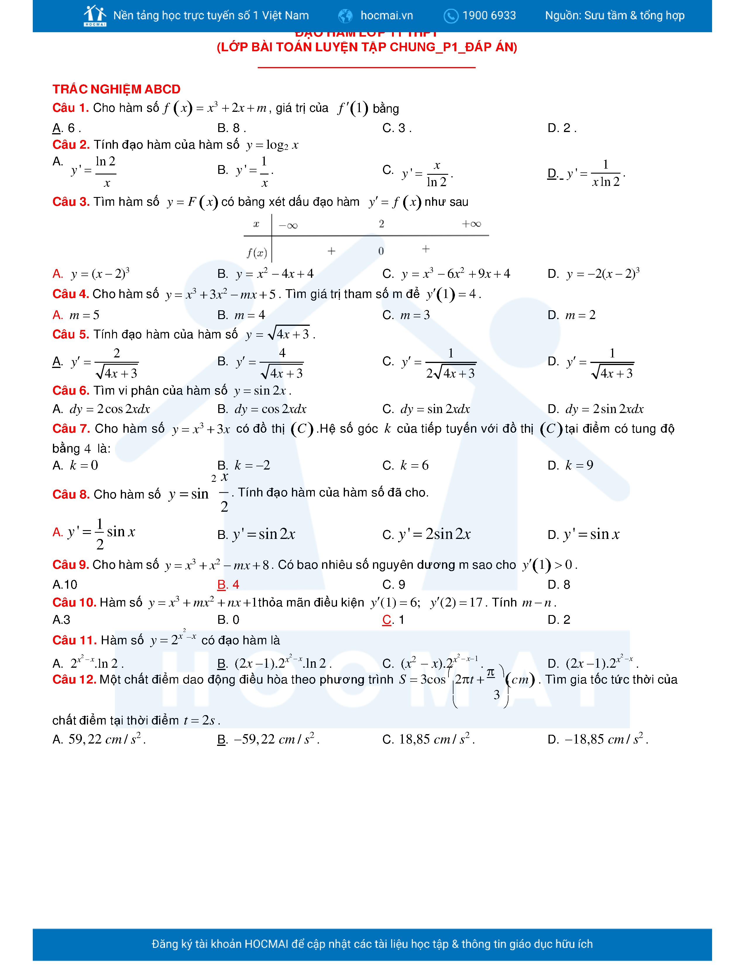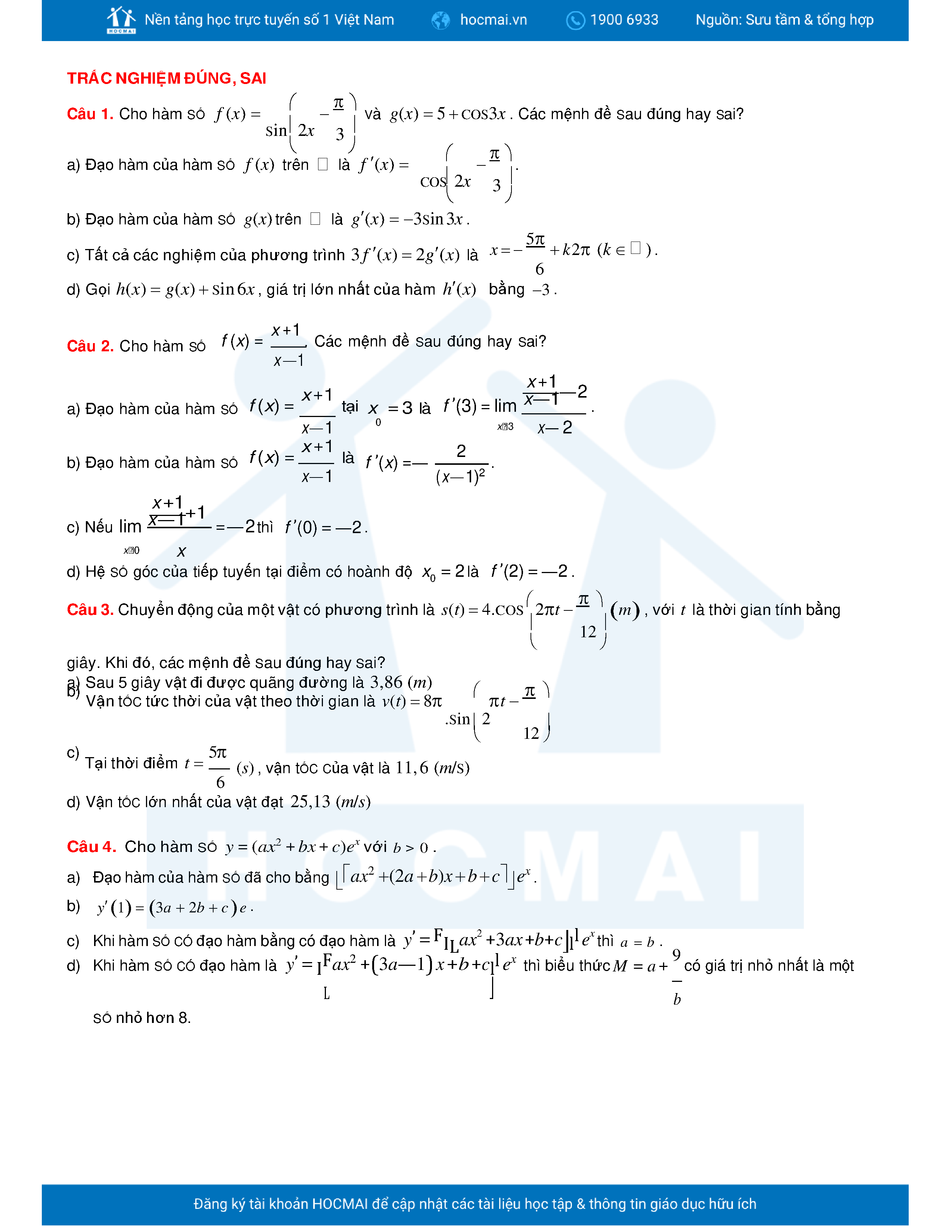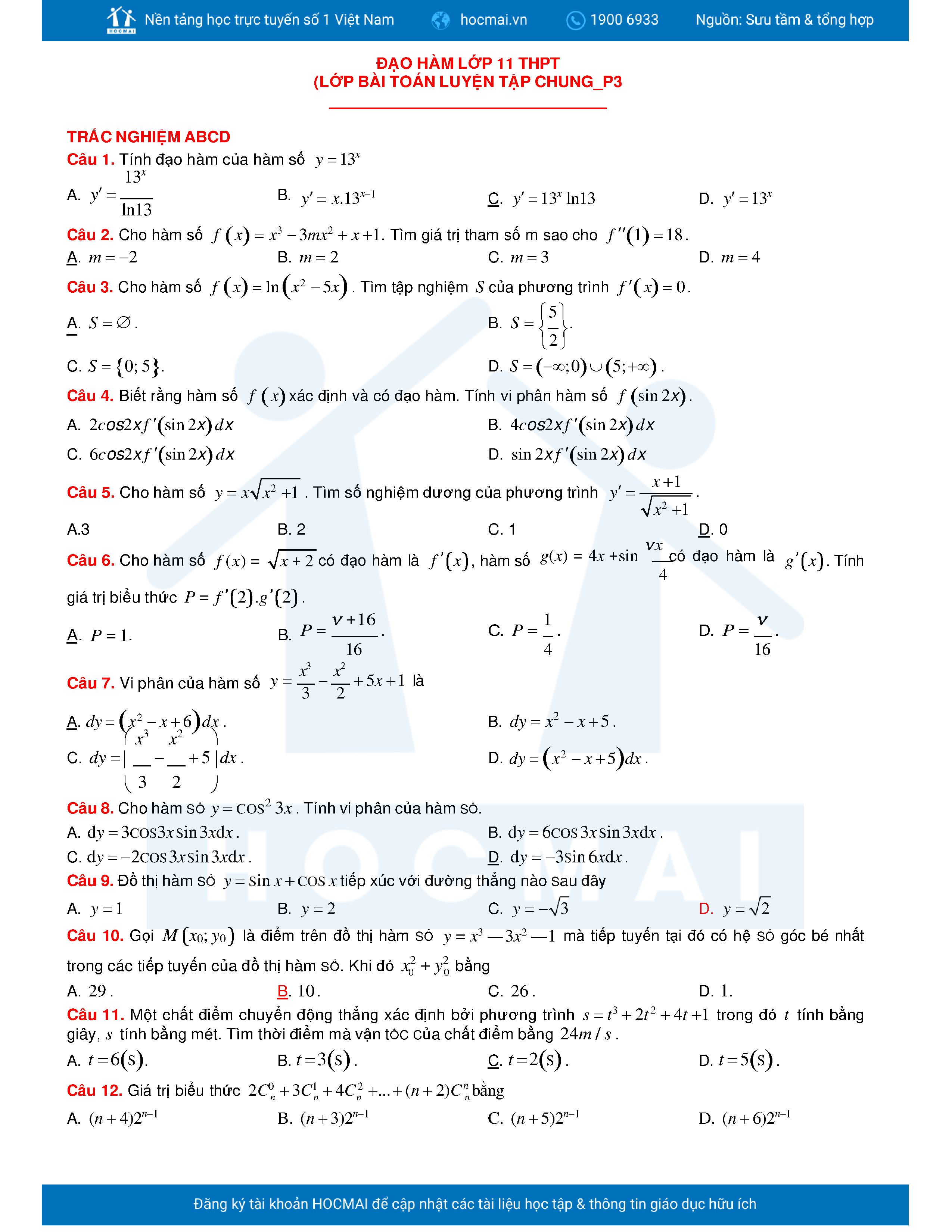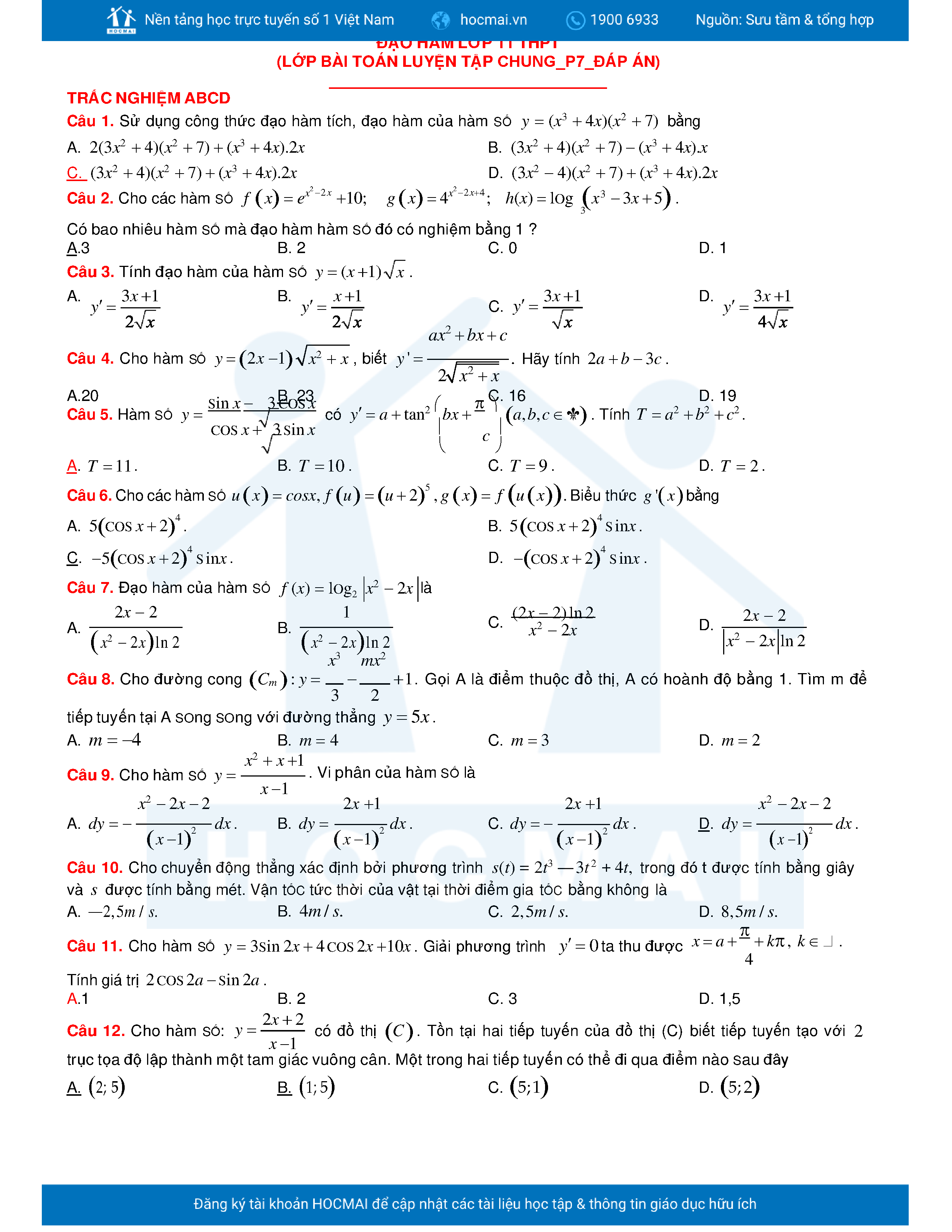 Luyện tập chung Toán 11 THPT đạo hàm và ứng dụng