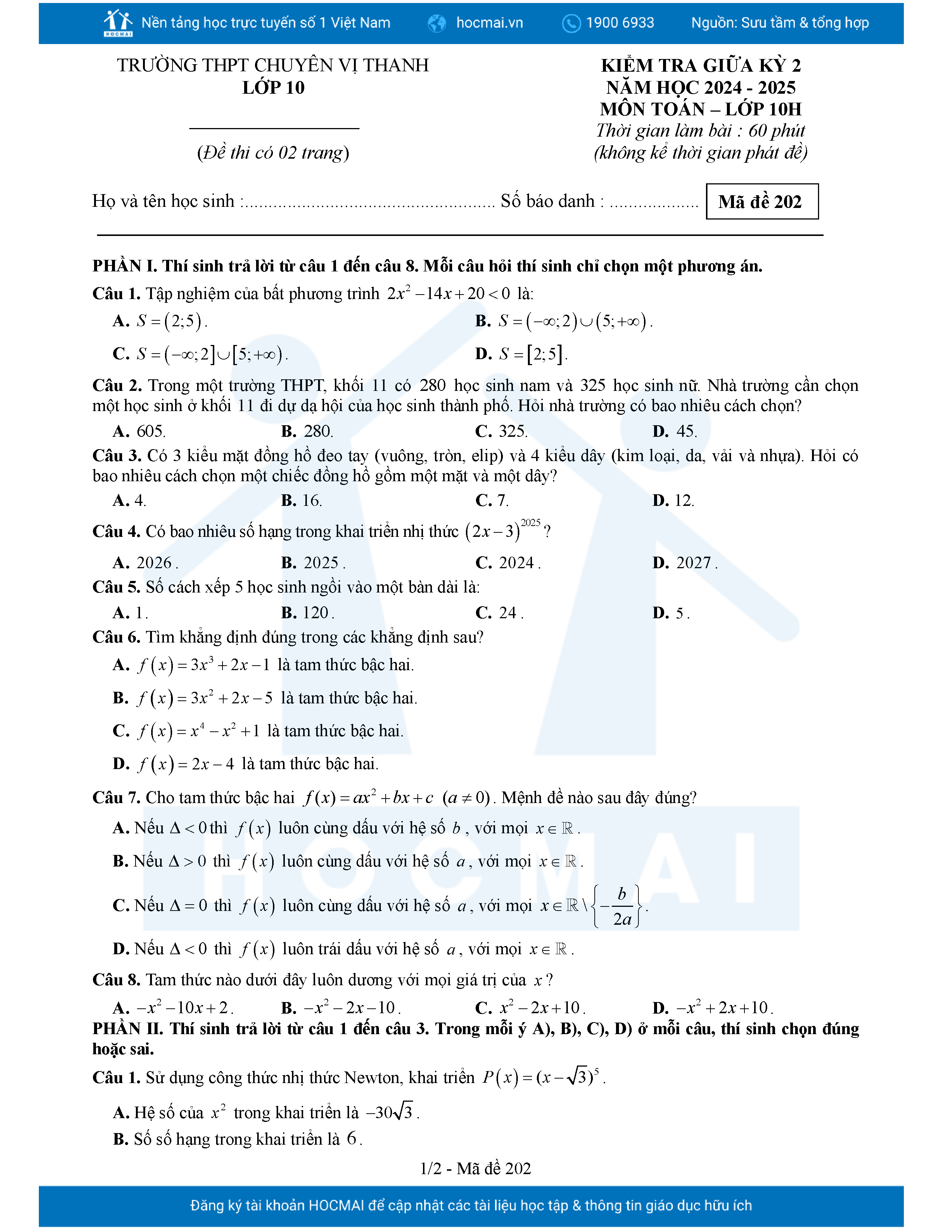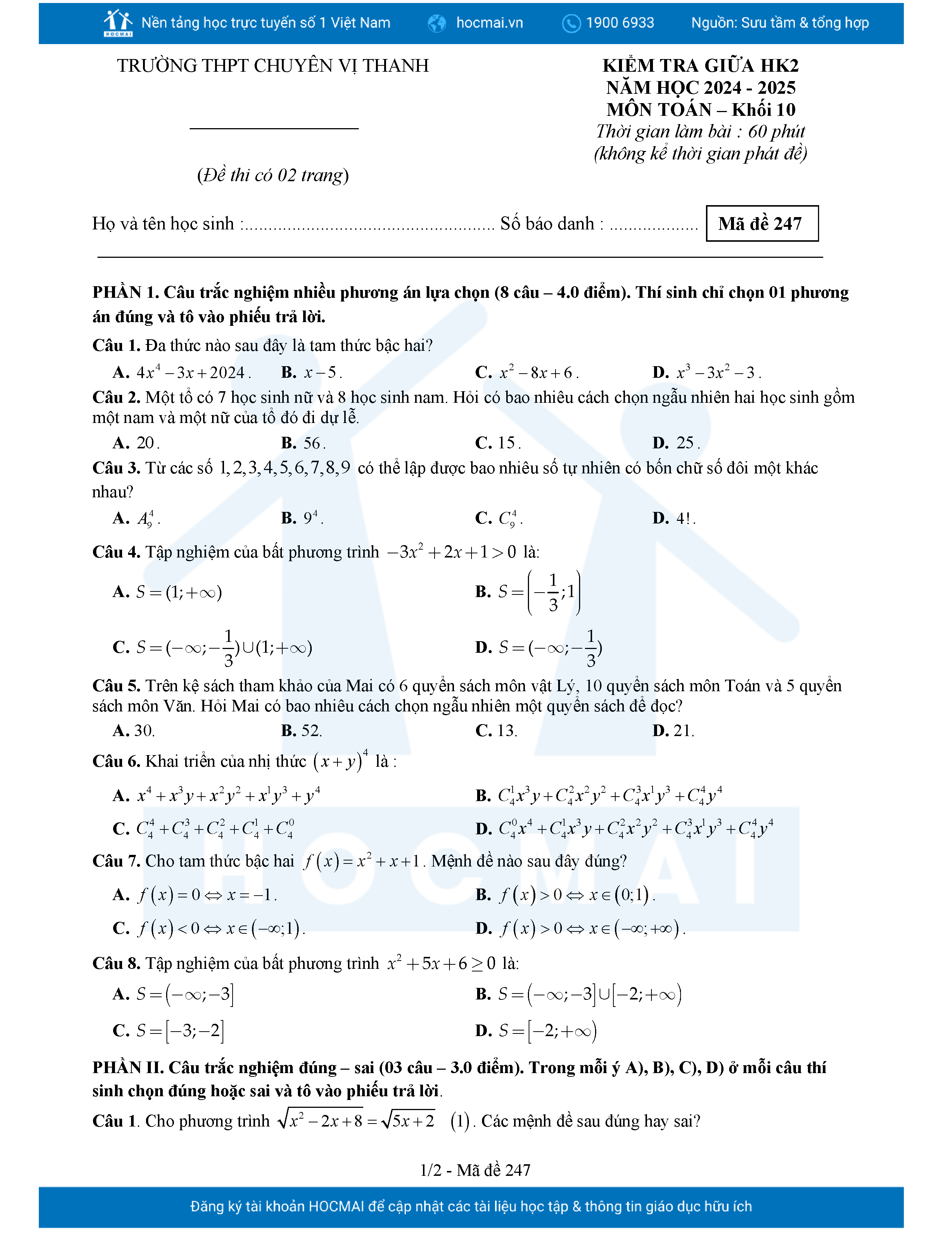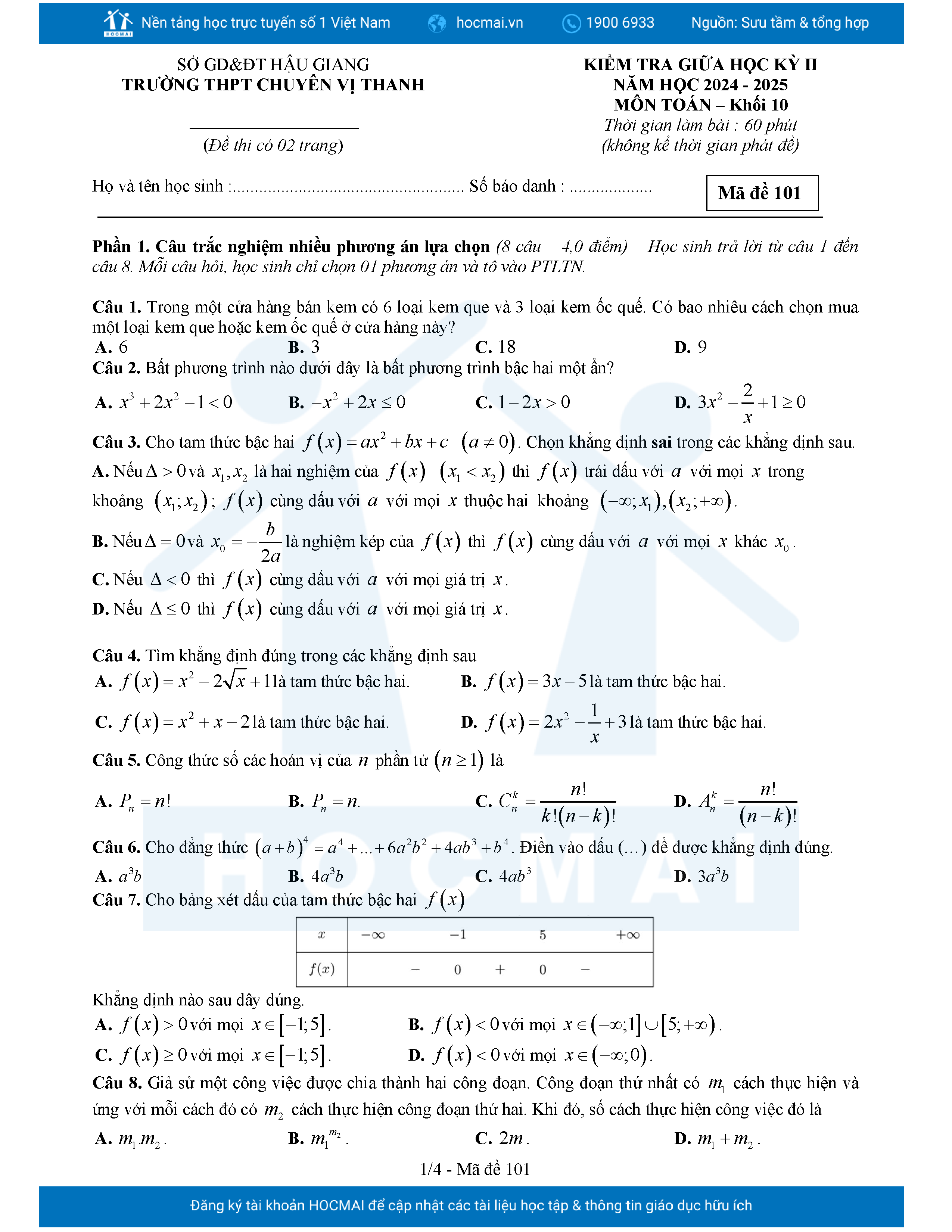 Đề giữa HK2 Toán 10 năm 2024 – 2025 trường THPT chuyên Vị Thanh – Hậu Giang
