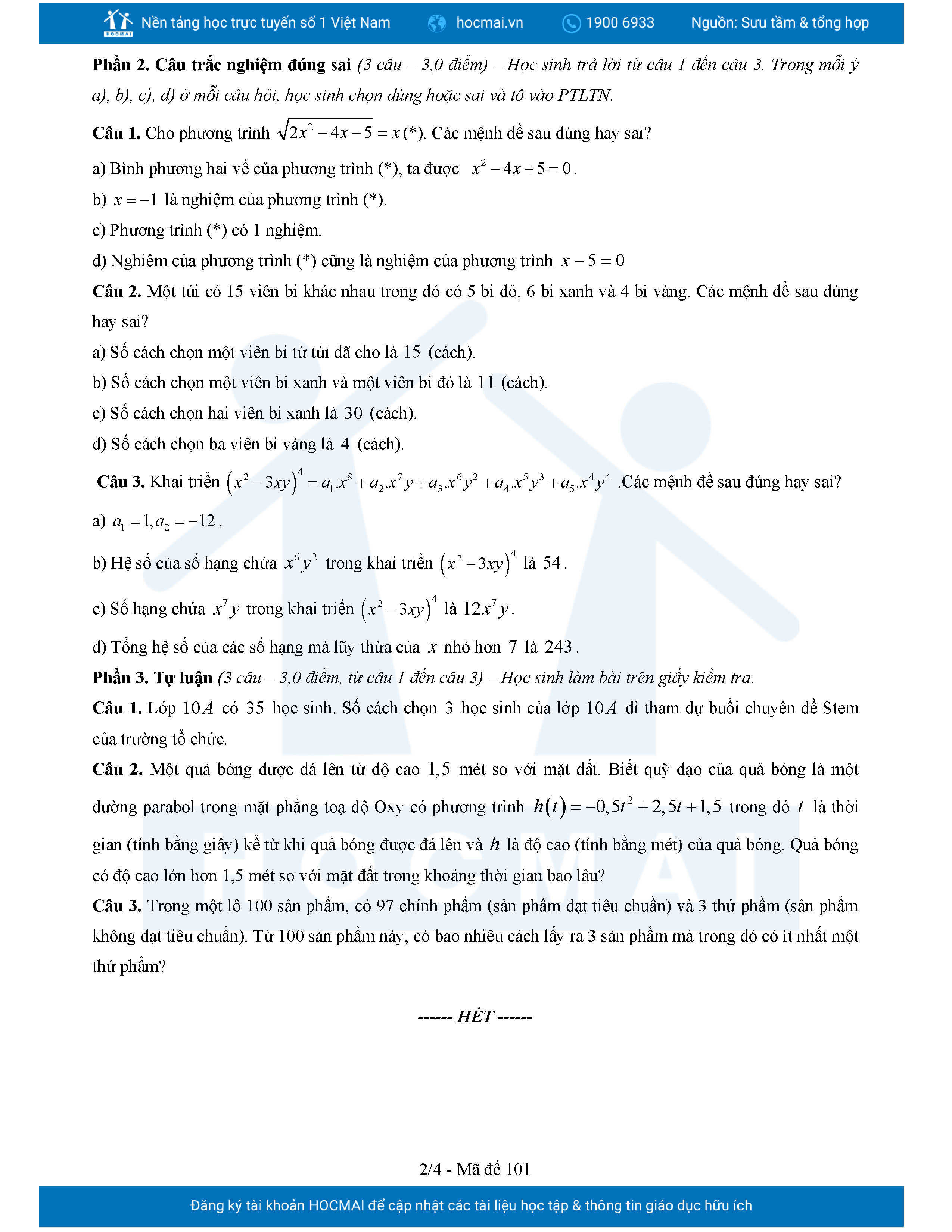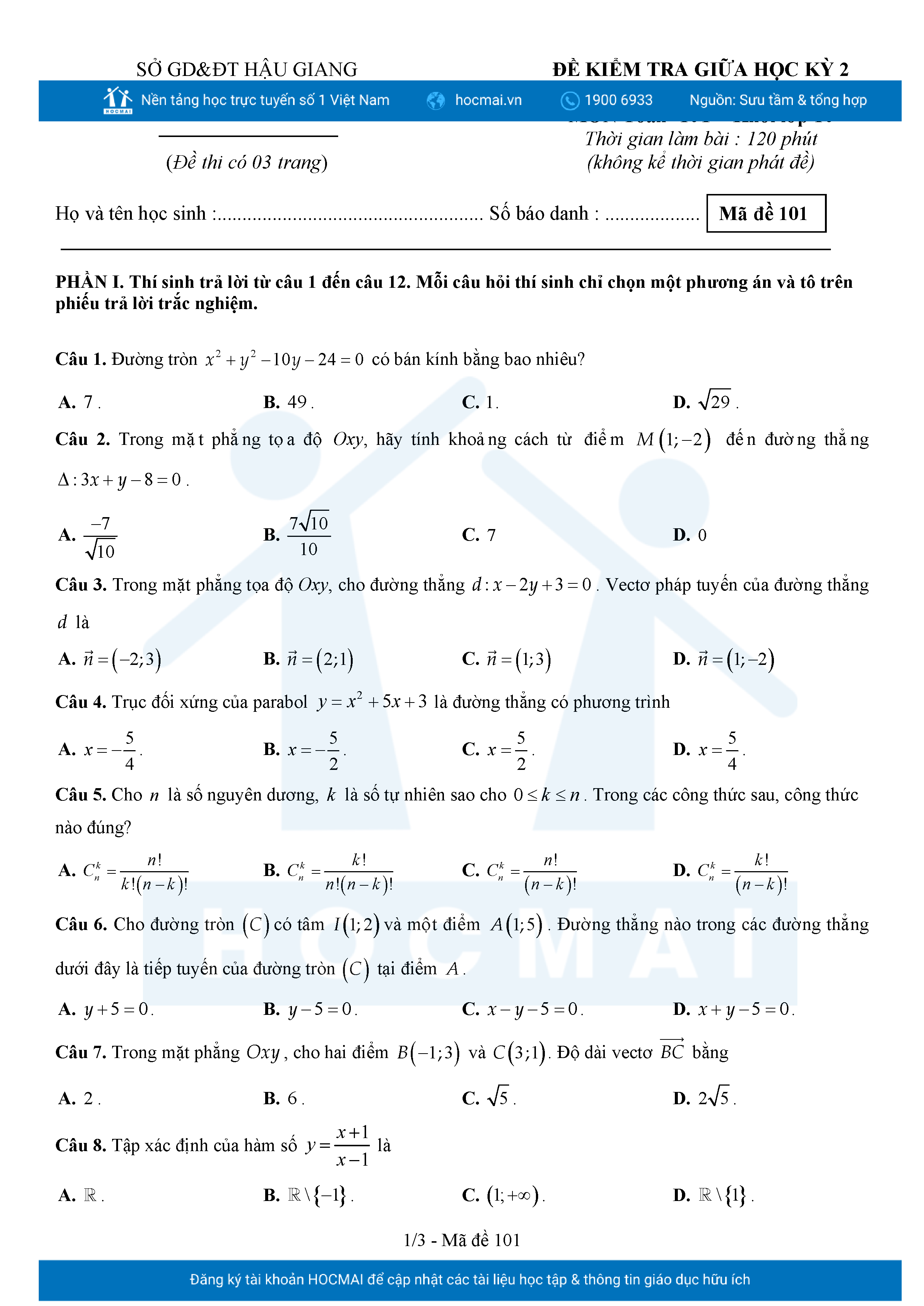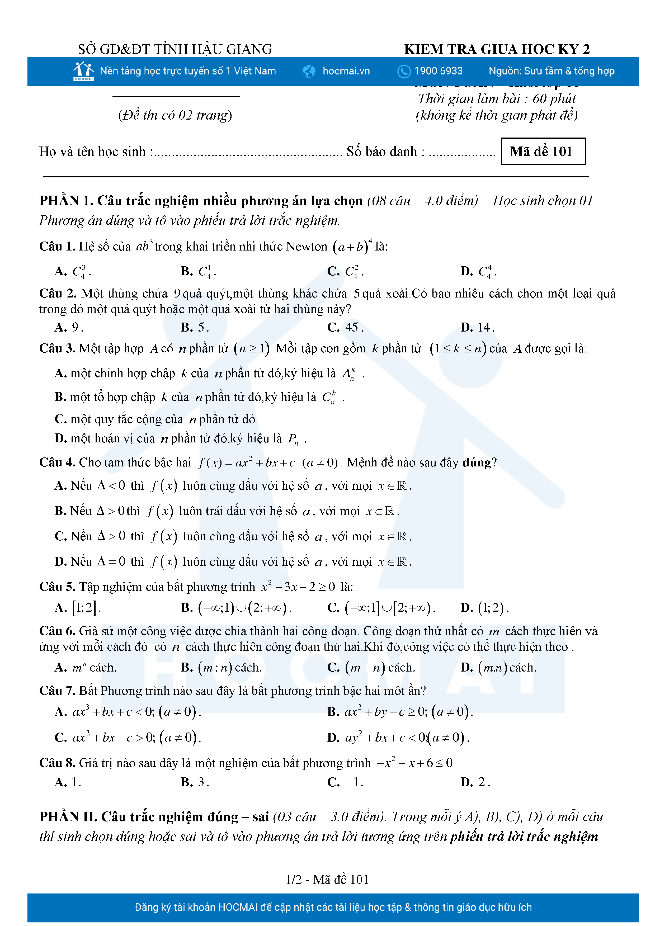 Đề giữa HK2 Toán 10 năm 2024 – 2025 trường THPT chuyên Vị Thanh – Hậu Giang