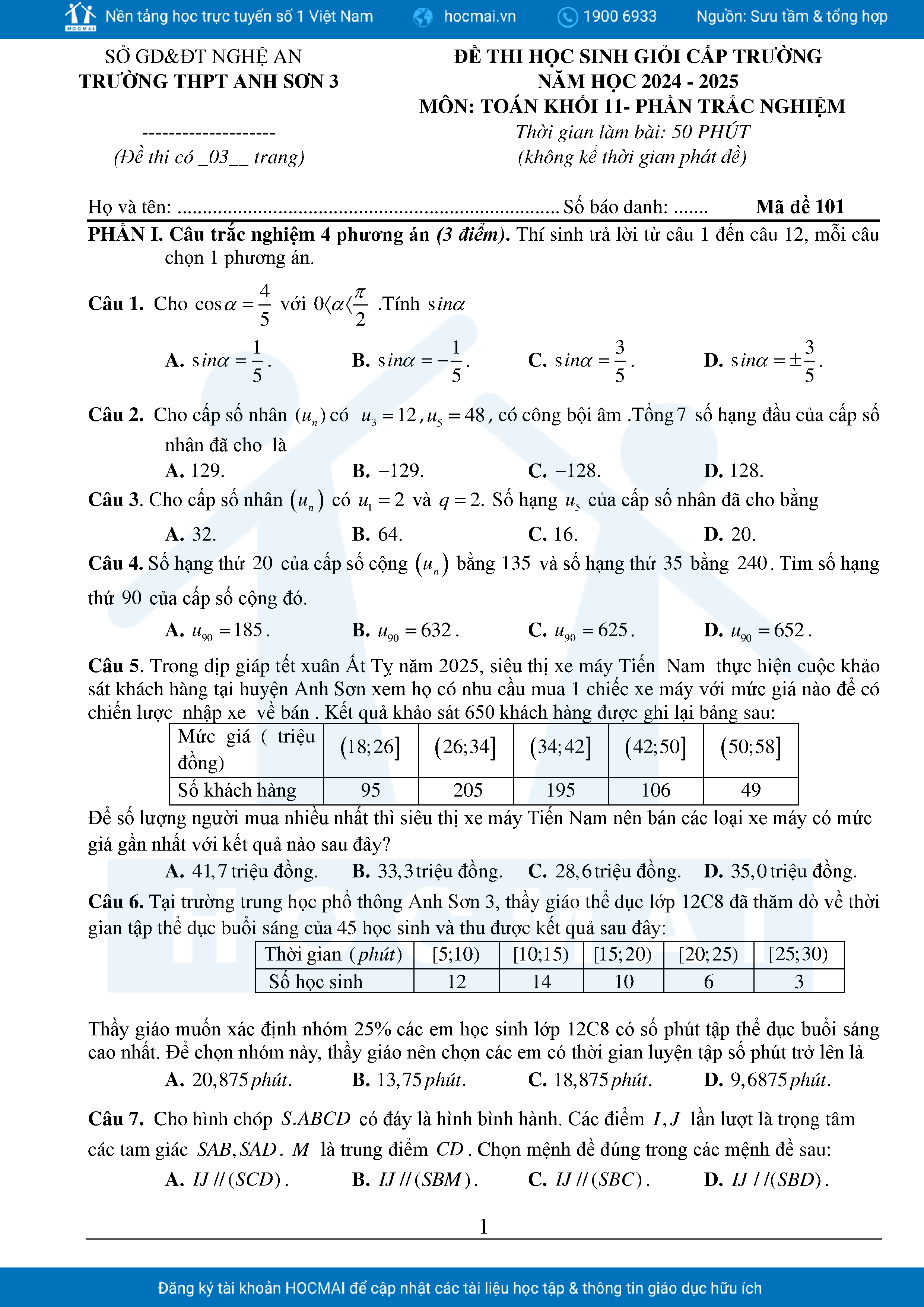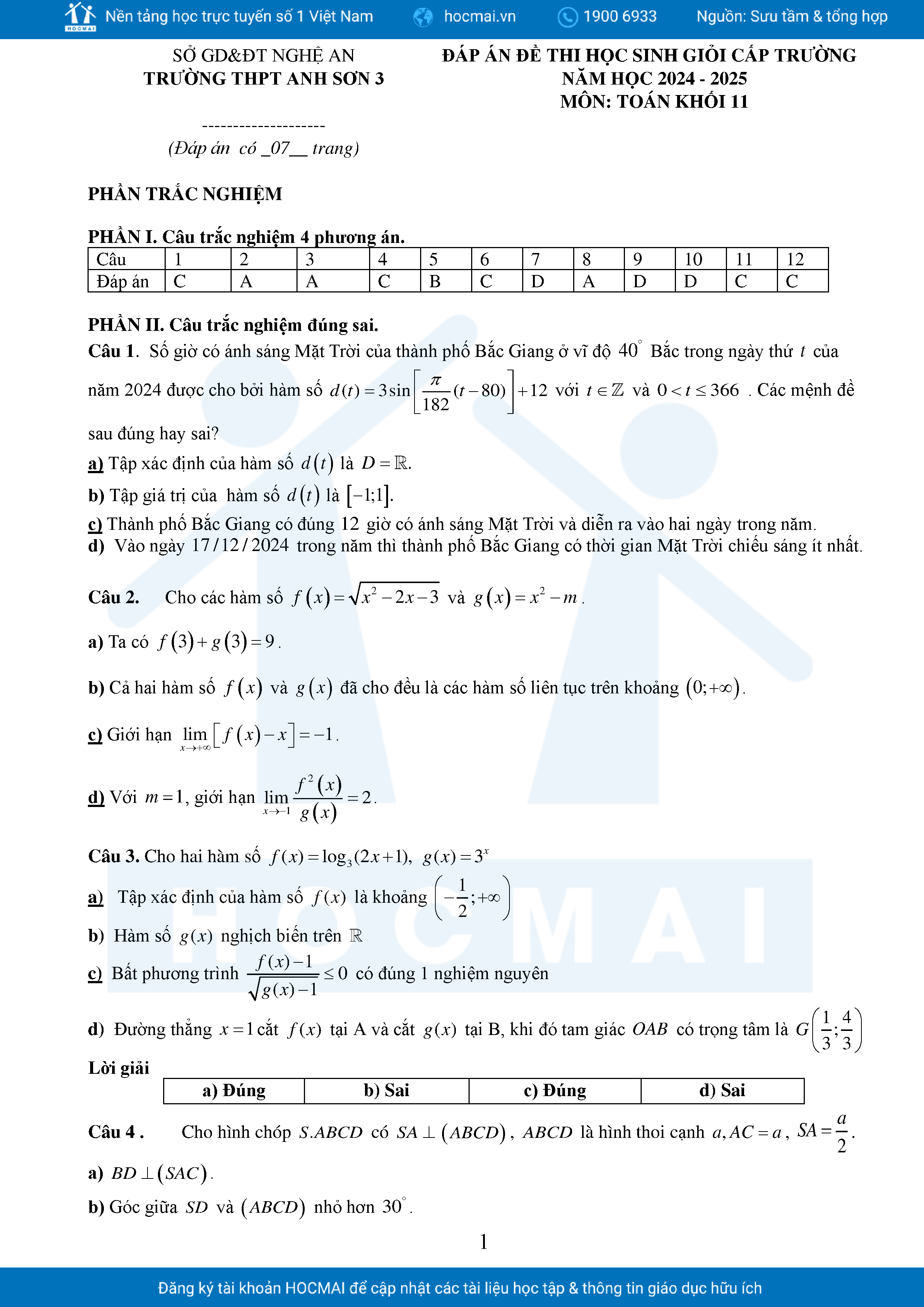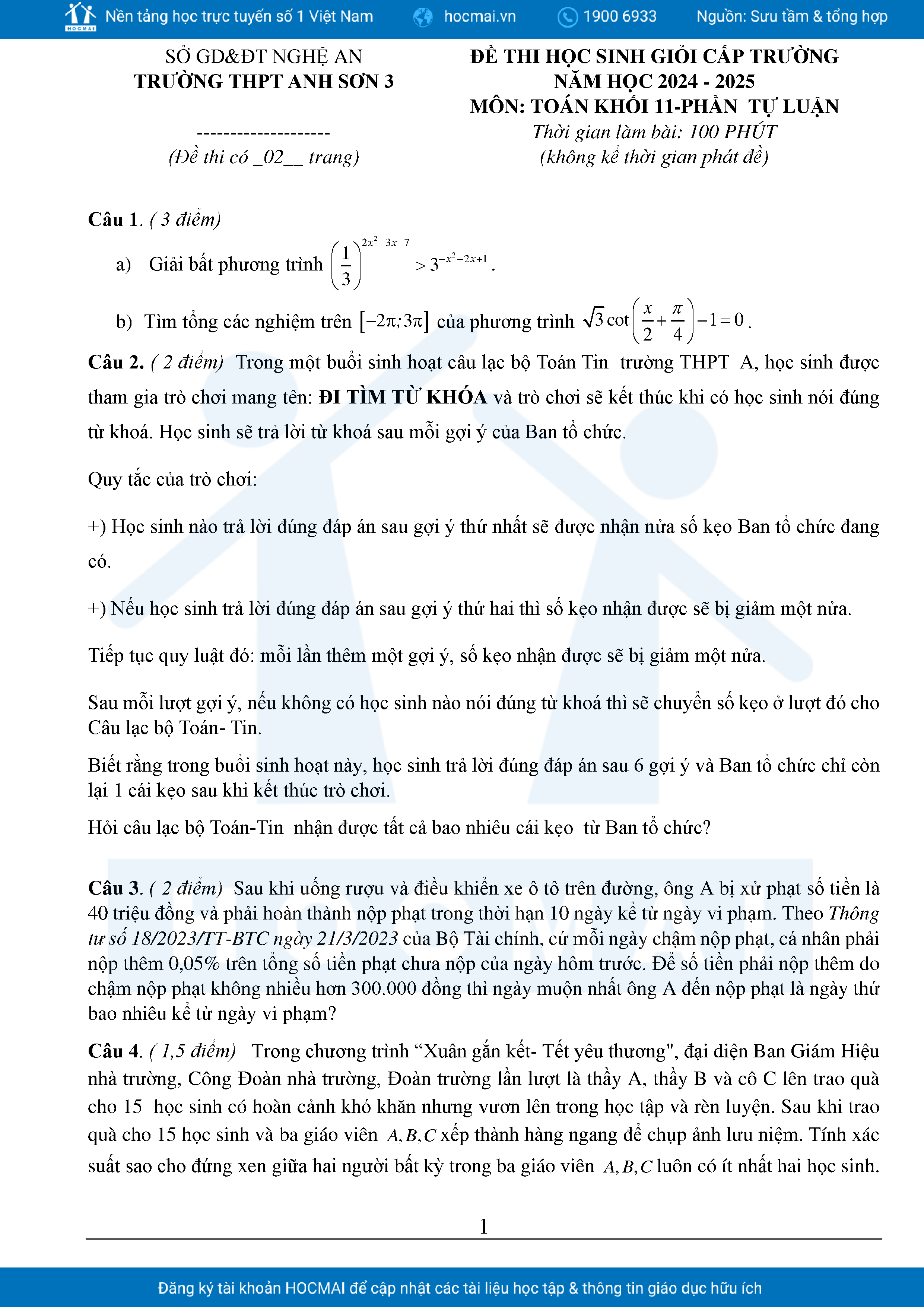 Đề thi HSG Toán 11 năm 2024 – 2025 trường THPT Anh Sơn 3 – Nghệ An kèm lời giải chi tiết.