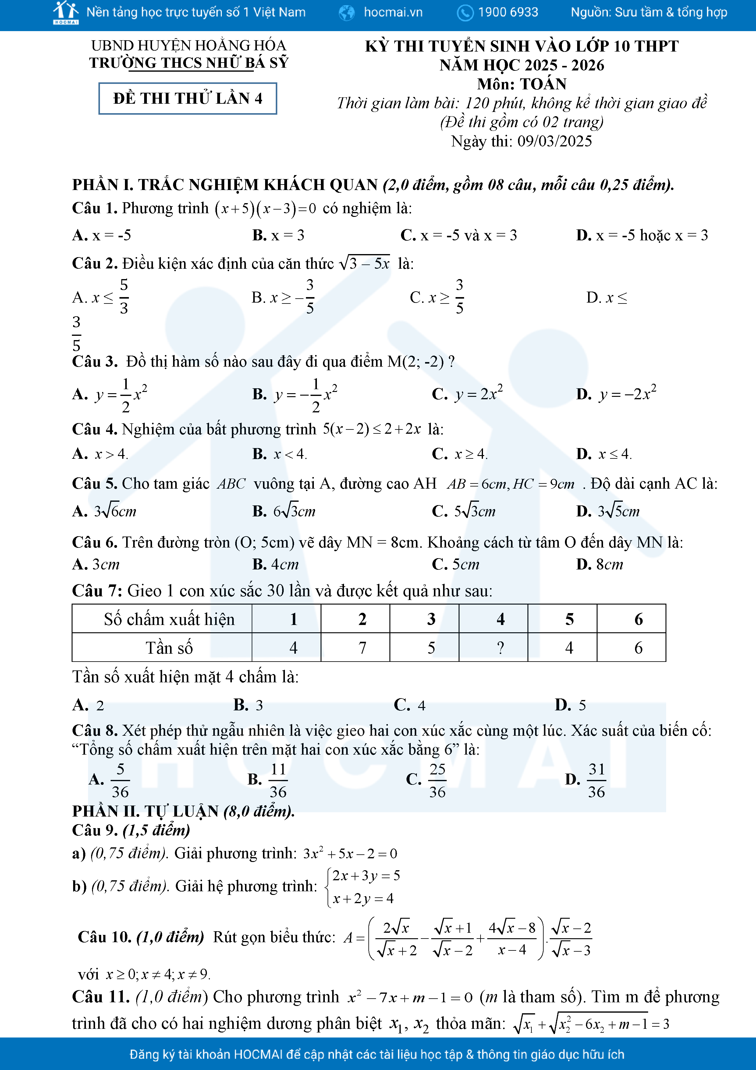 Đề thi thử Toán vào 10 năm 2025 – 2026 lần 4 trường THCS Nhữ Bá Sỹ – Thanh Hóa kèm lời giải chi tiết.