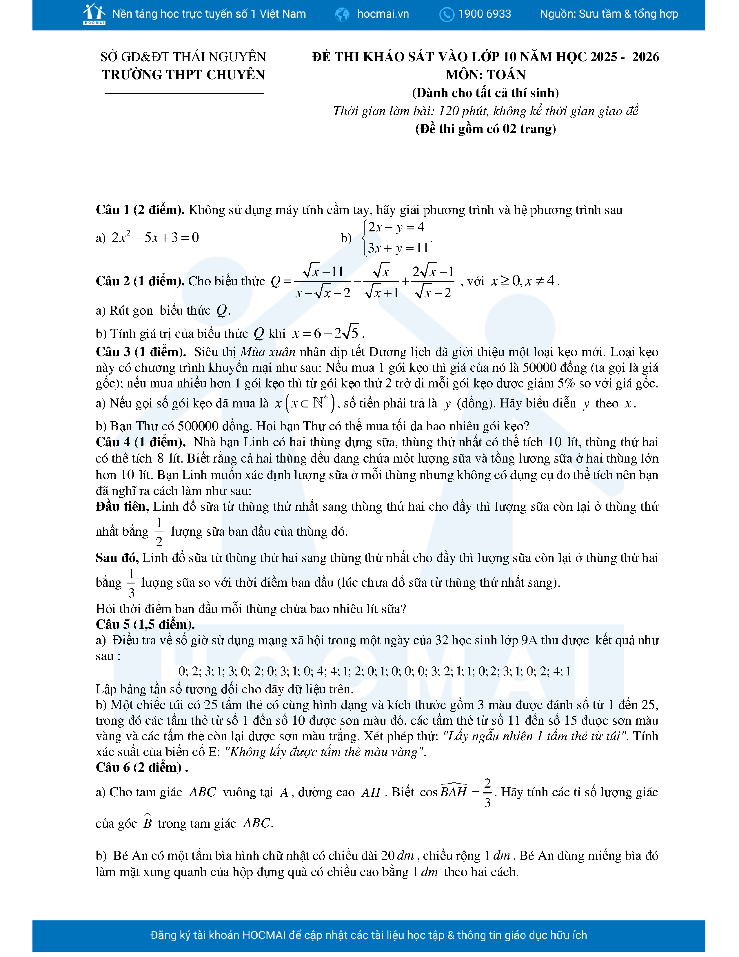 Đề khảo sát Toán (dành cho tất cả thí sinh) vào lớp 10 năm 2025 – 2026 trường THPT chuyên Thái Nguyên kèm lời giải chi tiết.