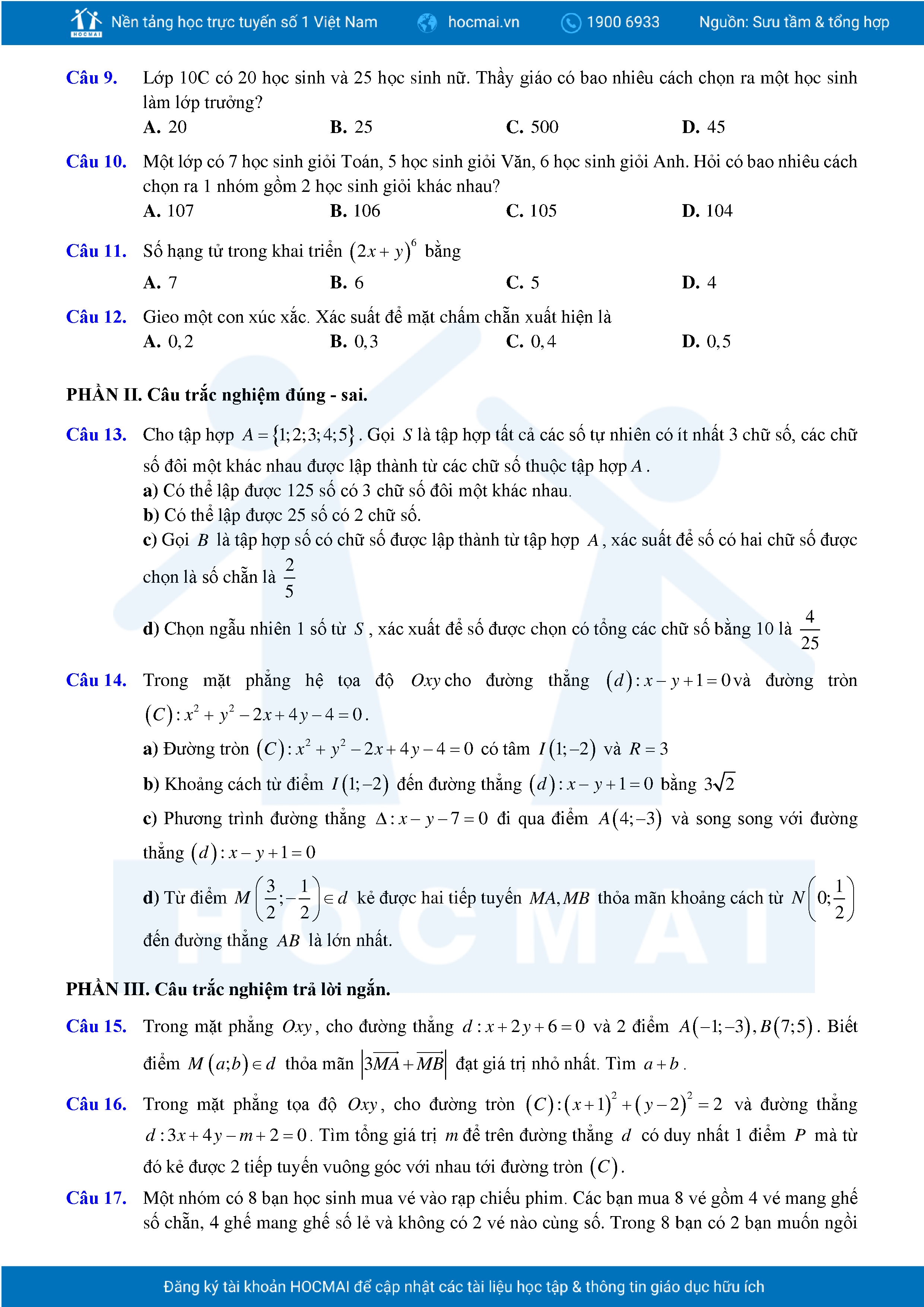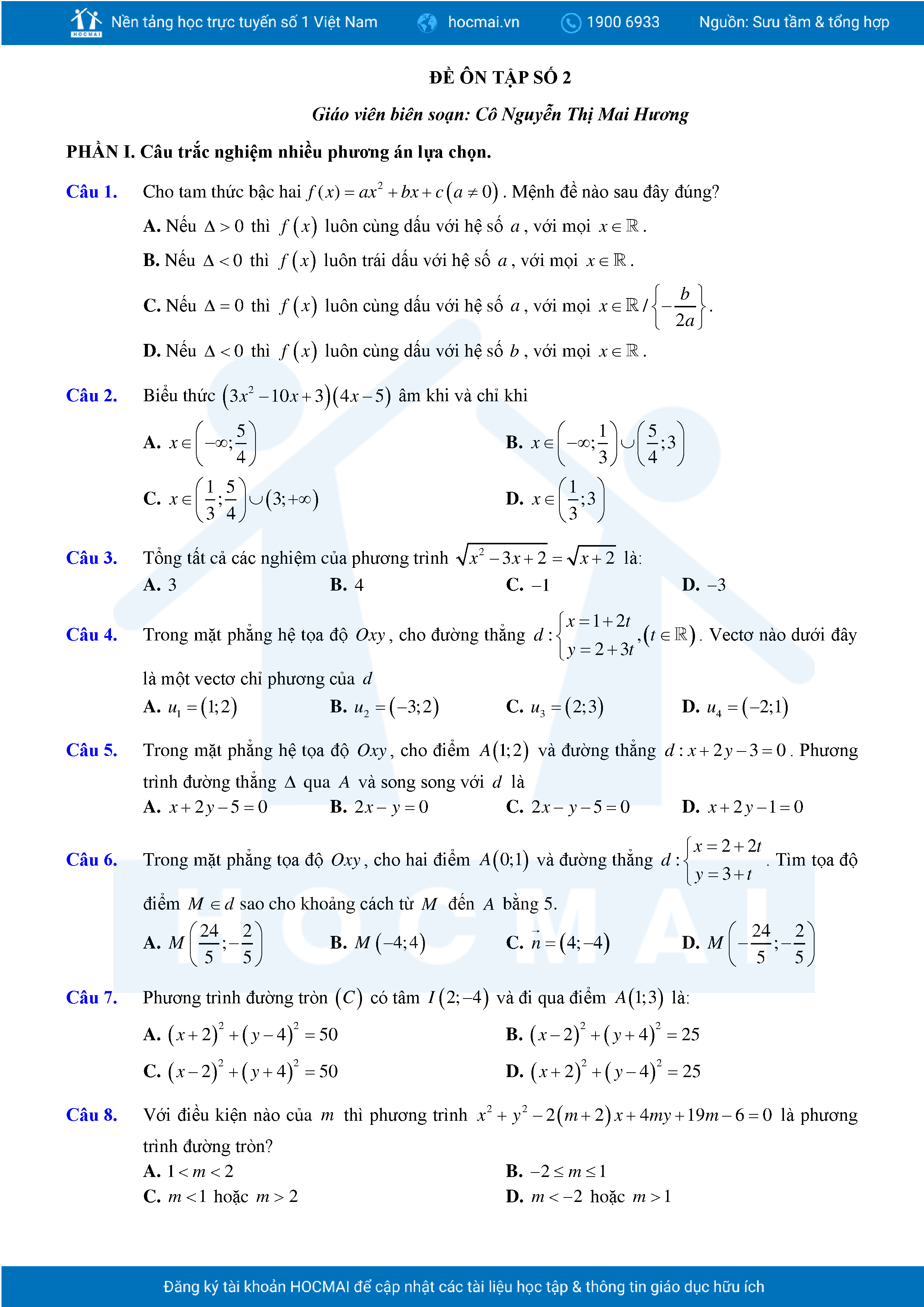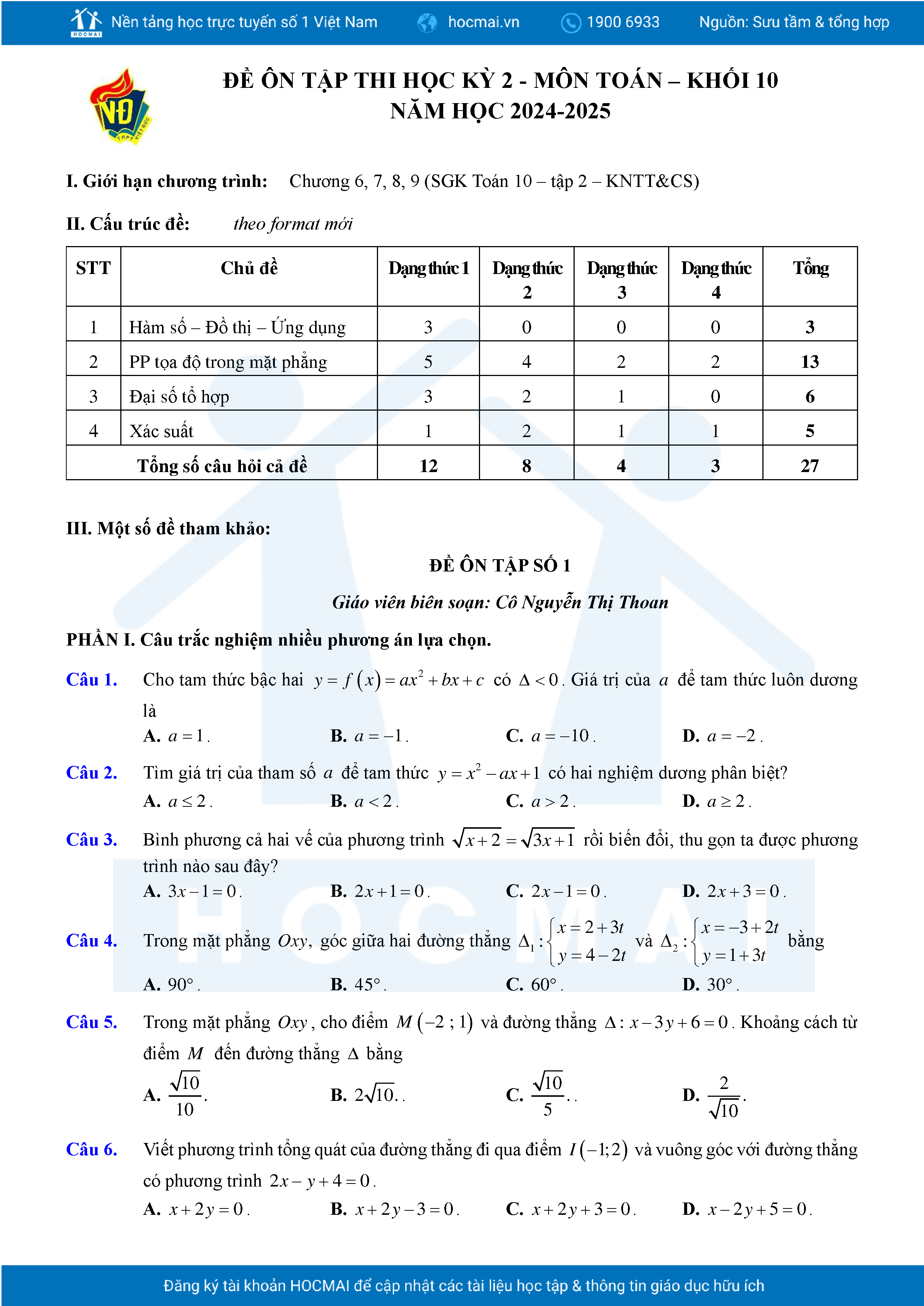 Đề ôn tập cuối học kỳ 2 Toán 10 năm 2024 – 2025 trường THPT Việt Đức – Hà Nội