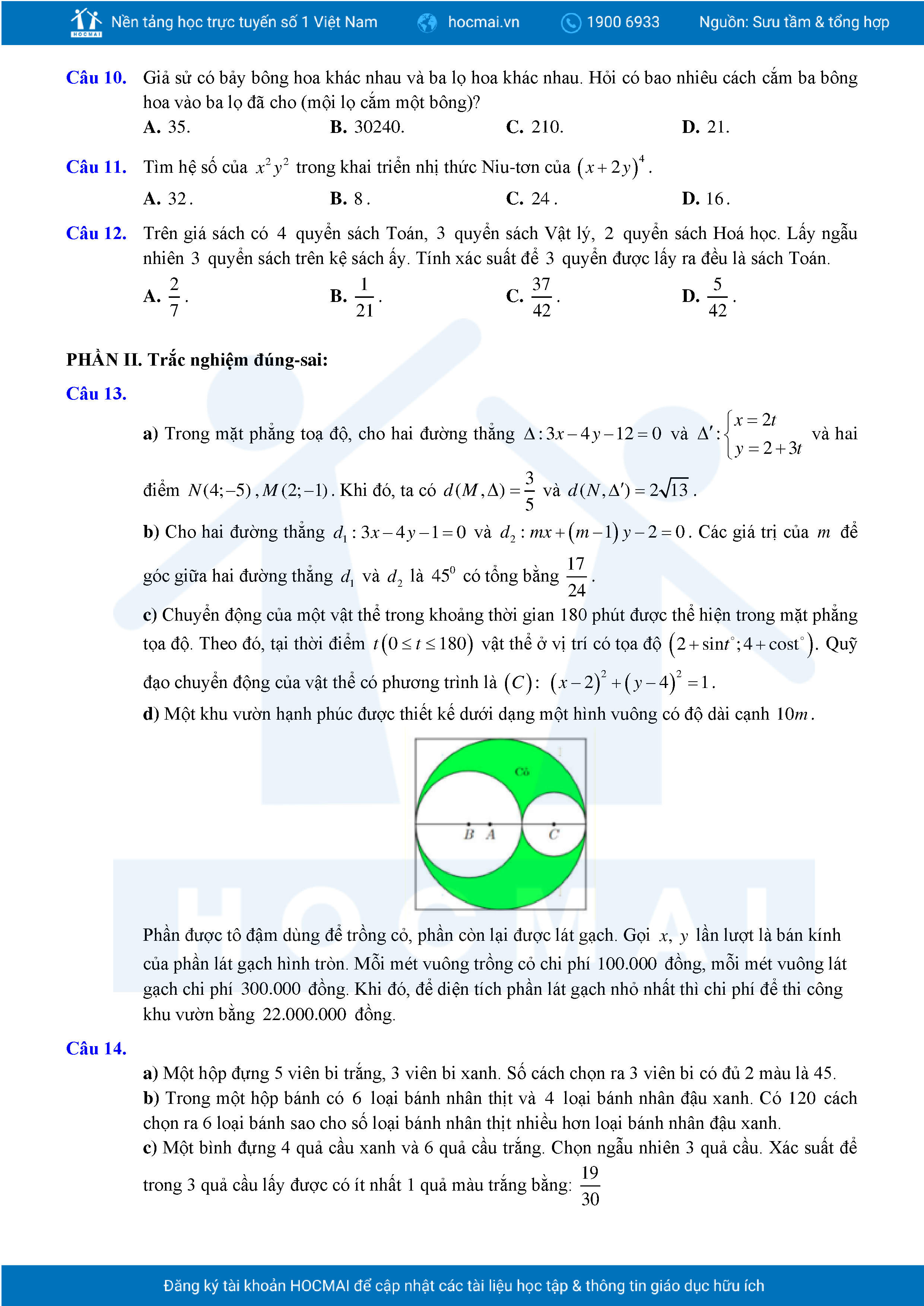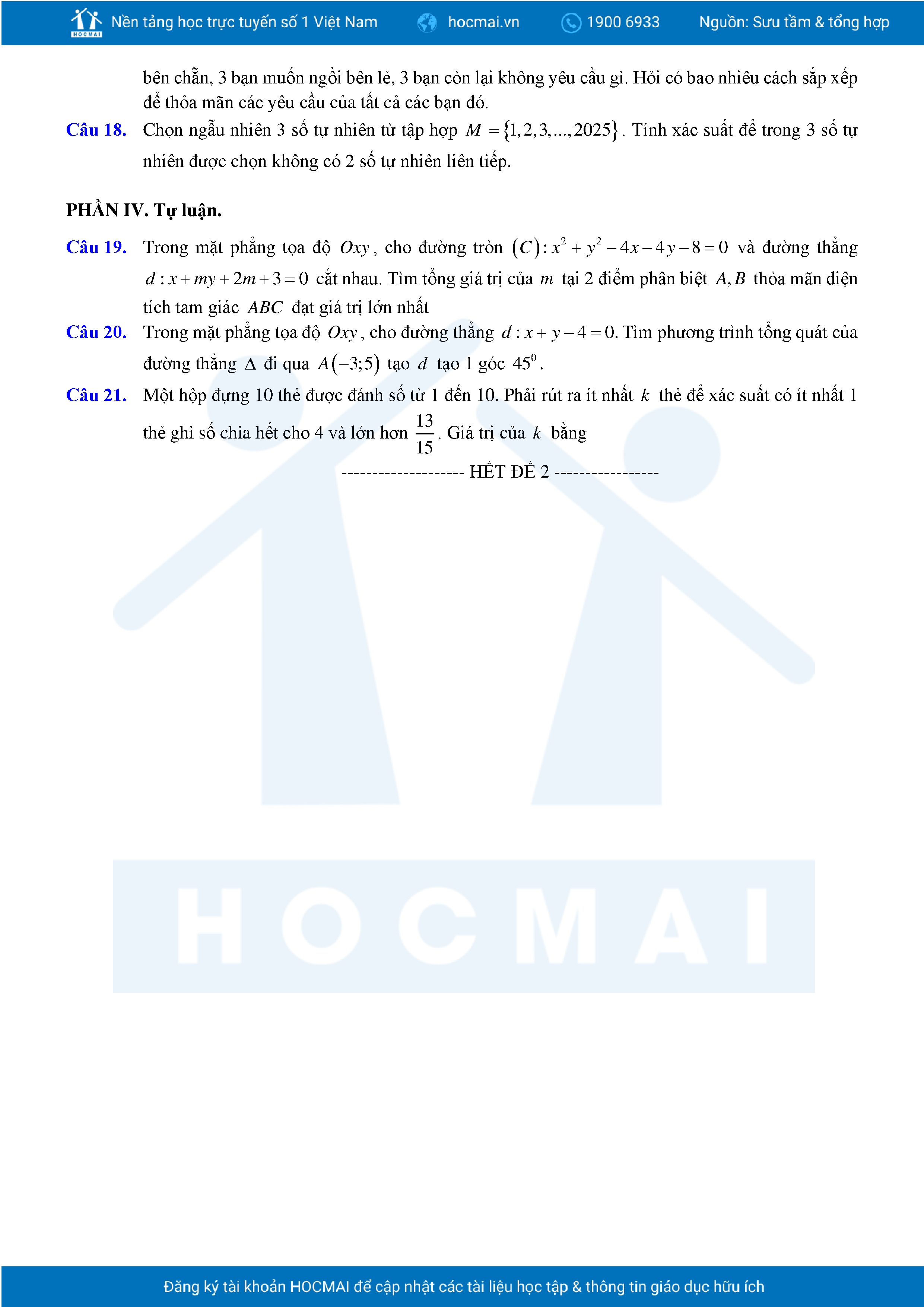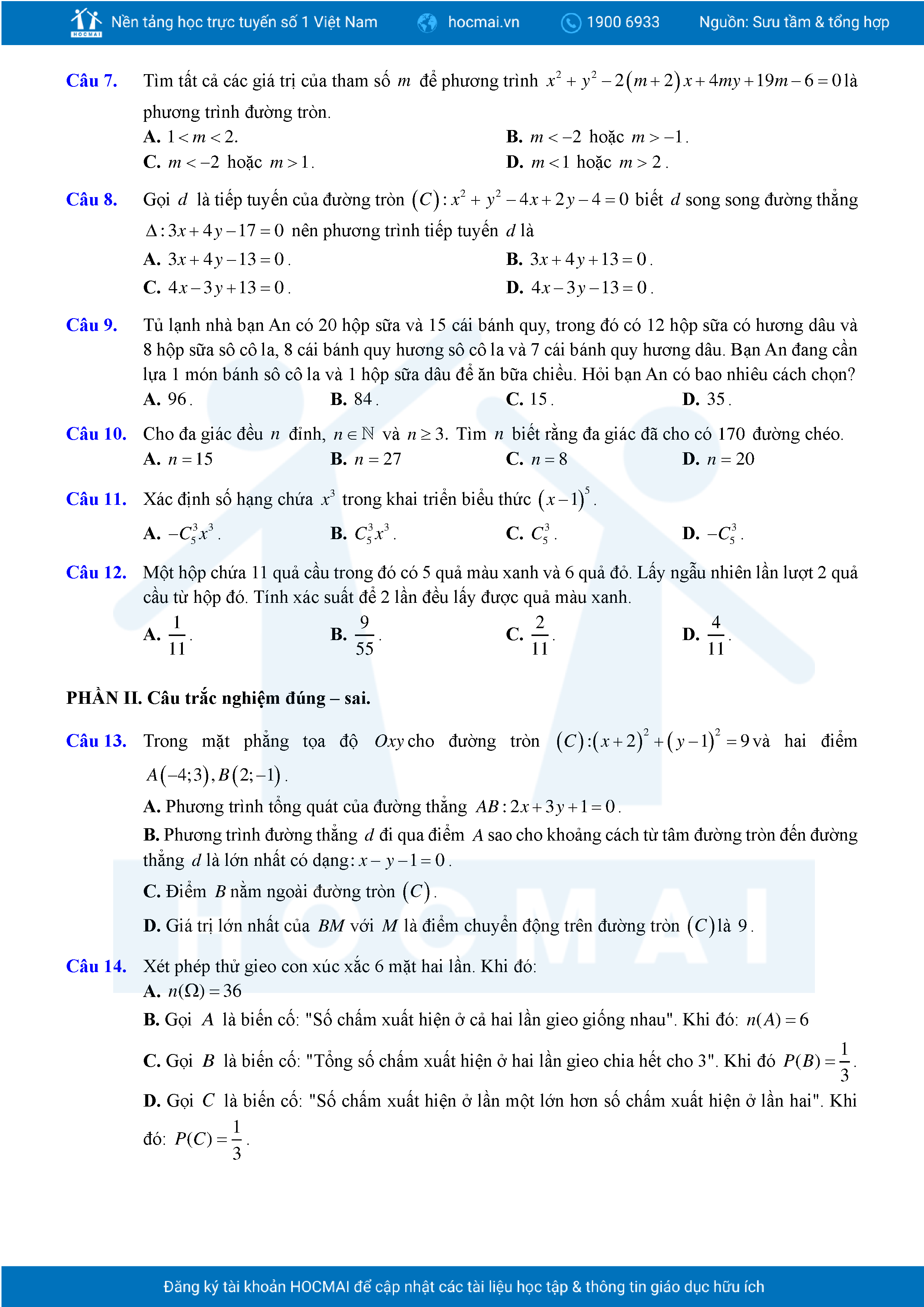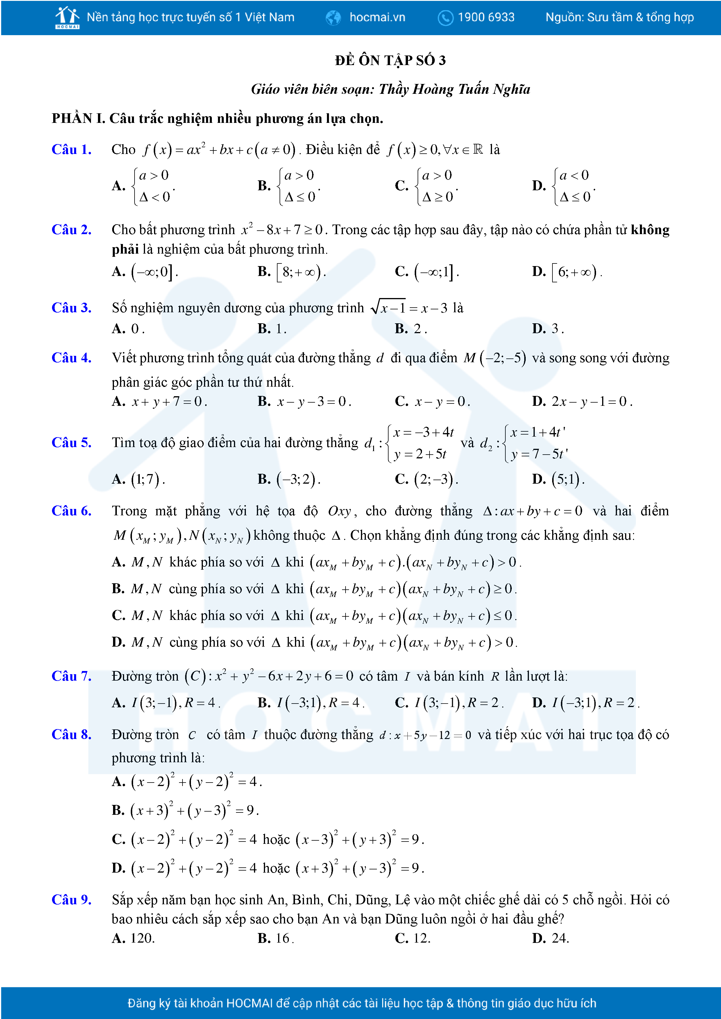 Đề ôn tập cuối học kỳ 2 Toán 10 năm 2024 – 2025 trường THPT Việt Đức – Hà Nội