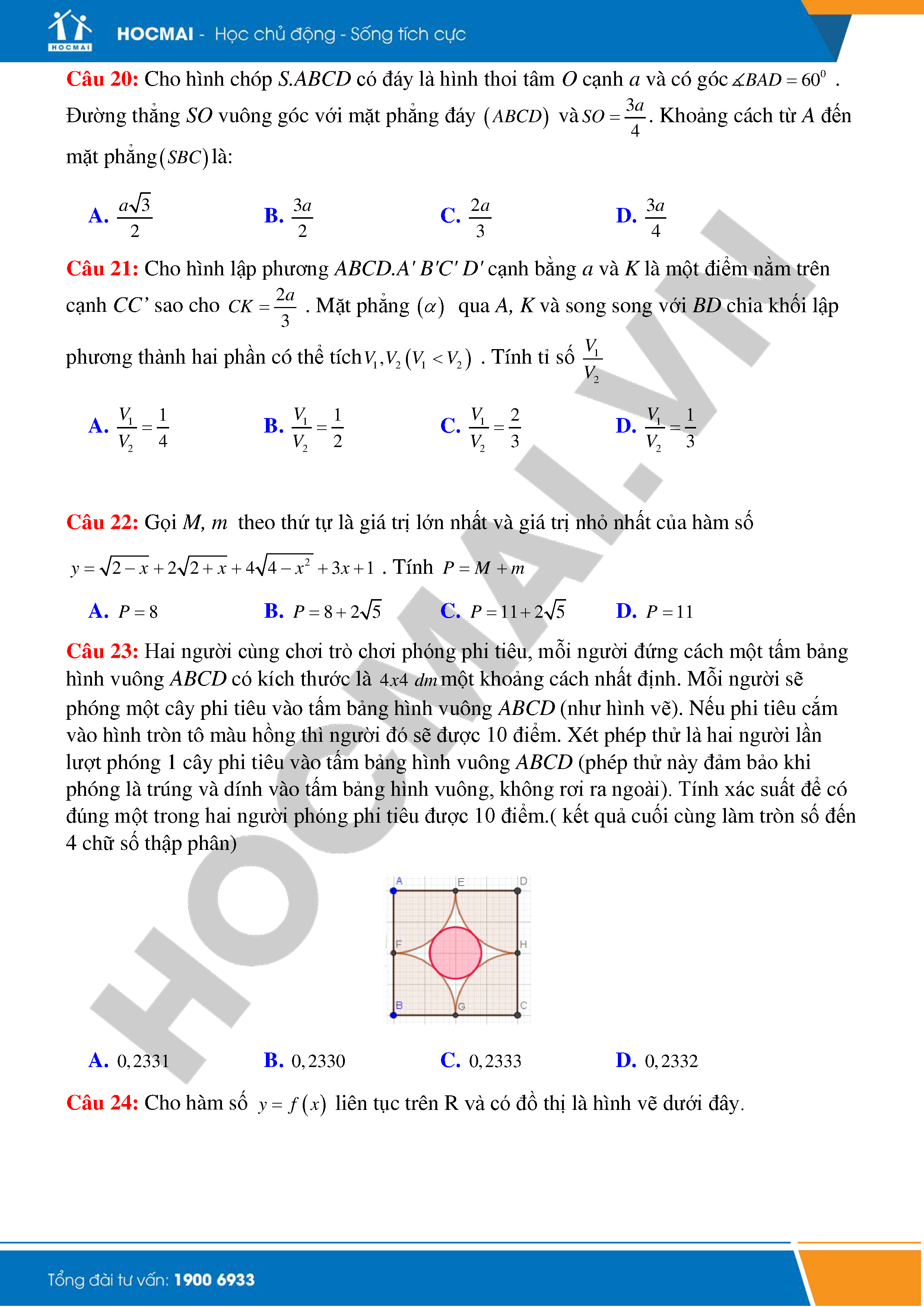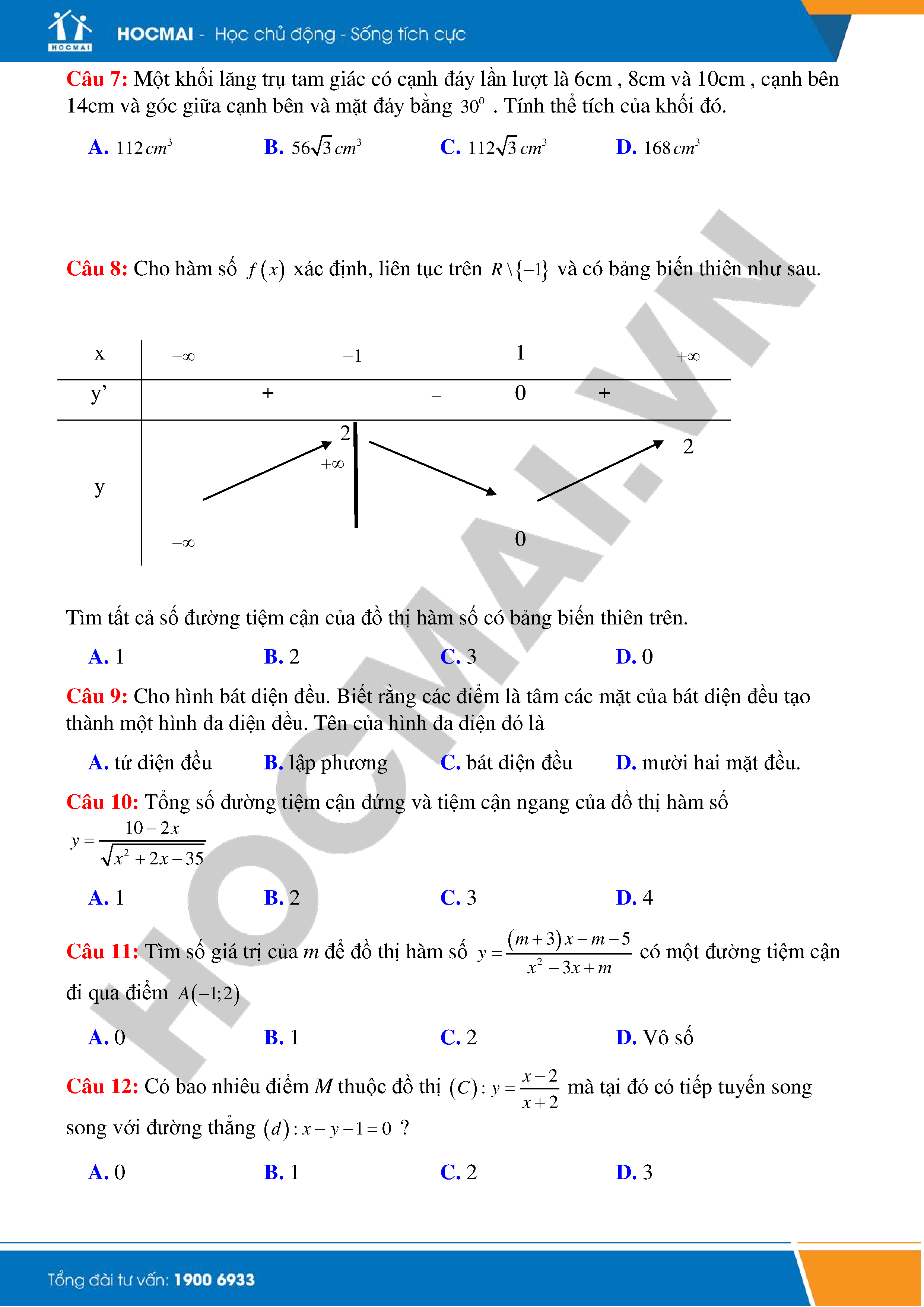 Đề kiểm tra chất lượng định kỳ môn Toán (Lần 9) Năm học 2017-2018 do HOCMAI sưu tầm bao gồm 25 câu, mỗi câu 0,4 điểm dưới hình thức trắc nghiệm. Bộ đề được khoanh vùng trong phạm vi kiến thức lớp 12. Các bạn cùng nhau tham khảo và học tốt nhé!