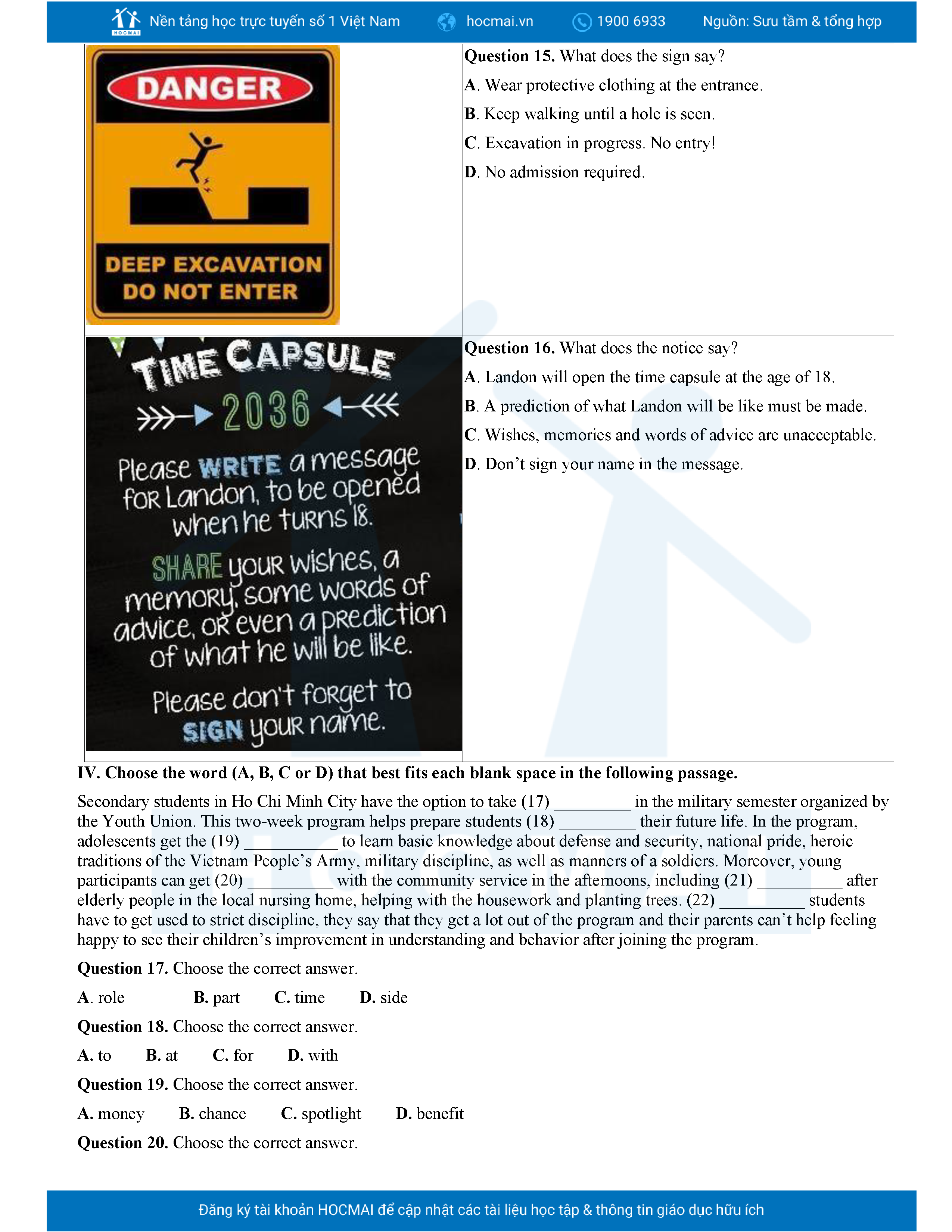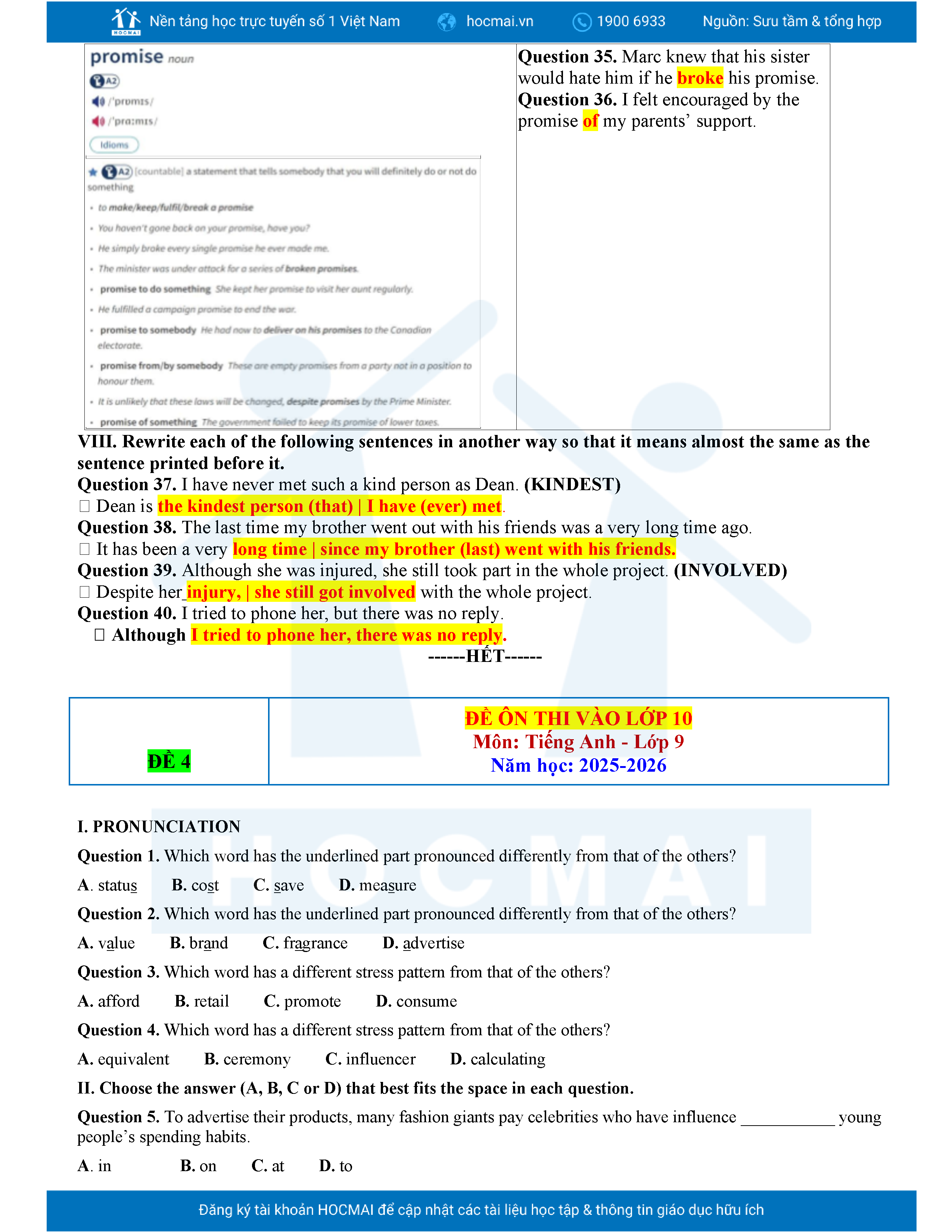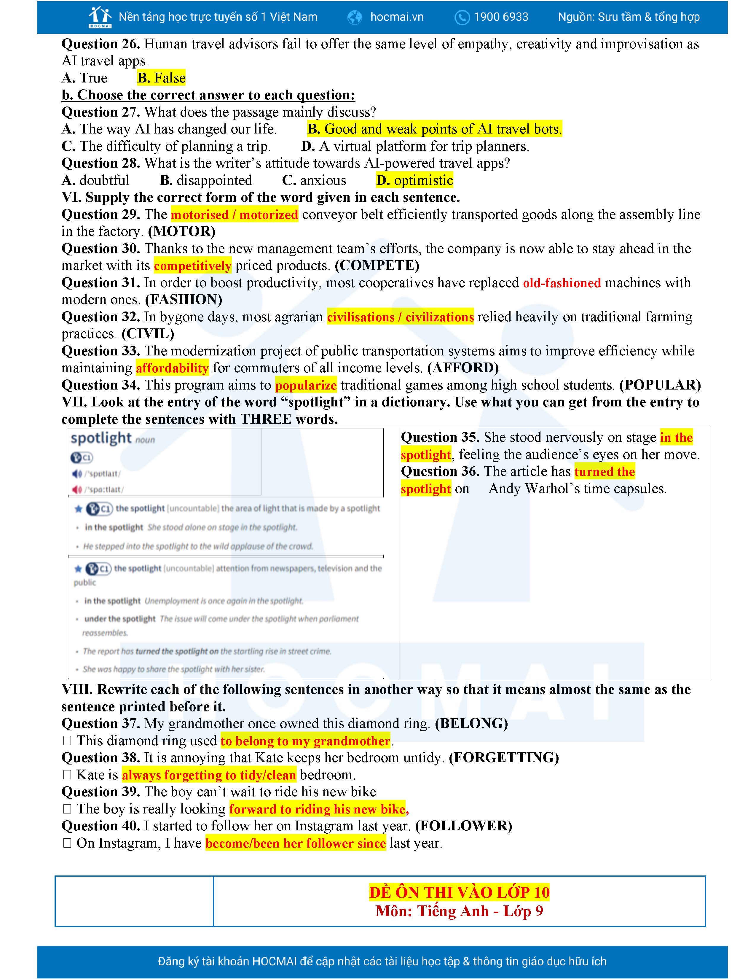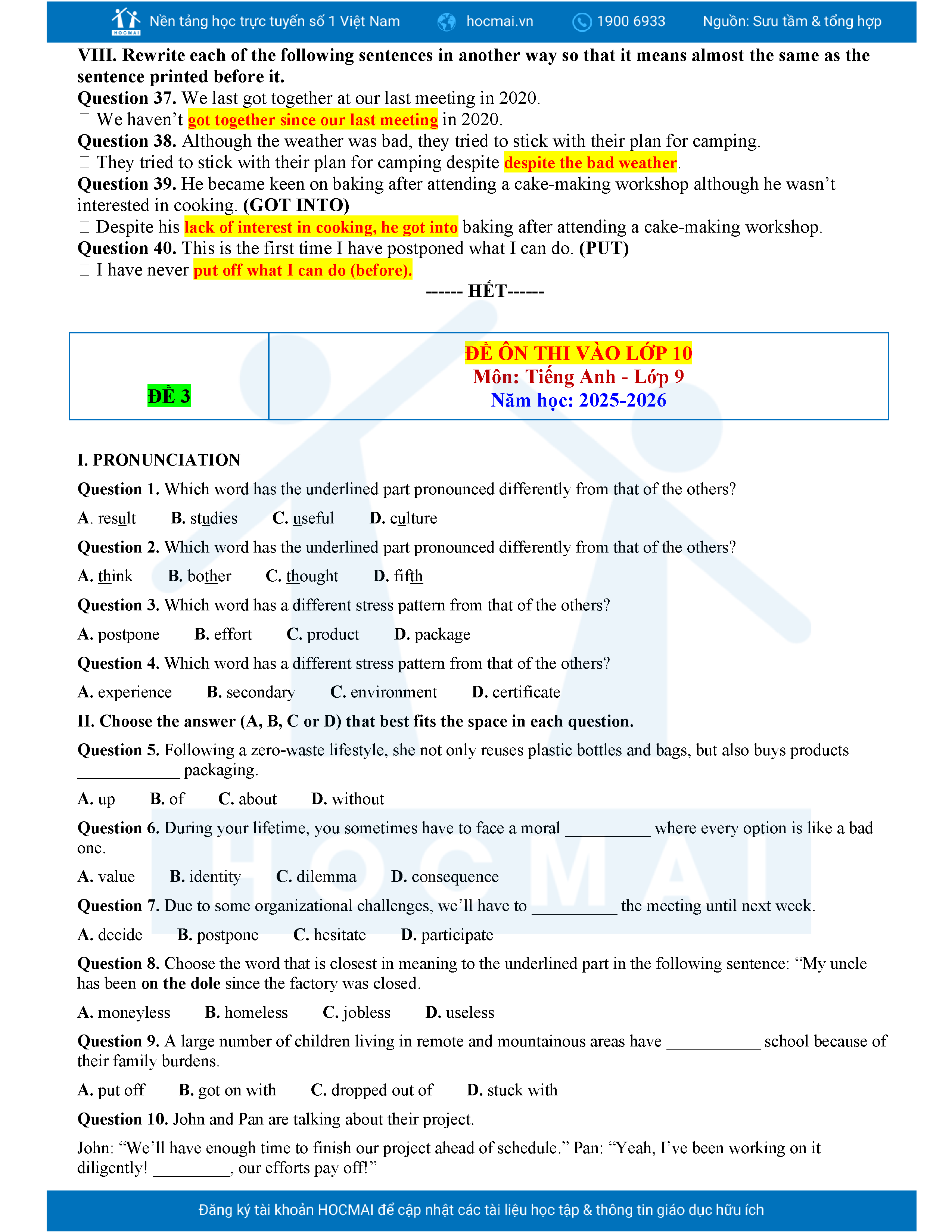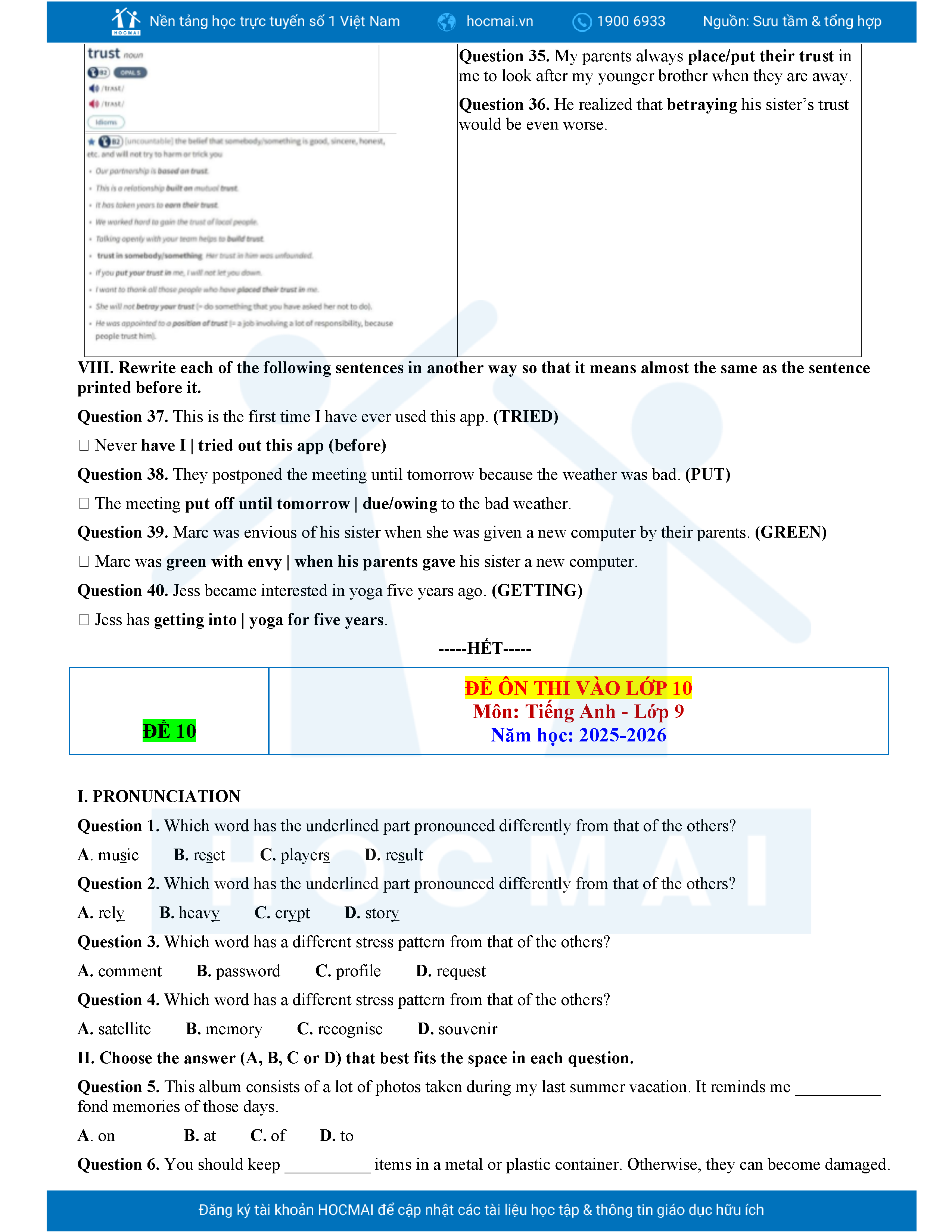 Bộ 10 đề Tiếng Anh ôn thi vào 10 TPHCM
