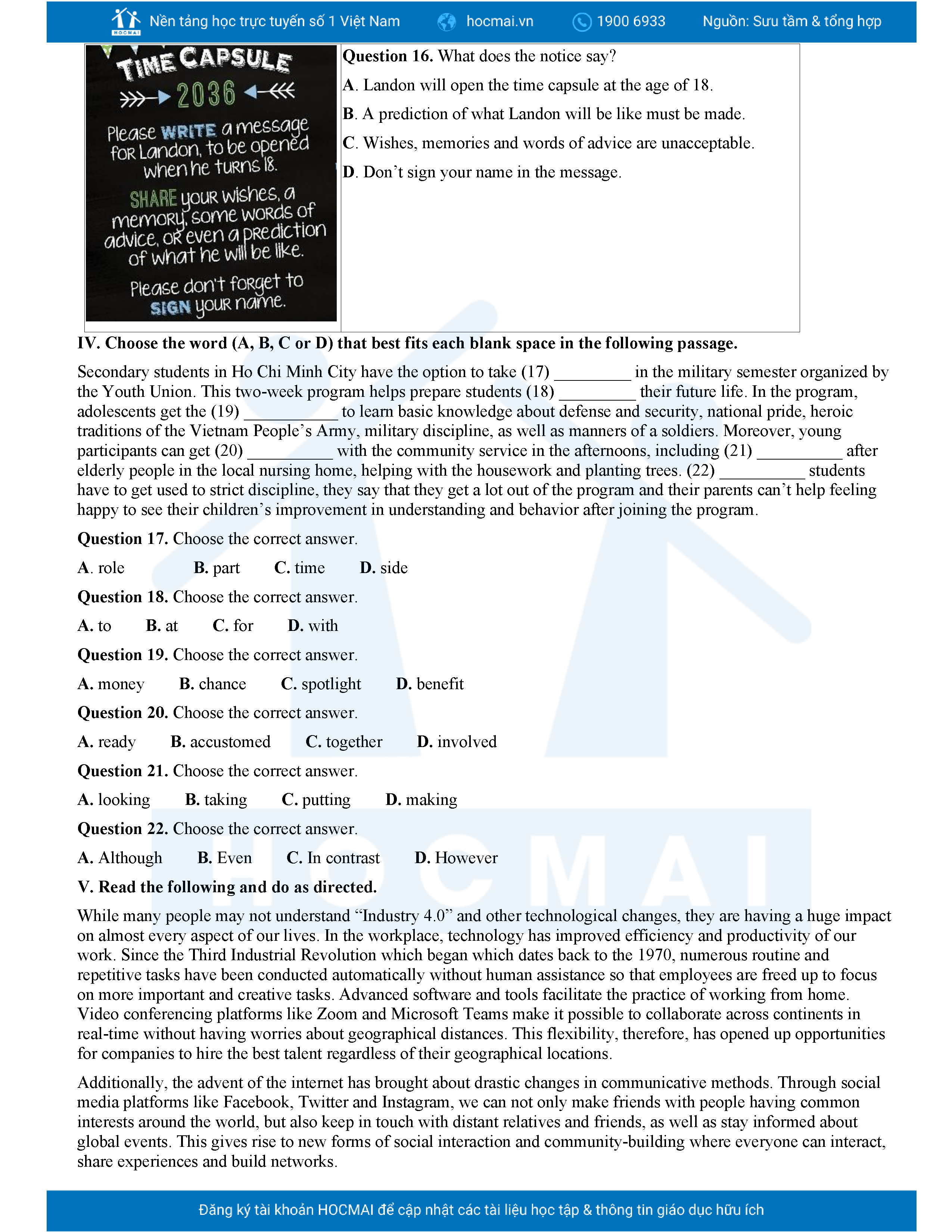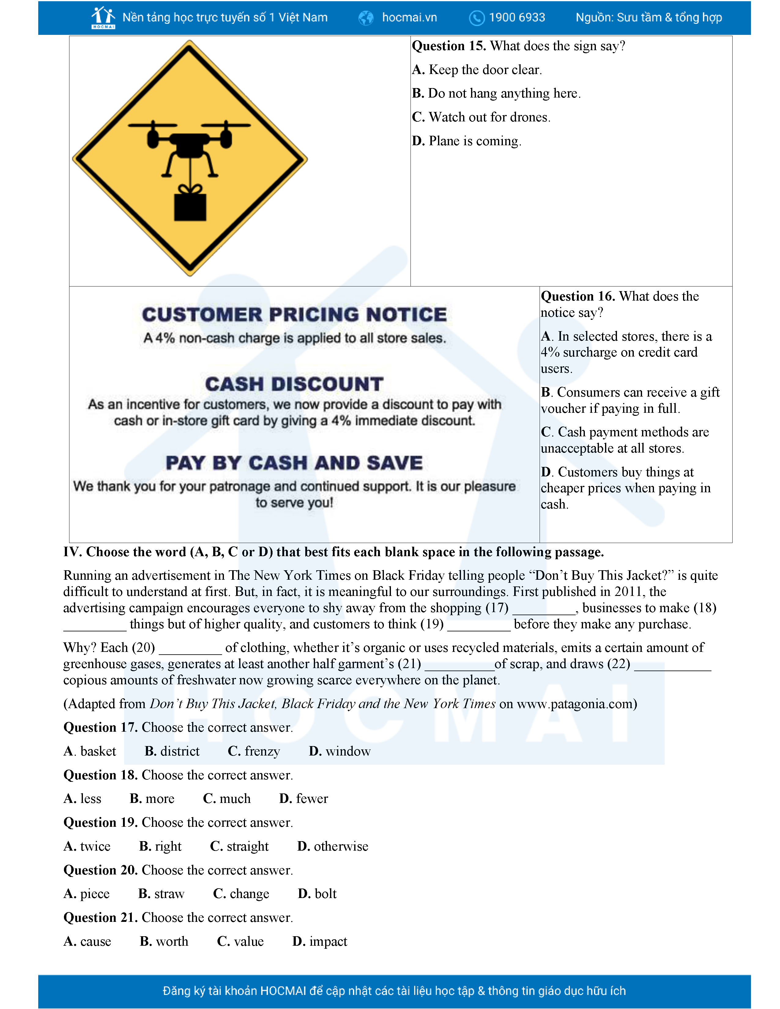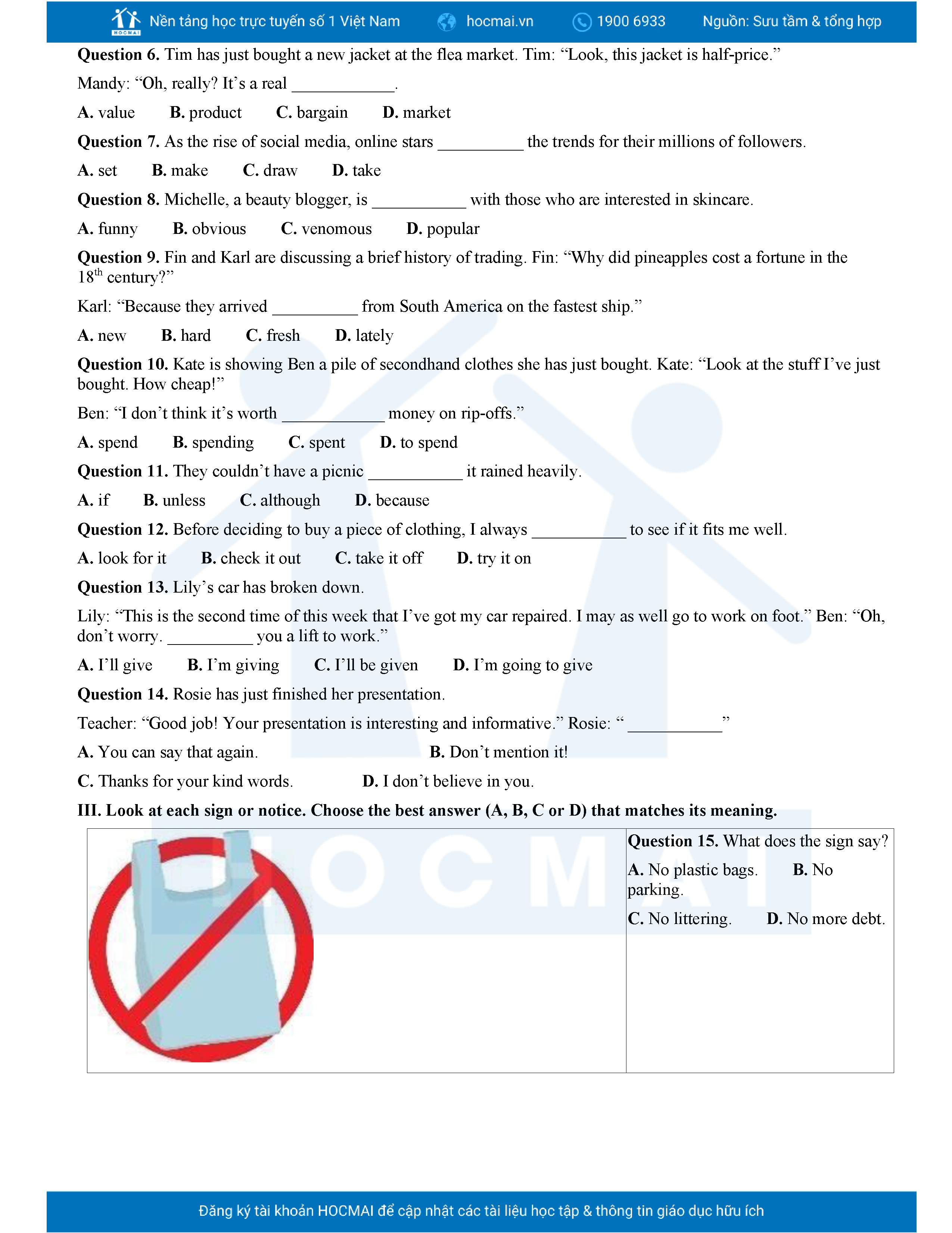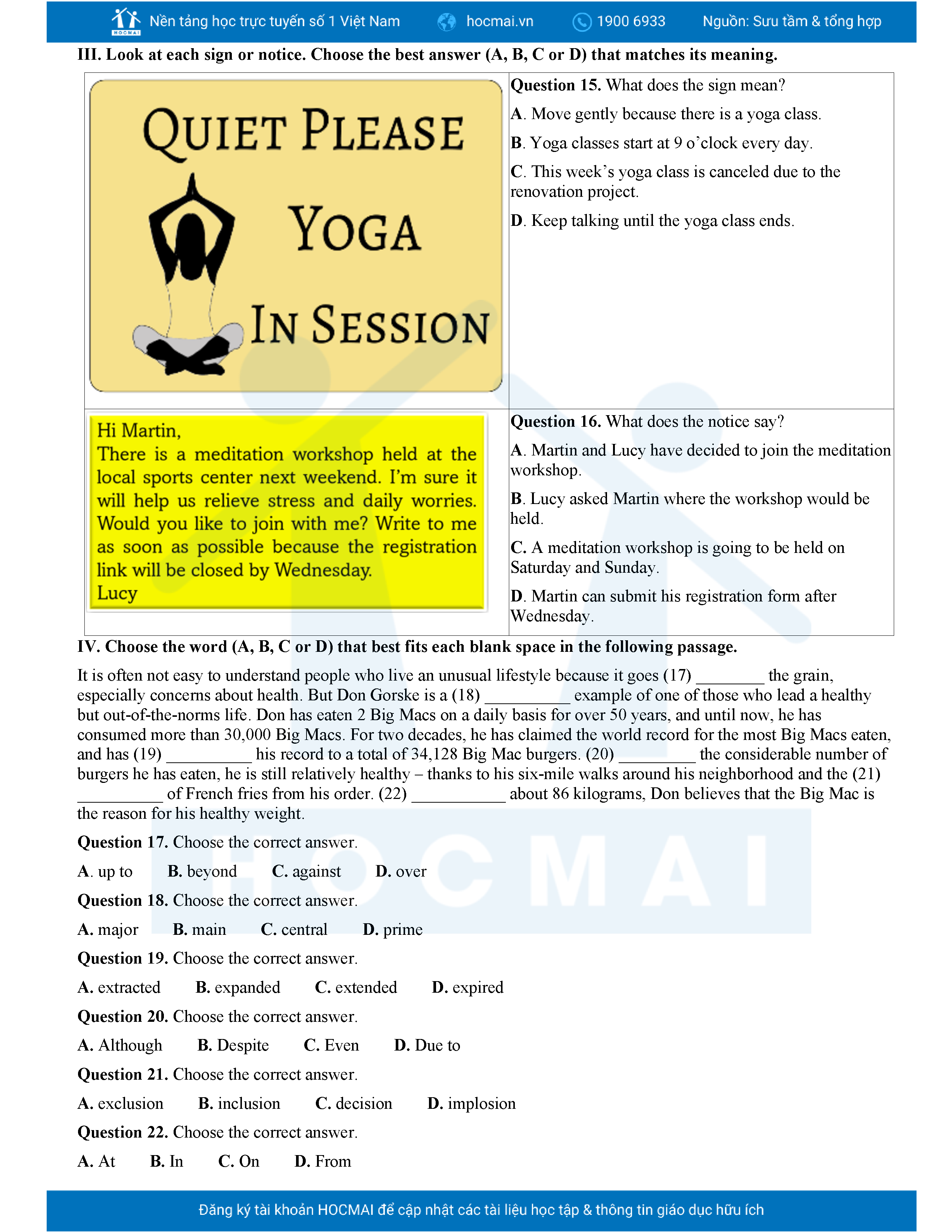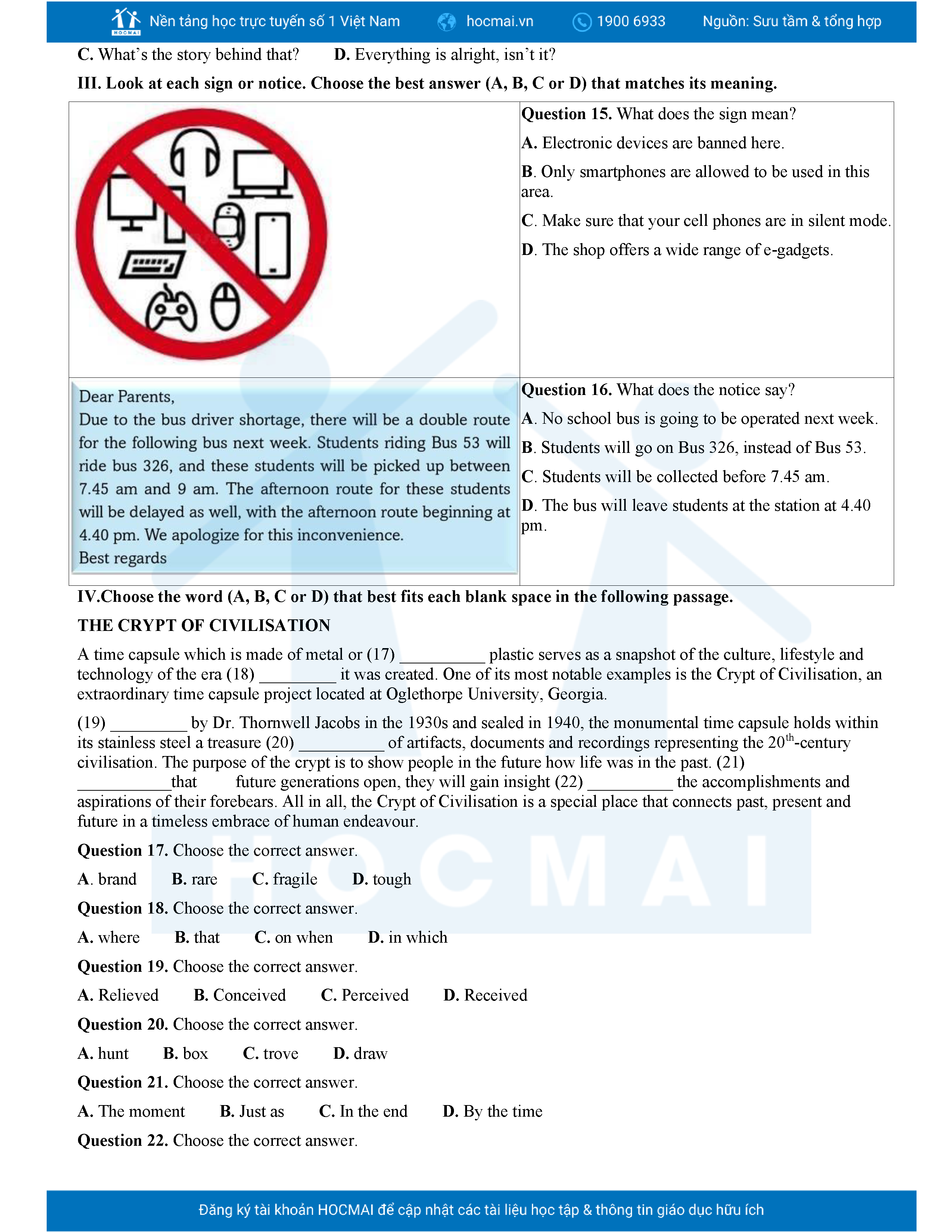 Bộ 10 đề Tiếng Anh ôn thi vào 10 TPHCM