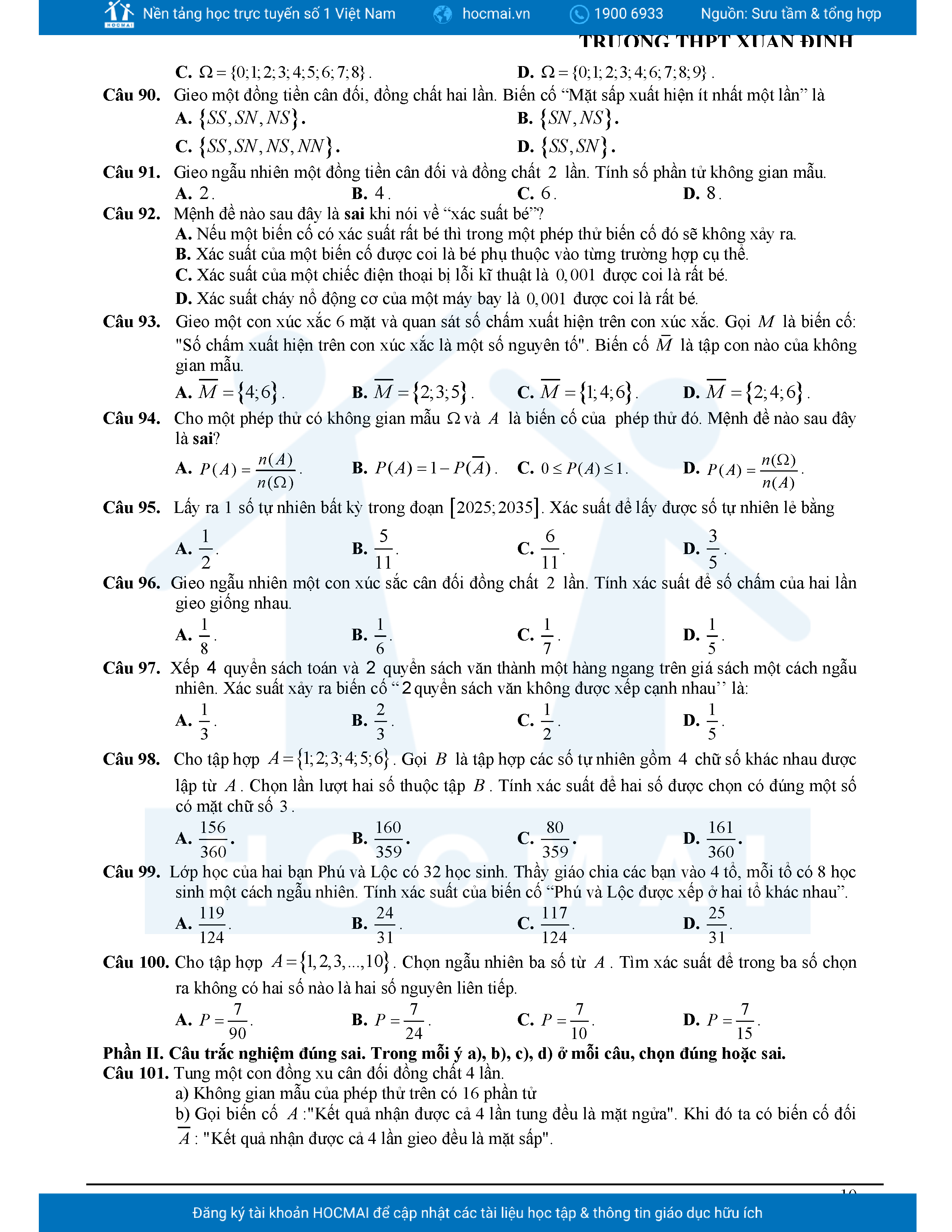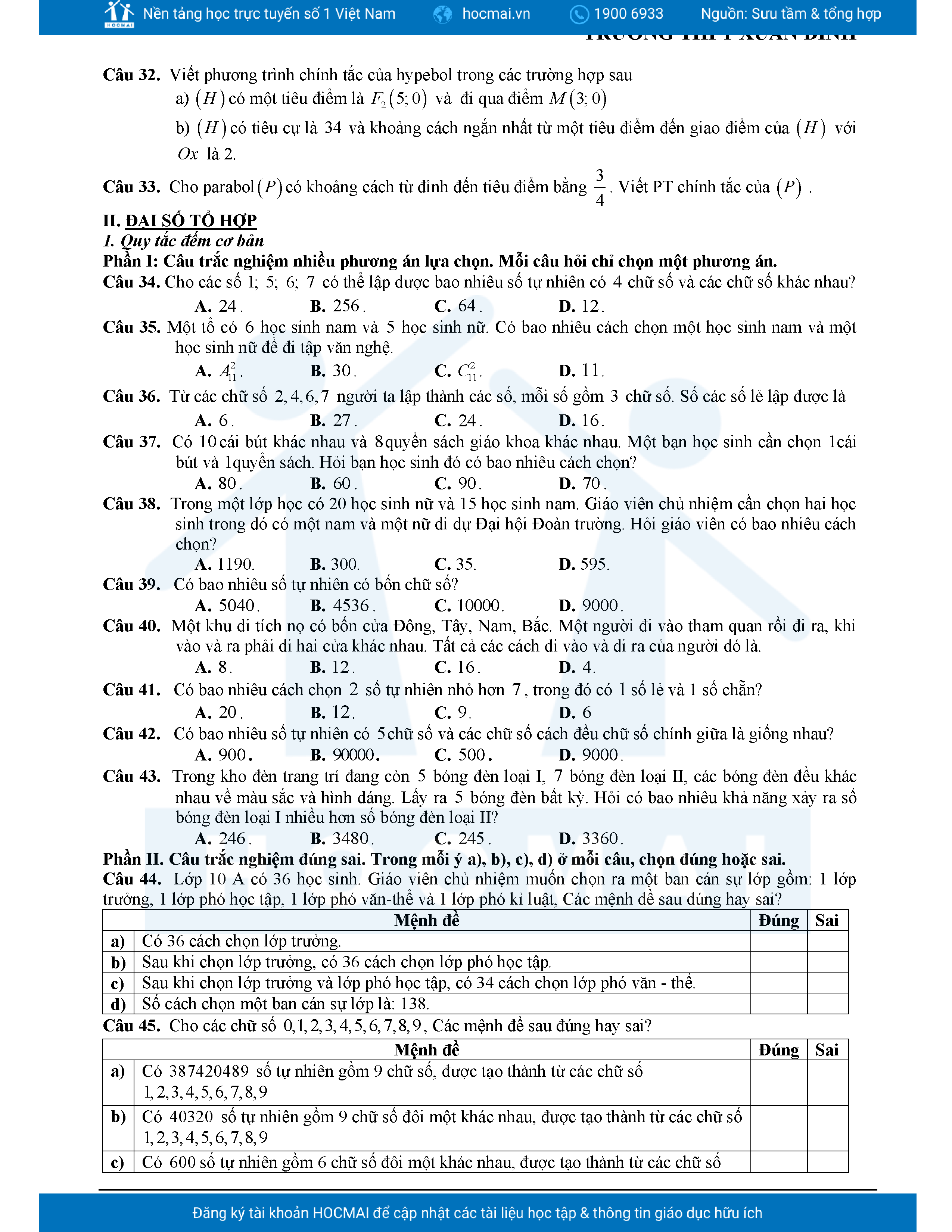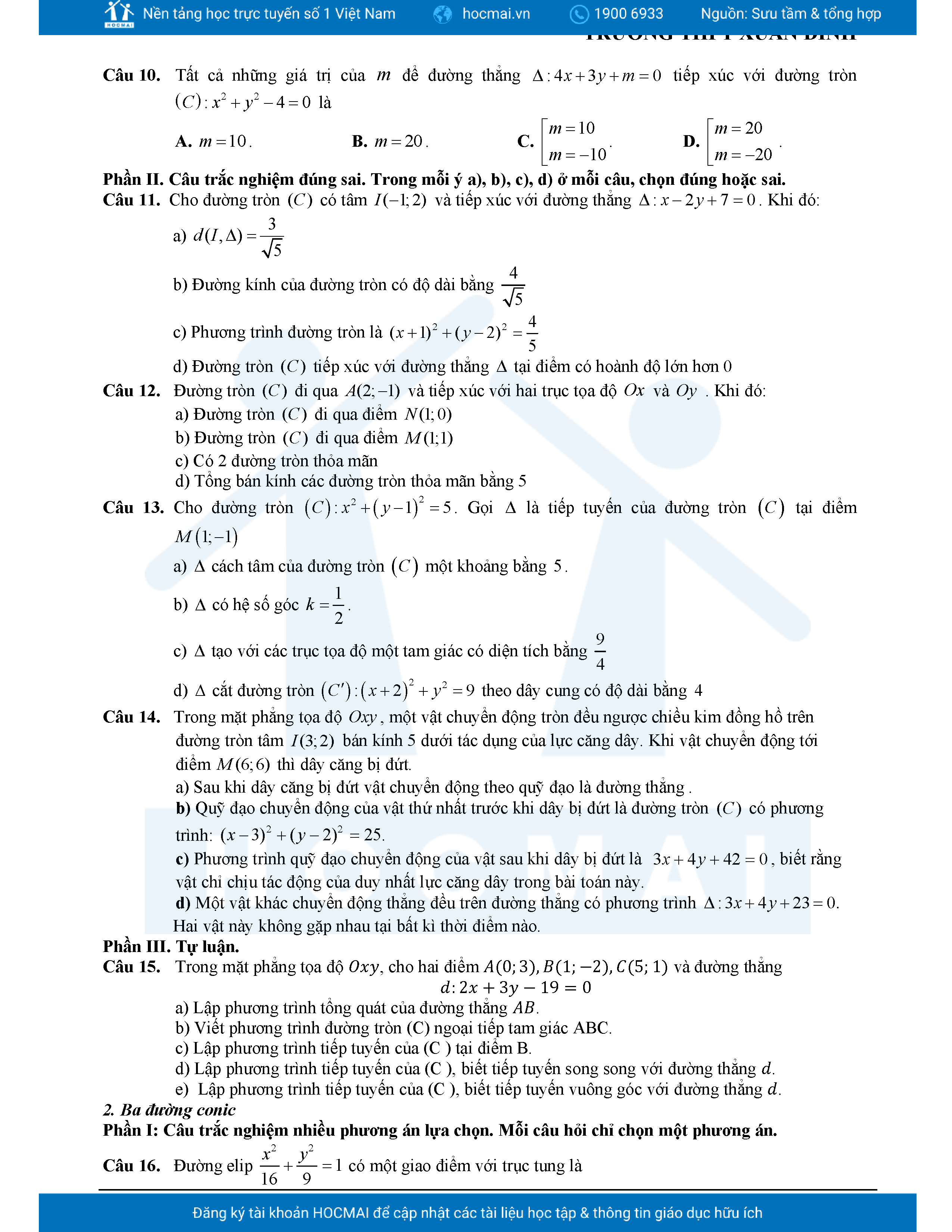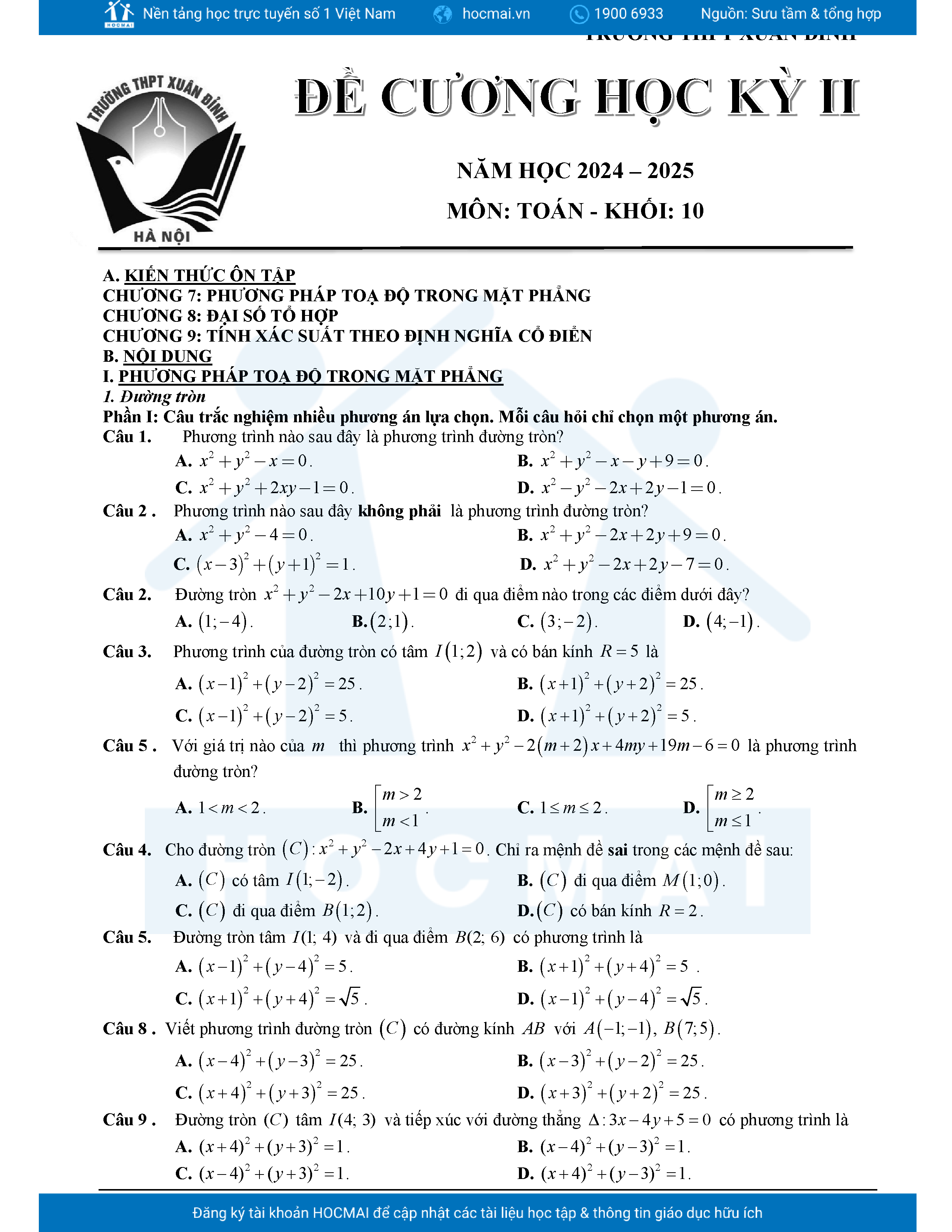 Đề cương học kỳ 2 Toán 10 năm 2024 – 2025 trường THPT Xuân Đỉnh – Hà Nội