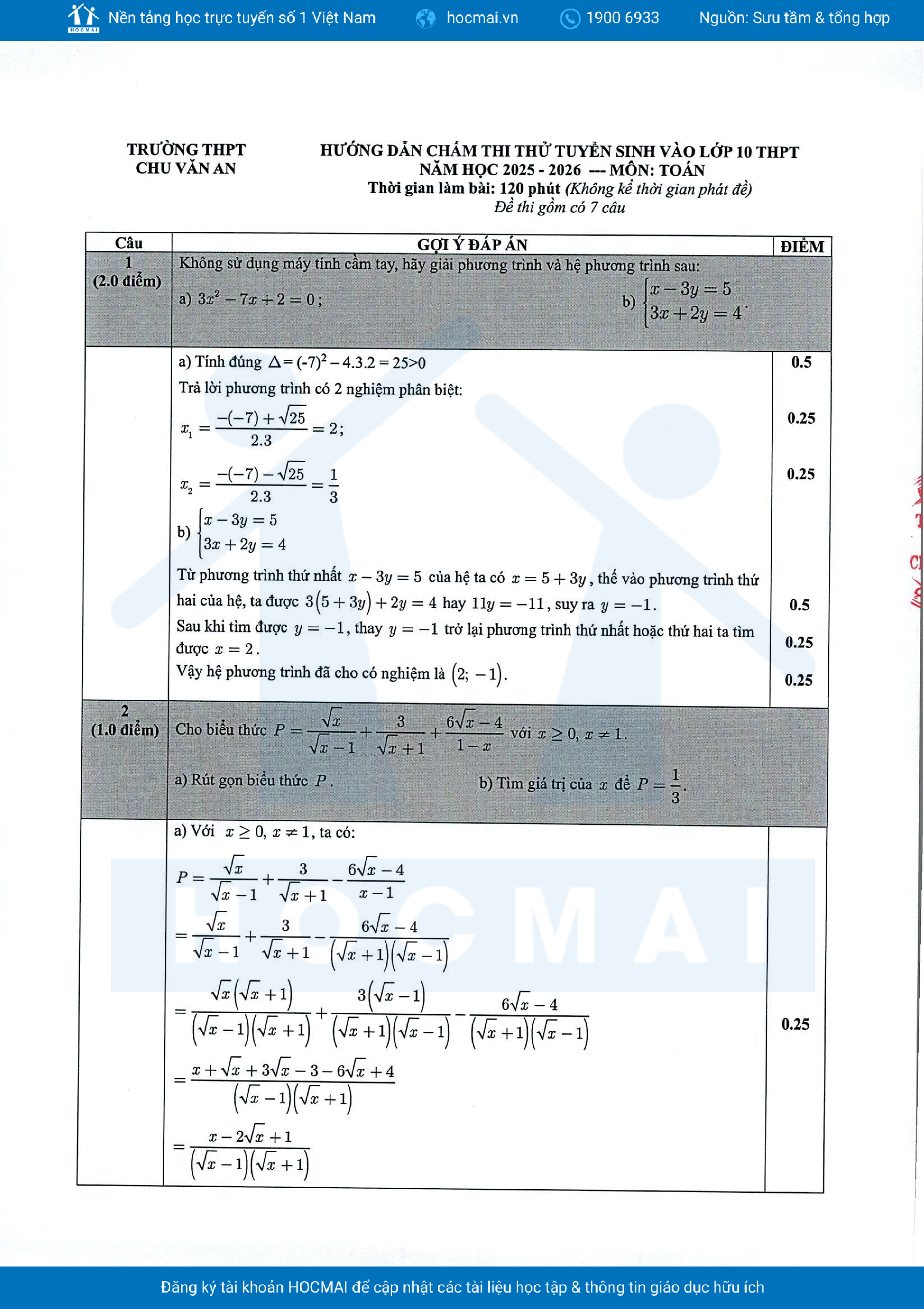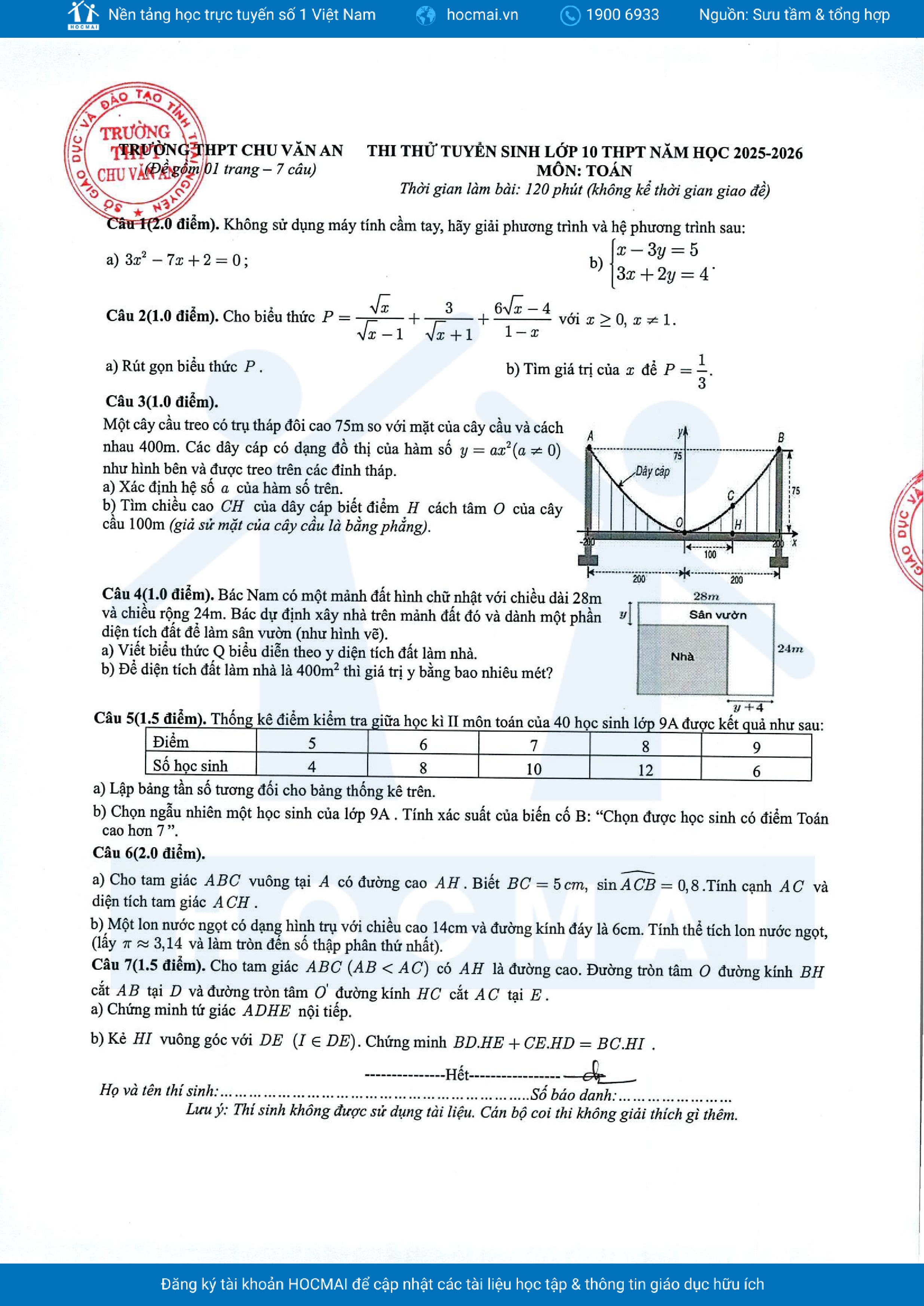 Đề thi thử Toán vào lớp 10 năm 2025 – 2026 trường THPT Chu Văn An – Thái Nguyên kèm lời giải chi tiết.