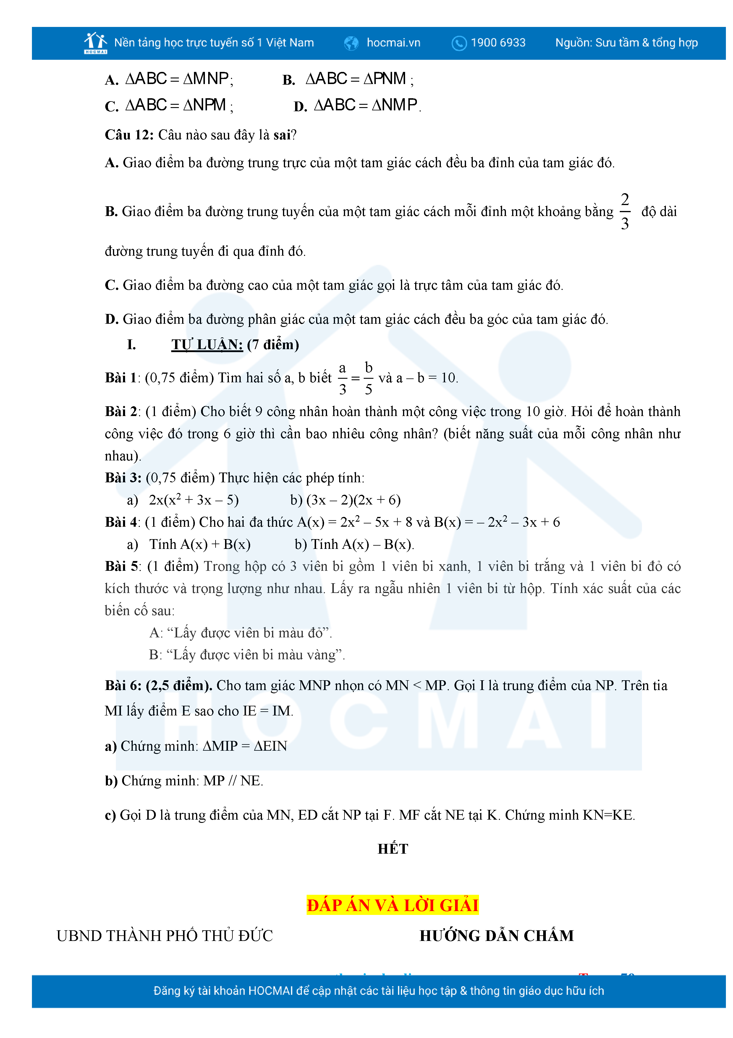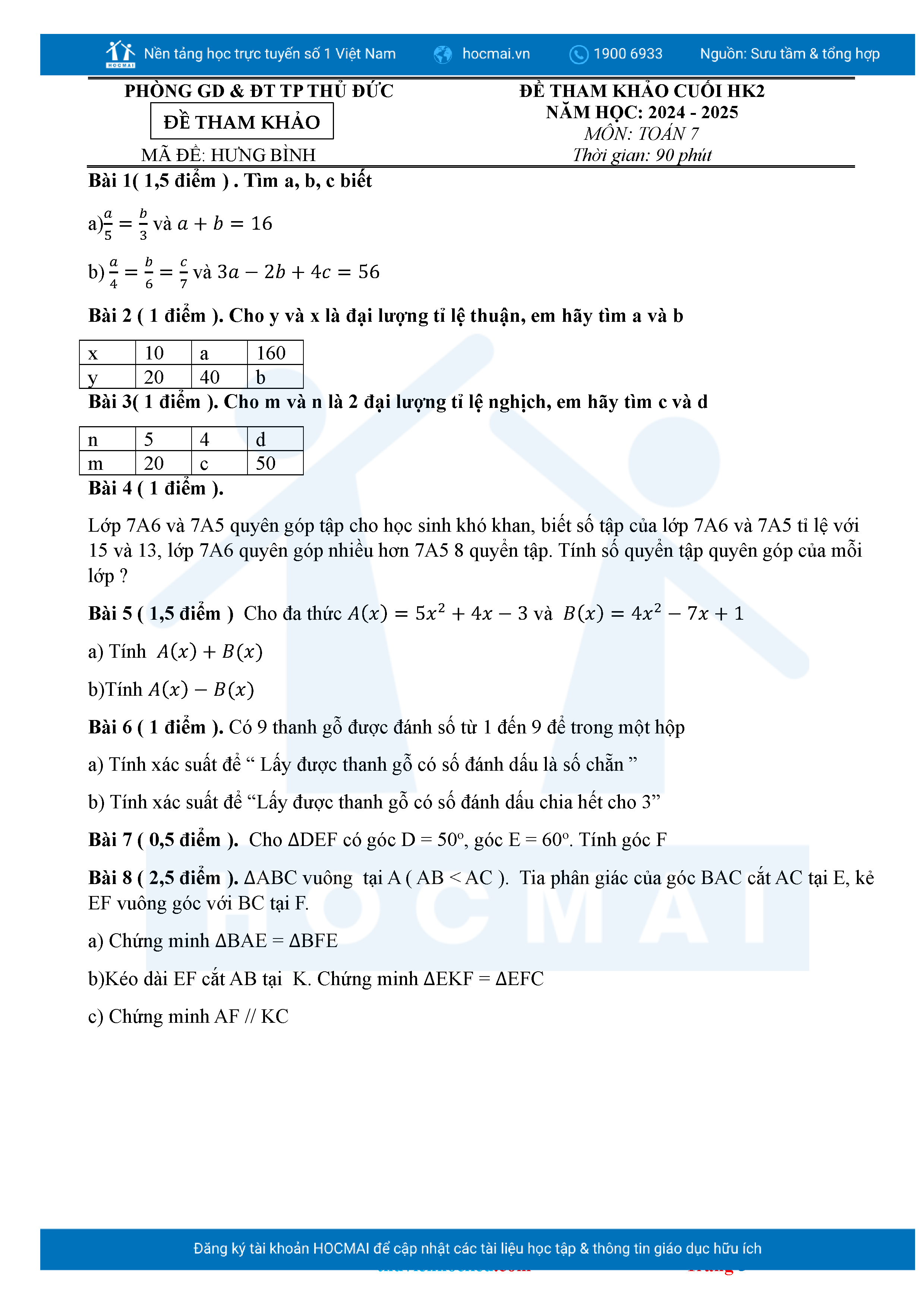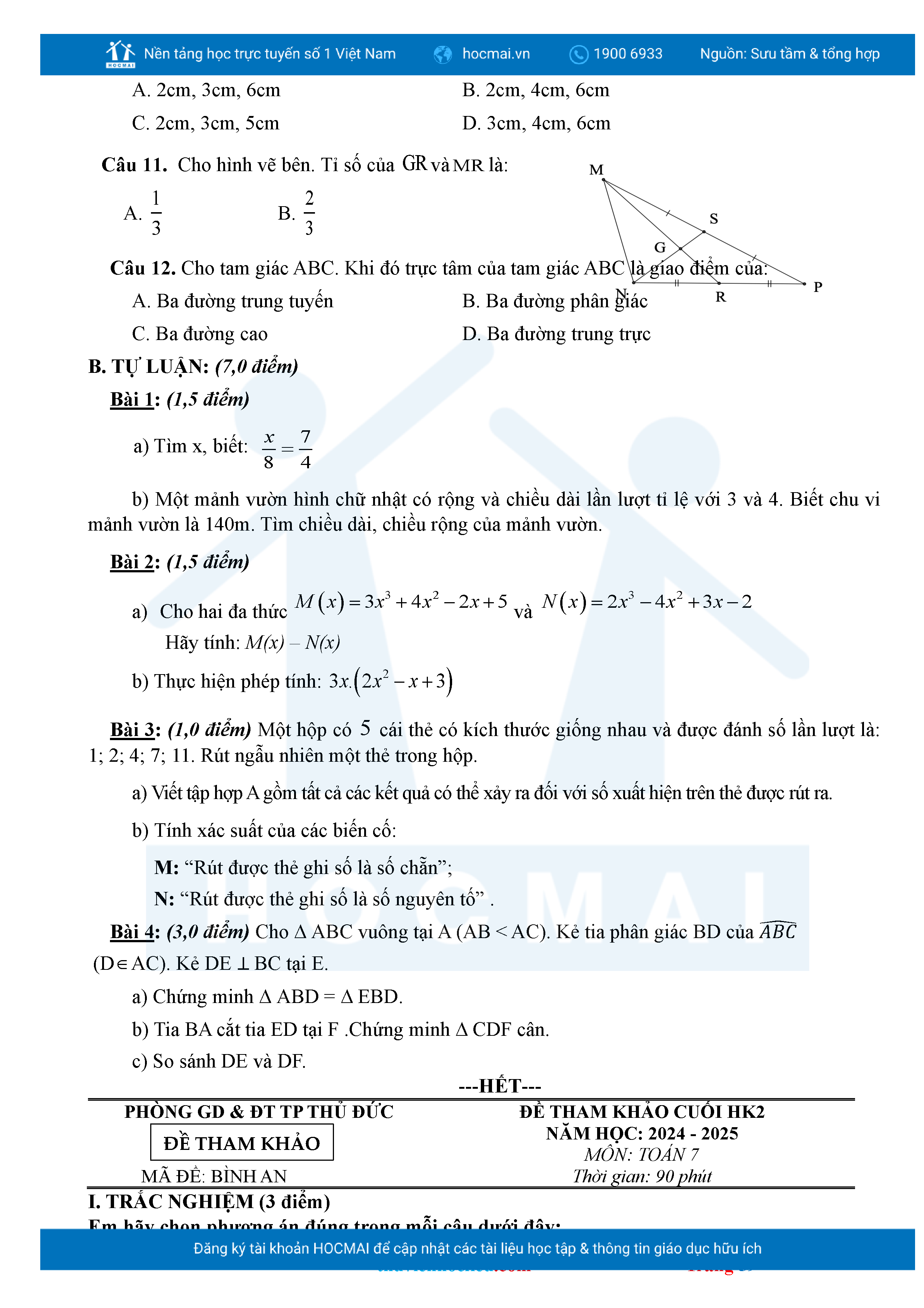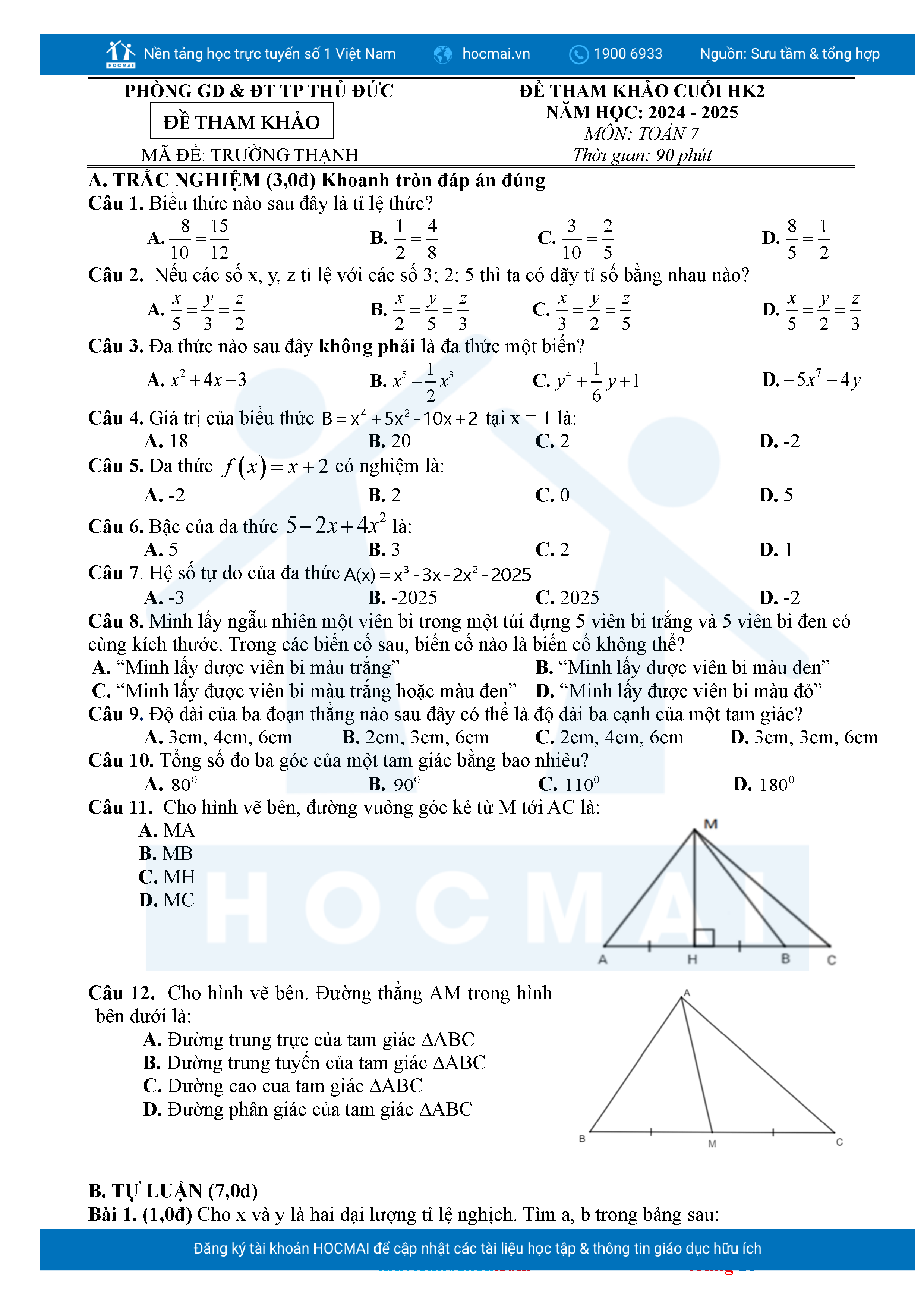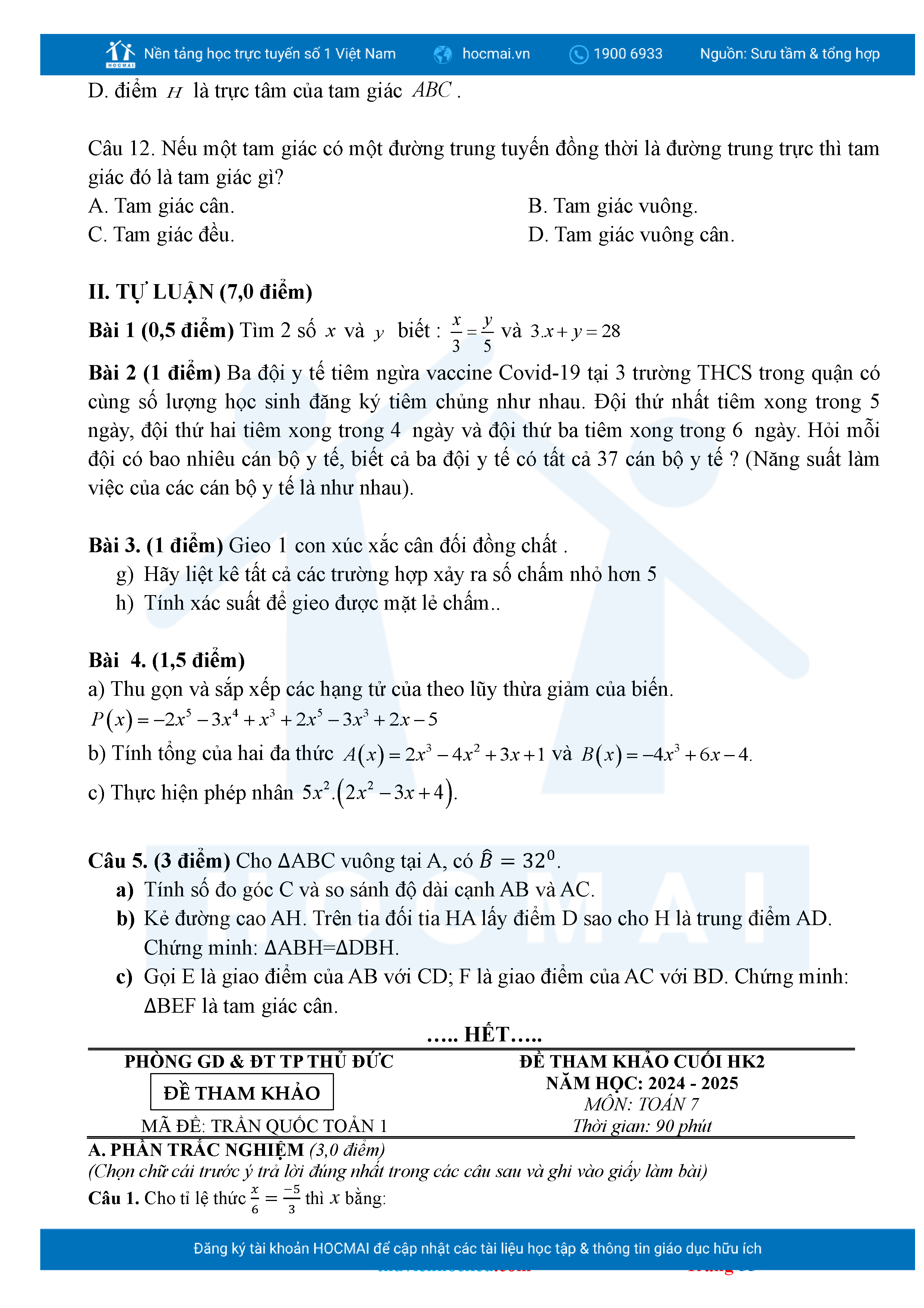 Bộ đề ôn thi môn Toán 7 HKII từ các trường ở TP Thủ Đức thuộc TPHCM kèm đáp án chi tiết.