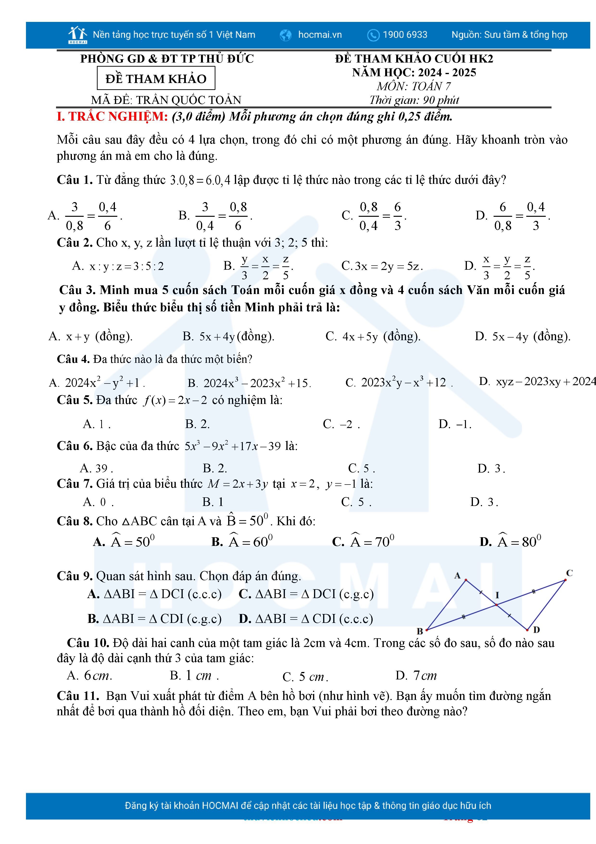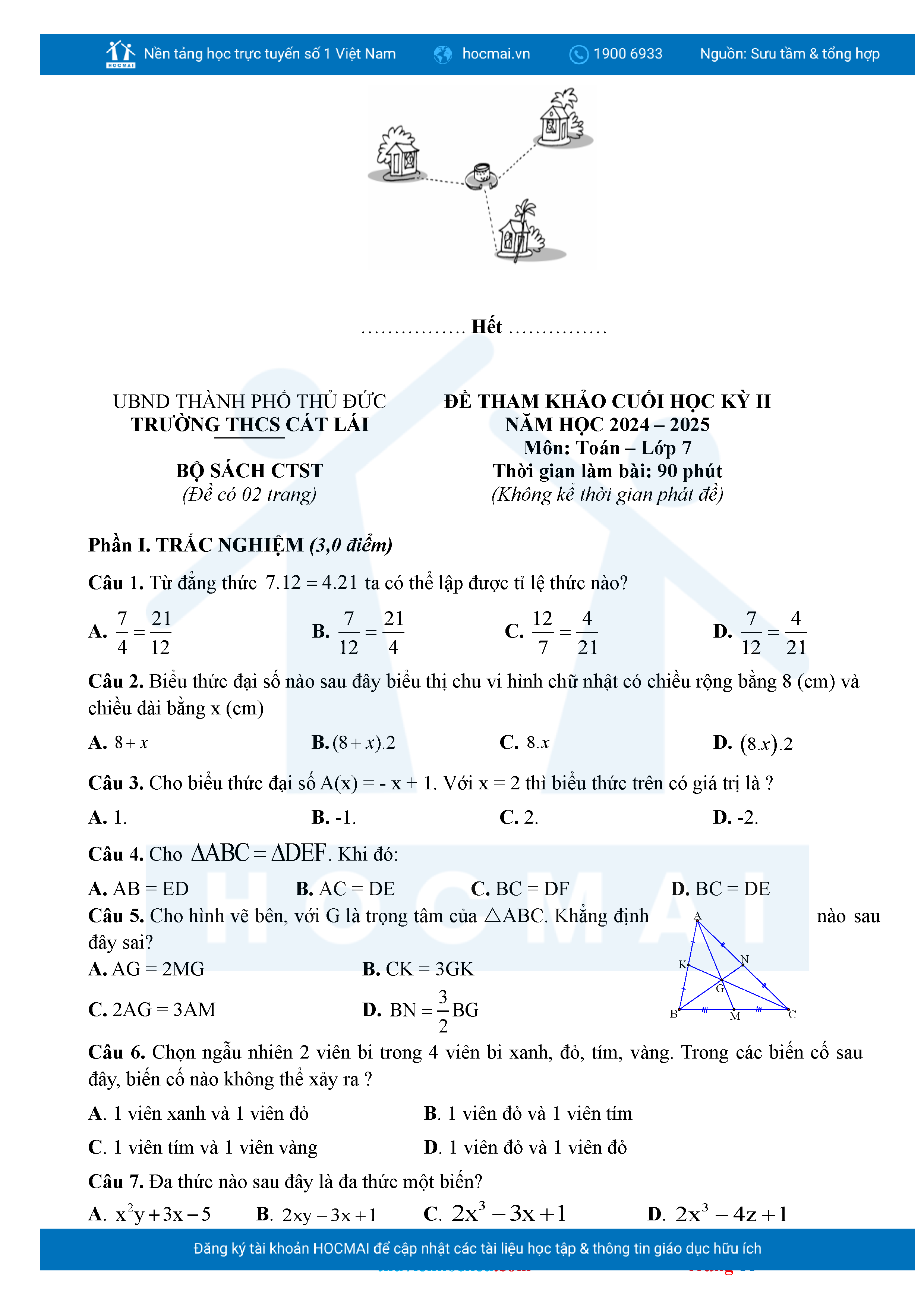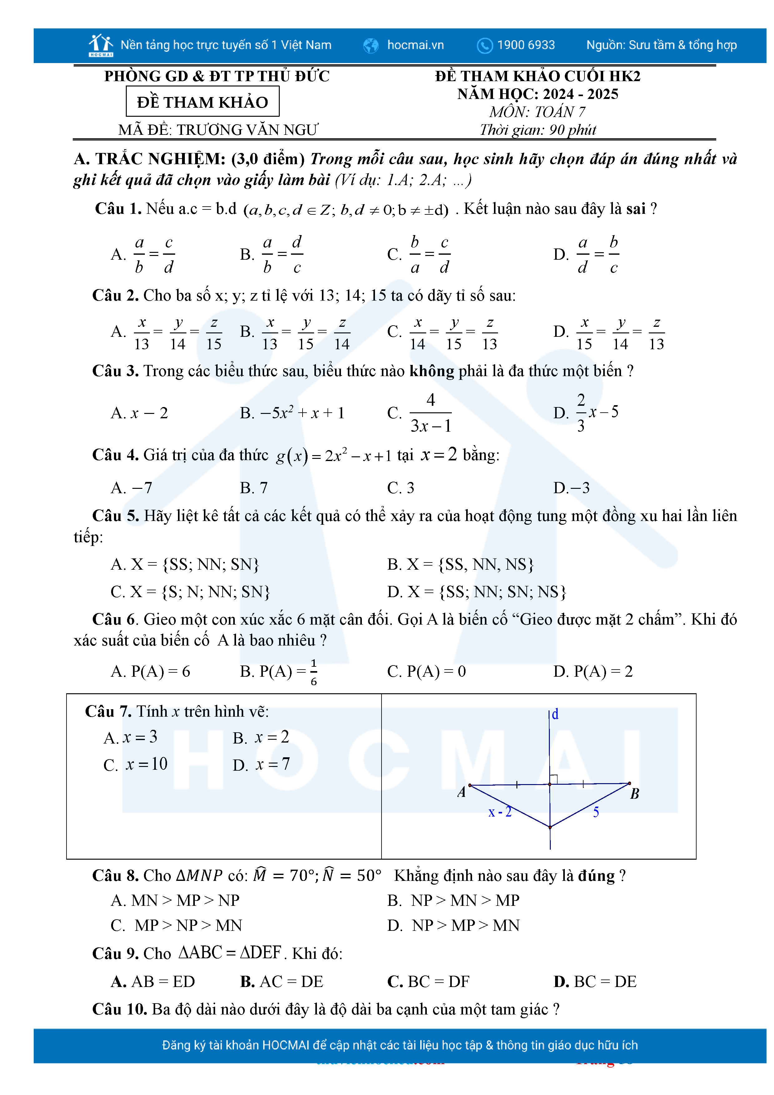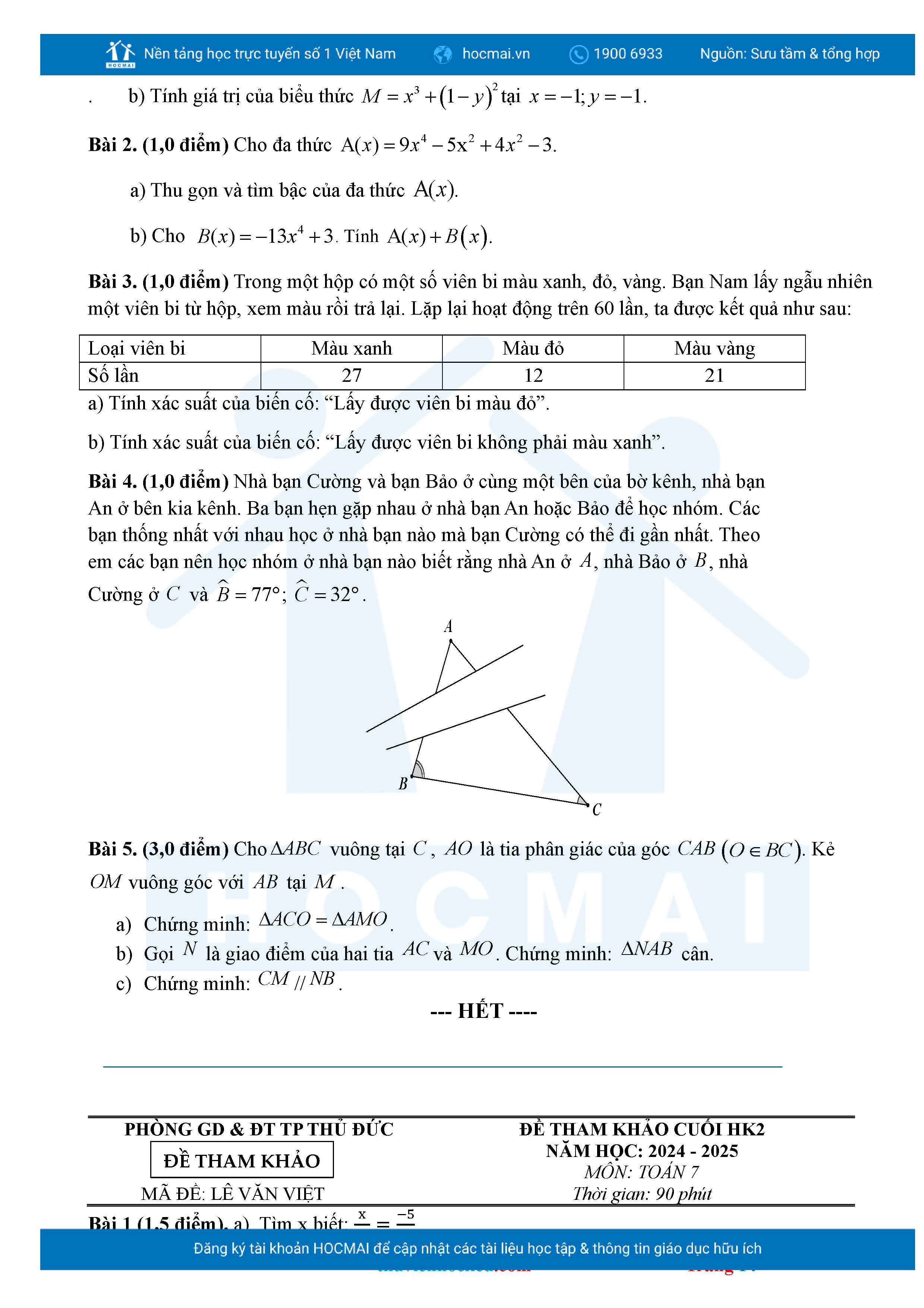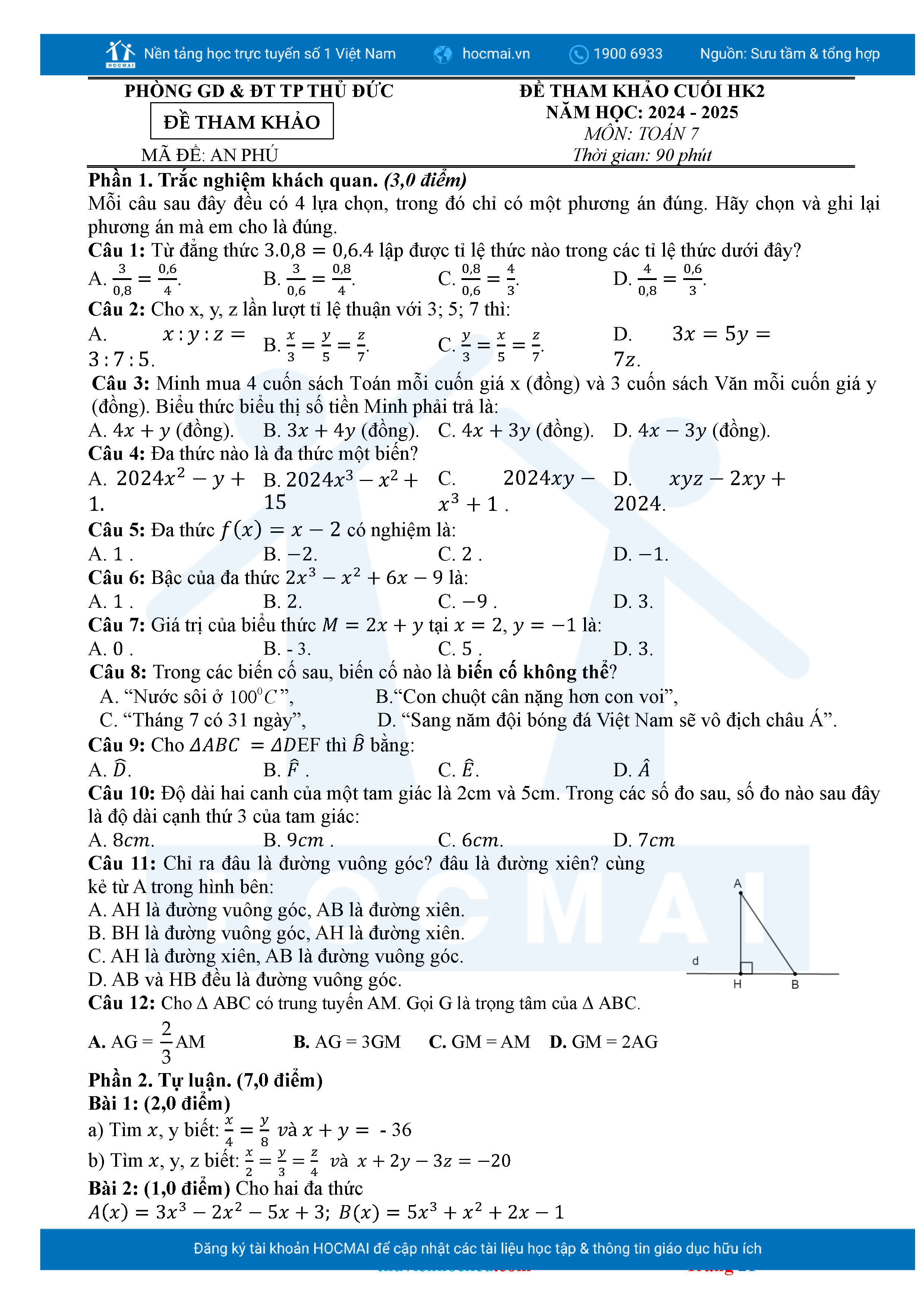 Bộ đề ôn thi môn Toán 7 HKII từ các trường ở TP Thủ Đức thuộc TPHCM kèm đáp án chi tiết.