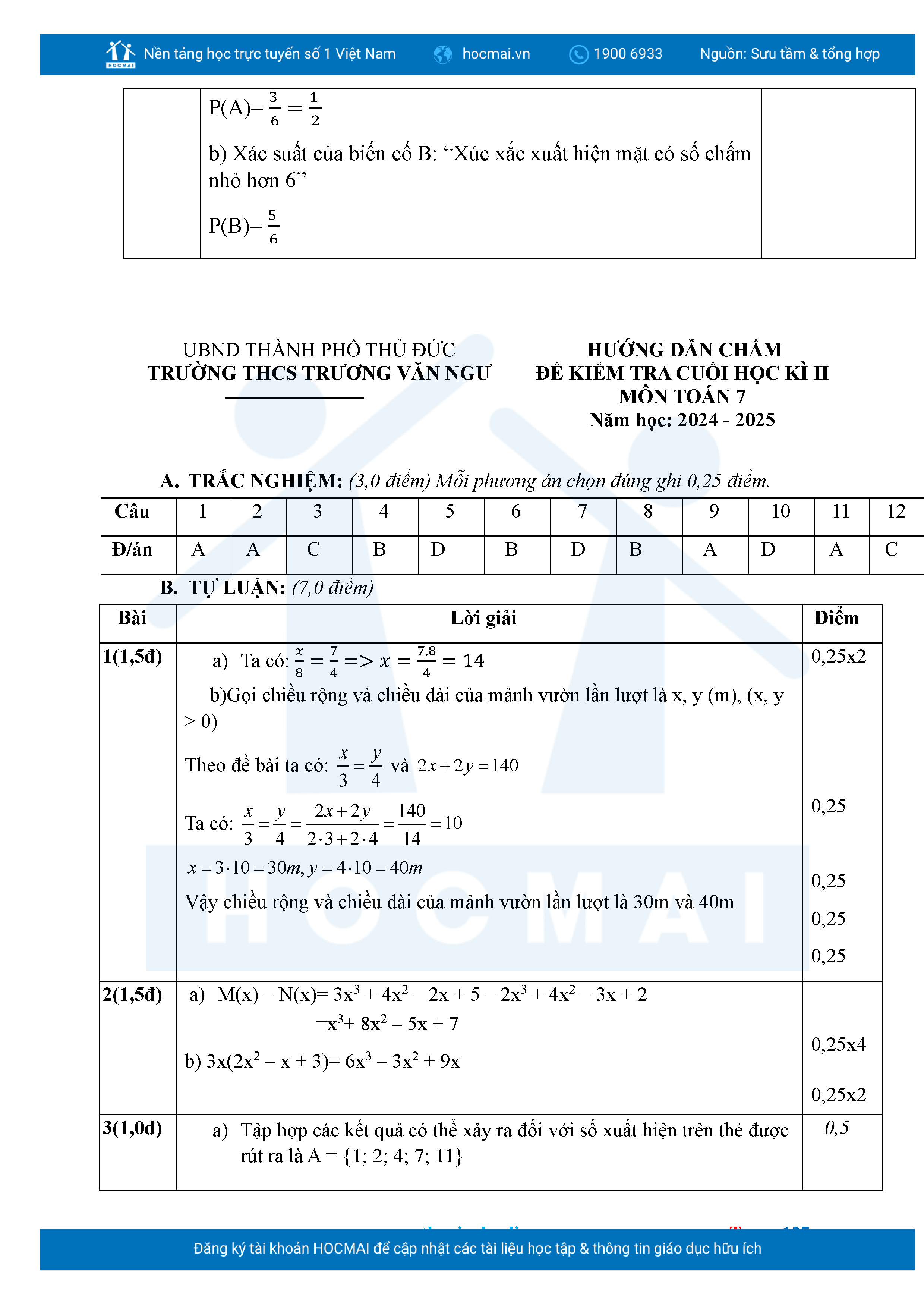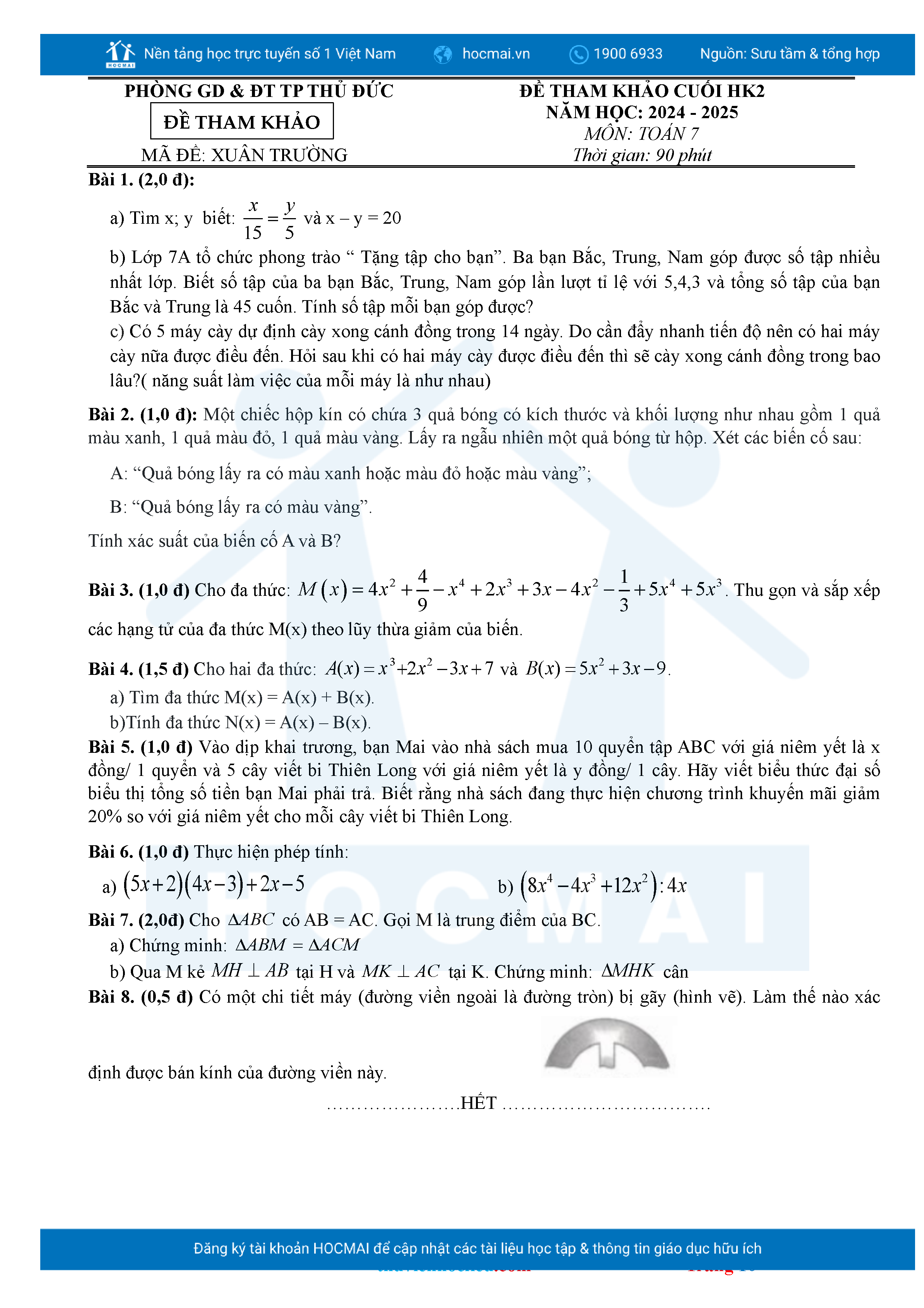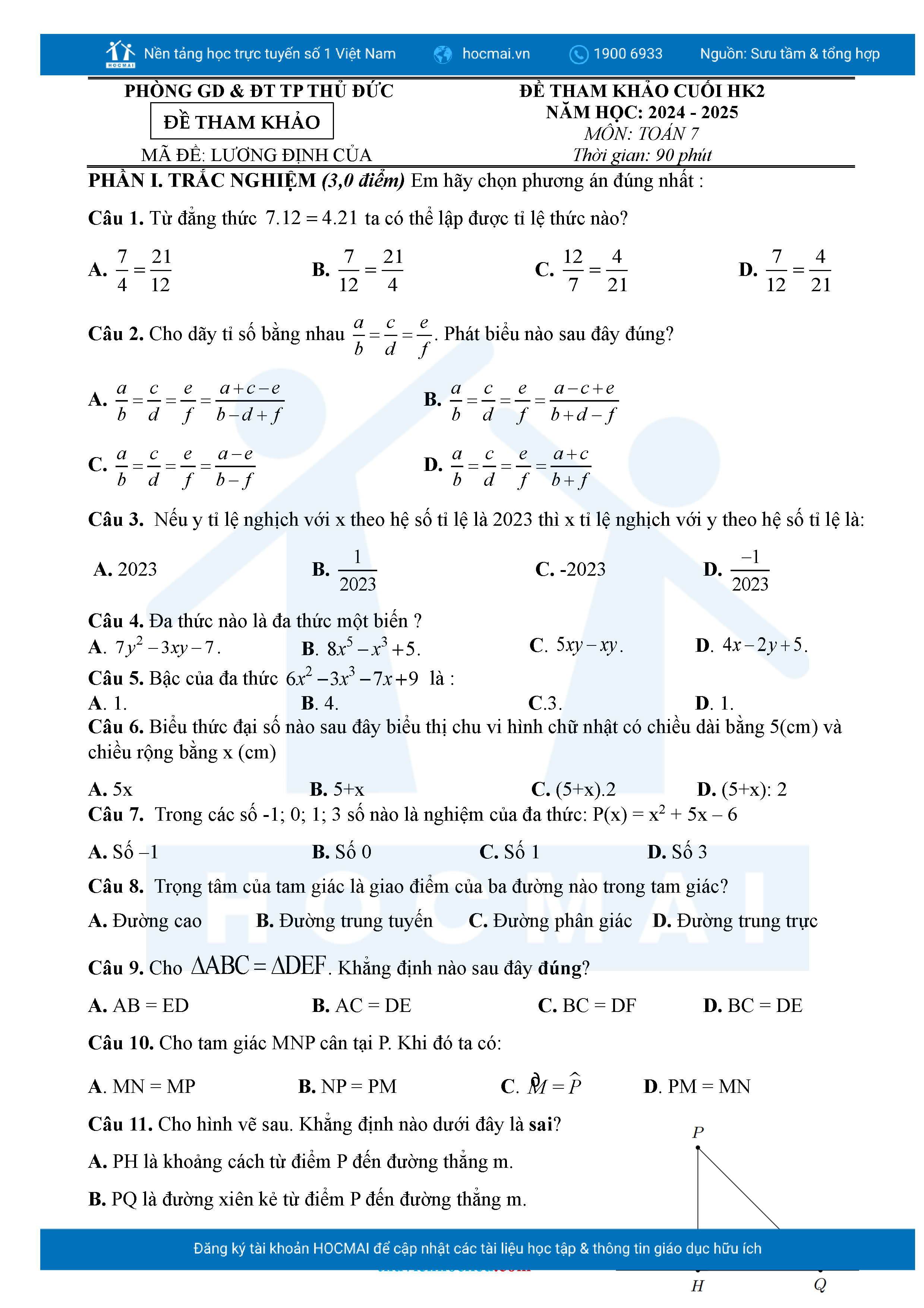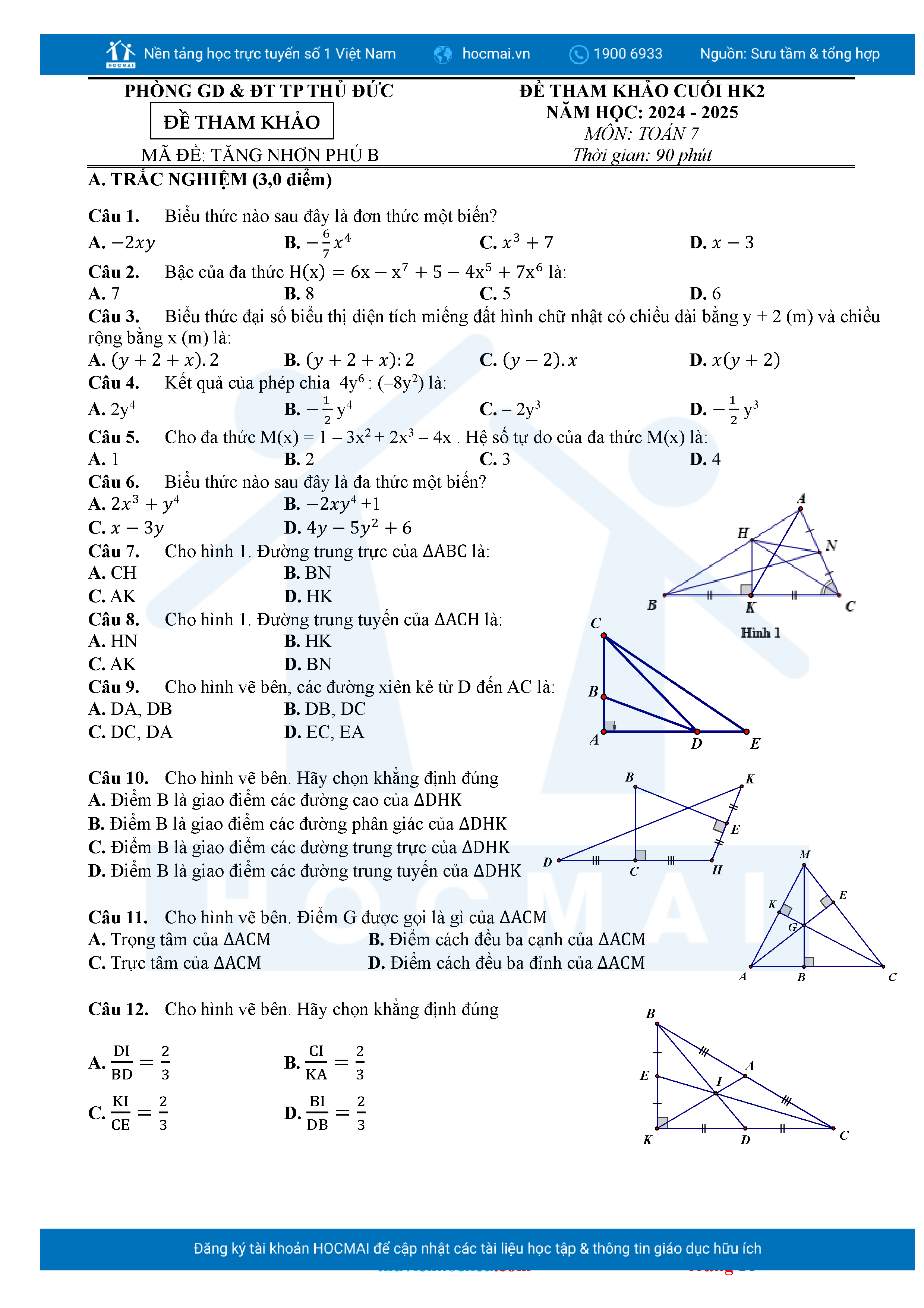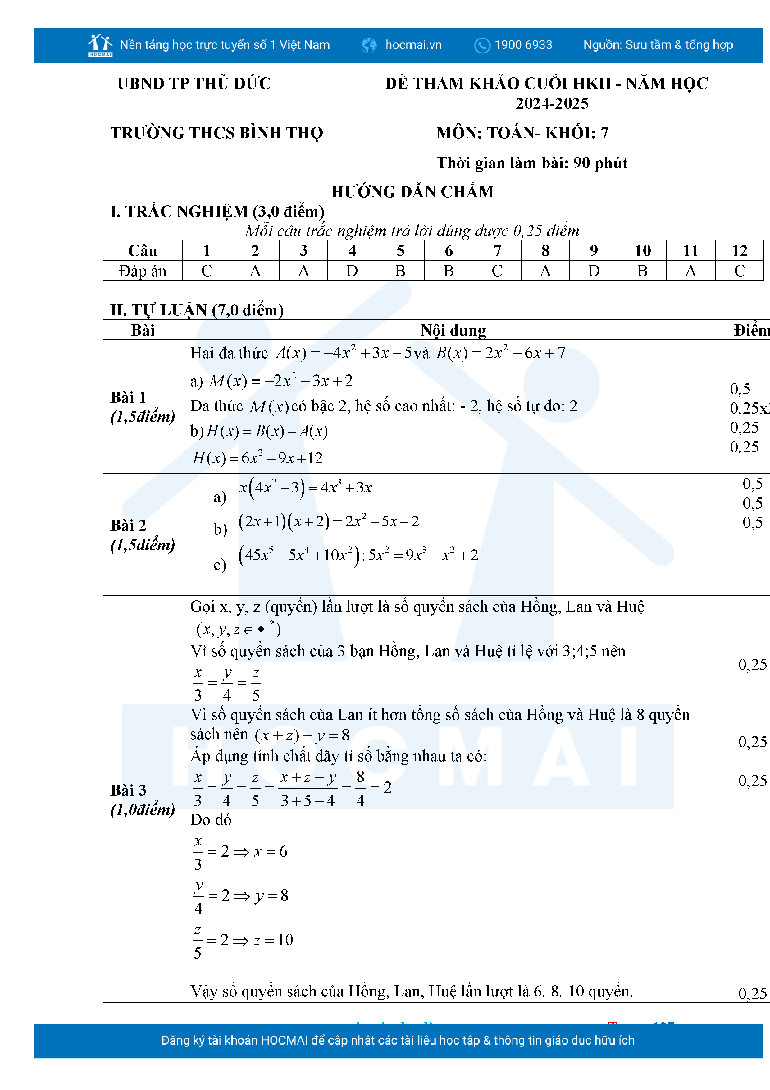 Bộ đề ôn thi môn Toán 7 HKII từ các trường ở TP Thủ Đức thuộc TPHCM kèm đáp án chi tiết.