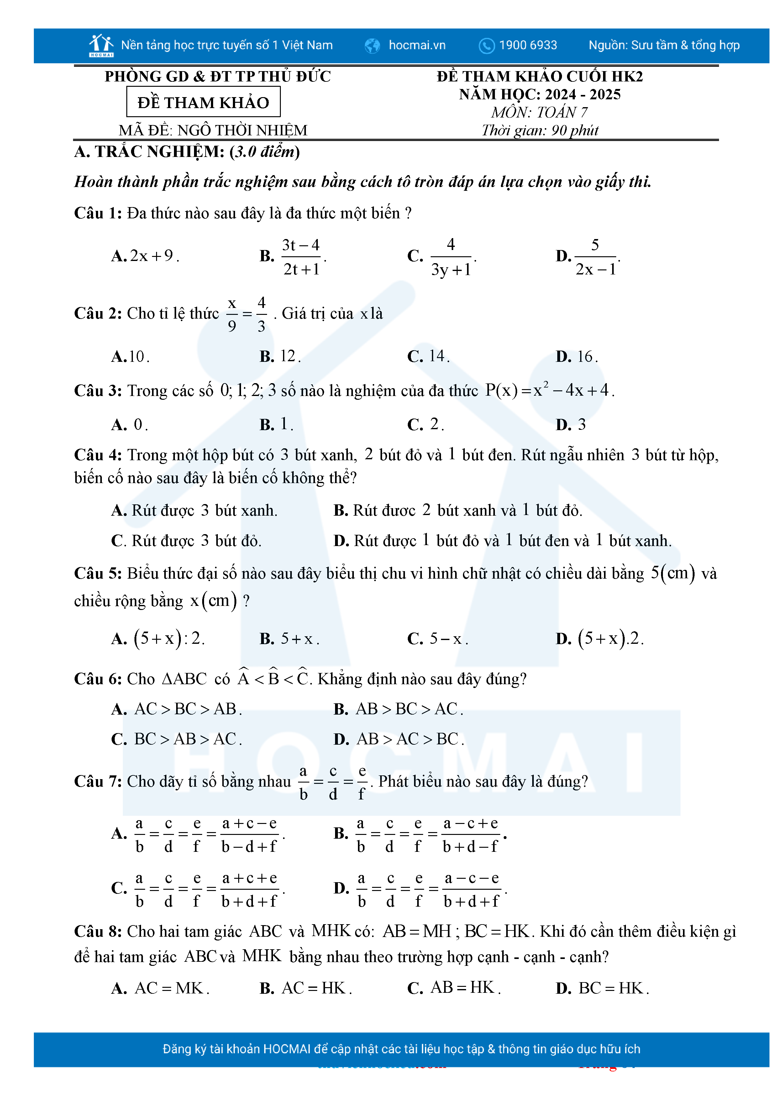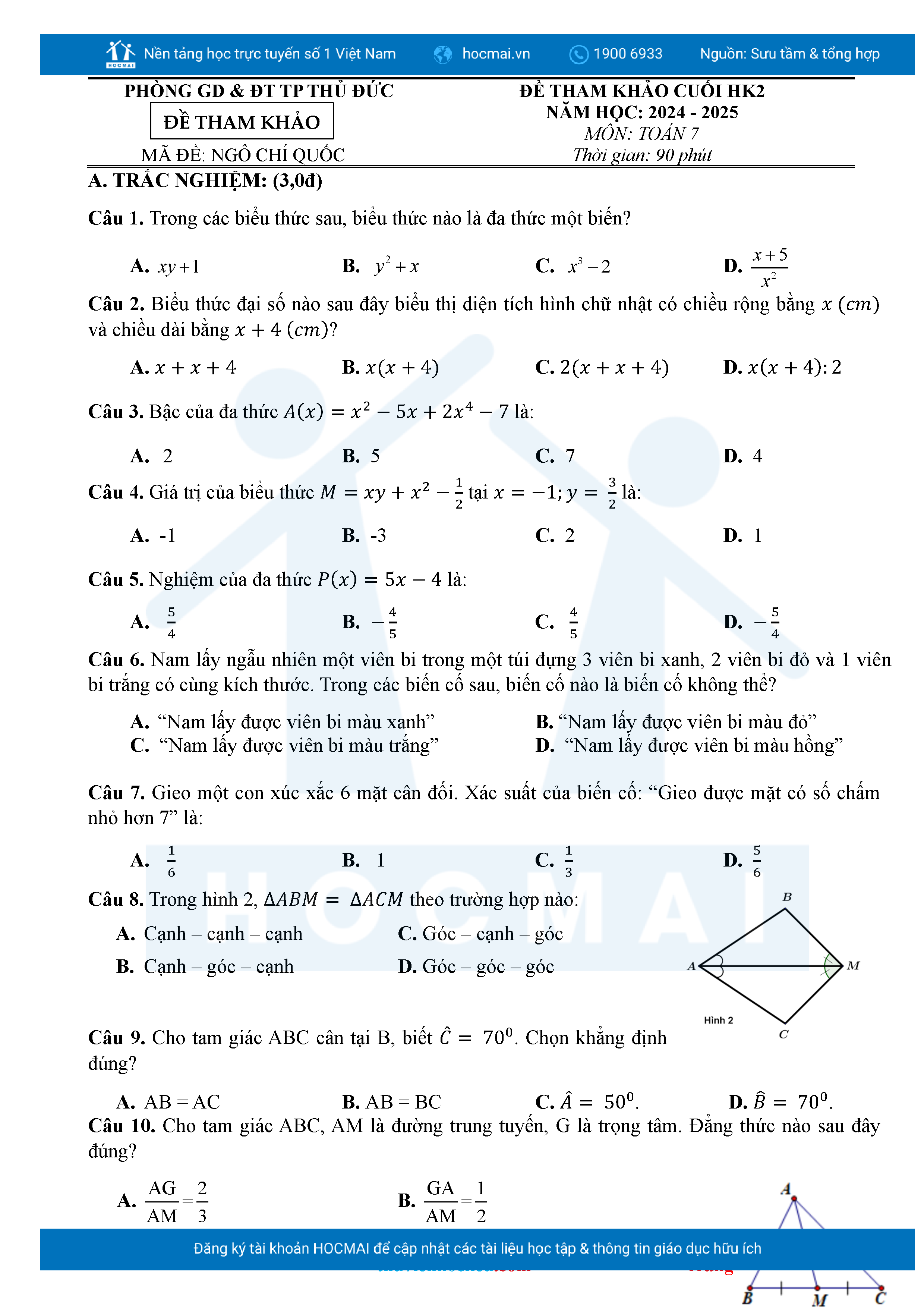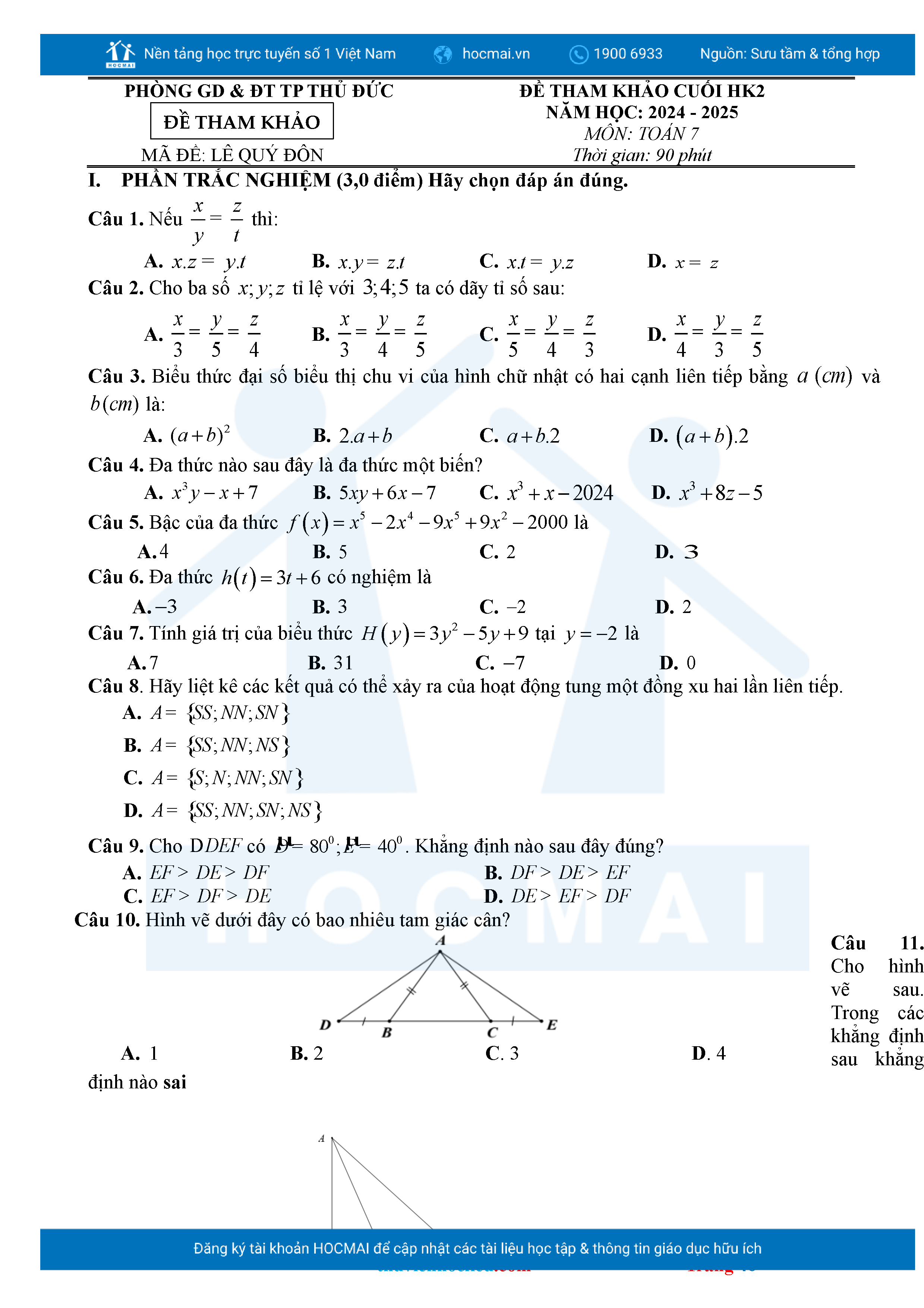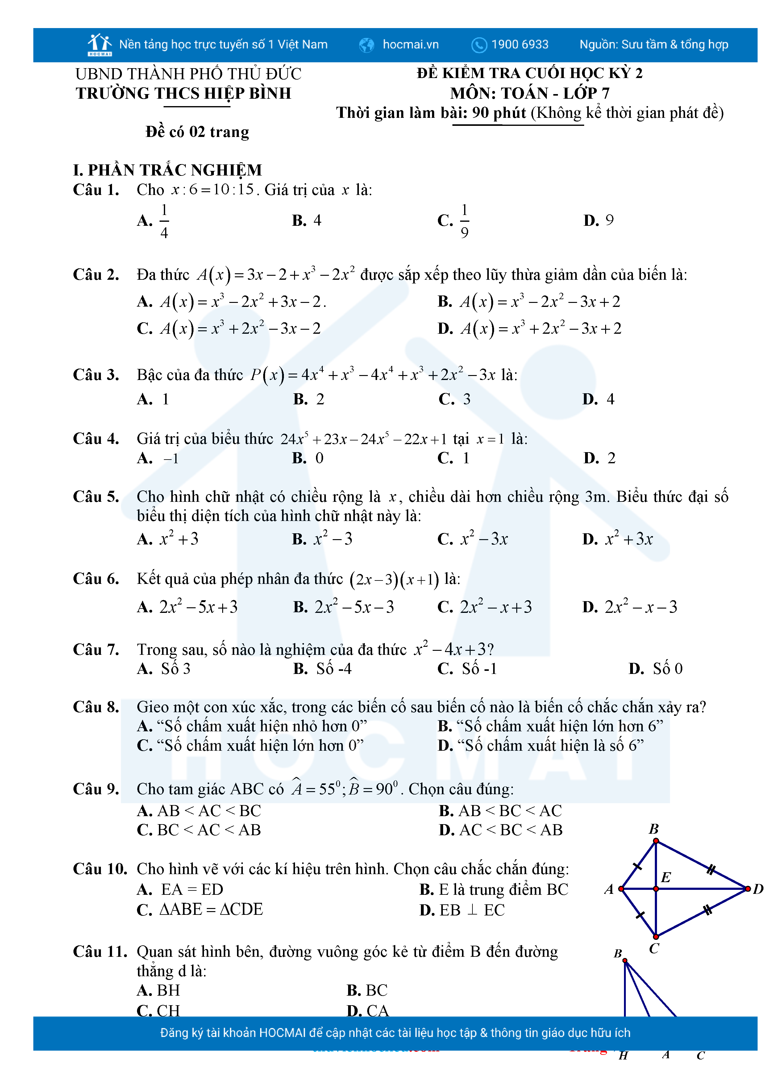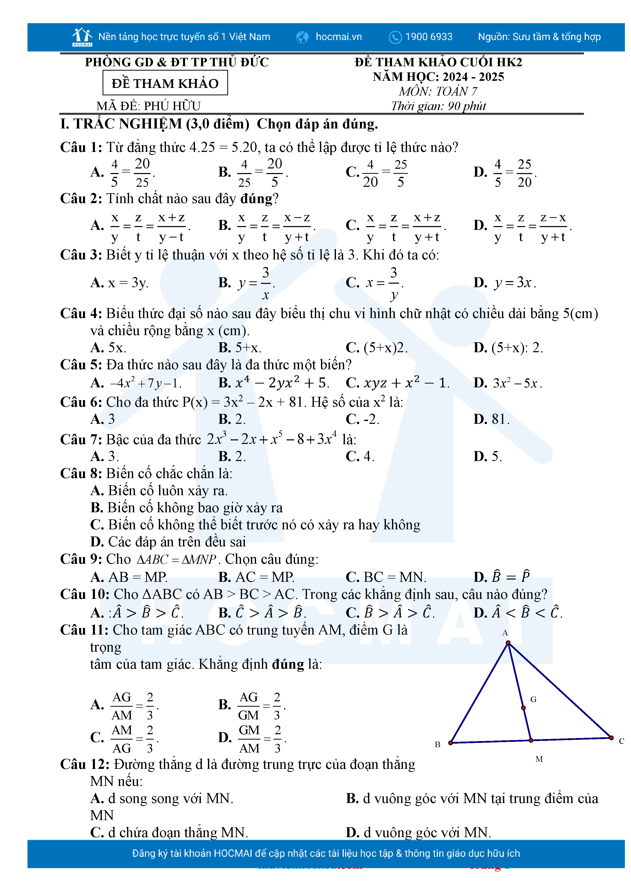 Bộ đề ôn thi môn Toán 7 HKII từ các trường ở TP Thủ Đức thuộc TPHCM kèm đáp án chi tiết.