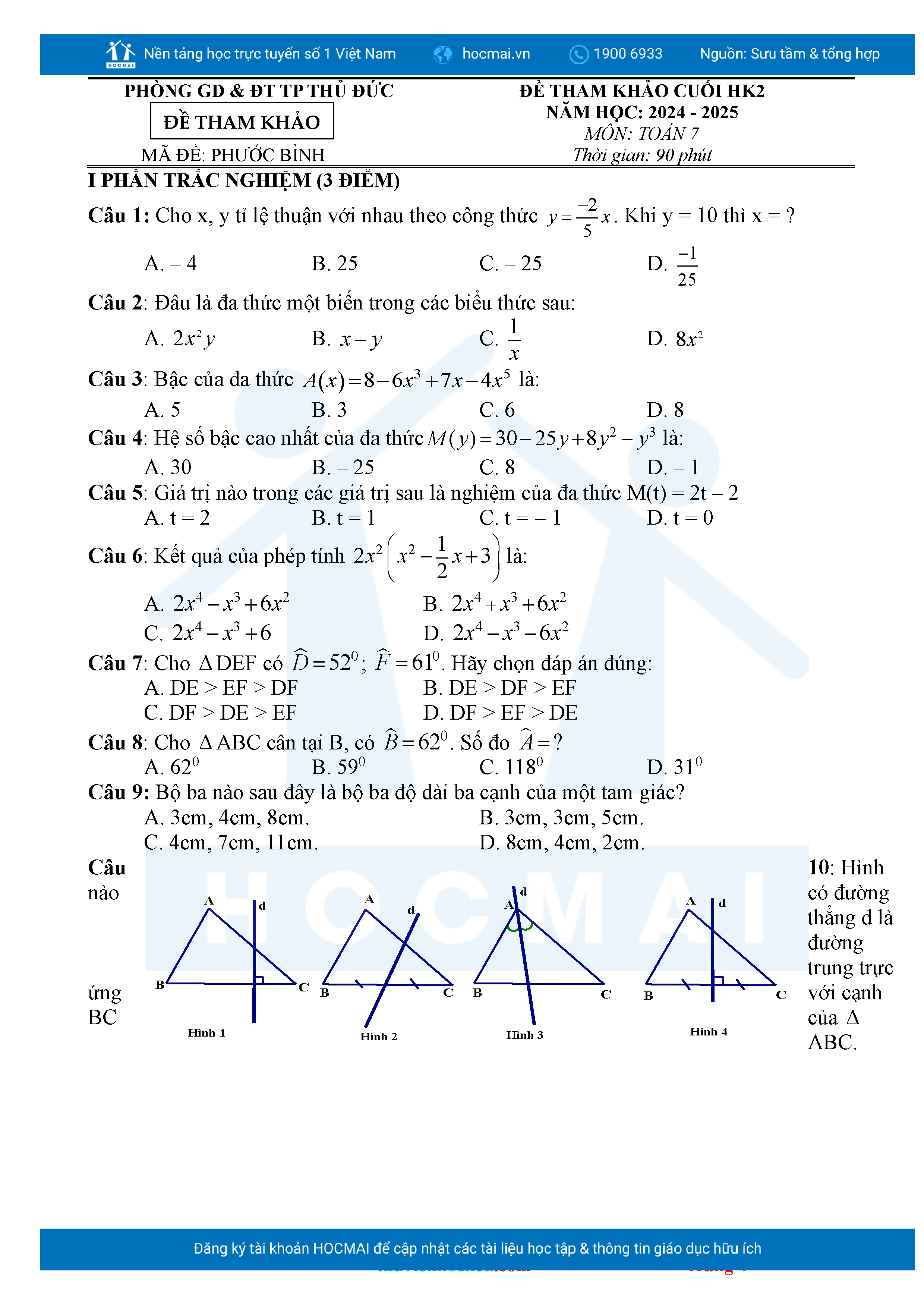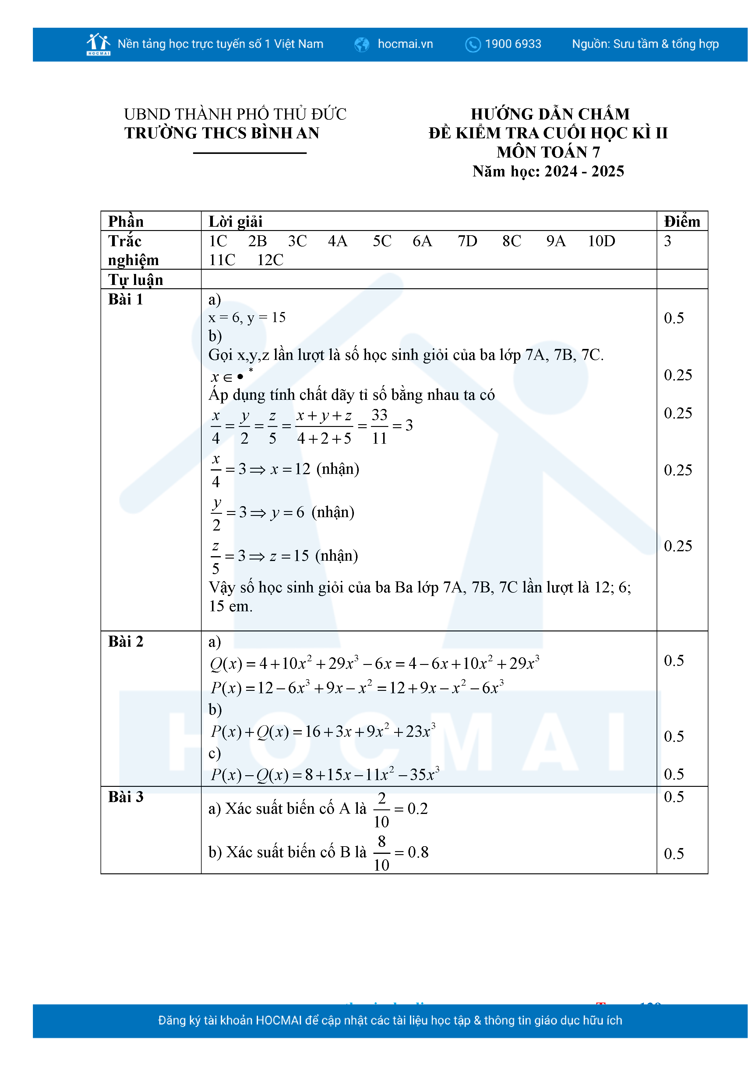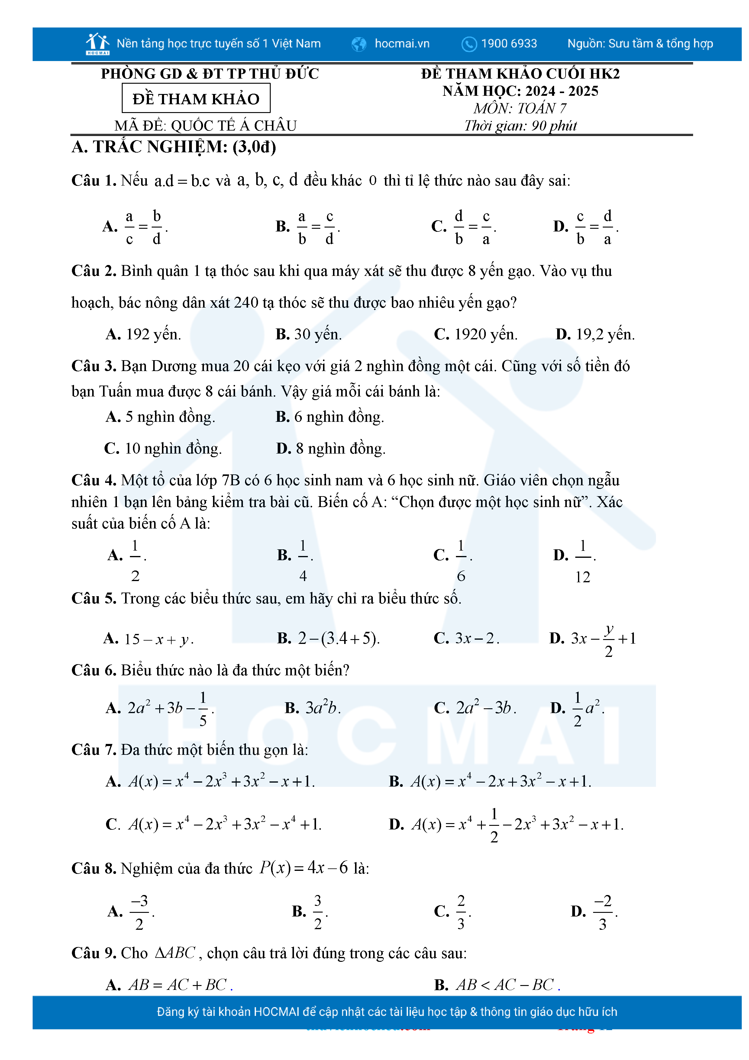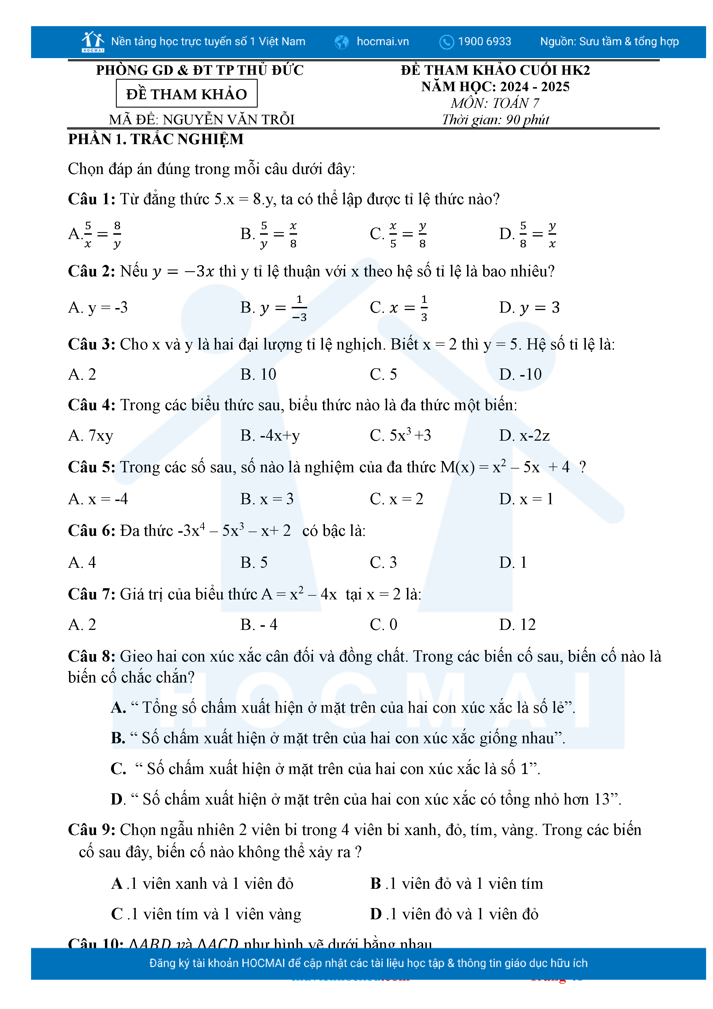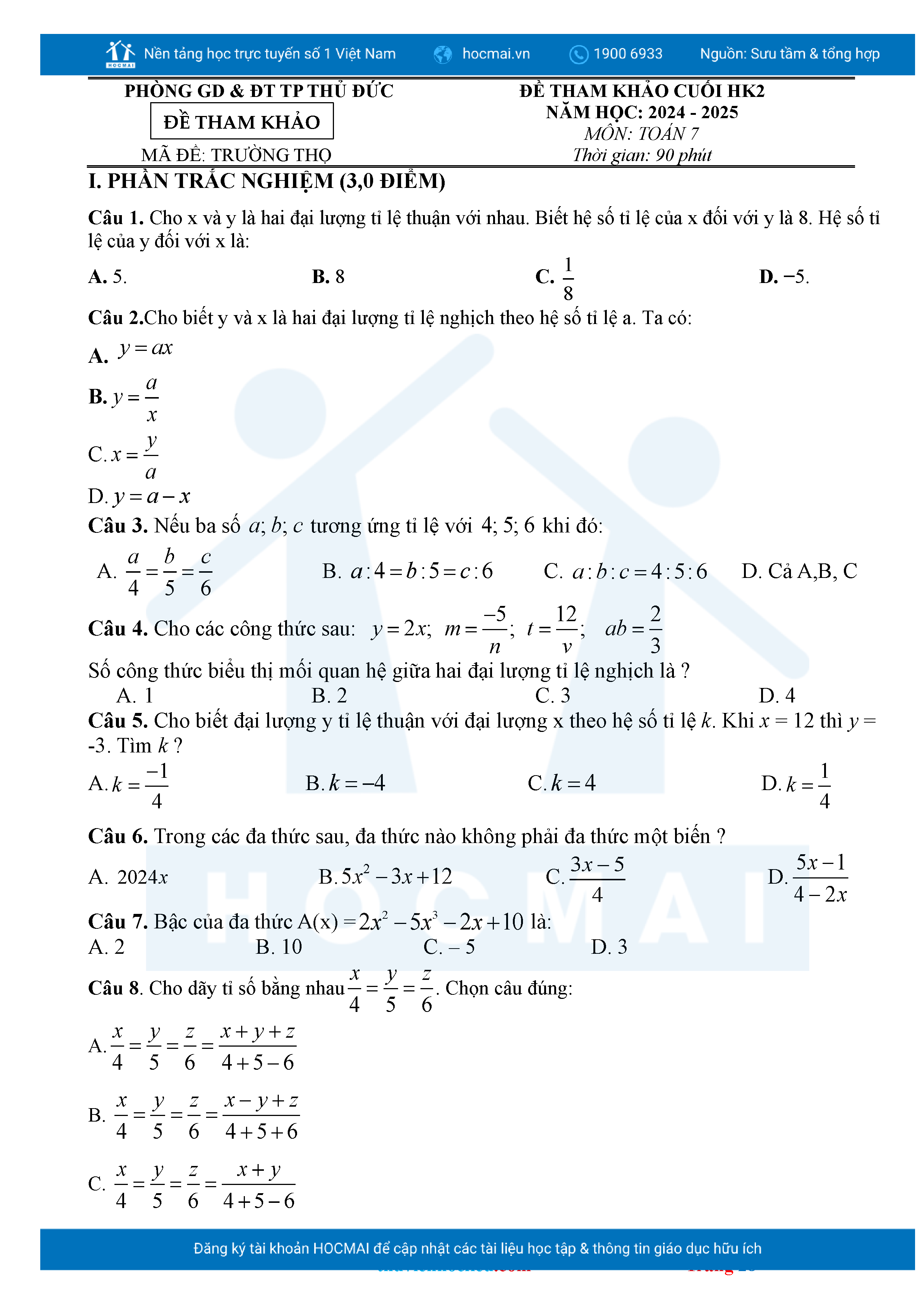 Bộ đề ôn thi môn Toán 7 HKII từ các trường ở TP Thủ Đức thuộc TPHCM kèm đáp án chi tiết.