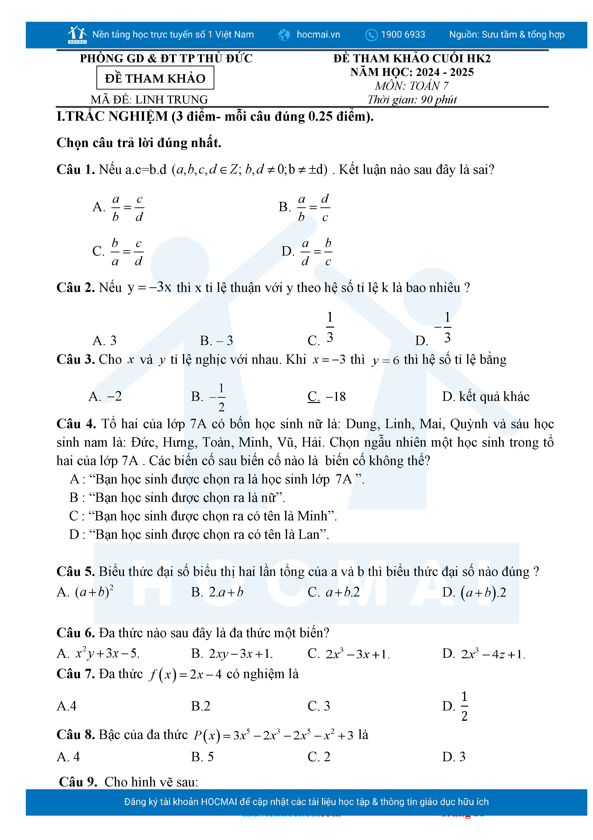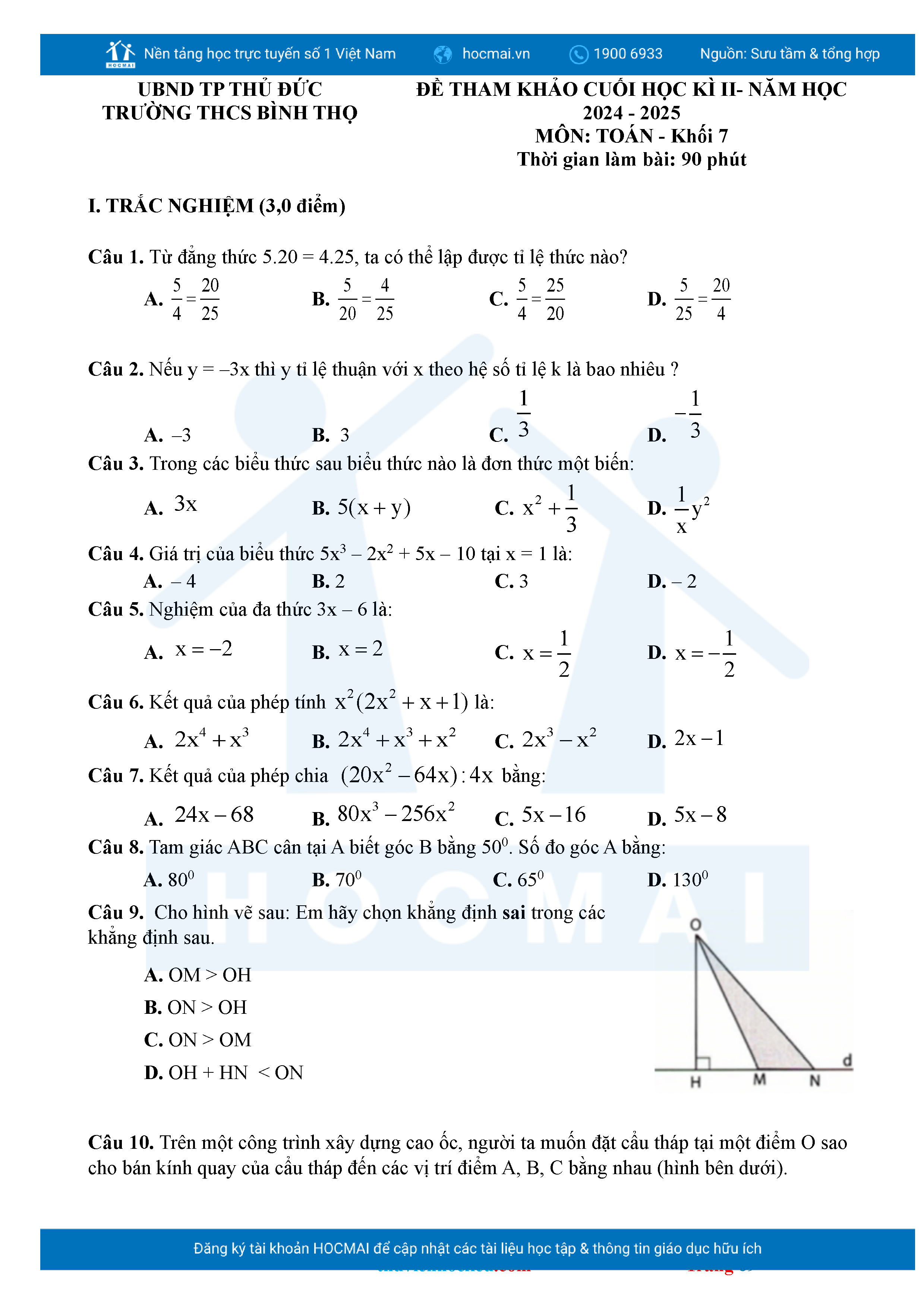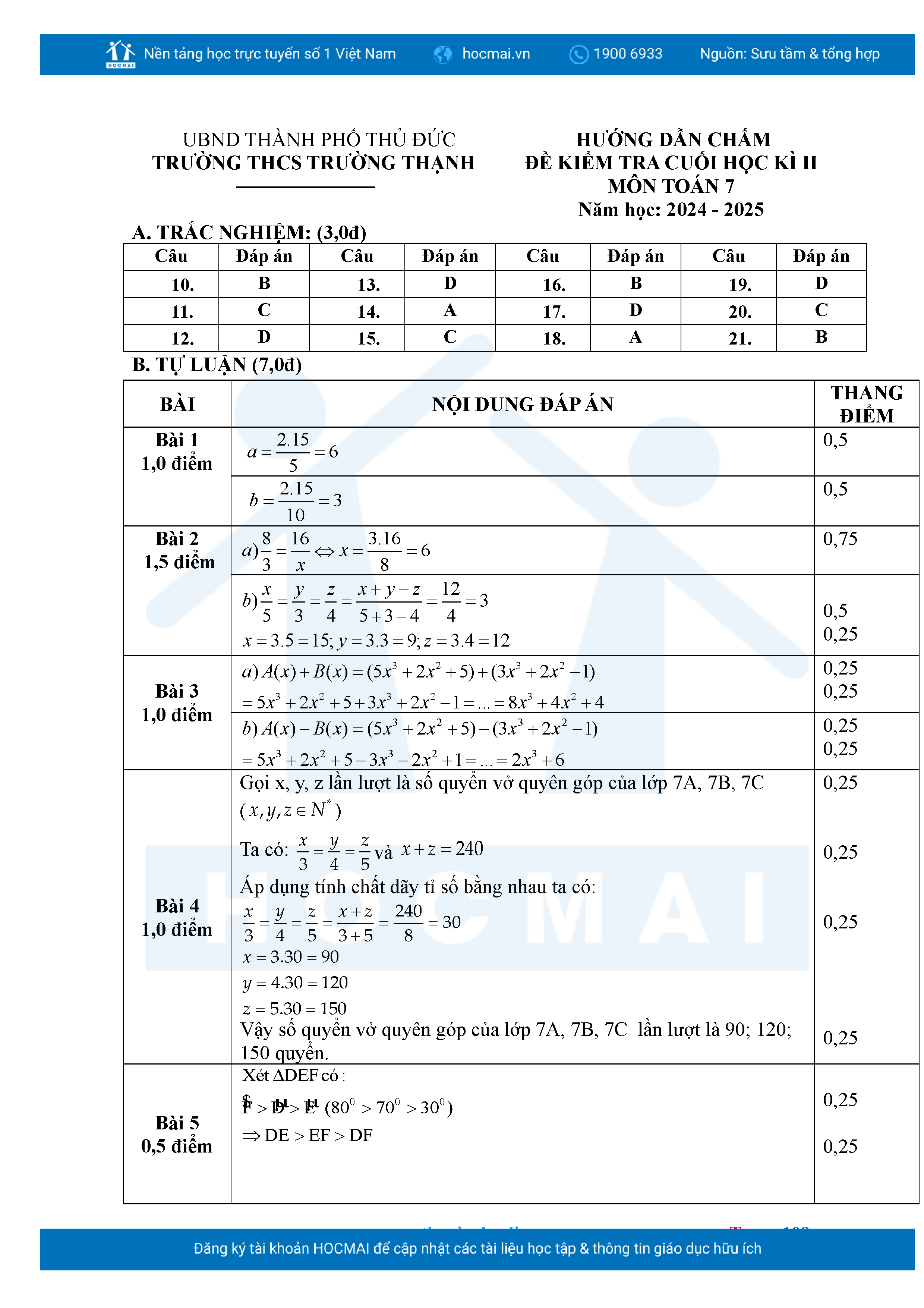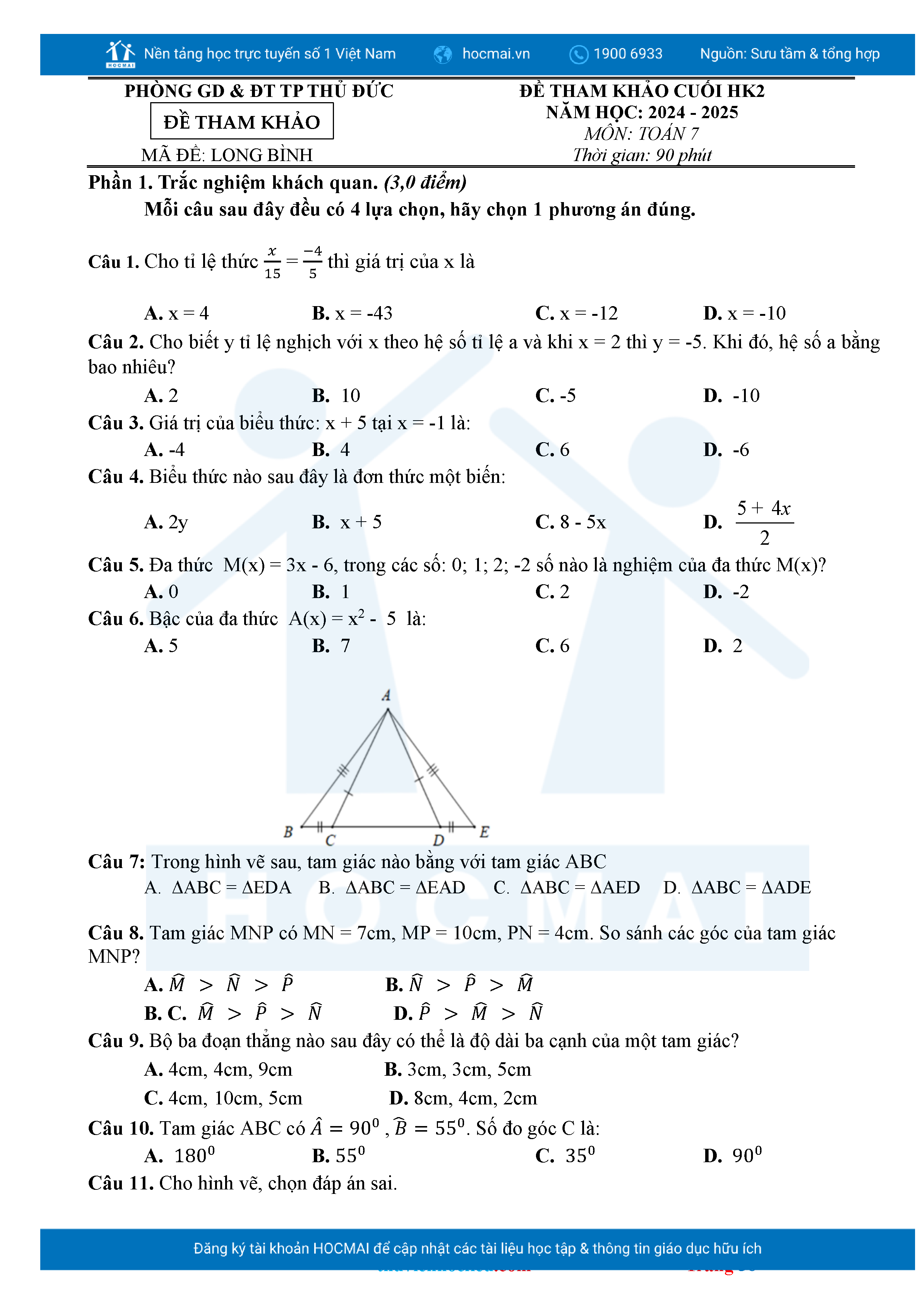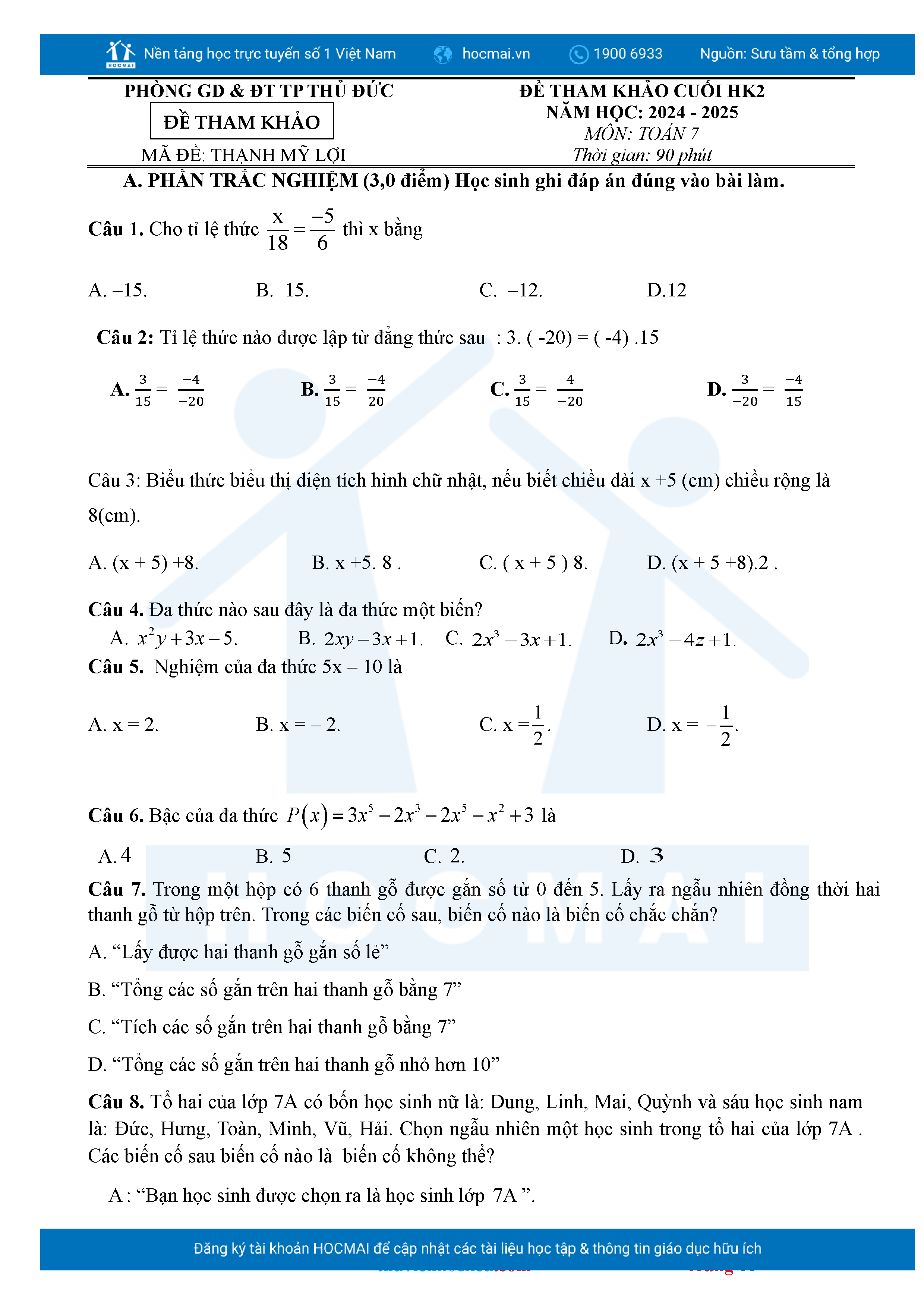 Bộ đề ôn thi môn Toán 7 HKII từ các trường ở TP Thủ Đức thuộc TPHCM kèm đáp án chi tiết.