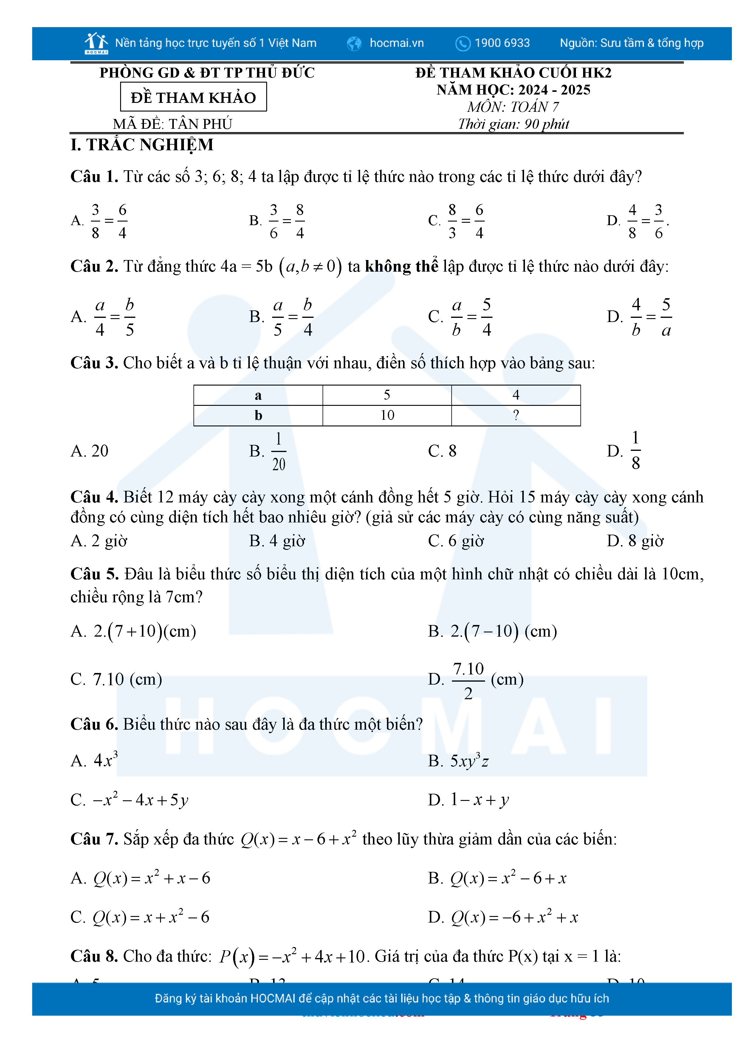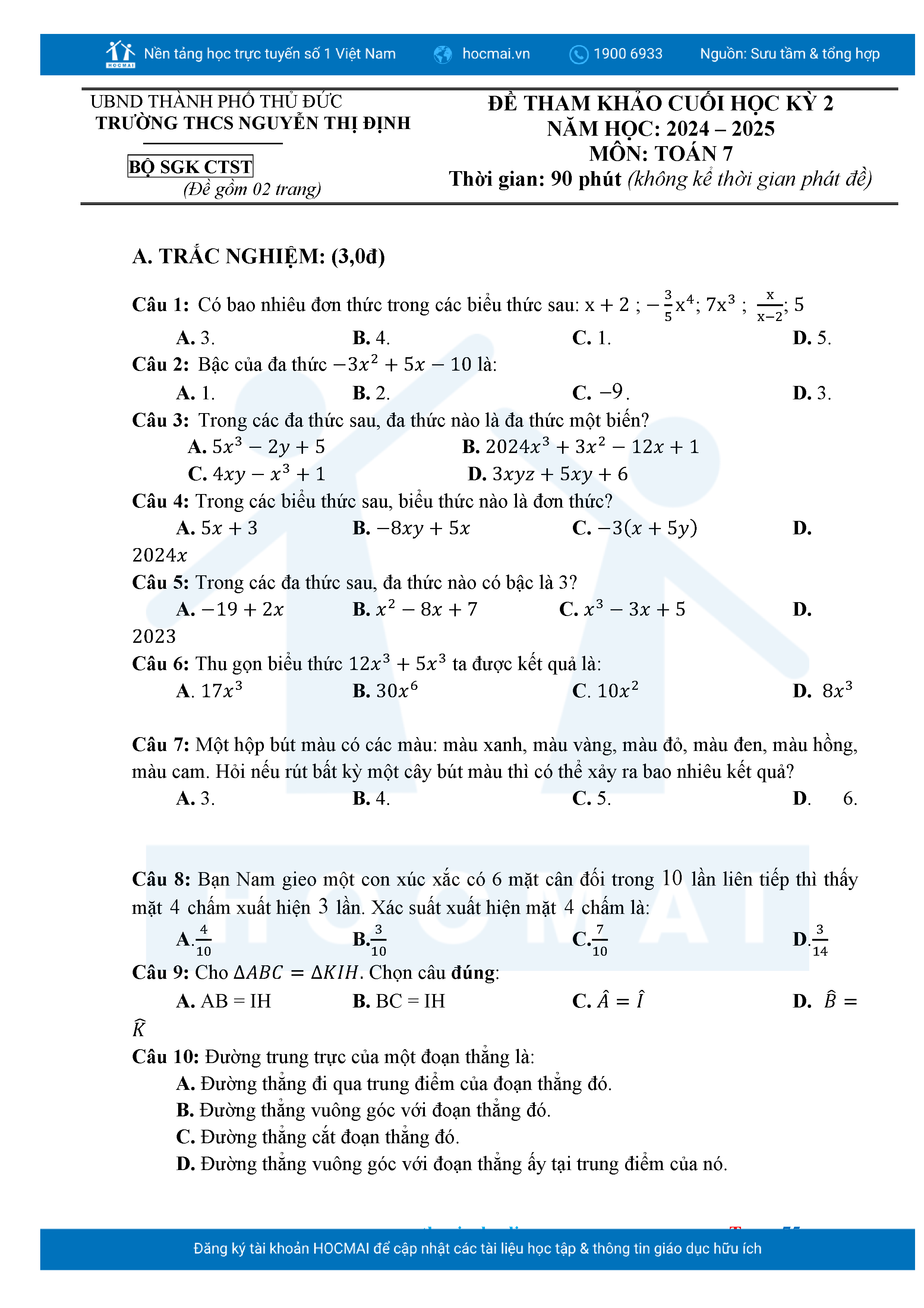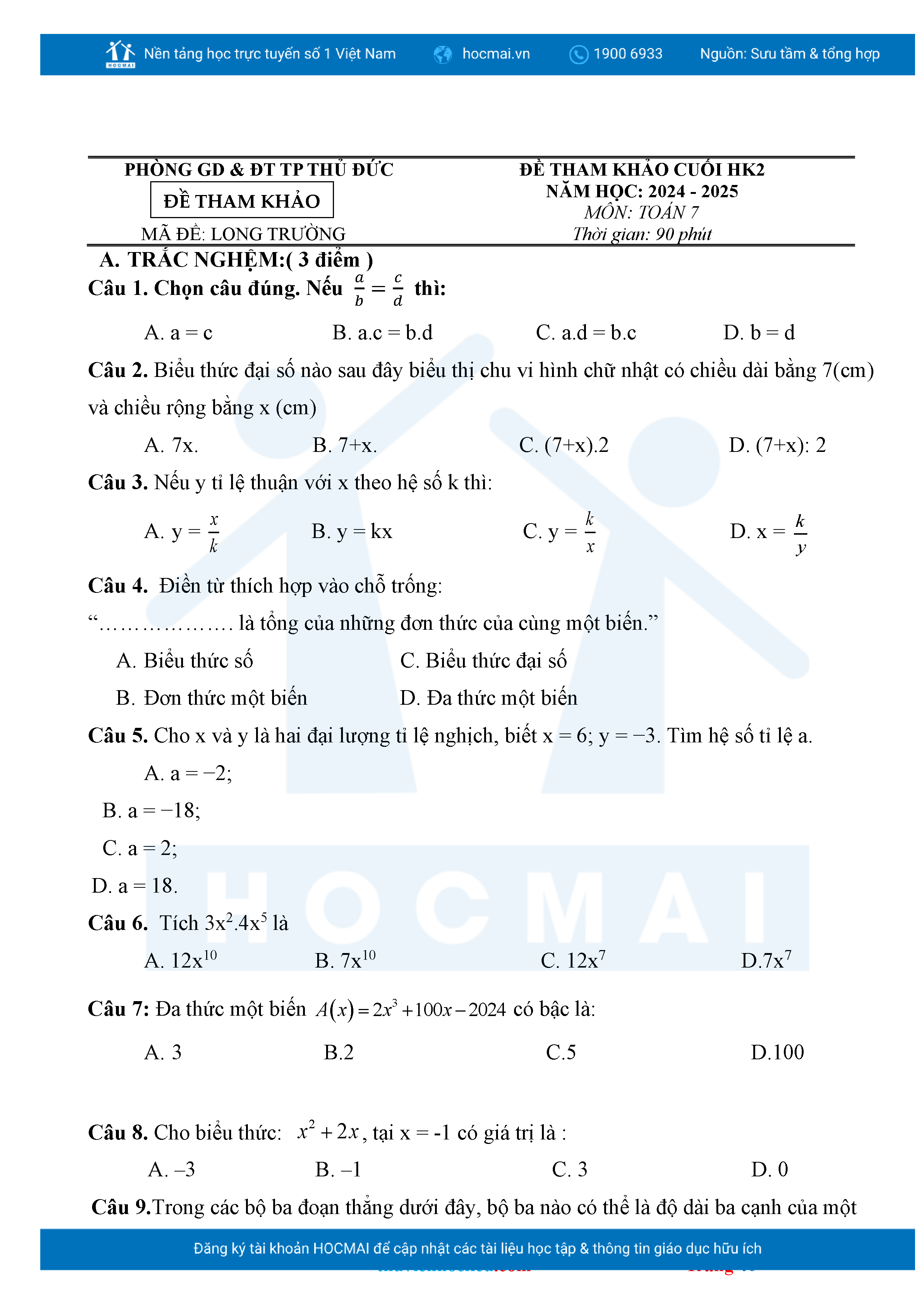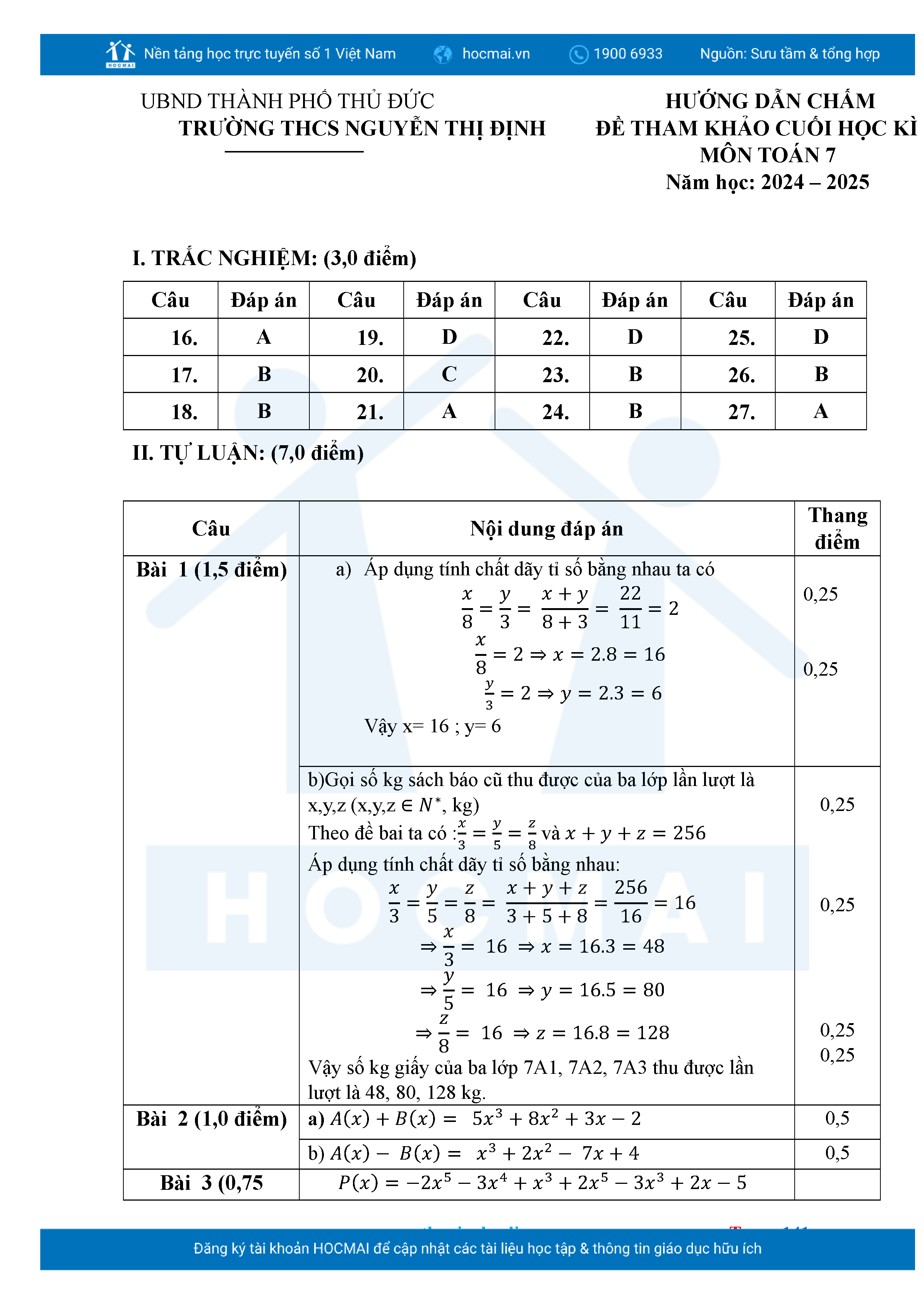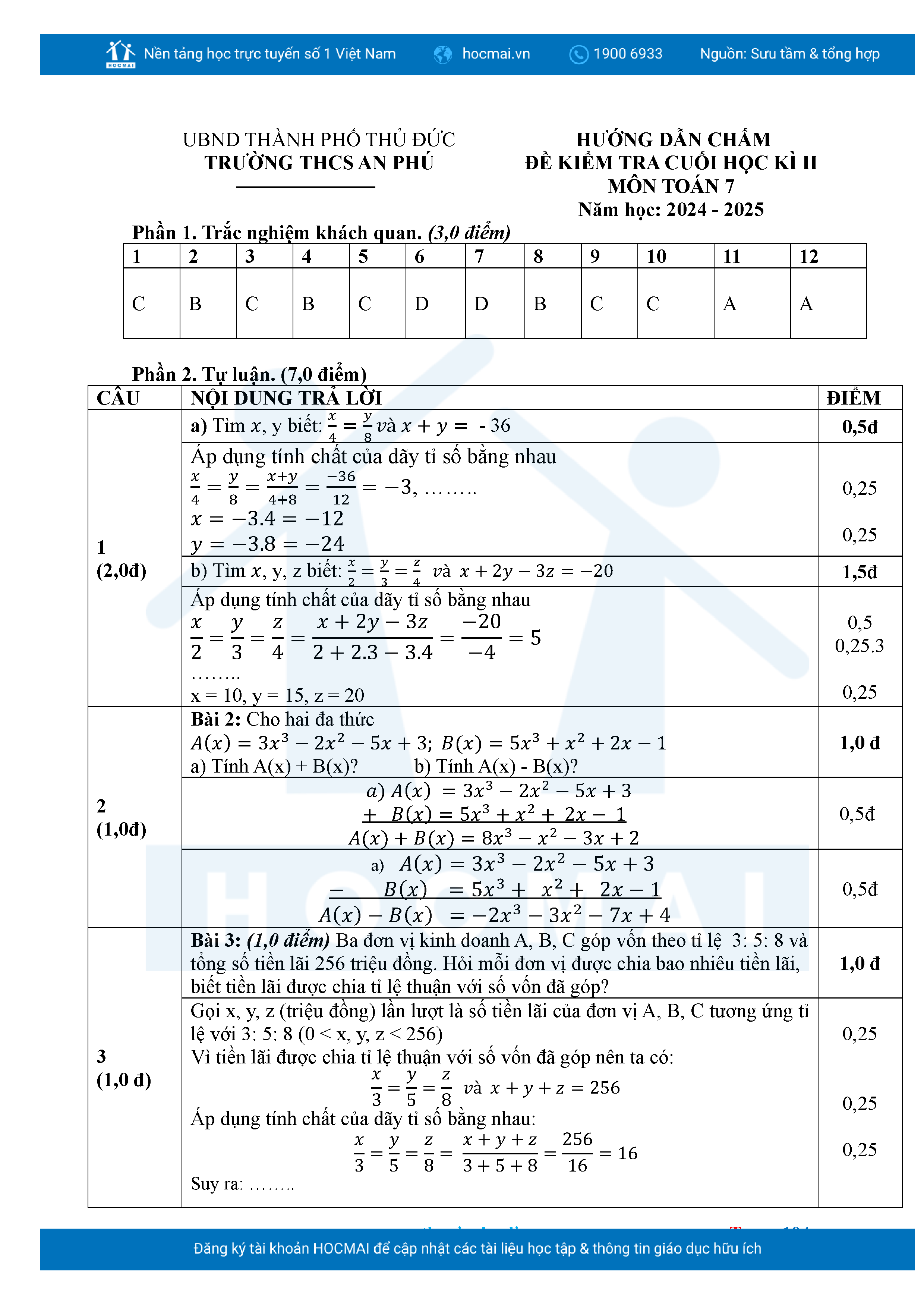 Bộ đề ôn thi môn Toán 7 HKII từ các trường ở TP Thủ Đức thuộc TPHCM kèm đáp án chi tiết.