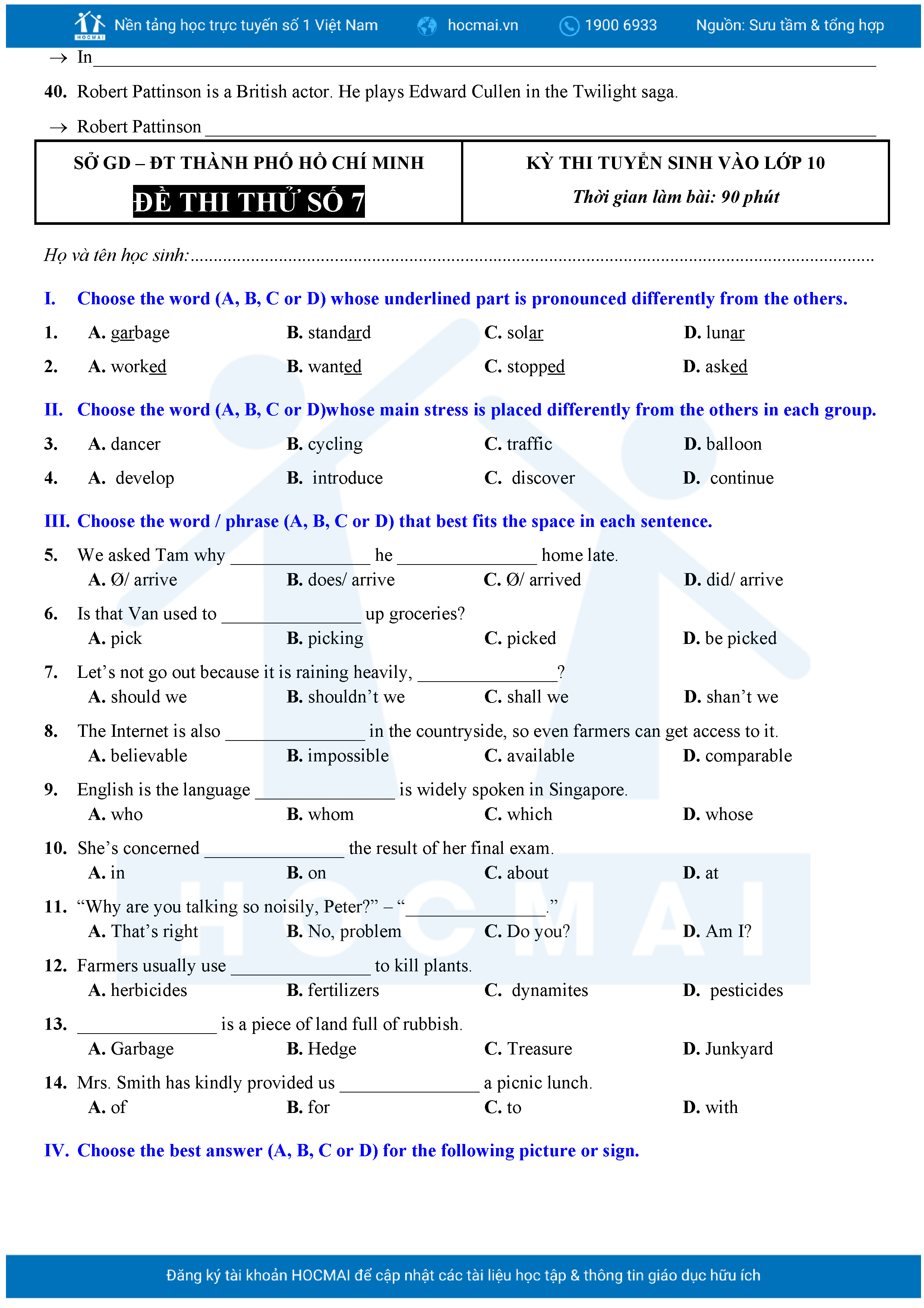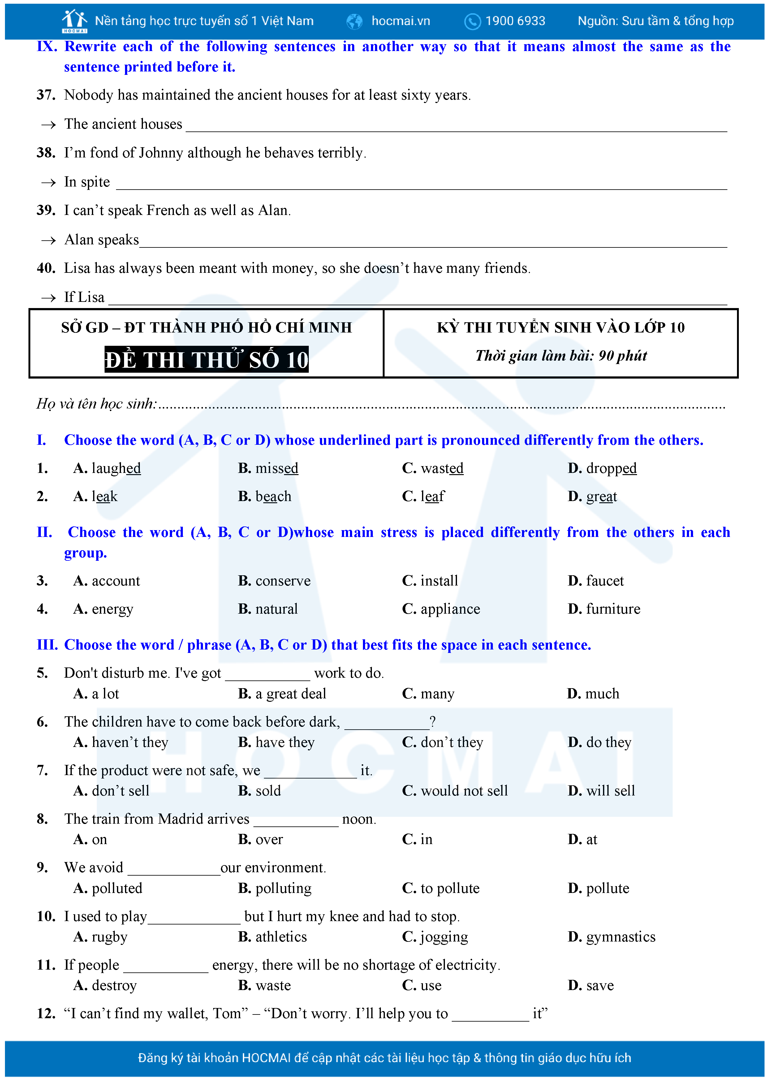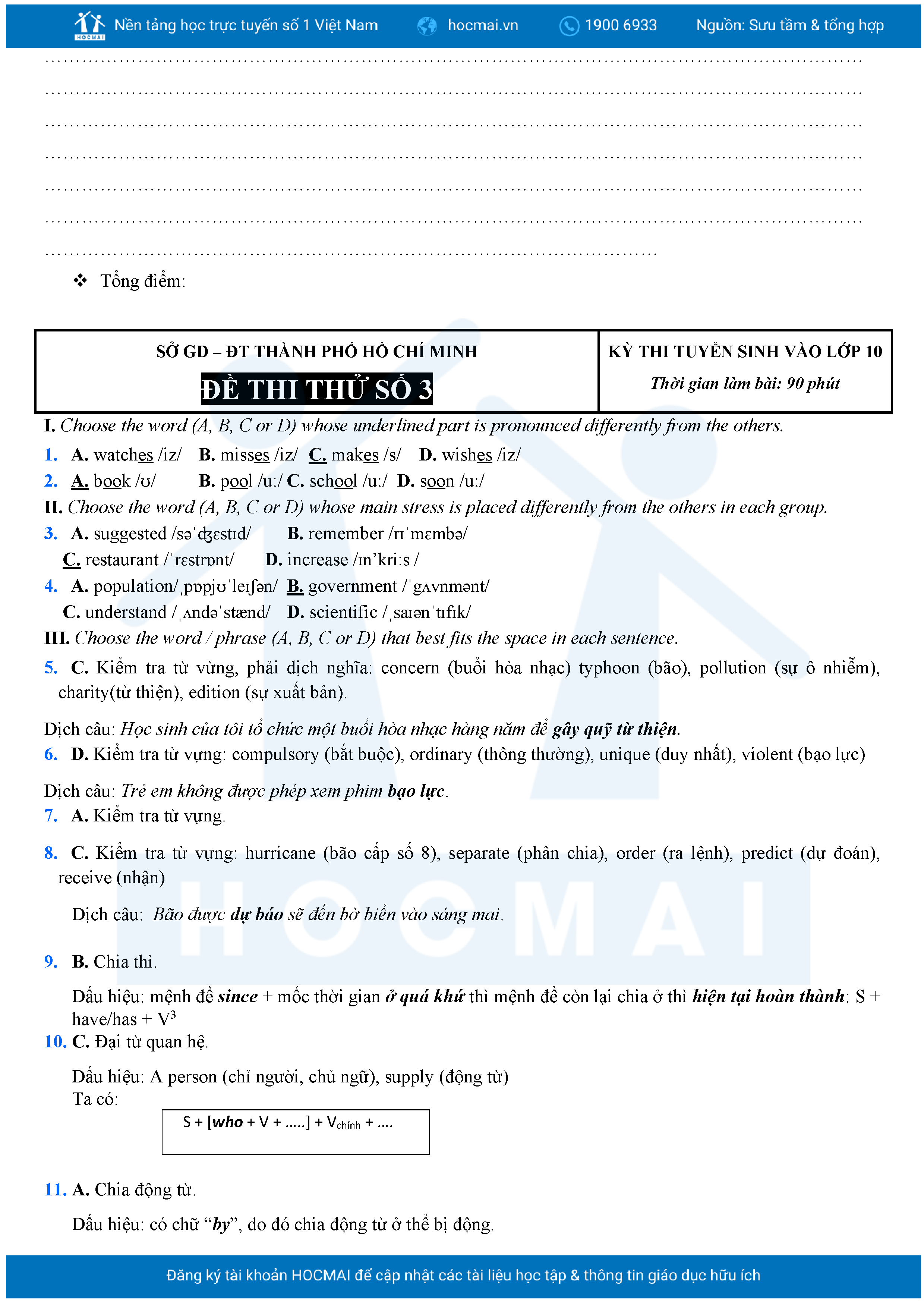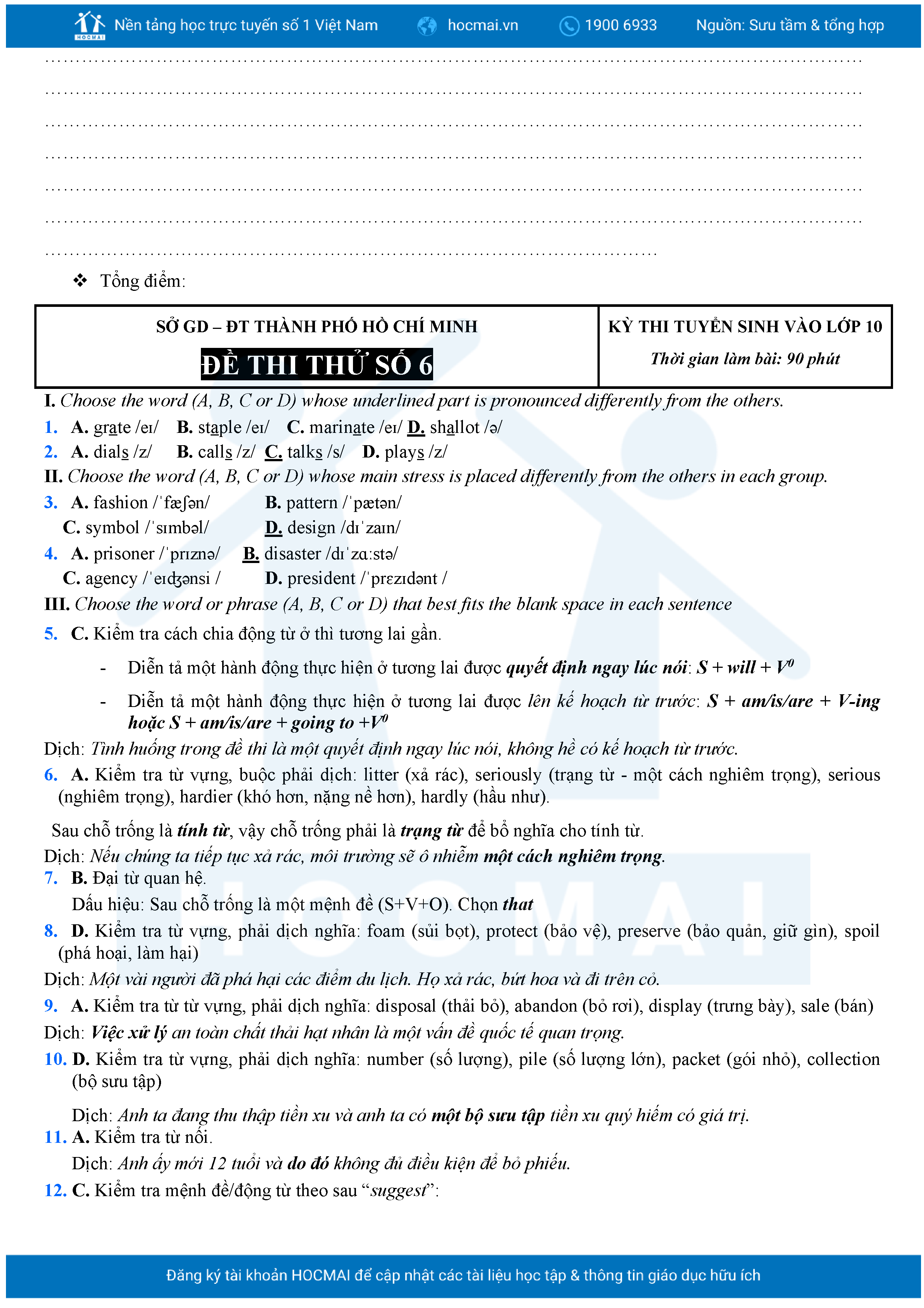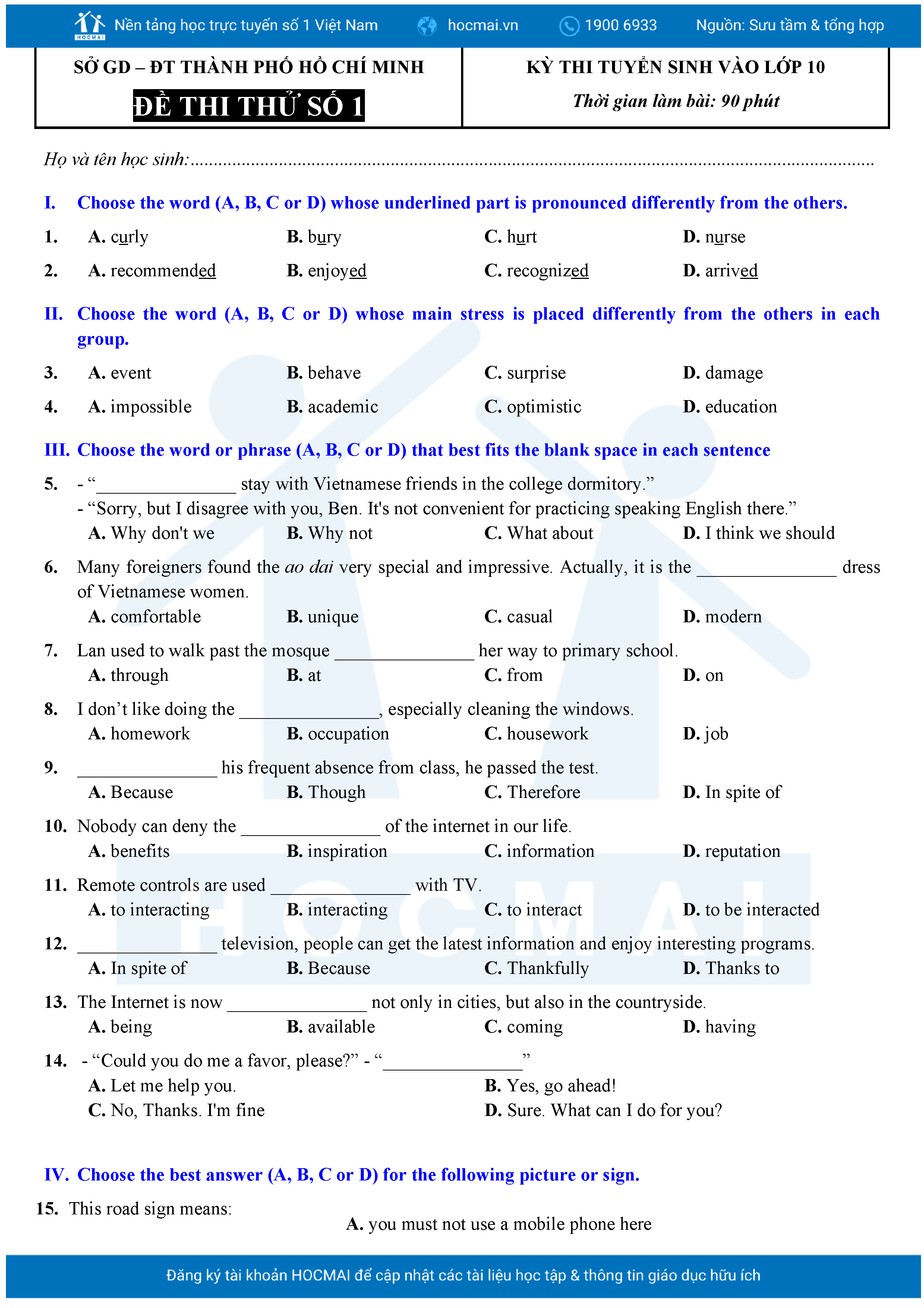 Bộ 10 đề Tiếng Anh ôn thi vào 10 TPHCM kèm lời giải.