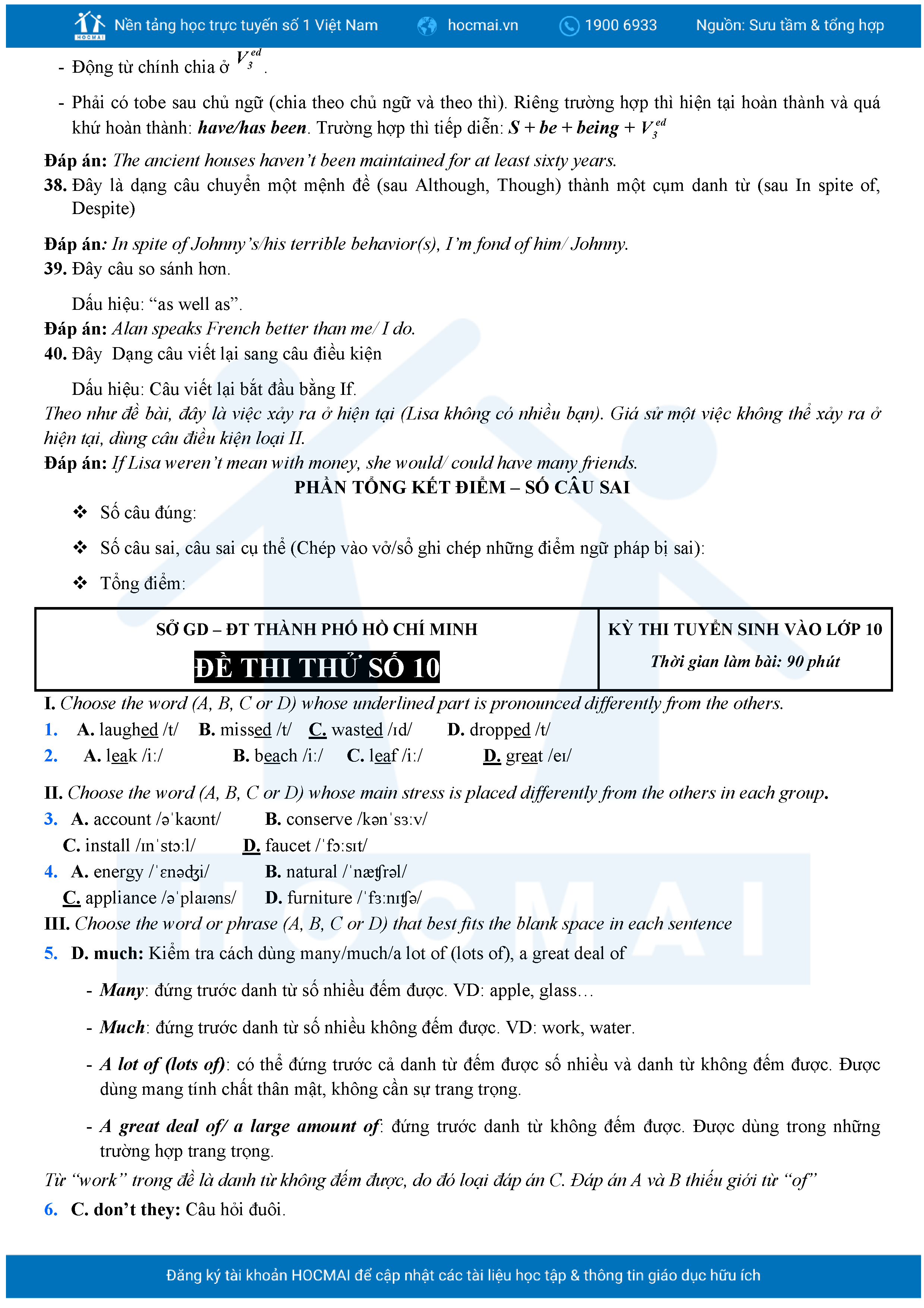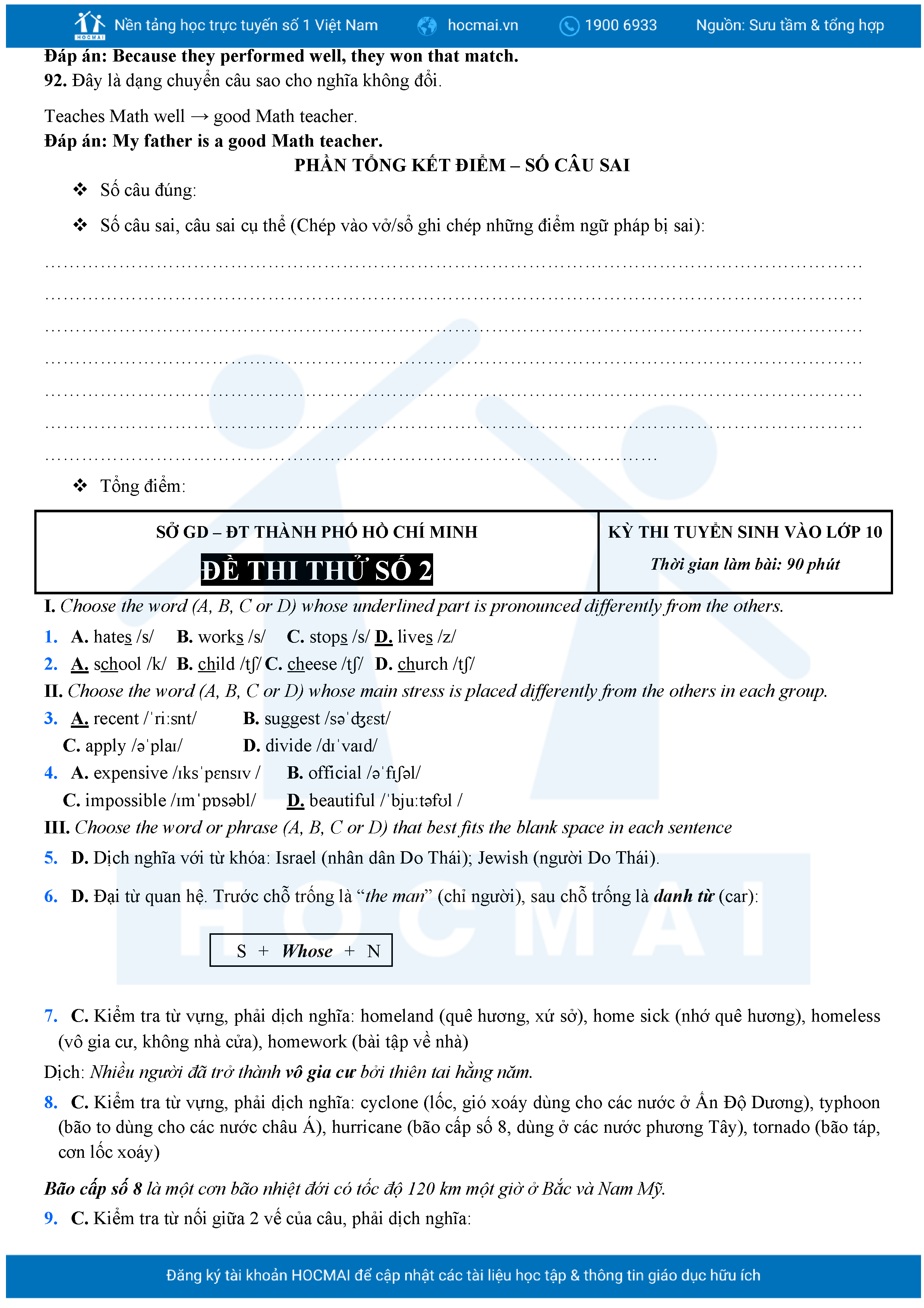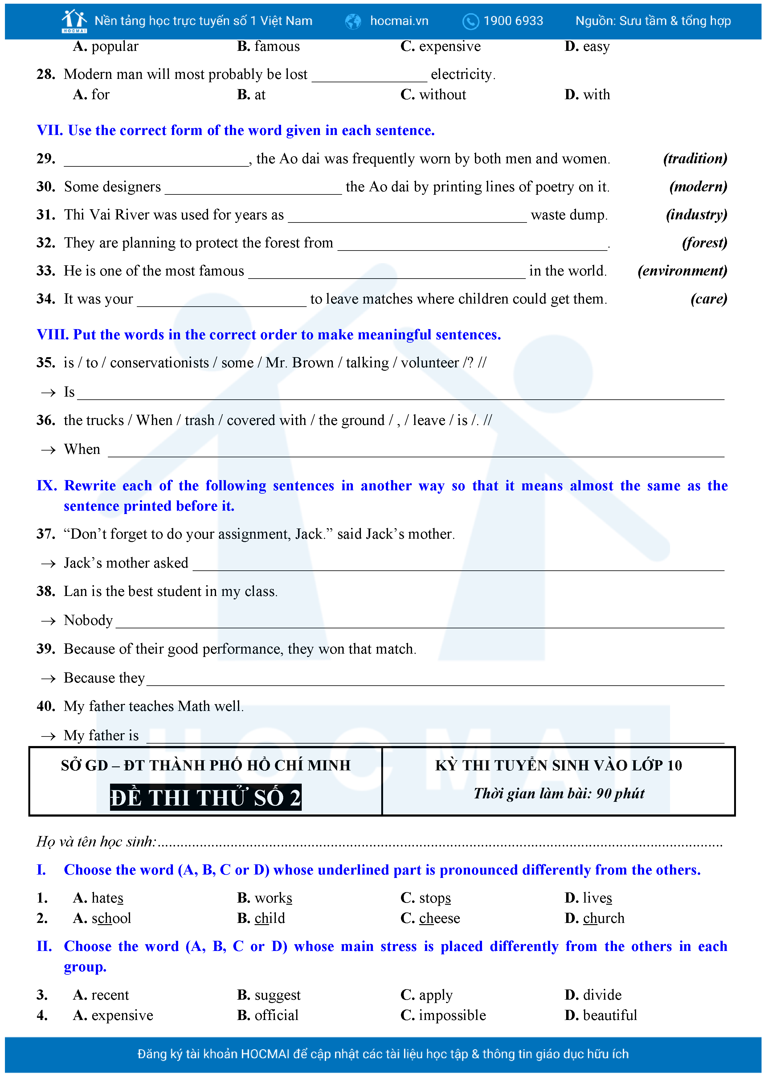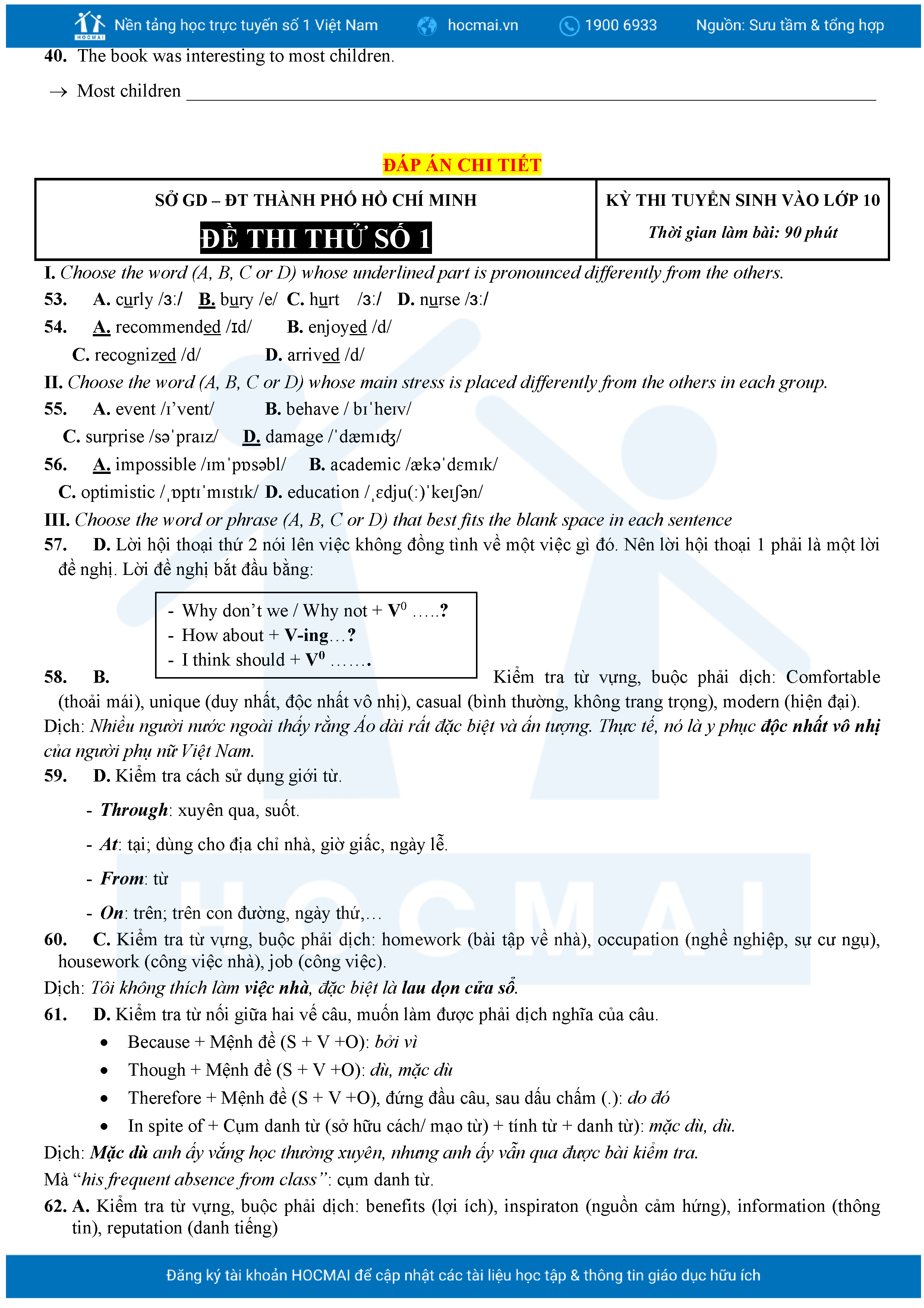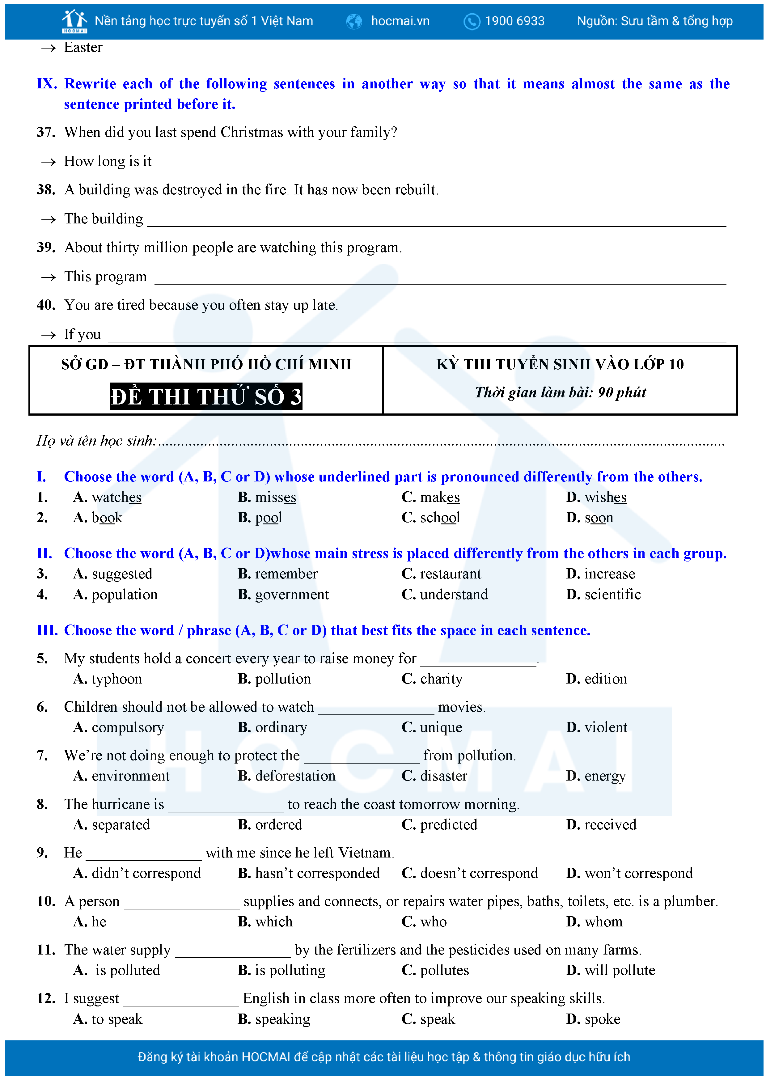 Bộ 10 đề Tiếng Anh ôn thi vào 10 TPHCM kèm lời giải.